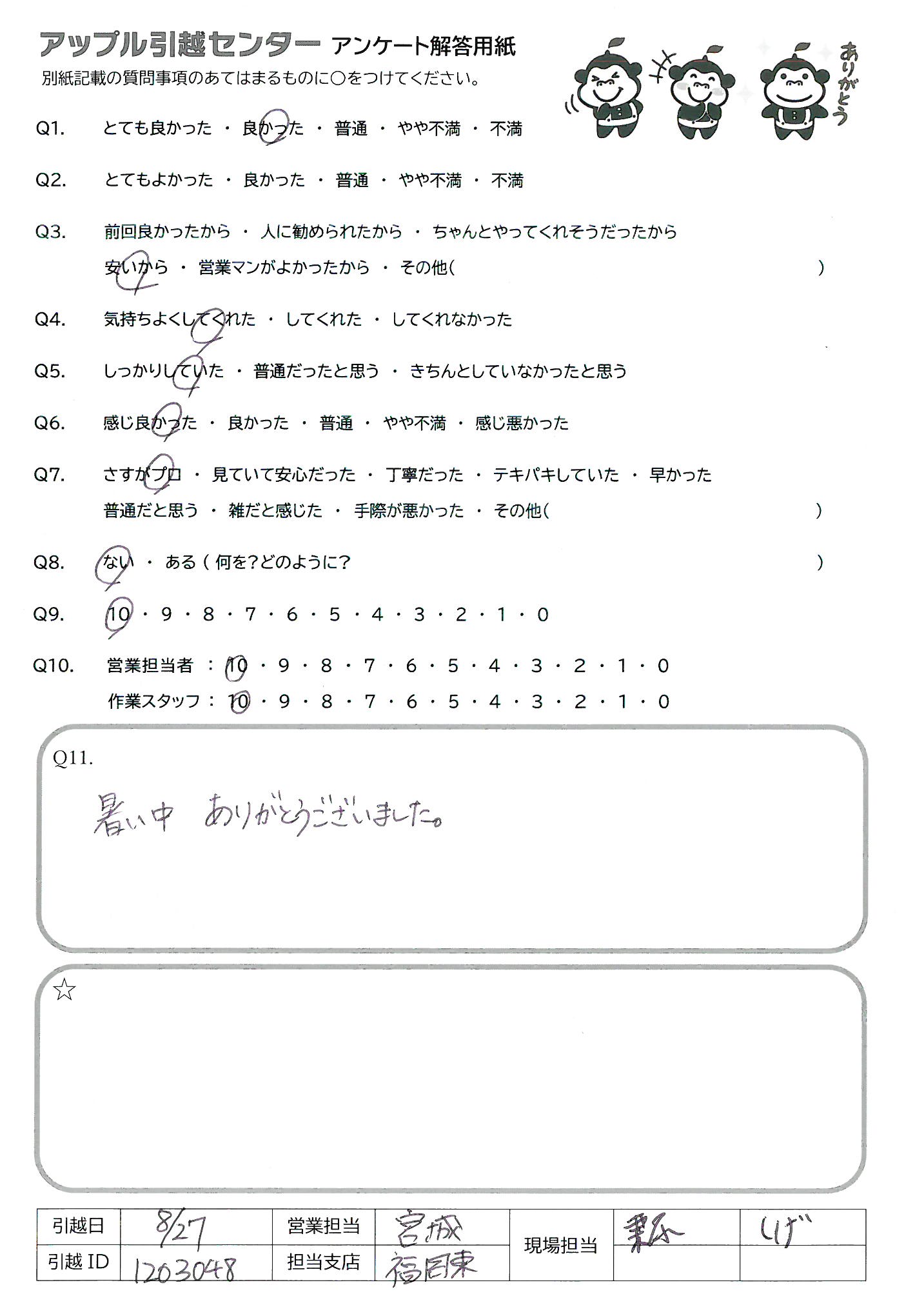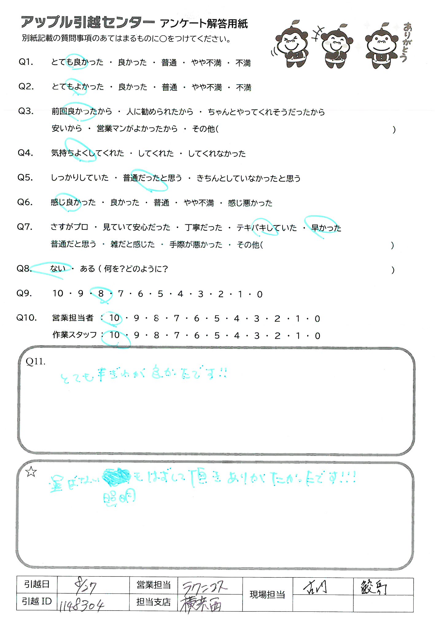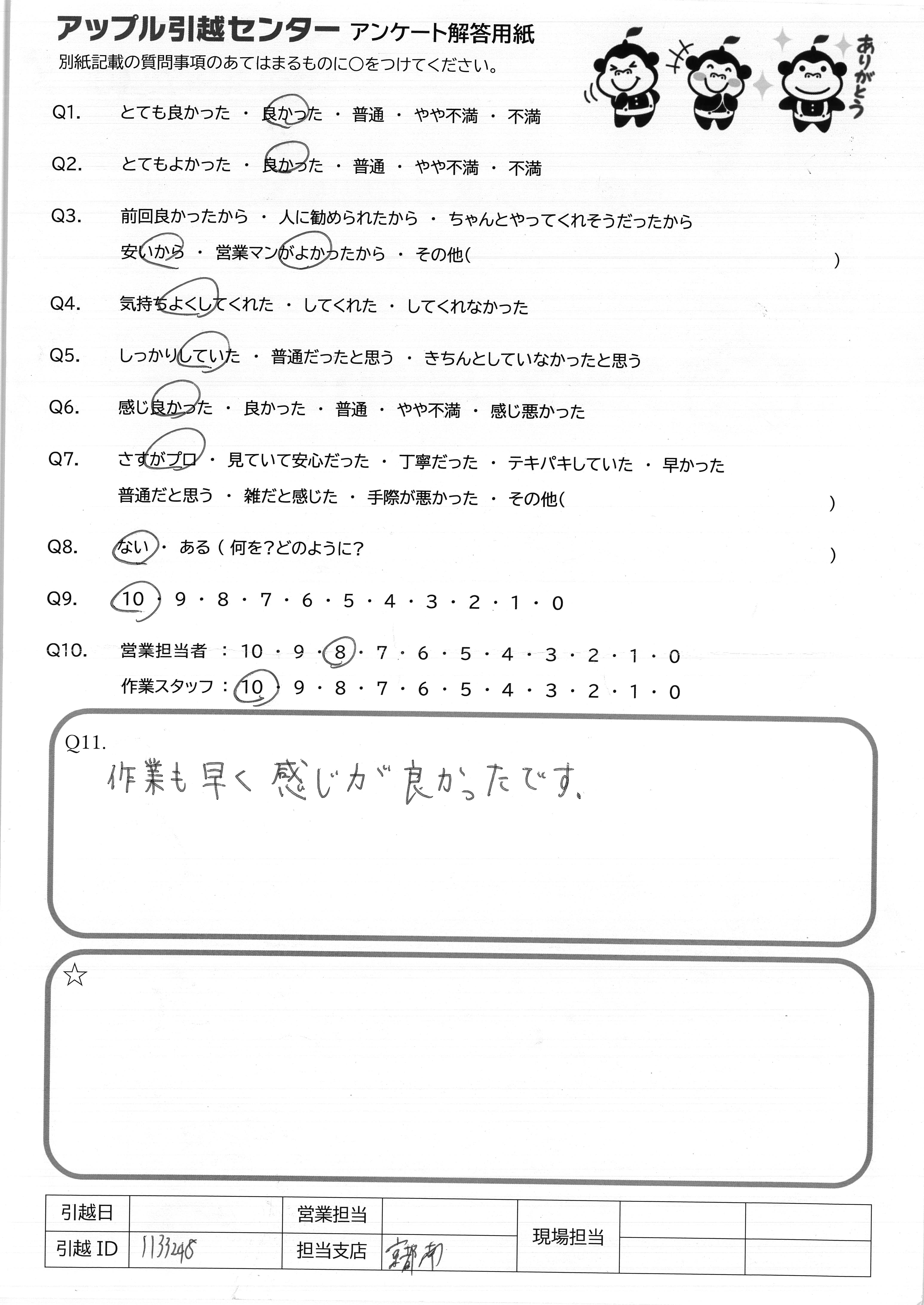 A.若いのにしっかりとしていて、荷物も予想以上に多かったにもかかわらず暑い中気持ちよくやって頂きました。 テキパキとこちらが驚く速さで作業をしていました。急なな引越しでしたが本当に気持ちよく終わる事ができました。 ありがとうございました。