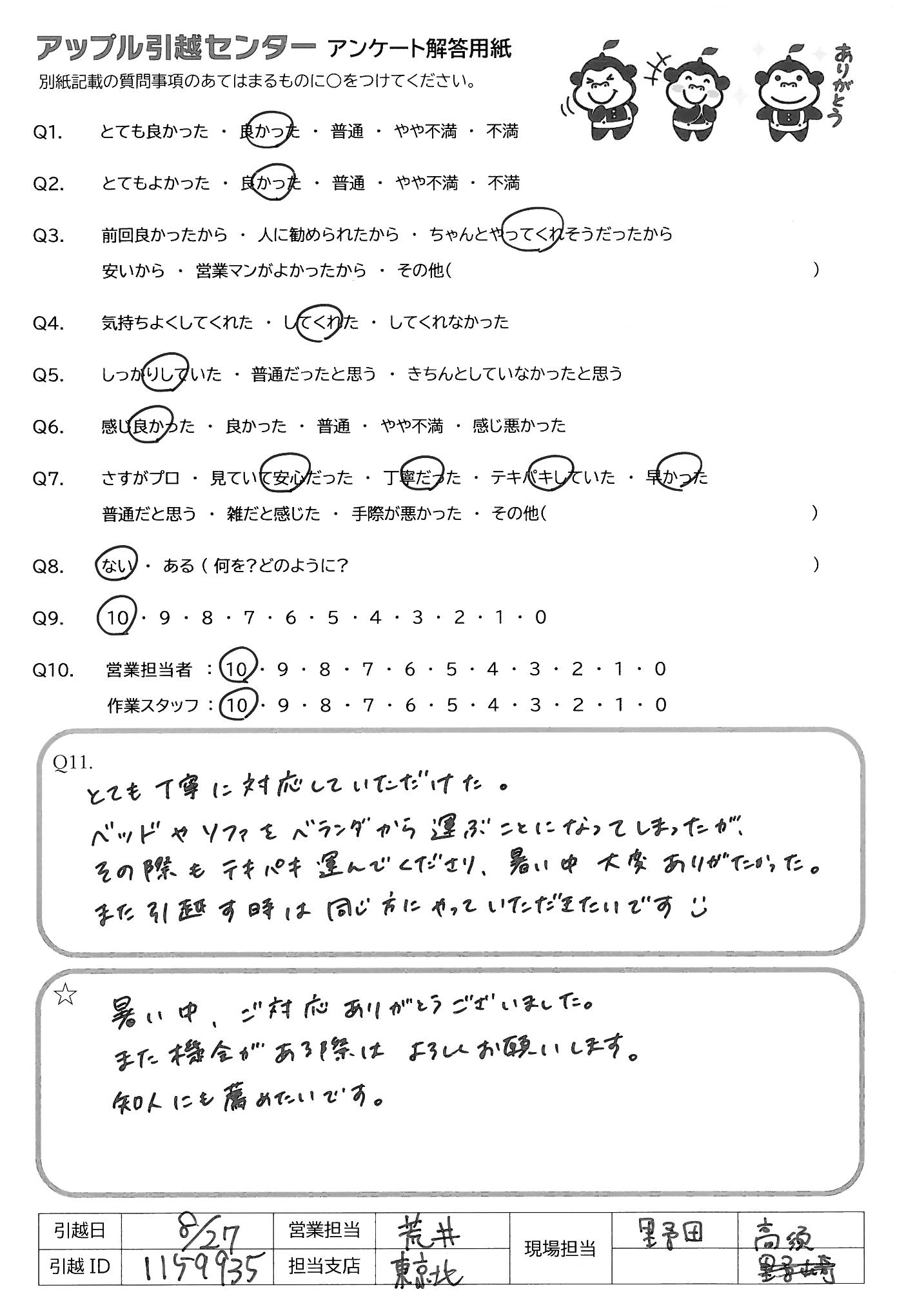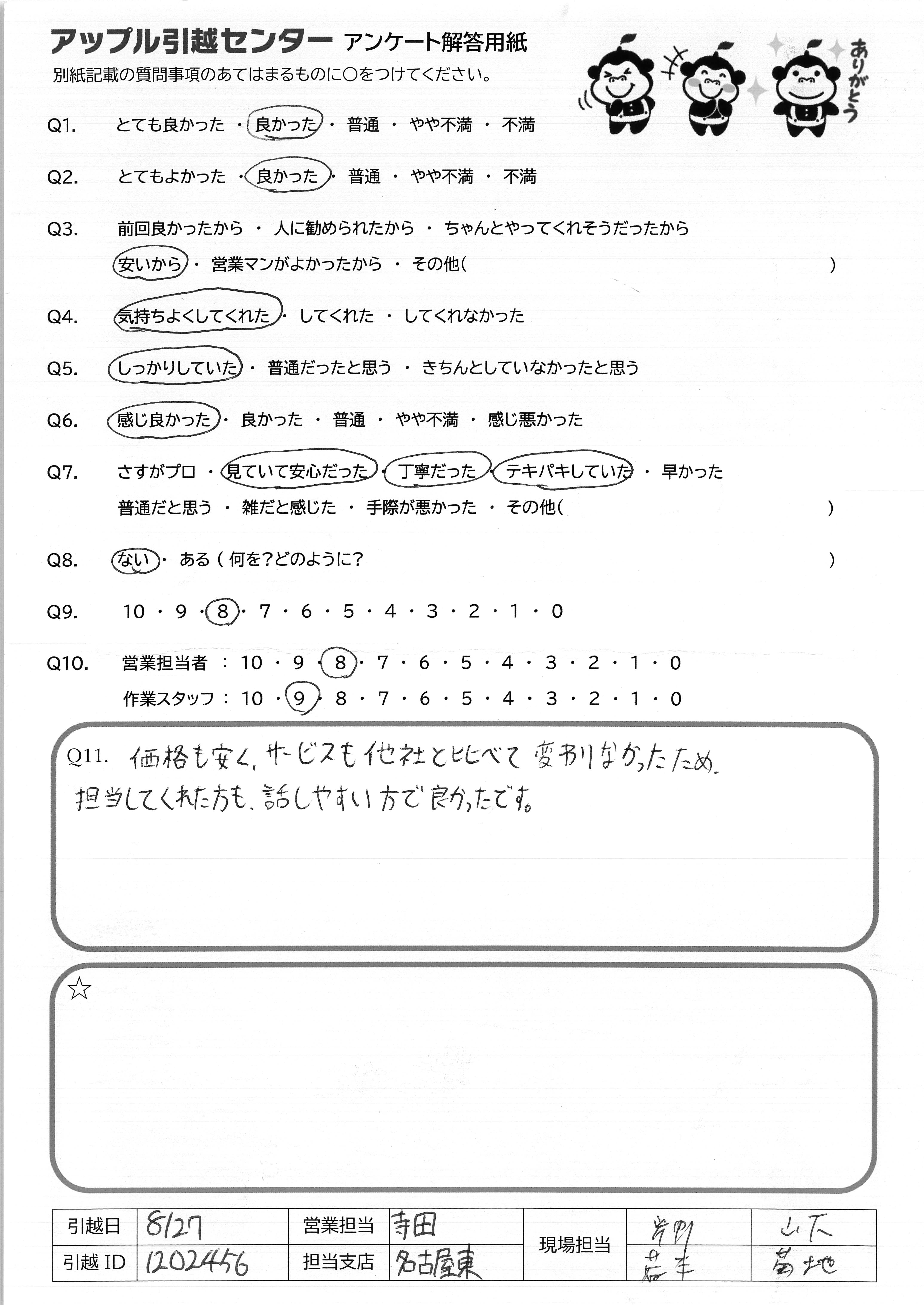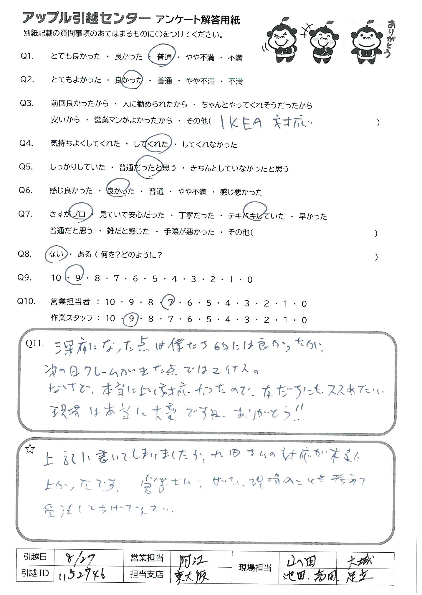 A.とても丁寧に対応していただけた。ベッドやソファをベランダから運ぶことになってしまったが、その際もテキパキ運んでくださり、暑い中大変ありがたかった。また引越す時は同じ方にやっていただきたいです。