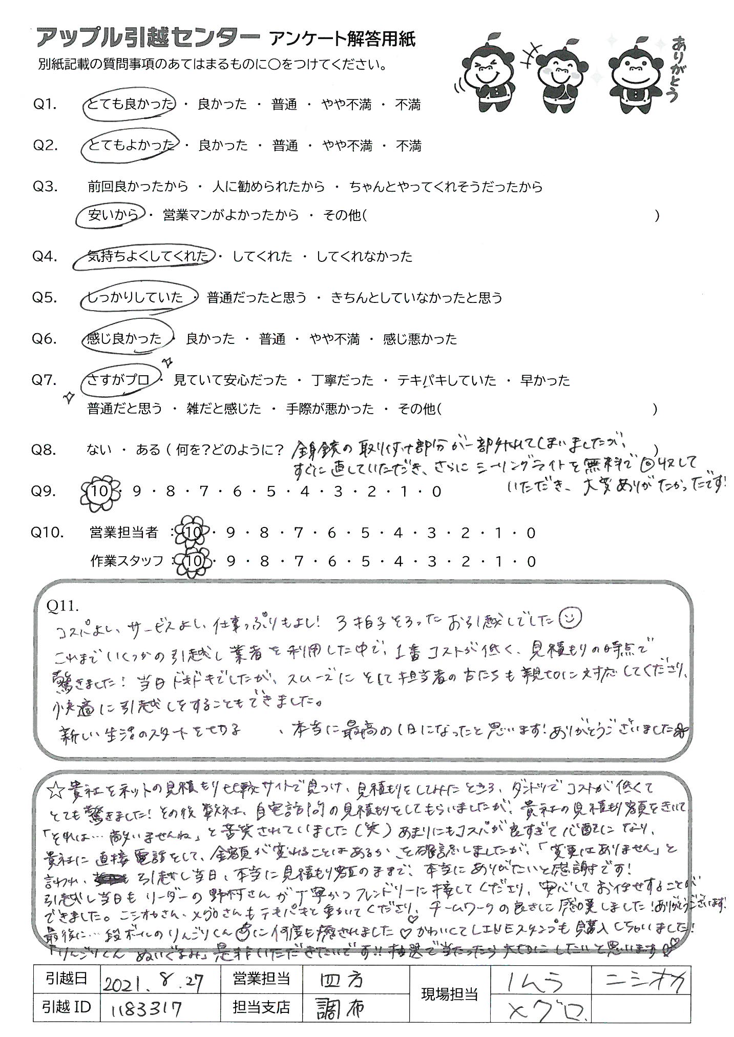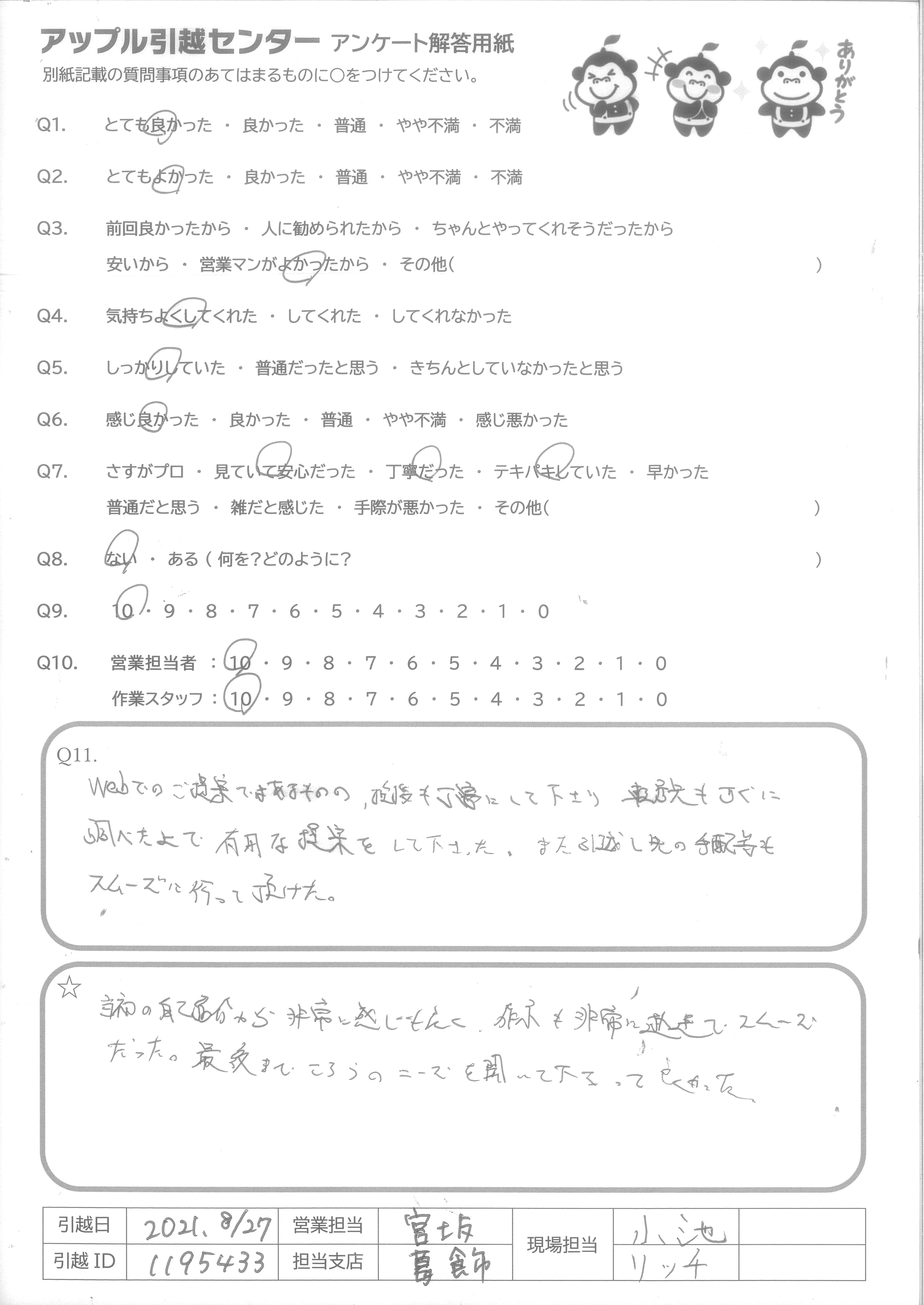 A.貴社をネットの見積もり比較サイトで見つけ、見積もりをしてみたところ、ダントツでコストが低くてとても驚きました!その後数社、自宅訪問の見積もりをしてもらいましたが、貴社の見積もり額をきいて「それは…敵いませんね」と苦笑されていました(笑)あまりにもコスパが良すぎて心配になり、貴社に直接電話をして、金額が変わることはあるか、を確認しましたが、「変更はありません」と言われ、引越し当日、本当に見積もり額のままで、本当にありがたいと感謝です! 引越し当日もリーダーの野村さんが丁寧かつフレンドリーに接してくださり、安心してお任せすることができました。ニシオカさん、メグロさんもテキパキと動いてくださり、チームワークの良さに感動しました! ありがとうございます。最後に…段ボールのりんごりくんに何度も癒されました。かわいくてLINEスタンプも購入しちゃいました!「りんごりくん ぬいぐるみ」是非いただきたいです!!抽選で当たったら大切にしたいと思います!