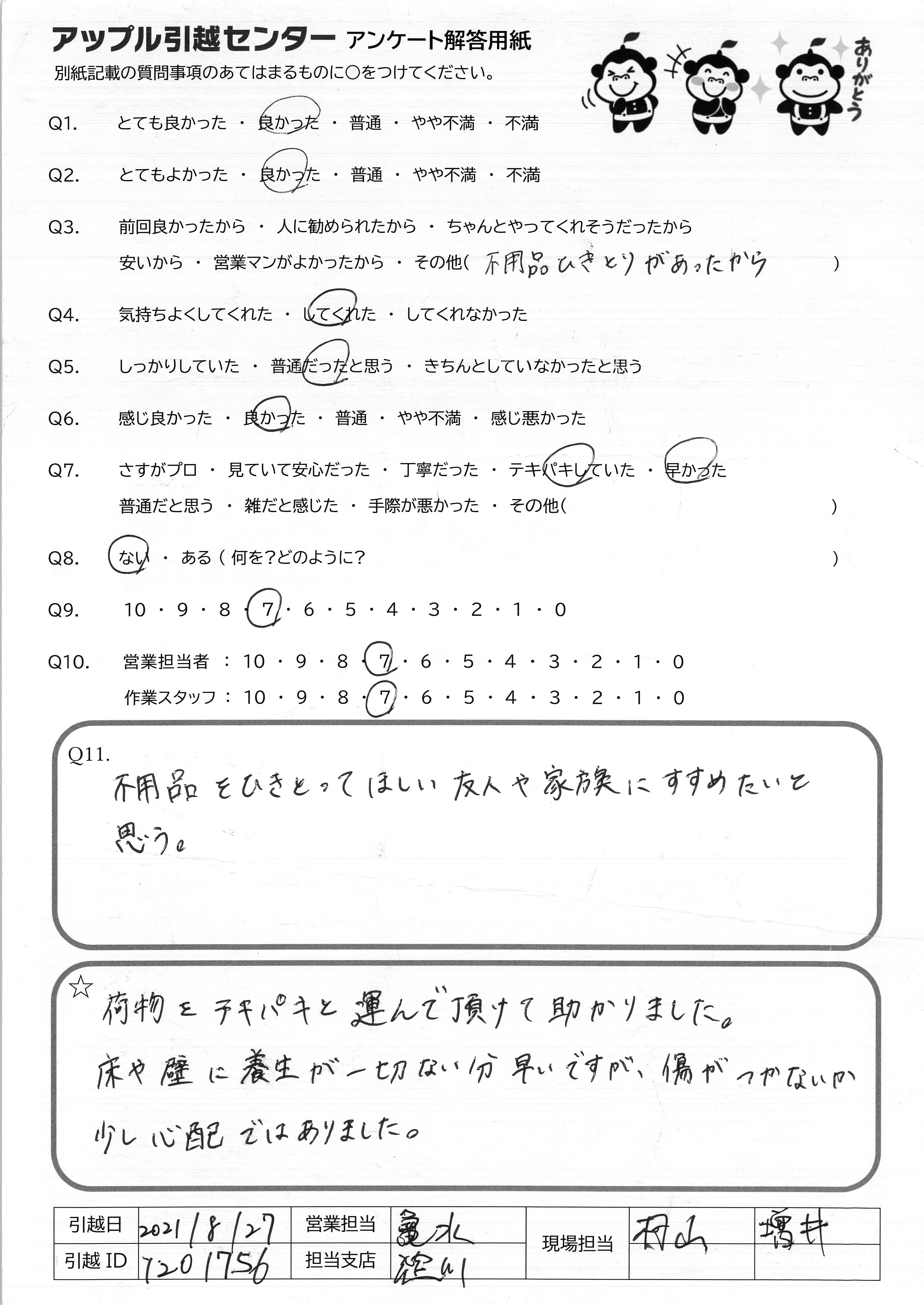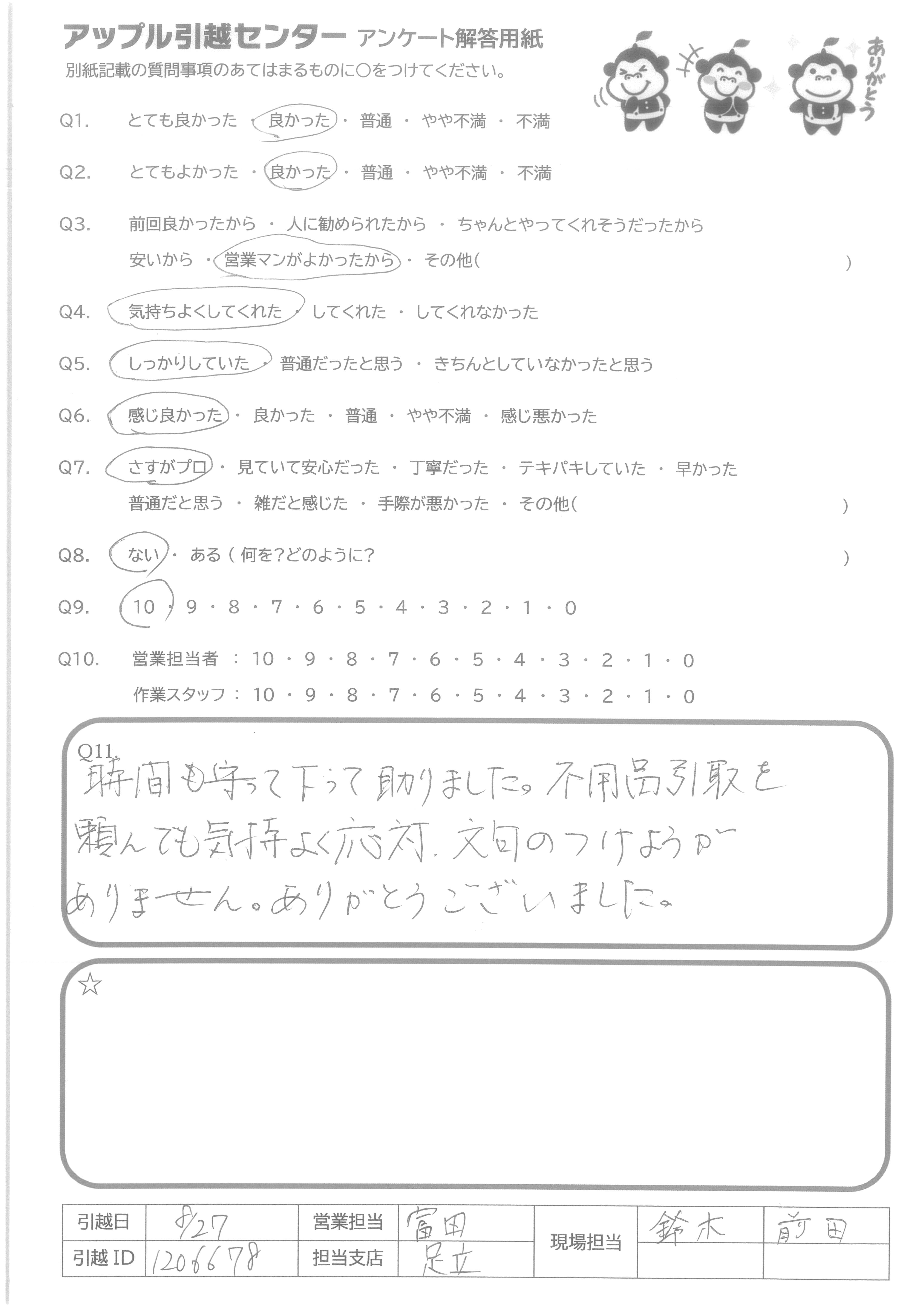 A.時間も守って下って助りました。不用品引取を頼んでも気持よく応対、文句のつけようがありません。ありがとうございました。