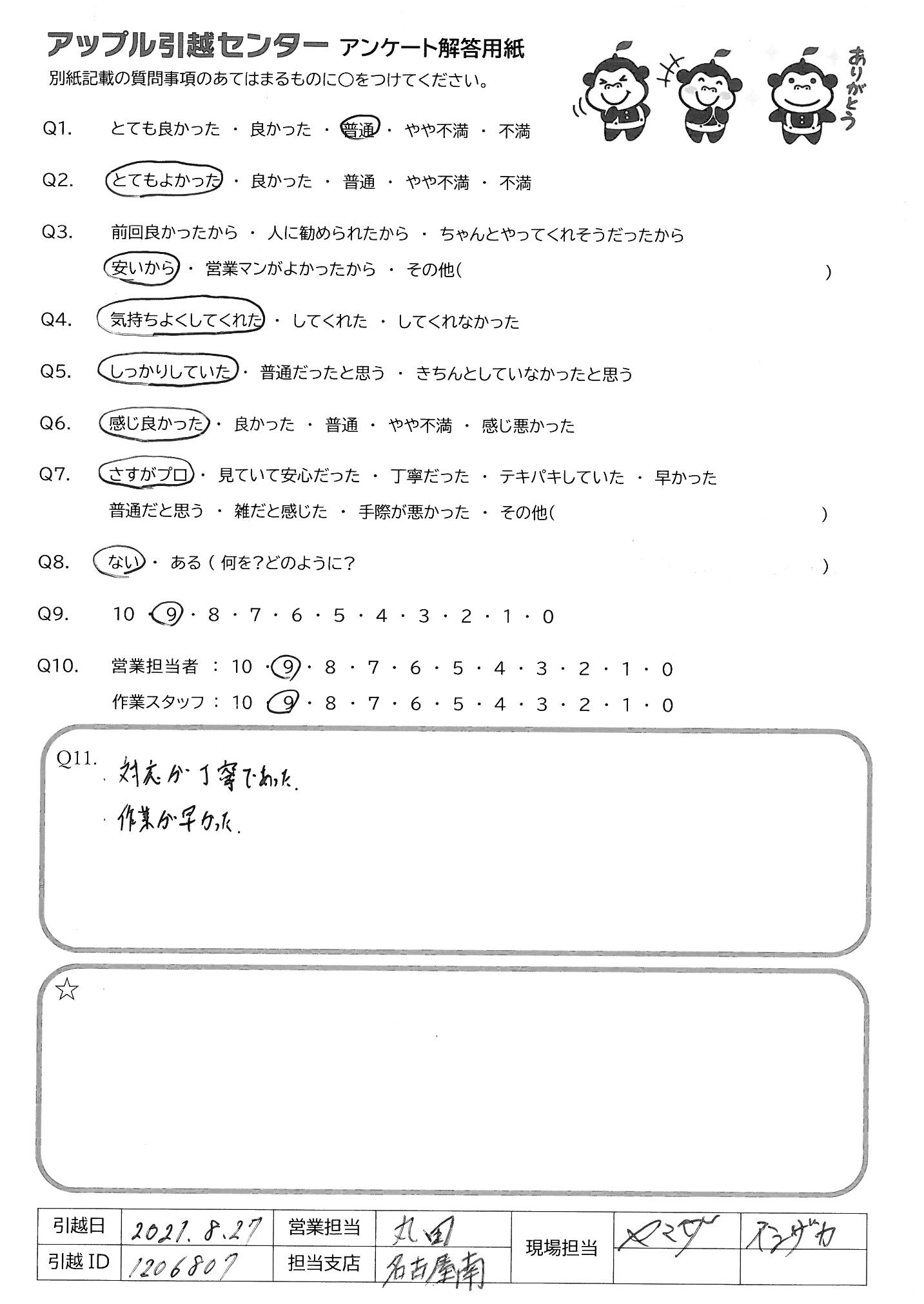引越し日:2021年08月27日 エリア:愛知県名古屋市中区