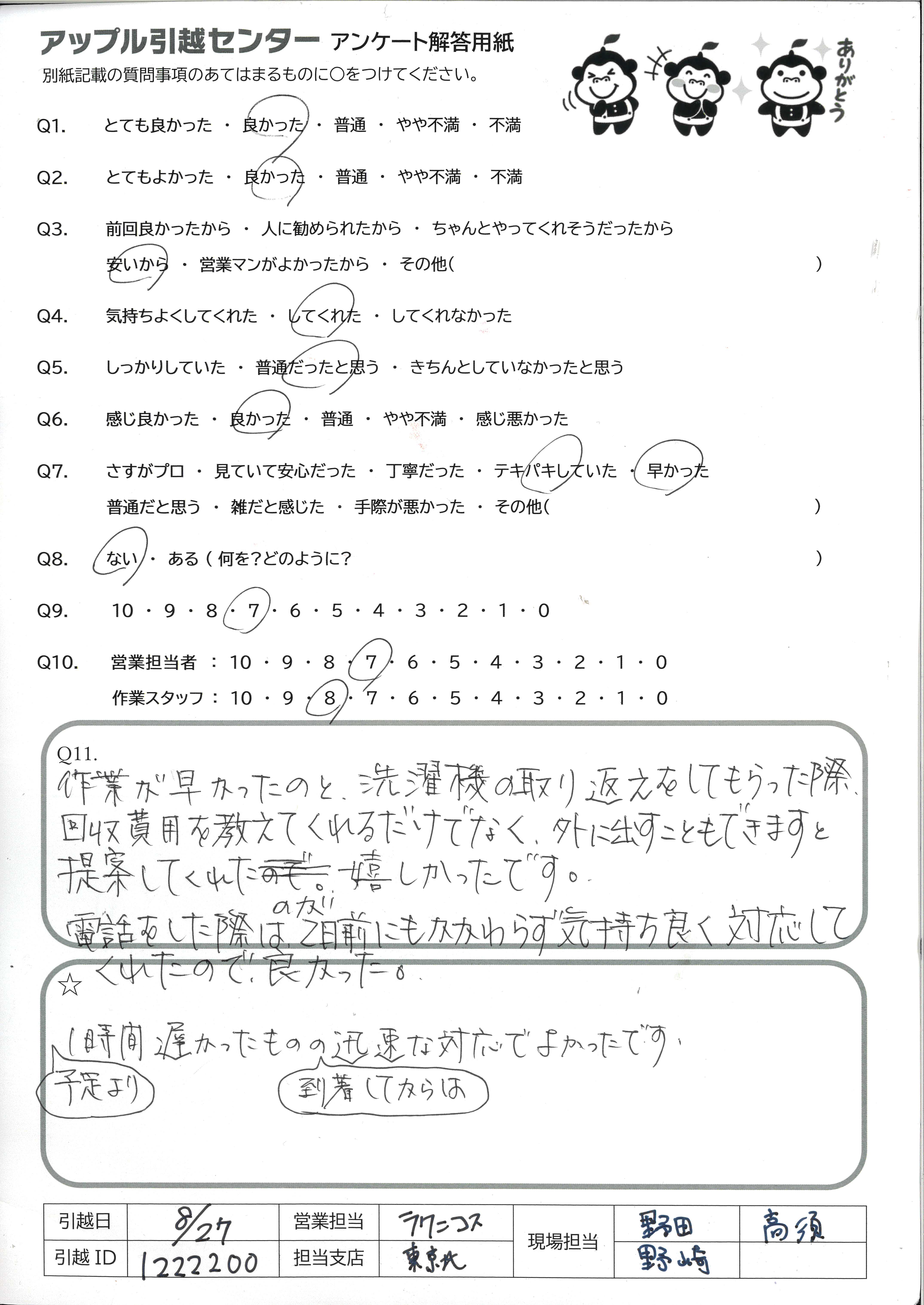 A.自身の荷物が結構多くなり、また梱包もギリギリまでかかってしまったにもかかわらず、嫌な顔せずテキパキ作業していただきました。ありがとうございます。