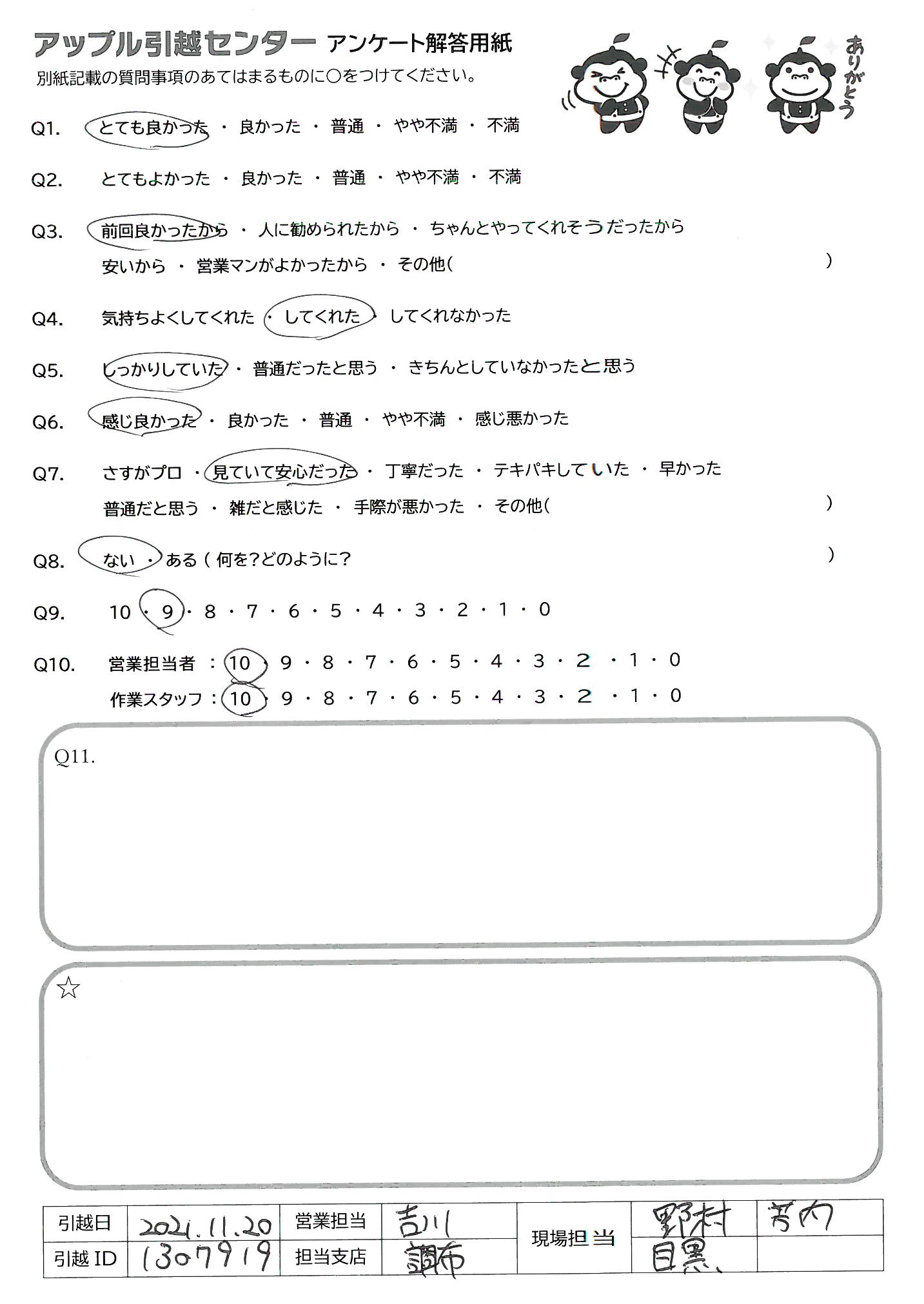 引越し日:2021年11月20日 エリア:神奈川県川崎市多摩区