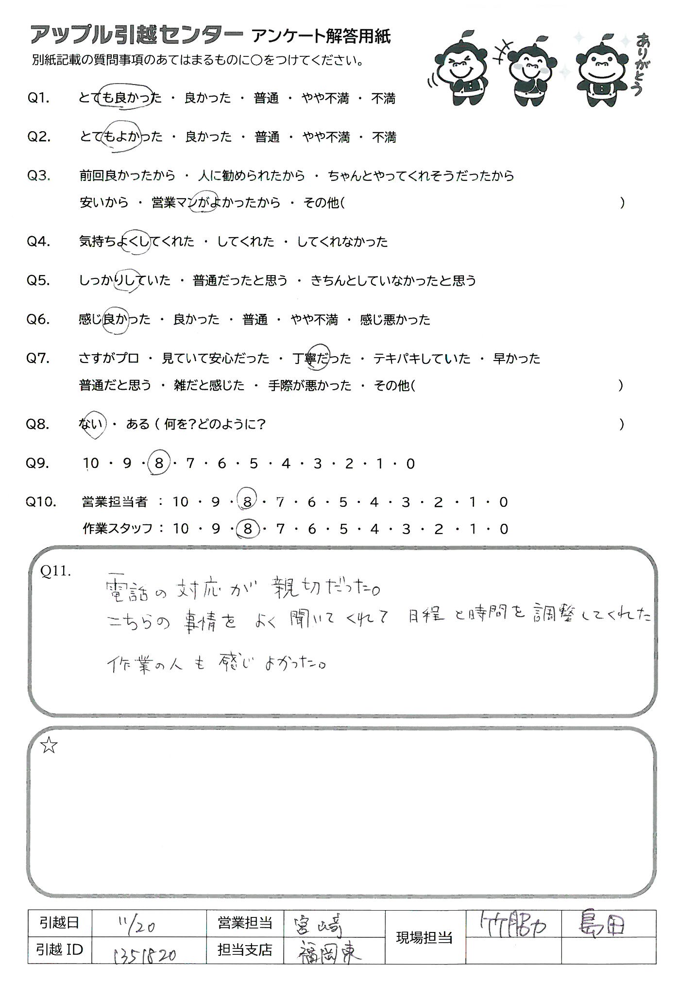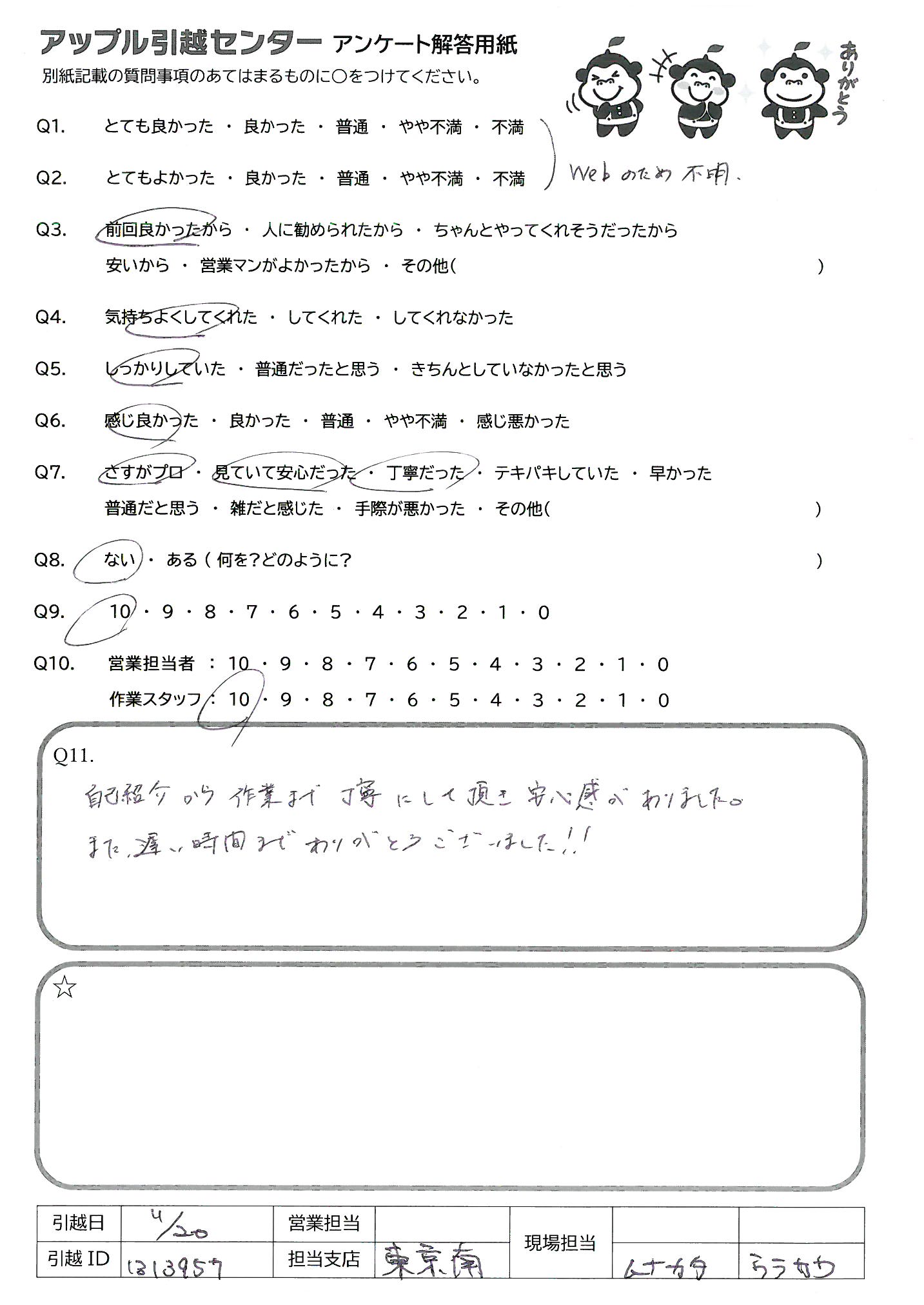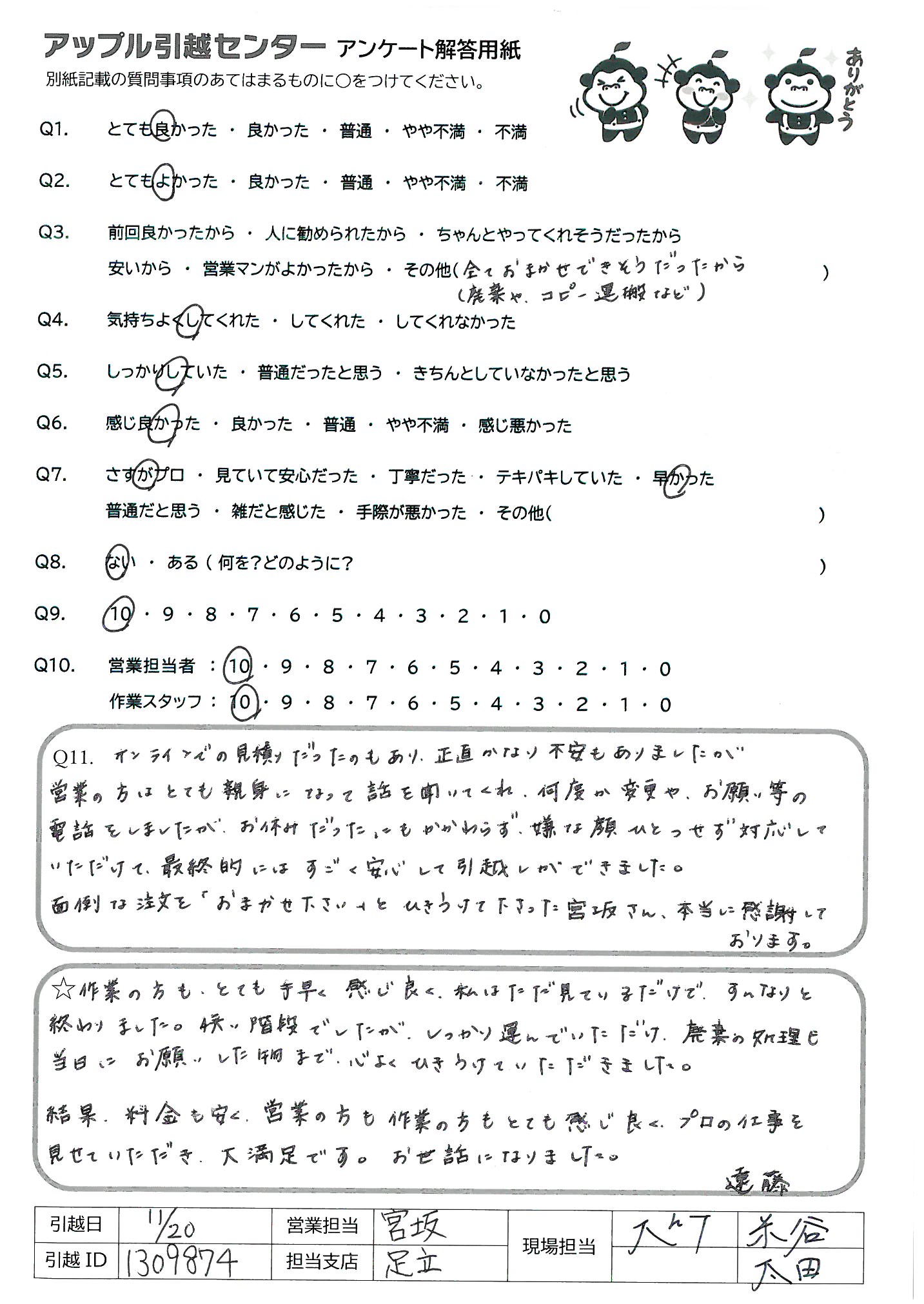 A.オンラインでの見積りだったのもあり、正直かなり不安もありましたが営業の方はとても親身になって話を聞いてくれ、何度か変更やお願い等の電話をしましたがお休みだったにもかかわらず、嫌な顔ひとつせず対応いただけて、最終的にはすごく安心して引越しができました。 面倒な注文を「おまかせ下さい」とひき受けて下さった宮坂さん、本当に感謝しております。