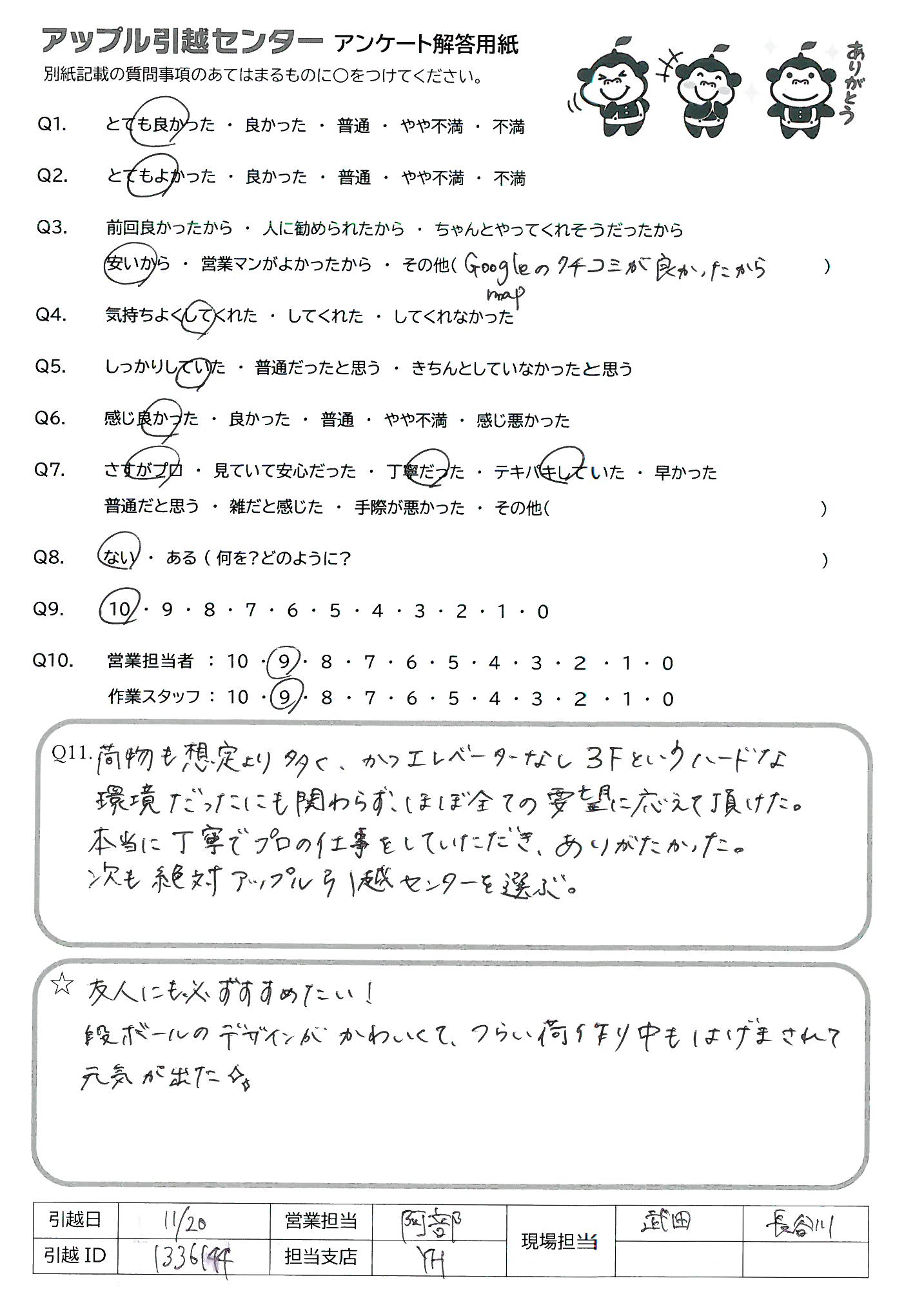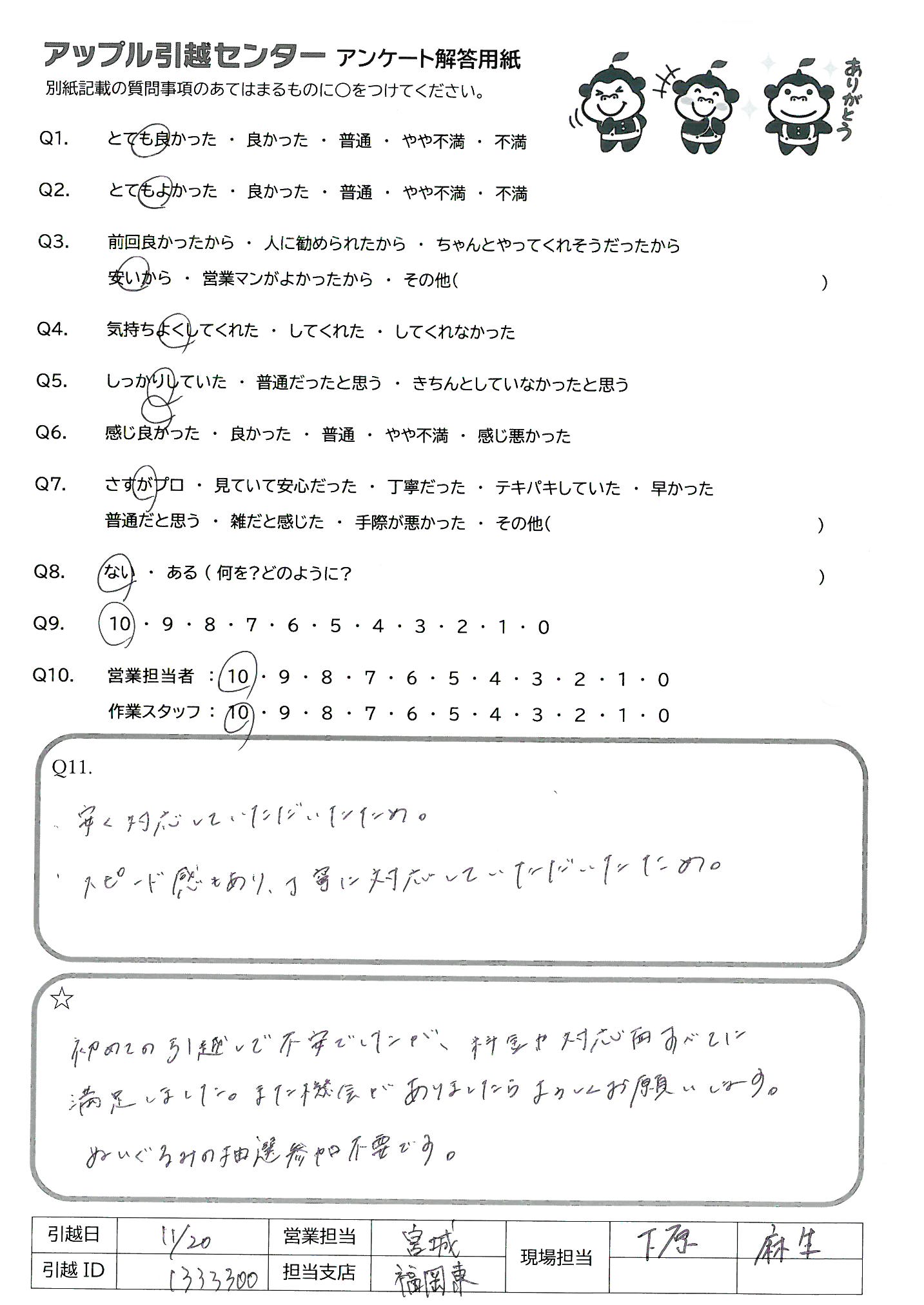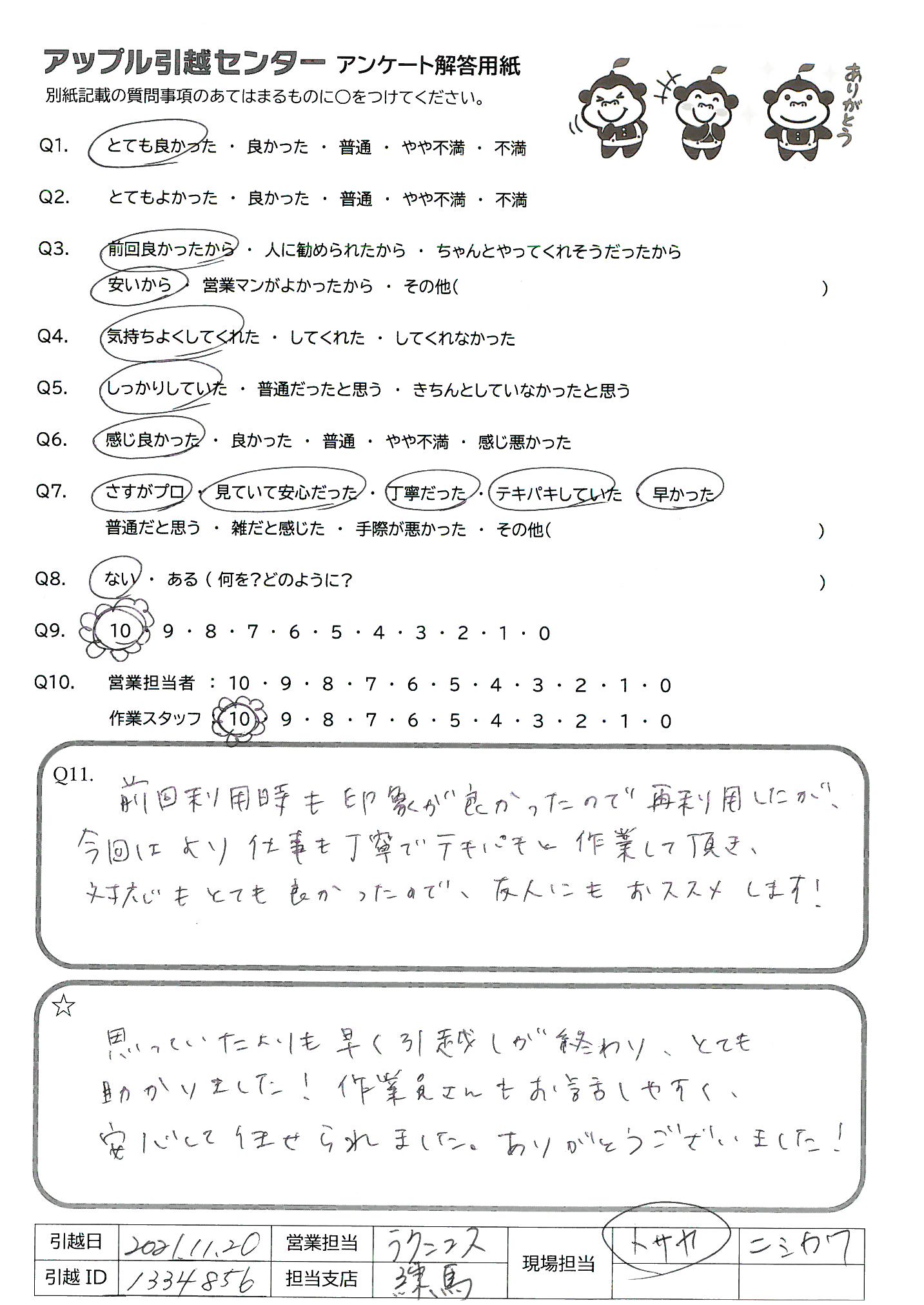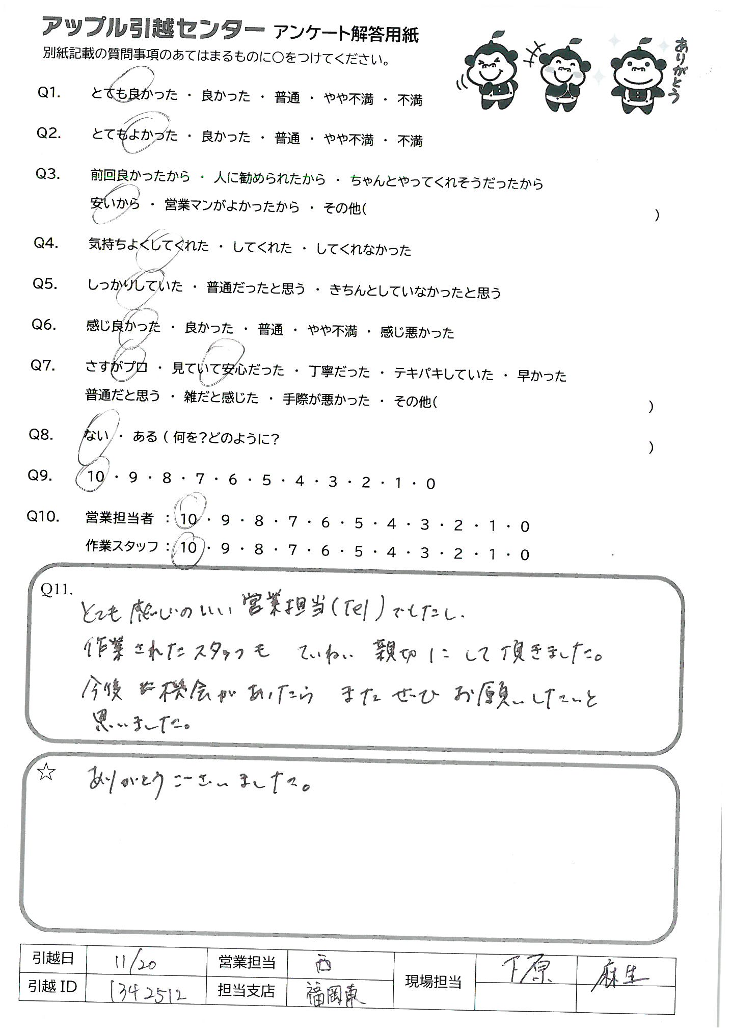 A.初めての引越しで不安でしたが、料金や対応面すべてに満足しました。また機会がありましたらよろしくお願いします。 ぬいぐるみの抽選参加不要です。