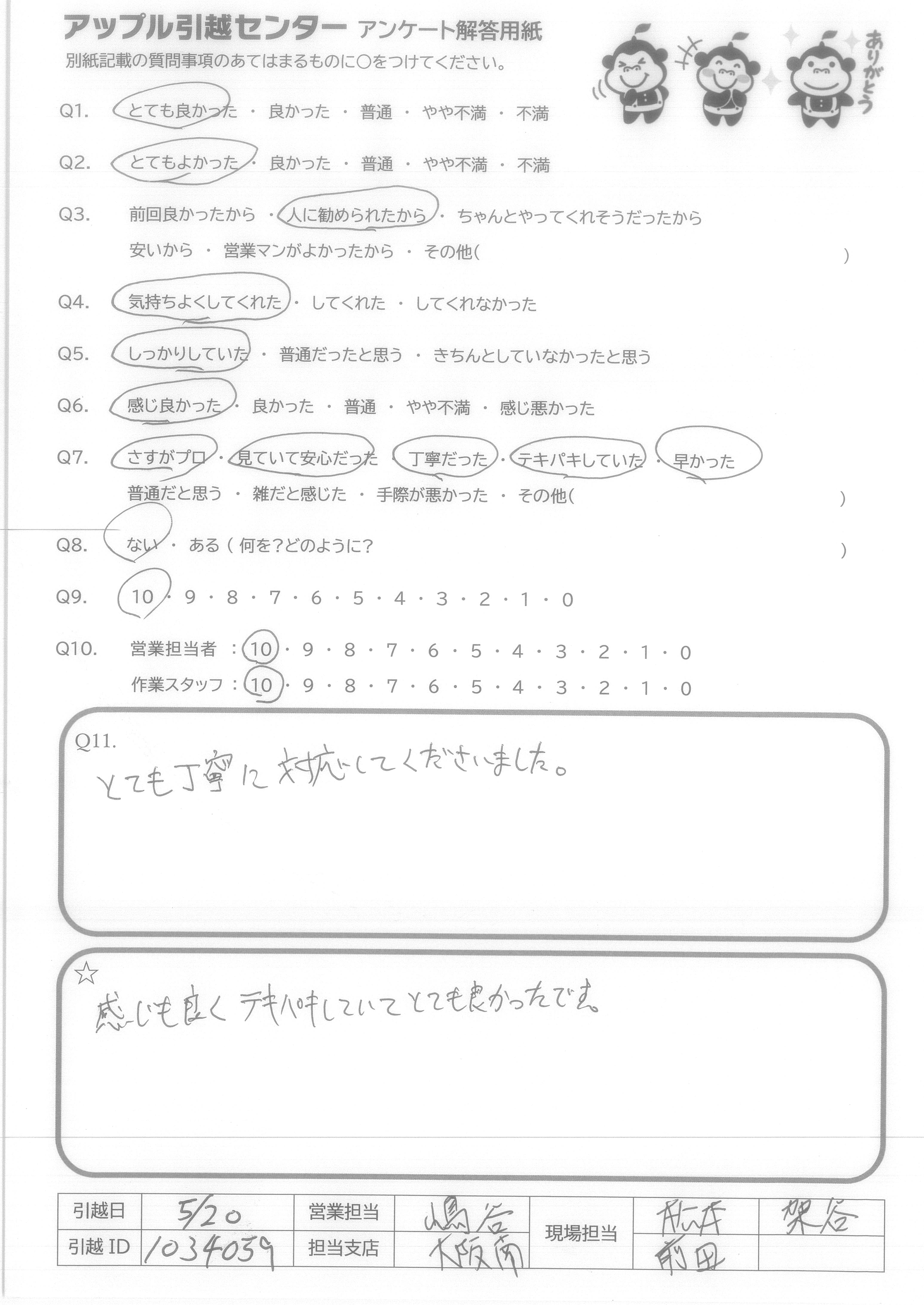 A.大変お世話になり、ありがとうございました。 電話の方、当日の方共に感じがよく、不安感はなかったです。 お支払の件でお手間をとらせて申し訳ありませんでした。 ひとつだけ、今後に生かしていただきたいのは、開始予定時間の1時間前にスタッフさんが到着されており、こちらも準備ができておらずお待たせしてしまったことと、事前に引っ越し先へのおおよその所要時間やそのあとに他の方の引っ越しが入ってる旨をお知らせいただけていればさらによかったと思います。 距離がややあるので、退去の立ち会いの後に新居に向かう予定だったので、今回は他の家族に先に新居に向かってもらってたので間に合いましたが、完全に一人だと全く間に合わなかったです。 全体的にとてもよかったので満足していますが、一人暮らしの方だとその点が困ると思うので、今後に生かしていただきたいです!