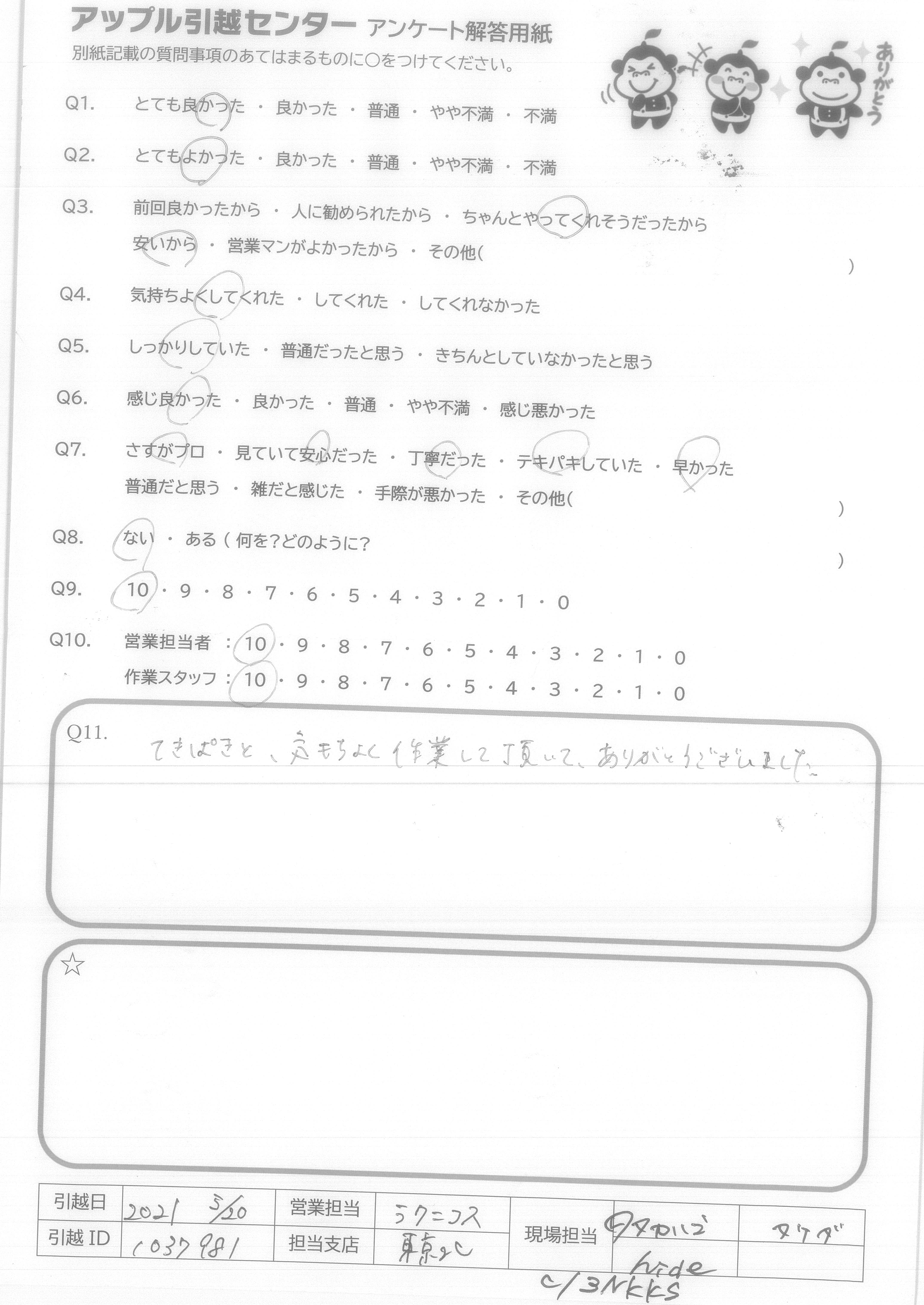 A.作業時間が予定通りかつ丁寧に行っていただけたため。移動後に少しお待たせしてしまったが、快くその後も対応していただけたため安心感があった。
