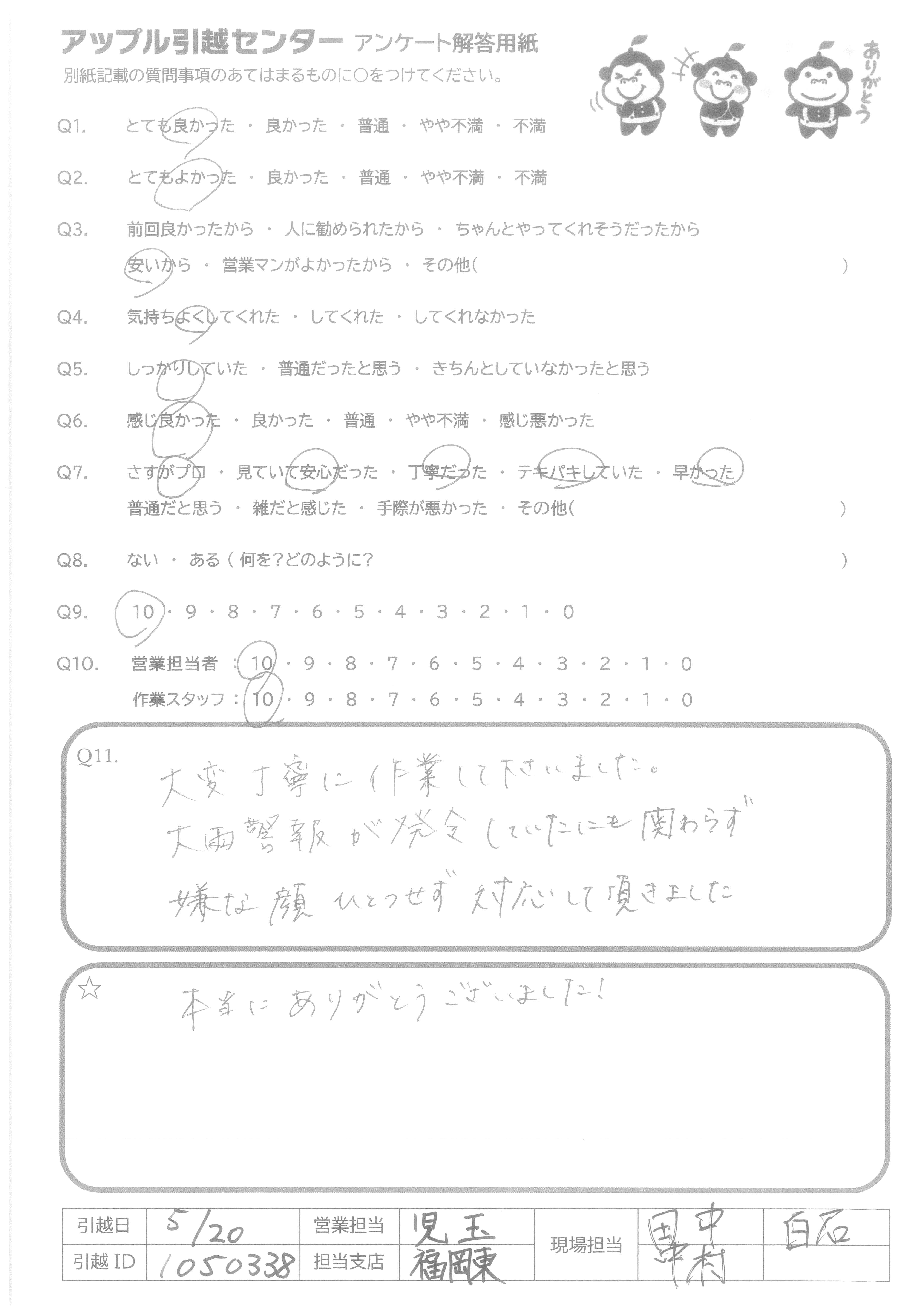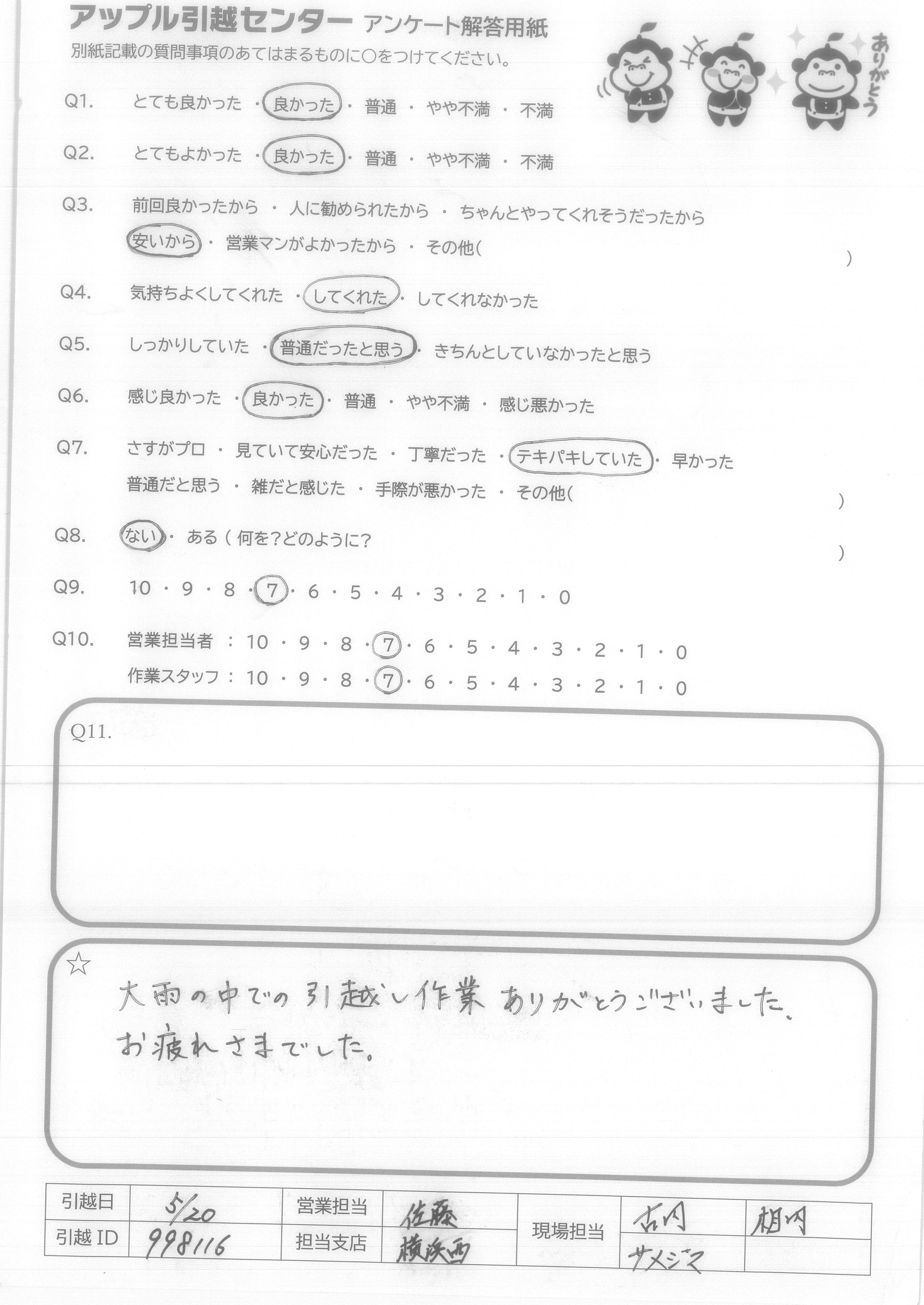 A.大雨の中での引越し作業ありがとうございました。 お疲れさまでした。
