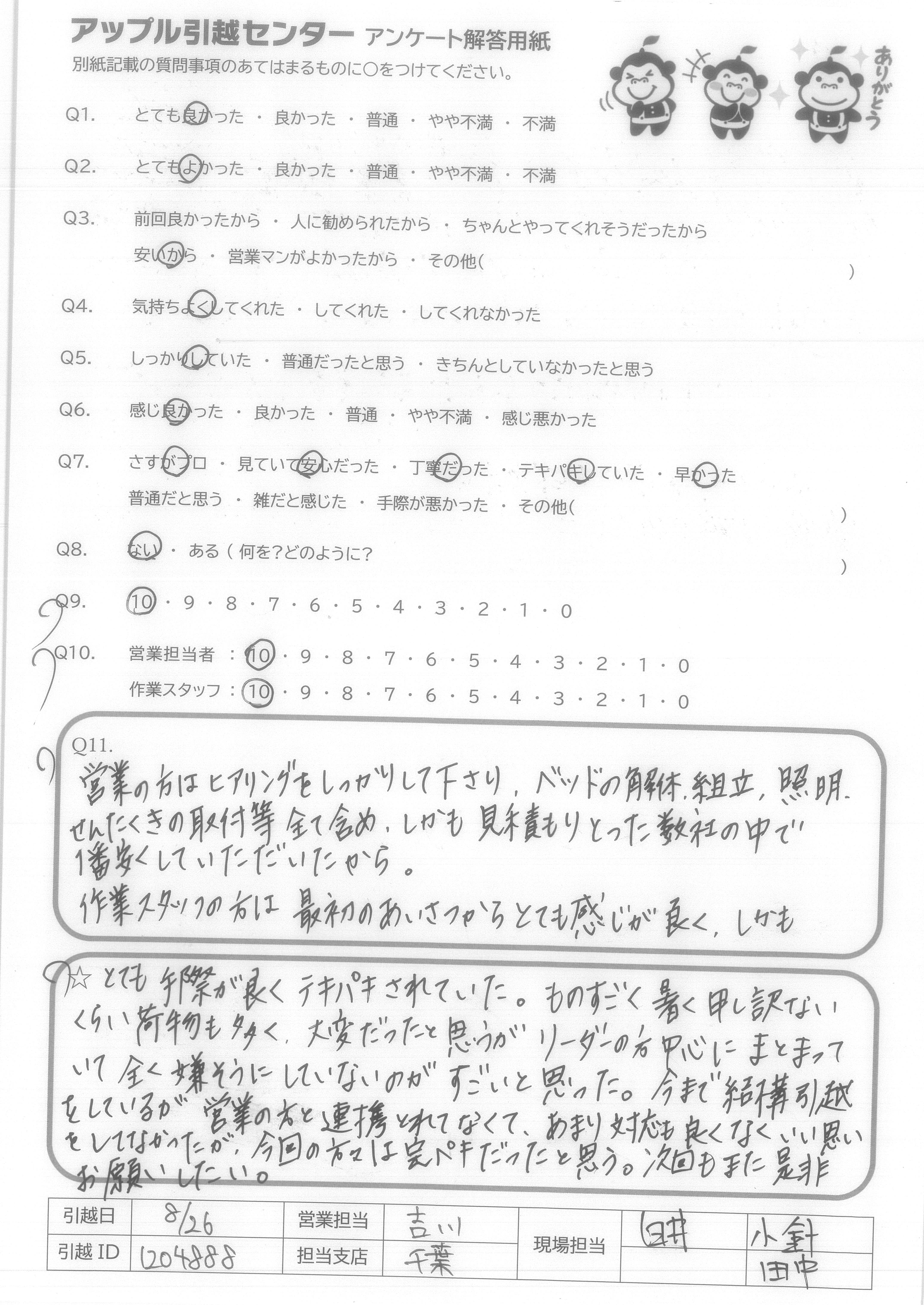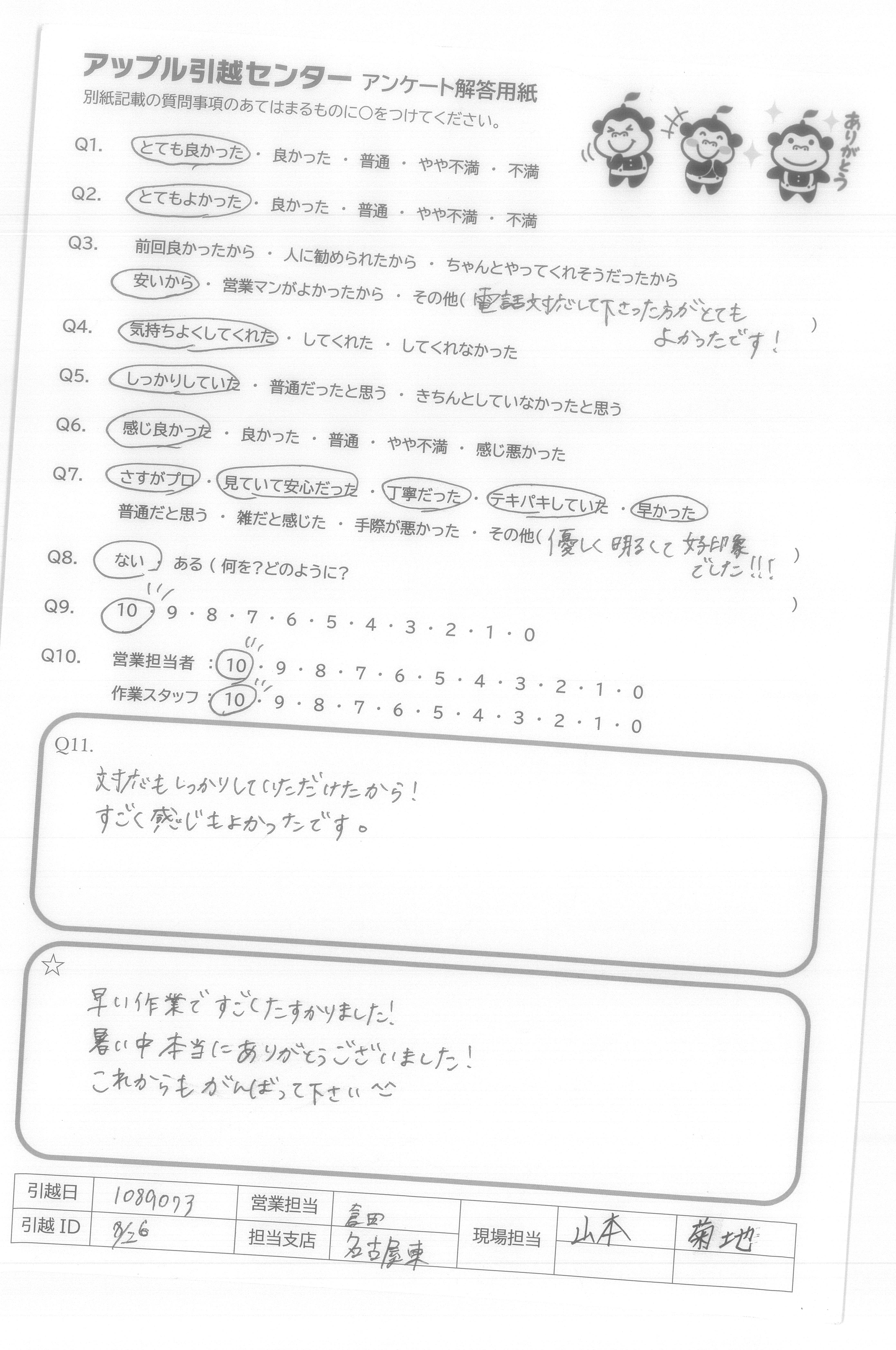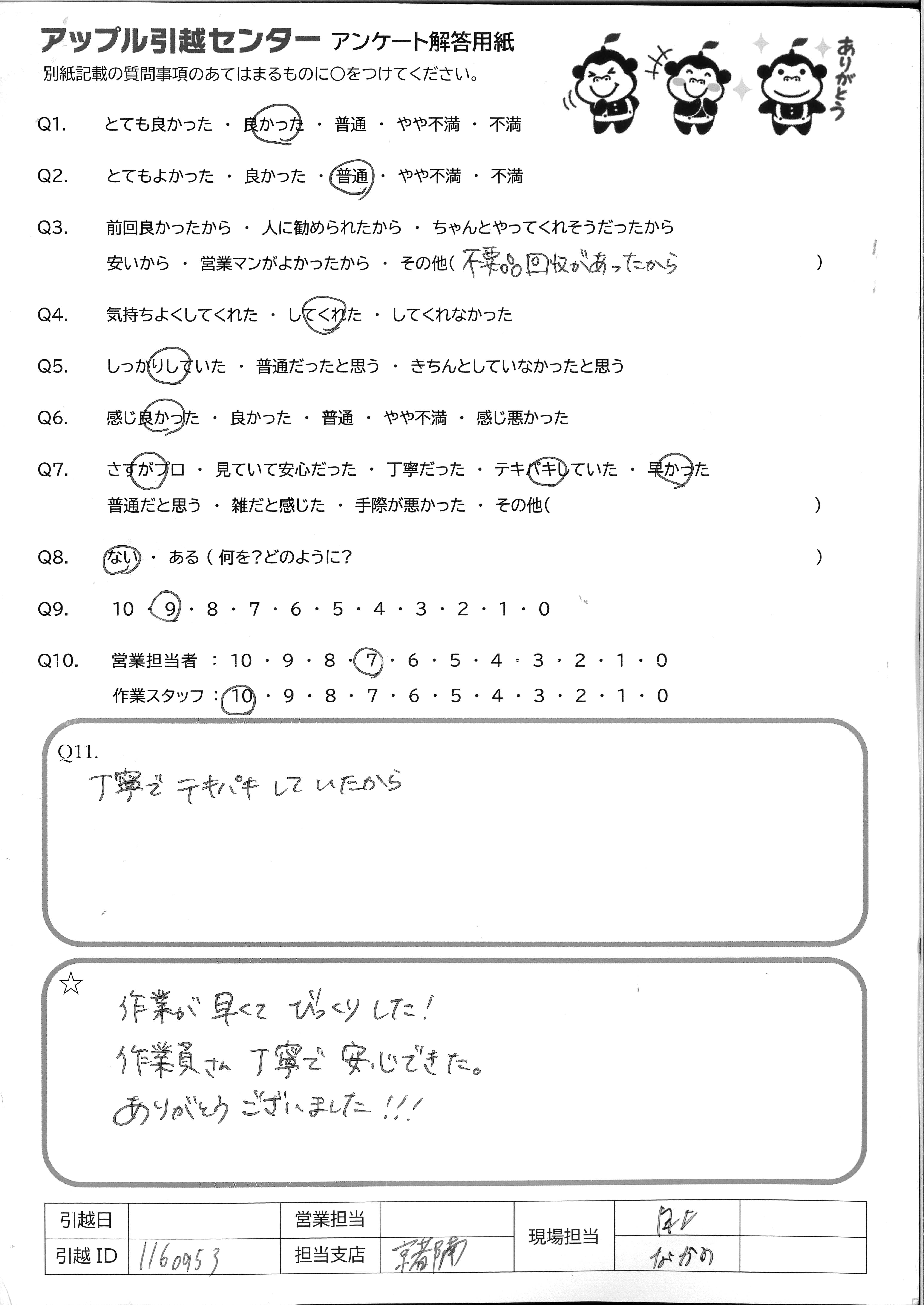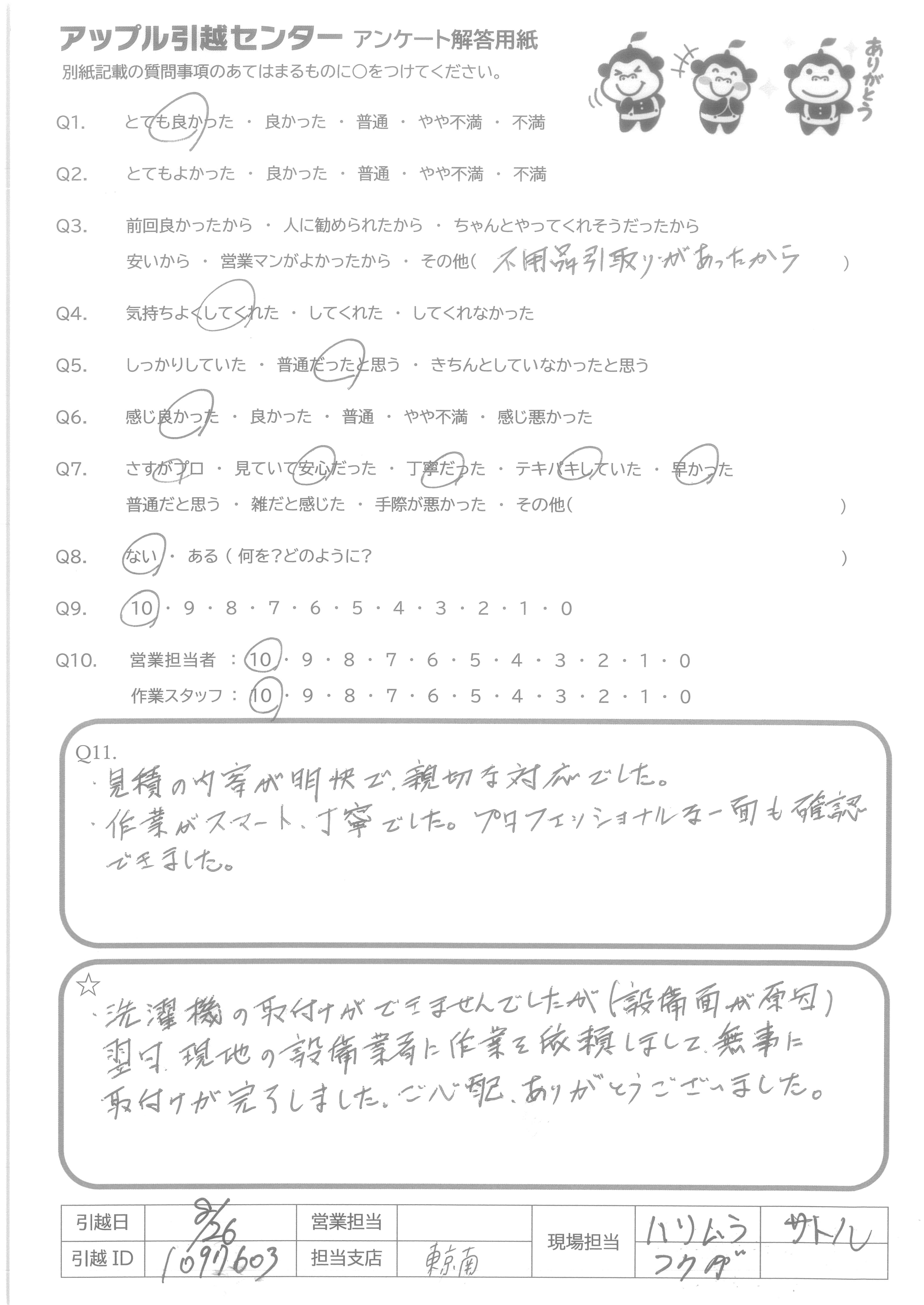 A.Q9 ネットでの申し込みが楽で、引越しまでの作業の中で変更点があれば手軽に変更できたのがとても良かったです。家具の引き取りなど Q10 今回担当して頂いた方達もとても良かったですが、同居する愛ての引越しの担当の方々もとても良い人たちだったので、誰が来ても安心だと思いました。
