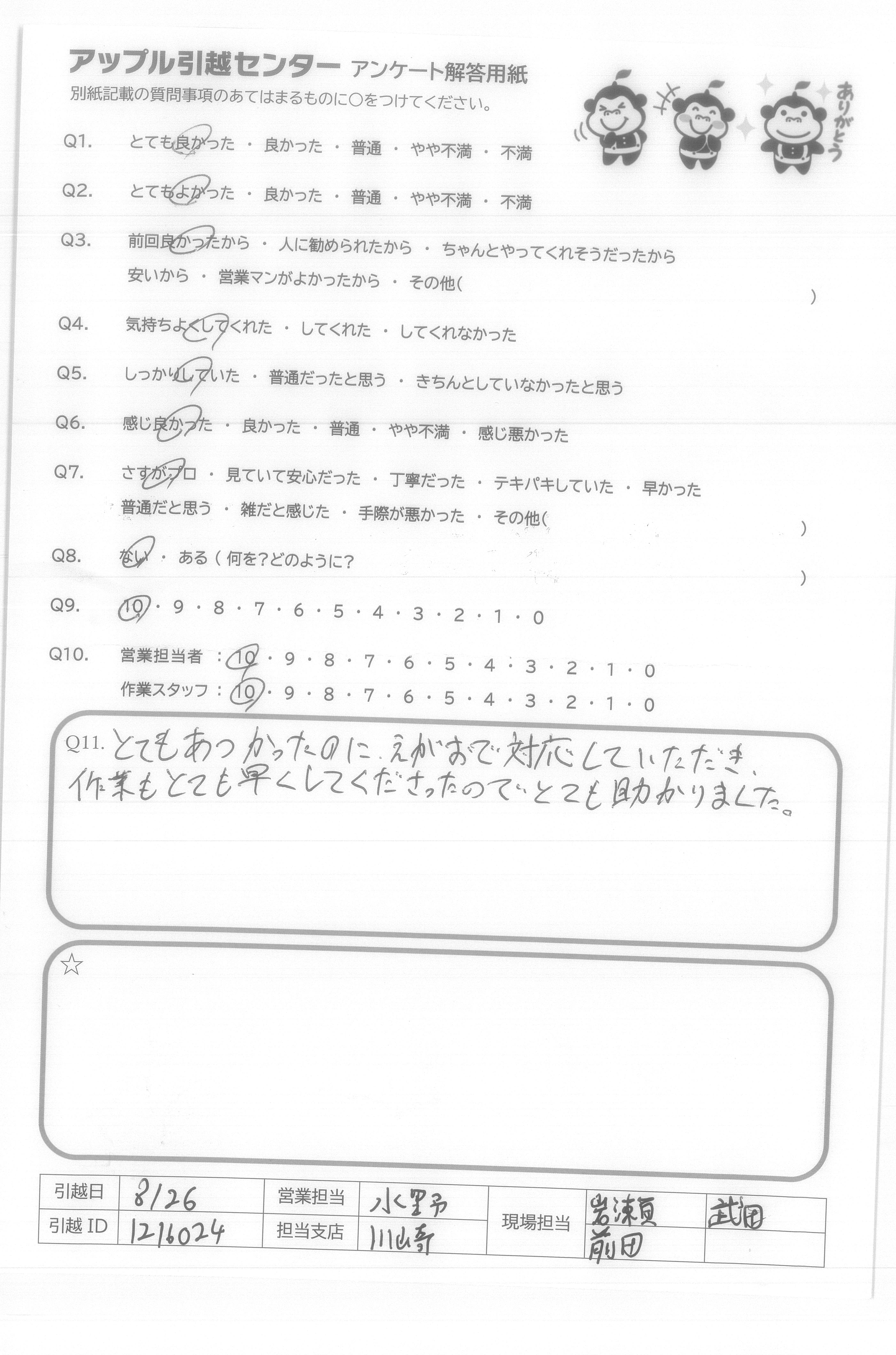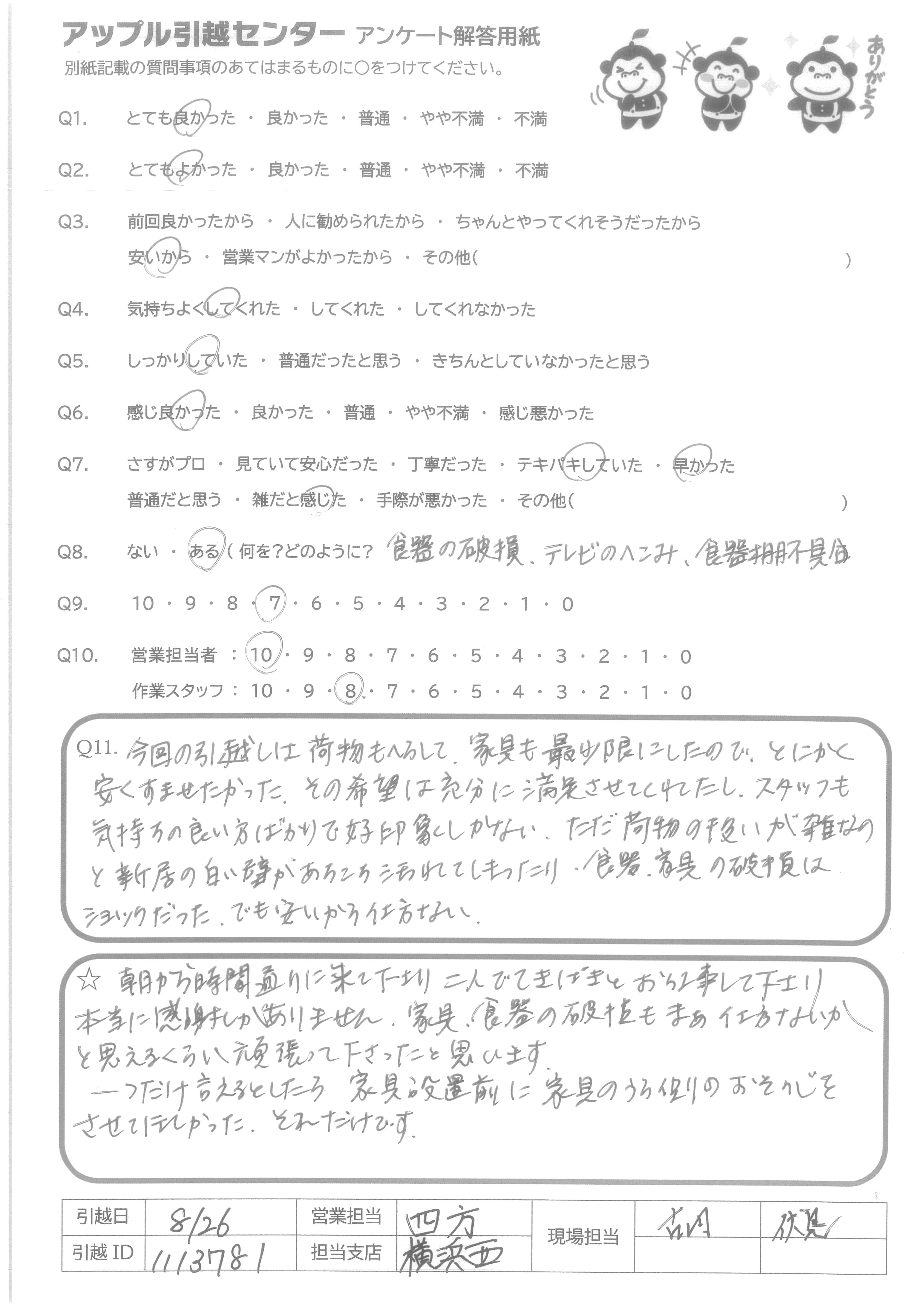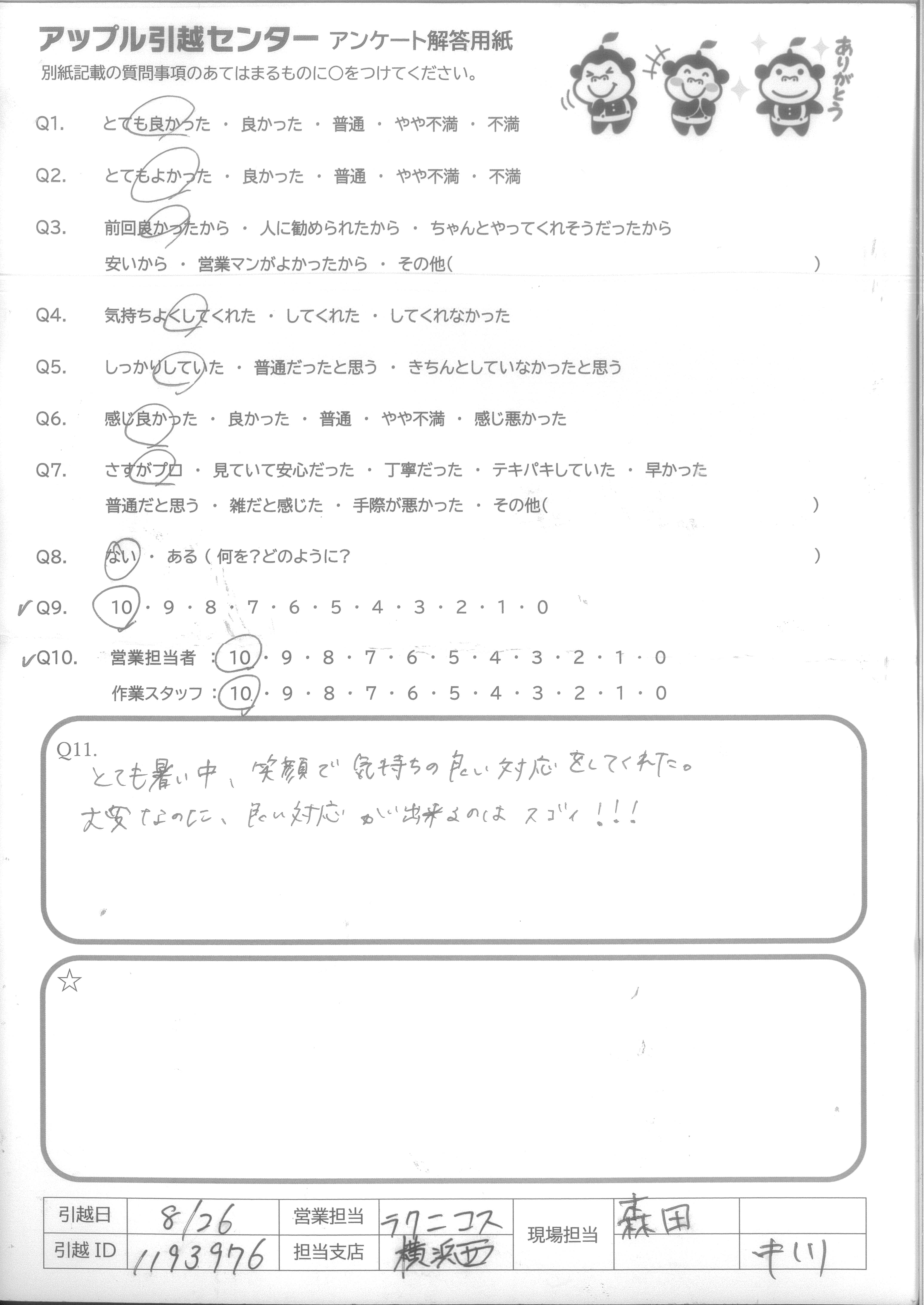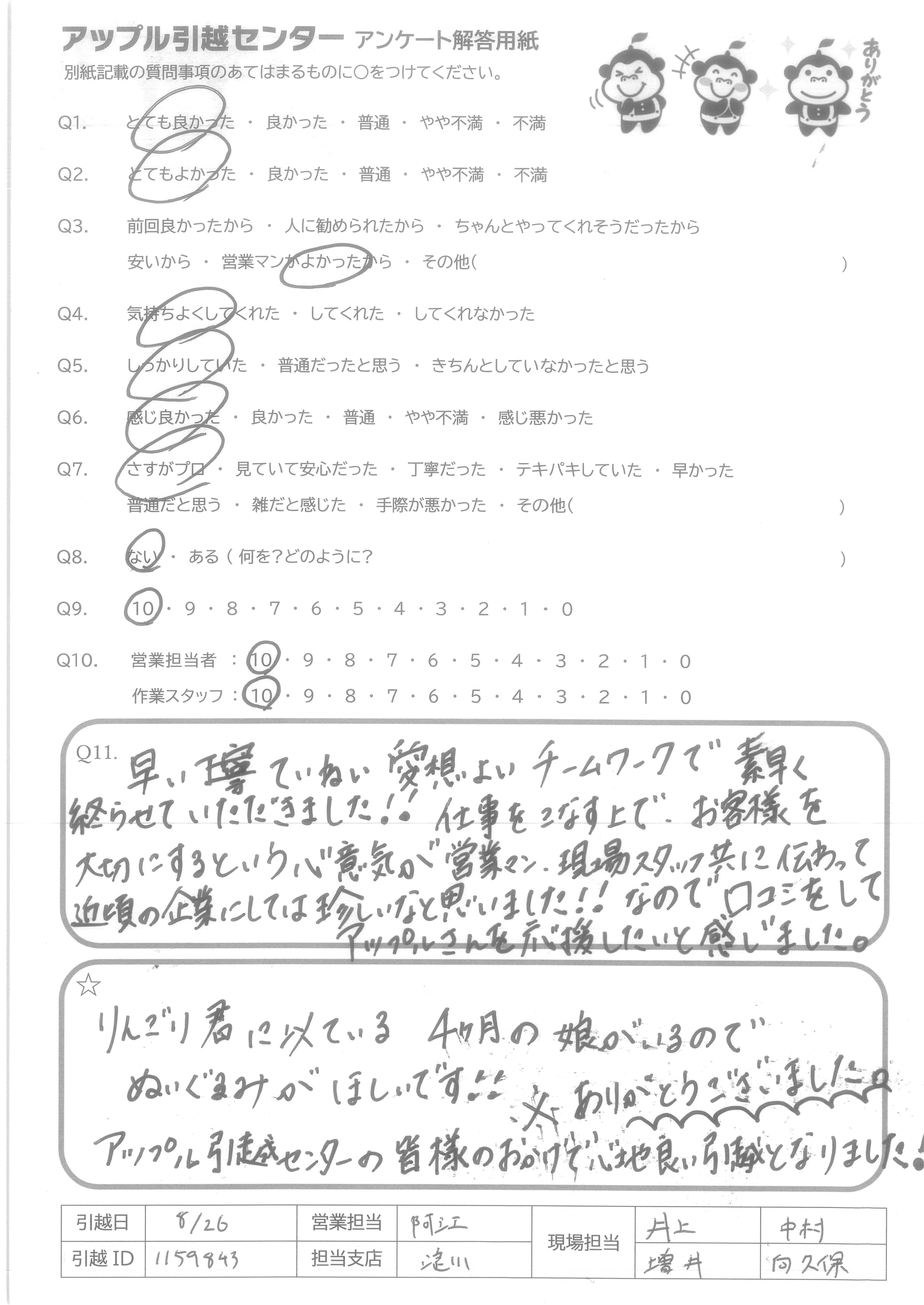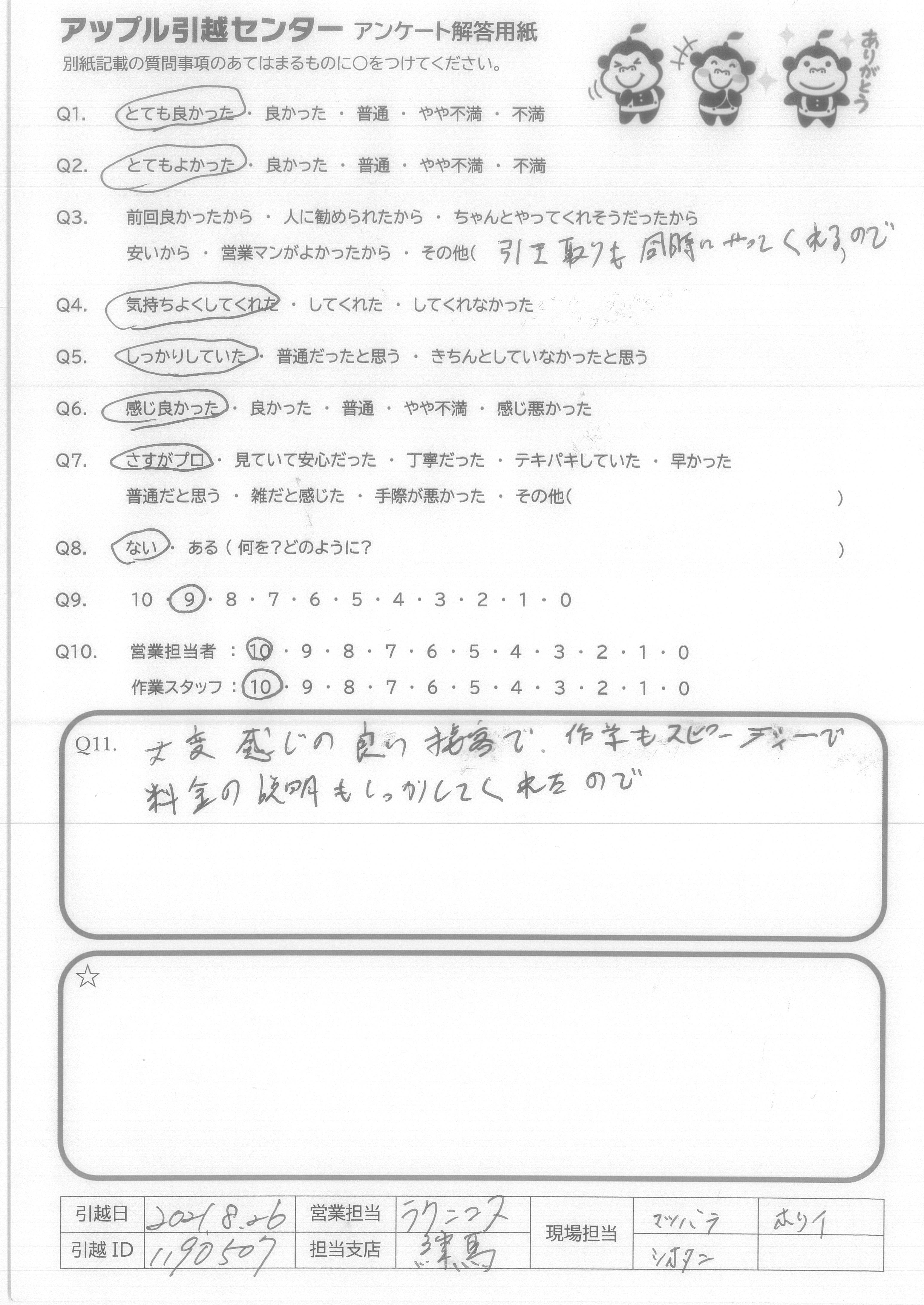 A.最初に対応して下さった一楽さんの対応がすばらしくこちらのワガママも快く受け入れて下さりすごく助かりました。8/26引越し当日も東山さん、金丸さん、森田さんがテキパキ動いて下さり、とてもスムーズかつ安心して引越すことができました。 応援で来て下さったスタッフの皆さんの対応もすごくよかったです! 最後まで手伝って下さった東山さんのホスピタリティー精神、すばらしかったです。