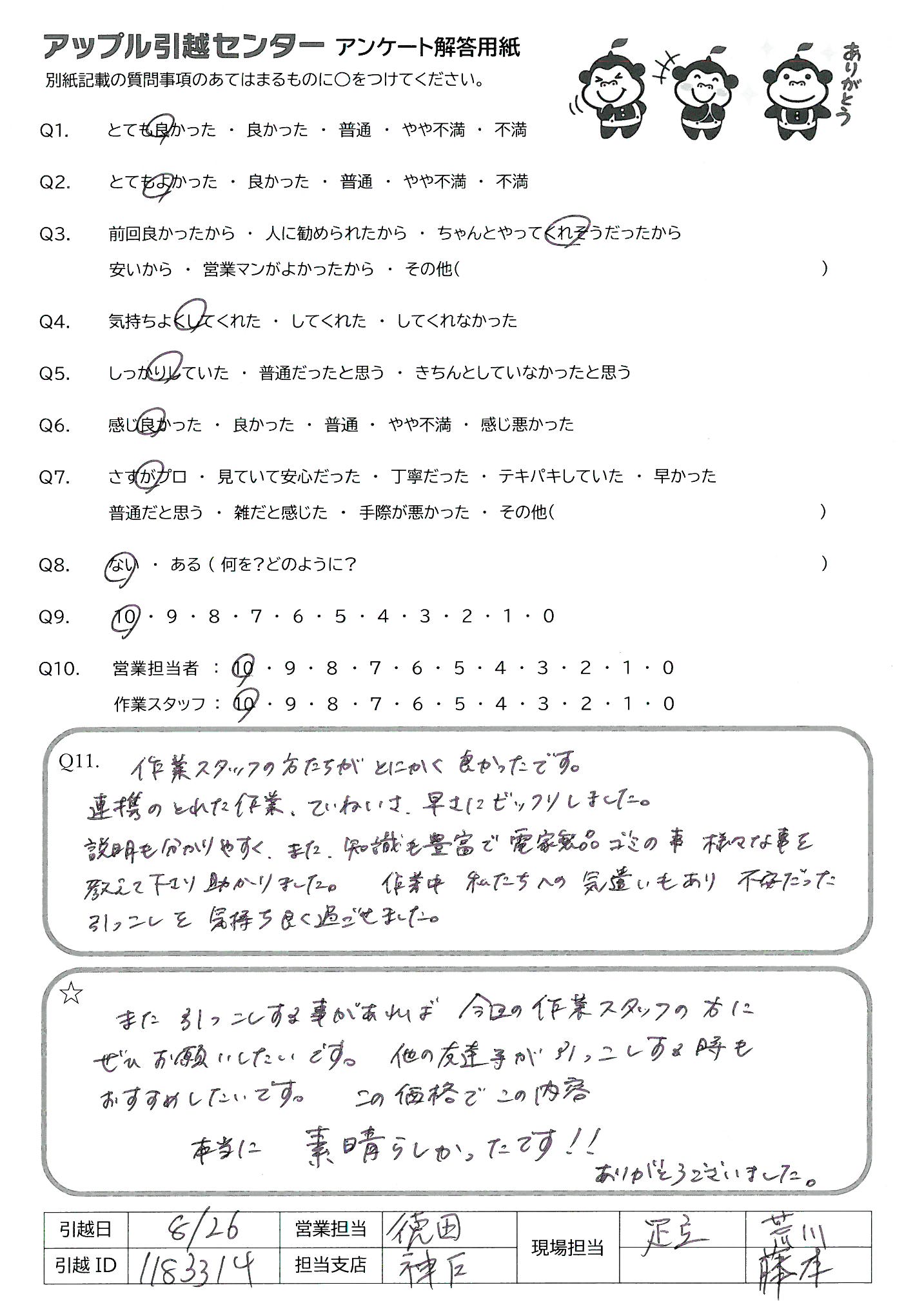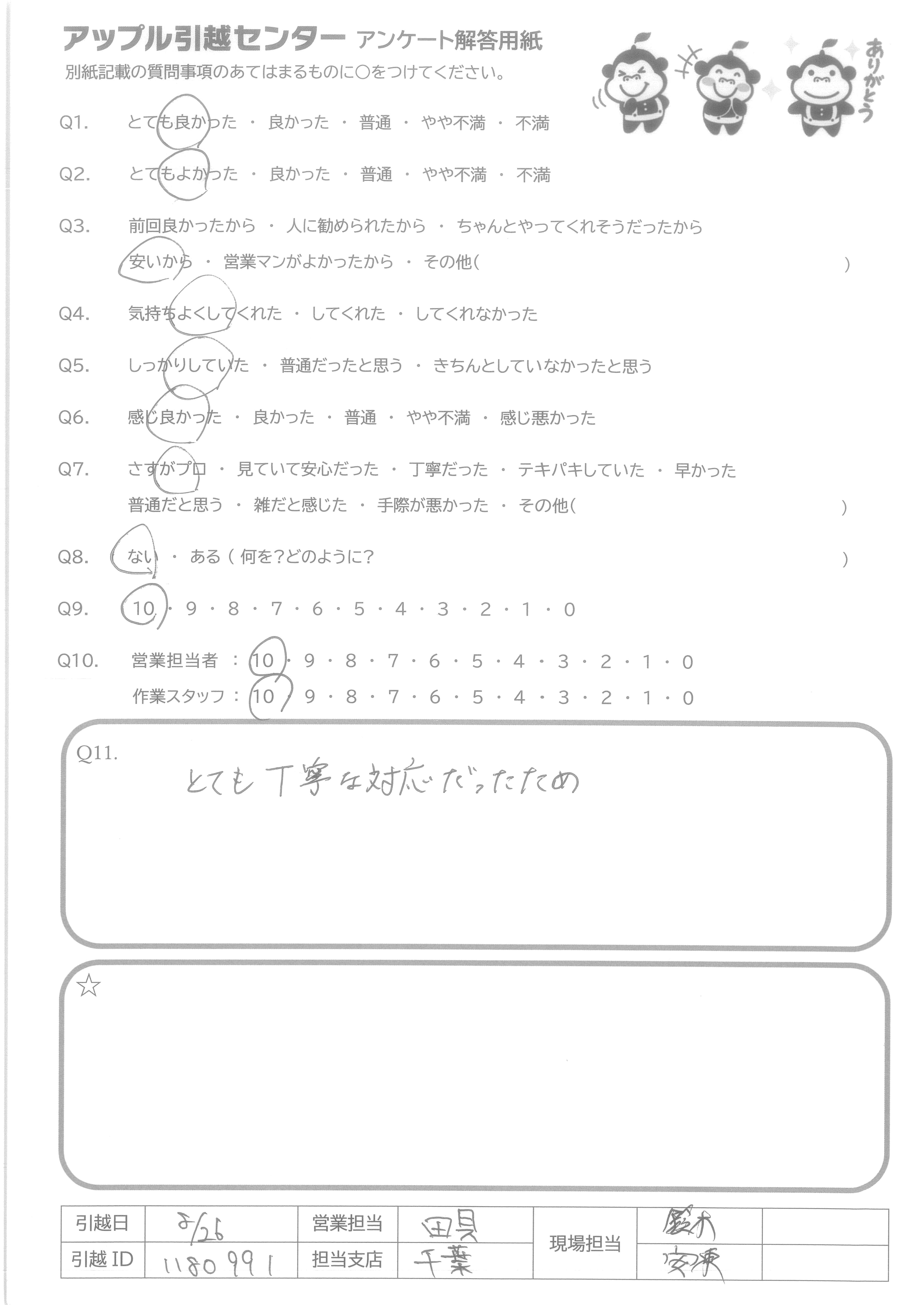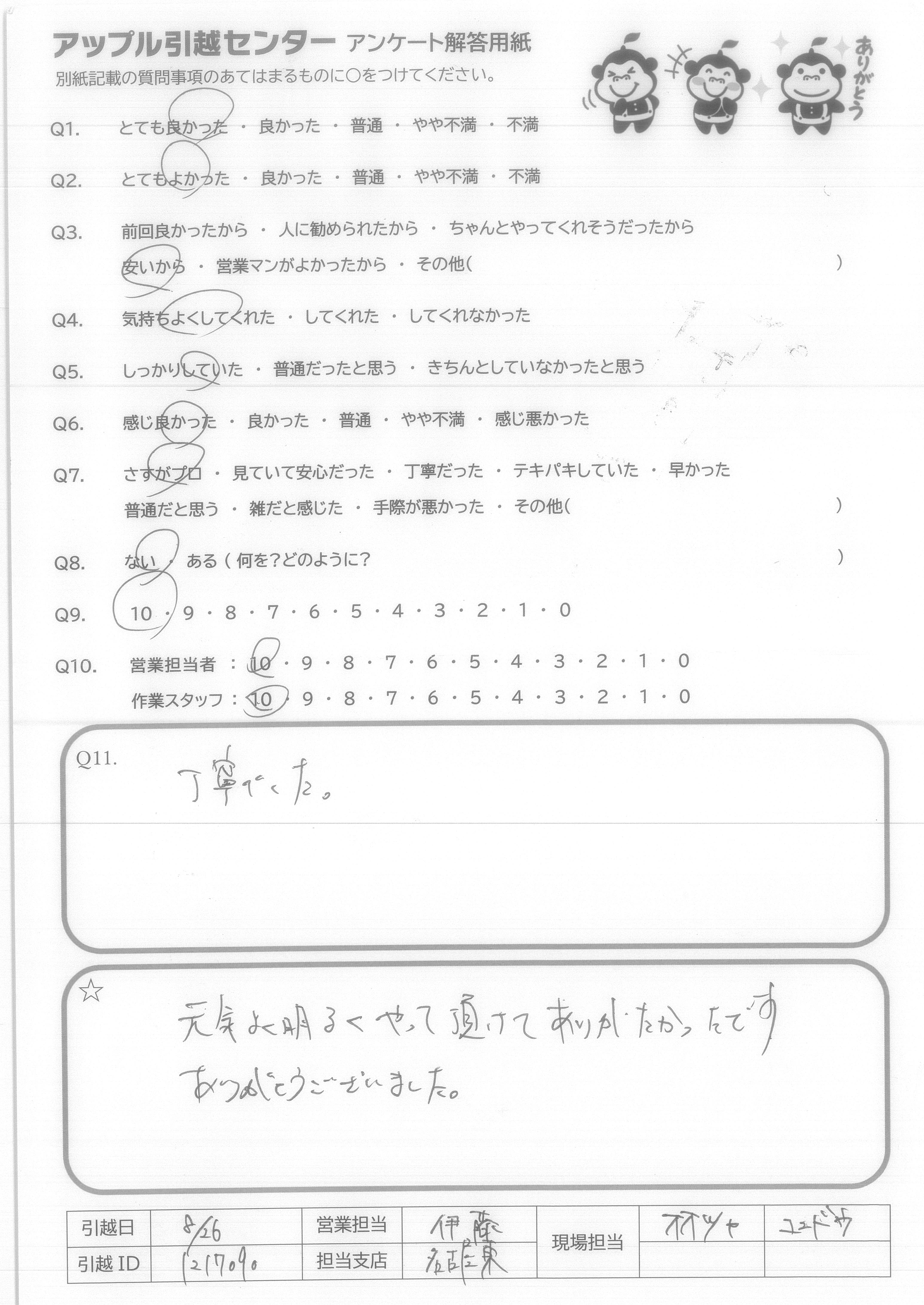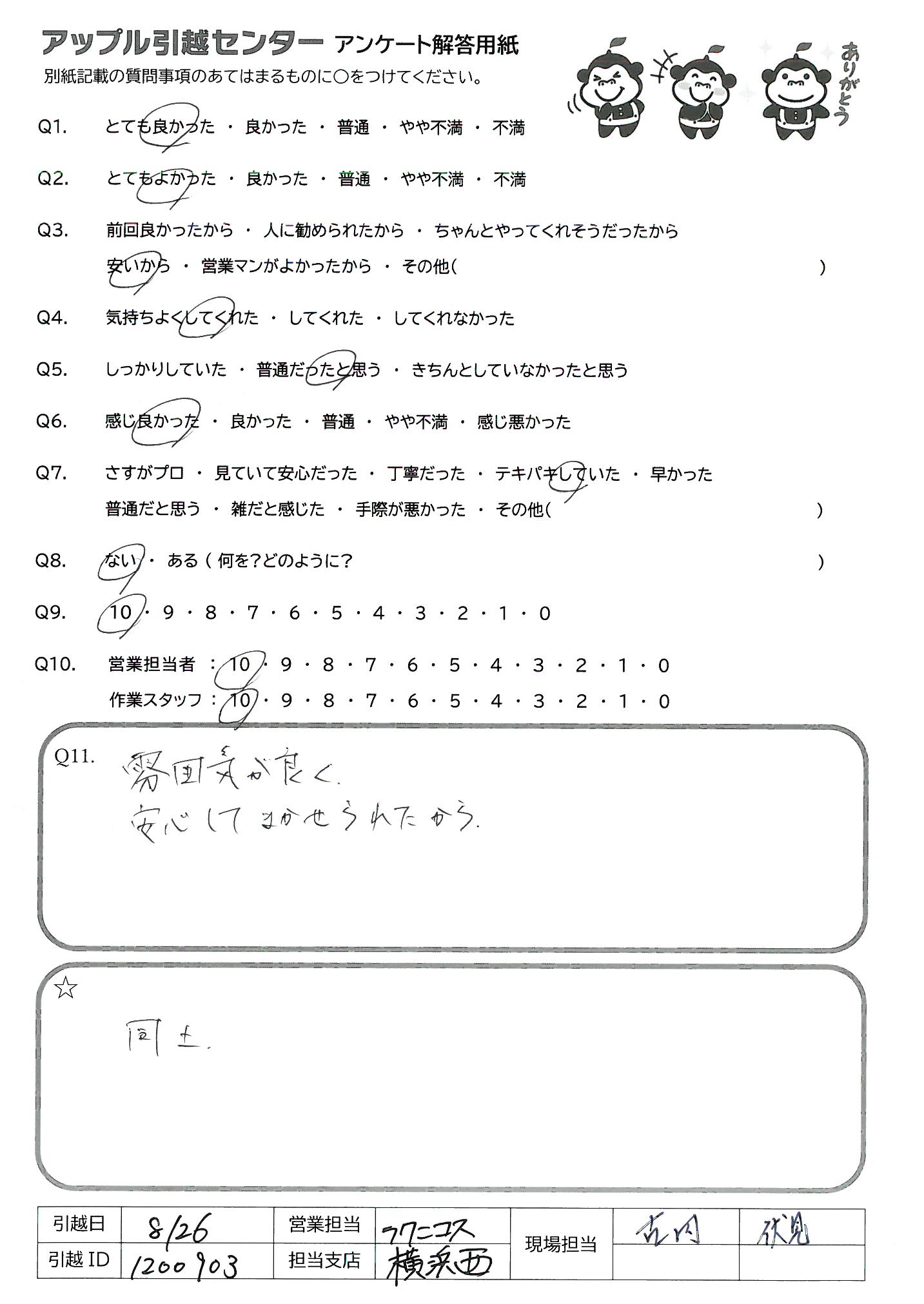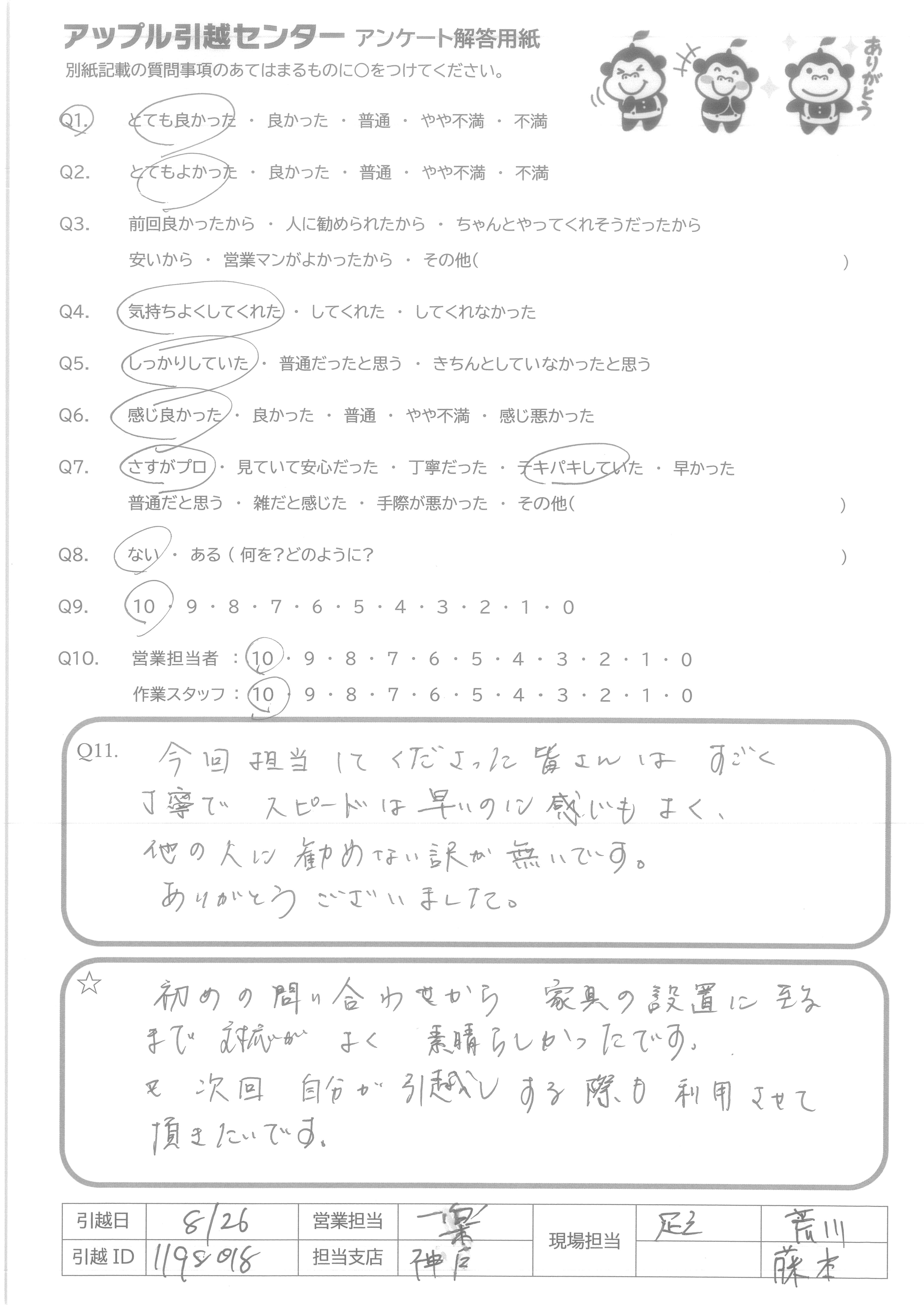 A.最初に対応して下さった一楽さんの対応がすばらしくこちらのワガママも快く受け入れて下さりすごく助かりました。8/26引越し当日も東山さん、金丸さん、森田さんがテキパキ動いて下さり、とてもスムーズかつ安心して引越すことができました。 応援で来て下さったスタッフの皆さんの対応もすごくよかったです! 最後まで手伝って下さった東山さんのホスピタリティー精神、すばらしかったです。