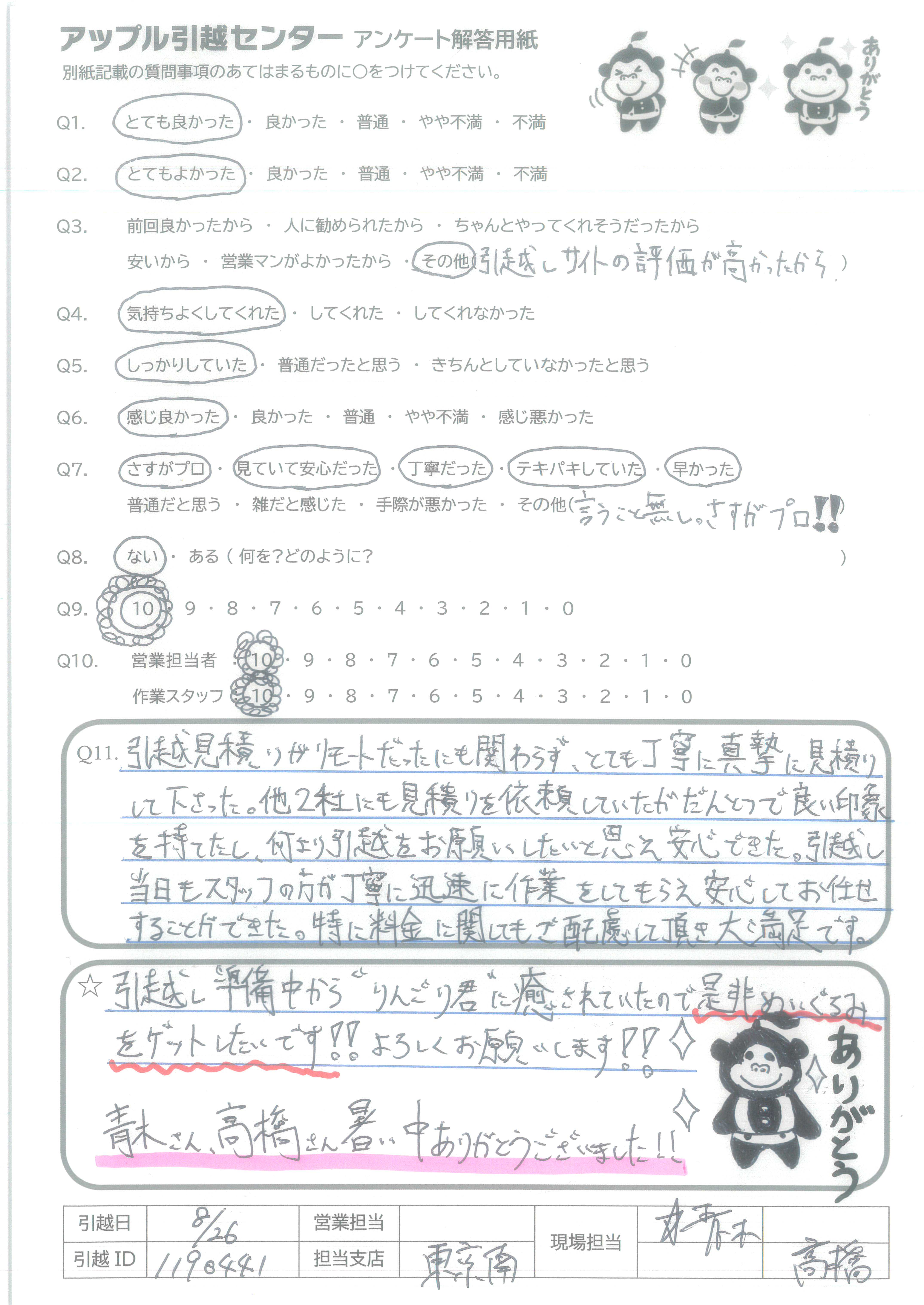 A.今回は5階のエレベーターのない所からの引越しでとても大変だったと思いますが、嫌な顔ひとつせず爽やかに作業を進めて頂き本当にありがとうございました! 次に引越しをする時も必ずお願いしようと思います。りんごり君かわいいです。