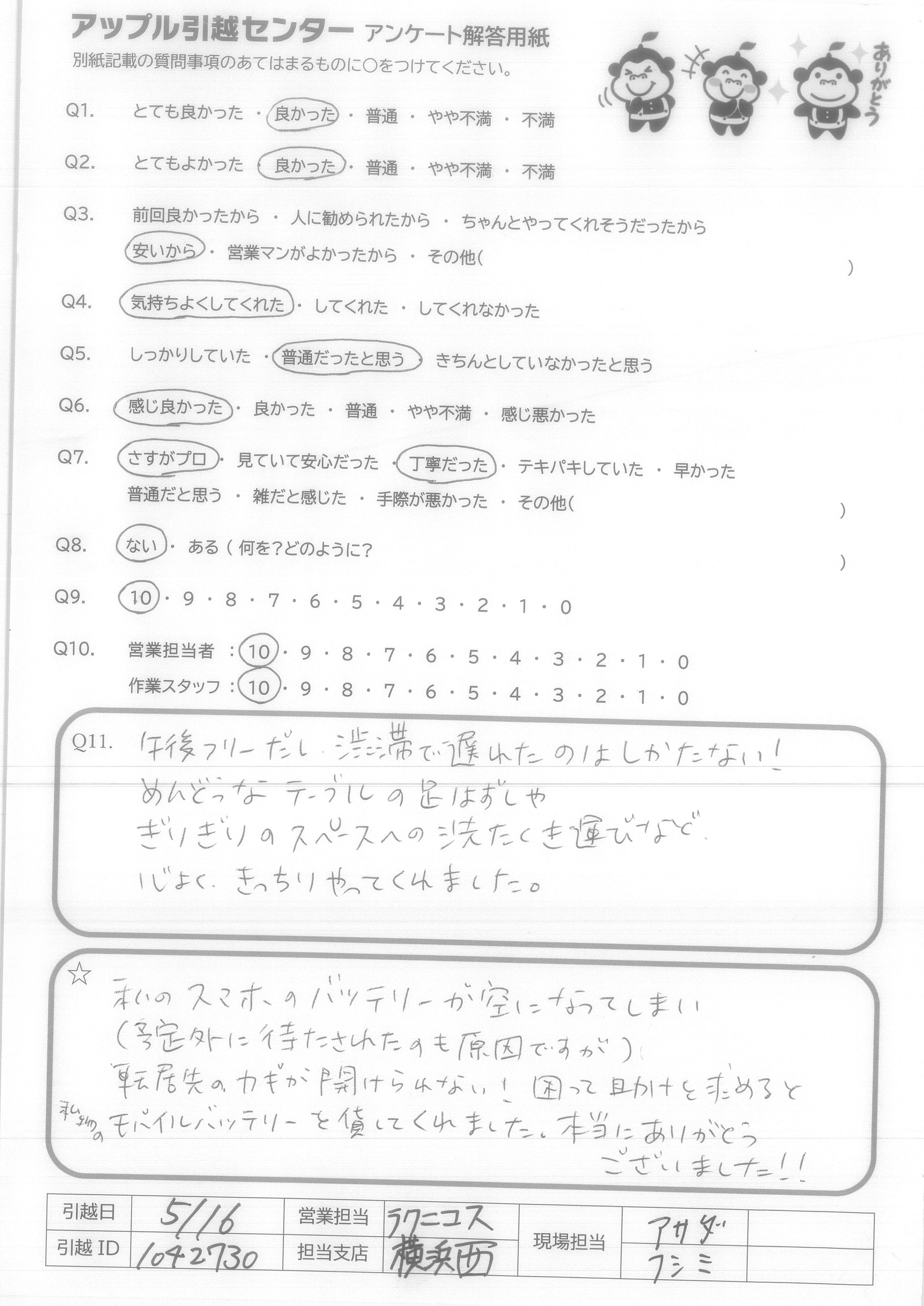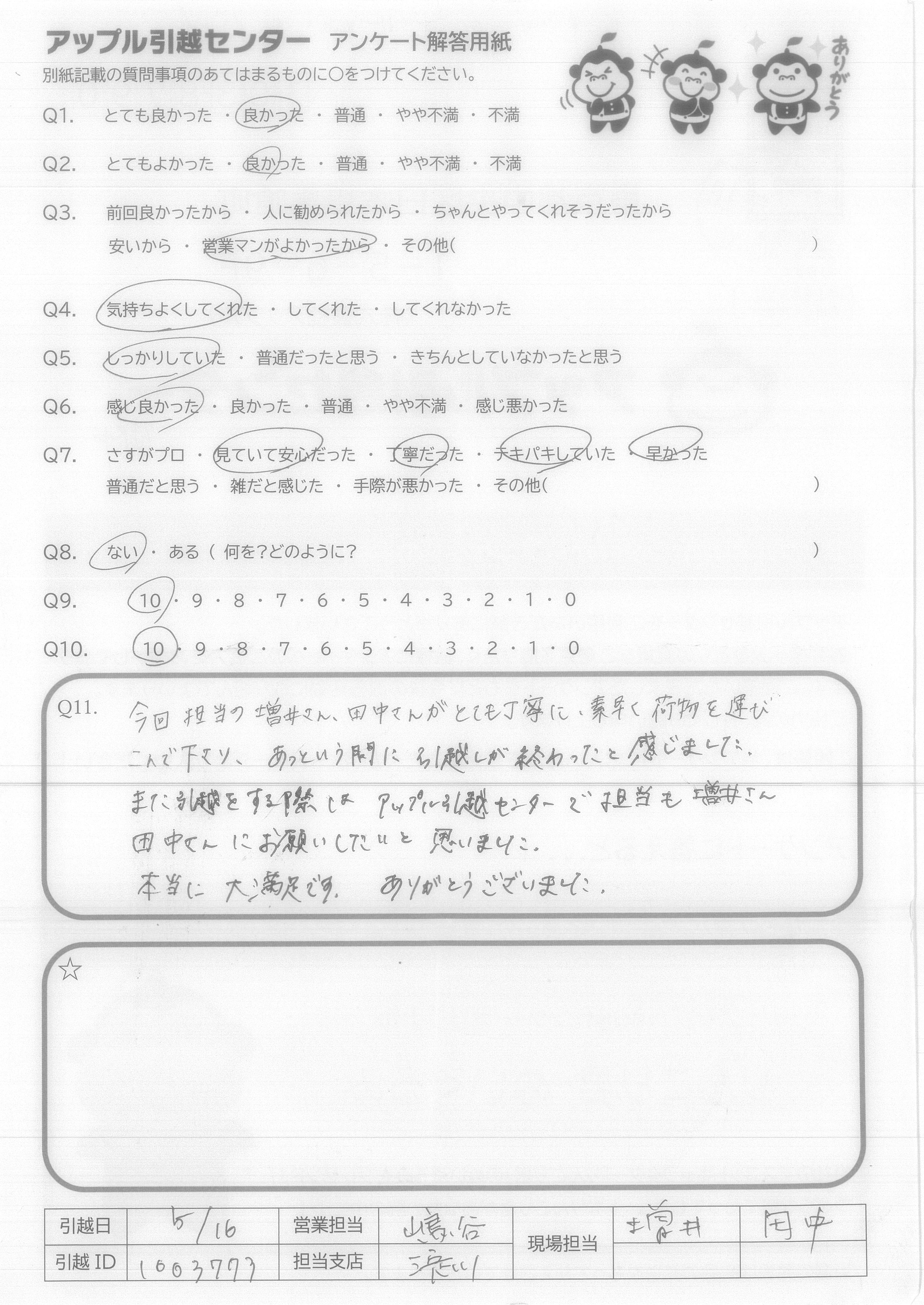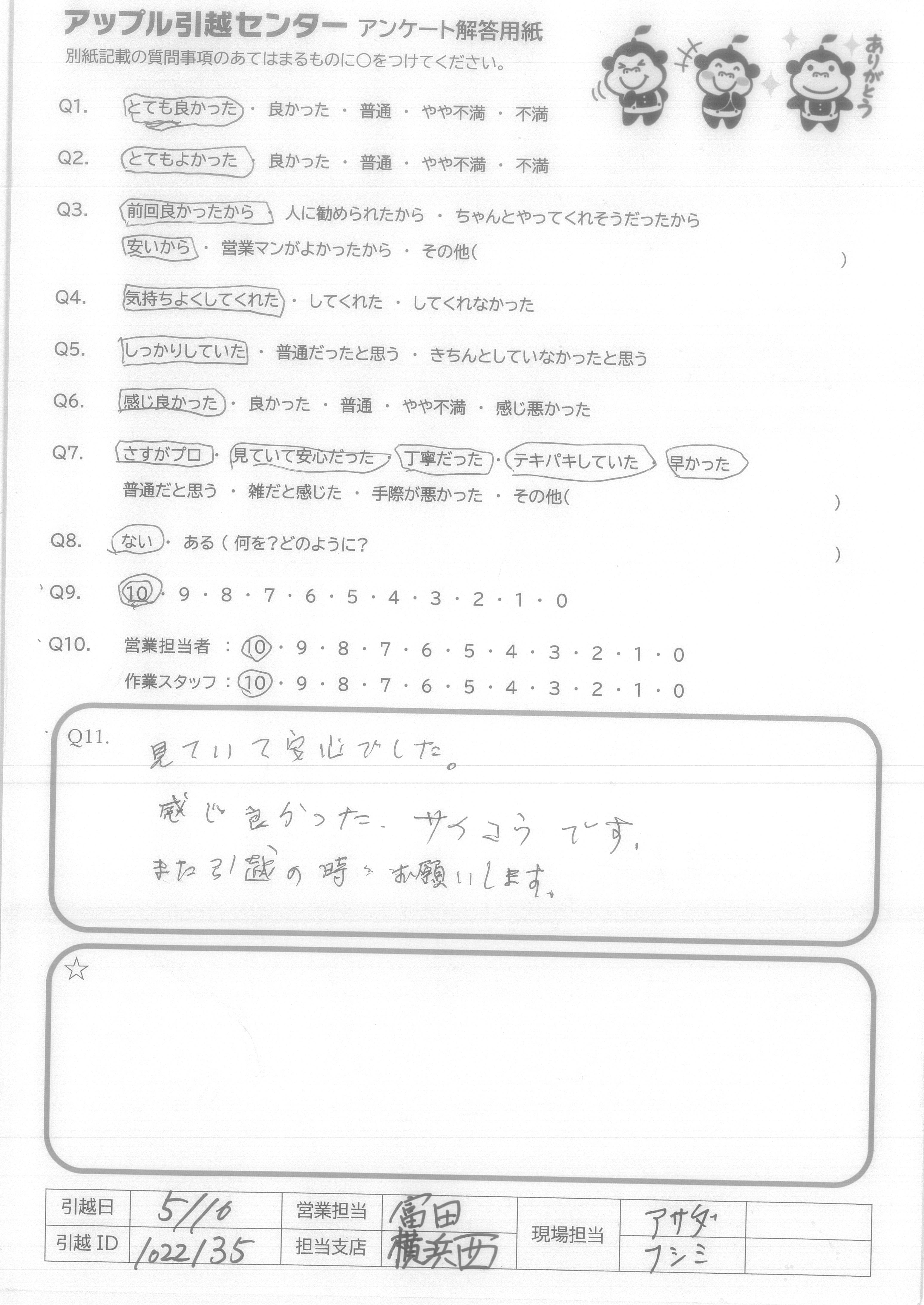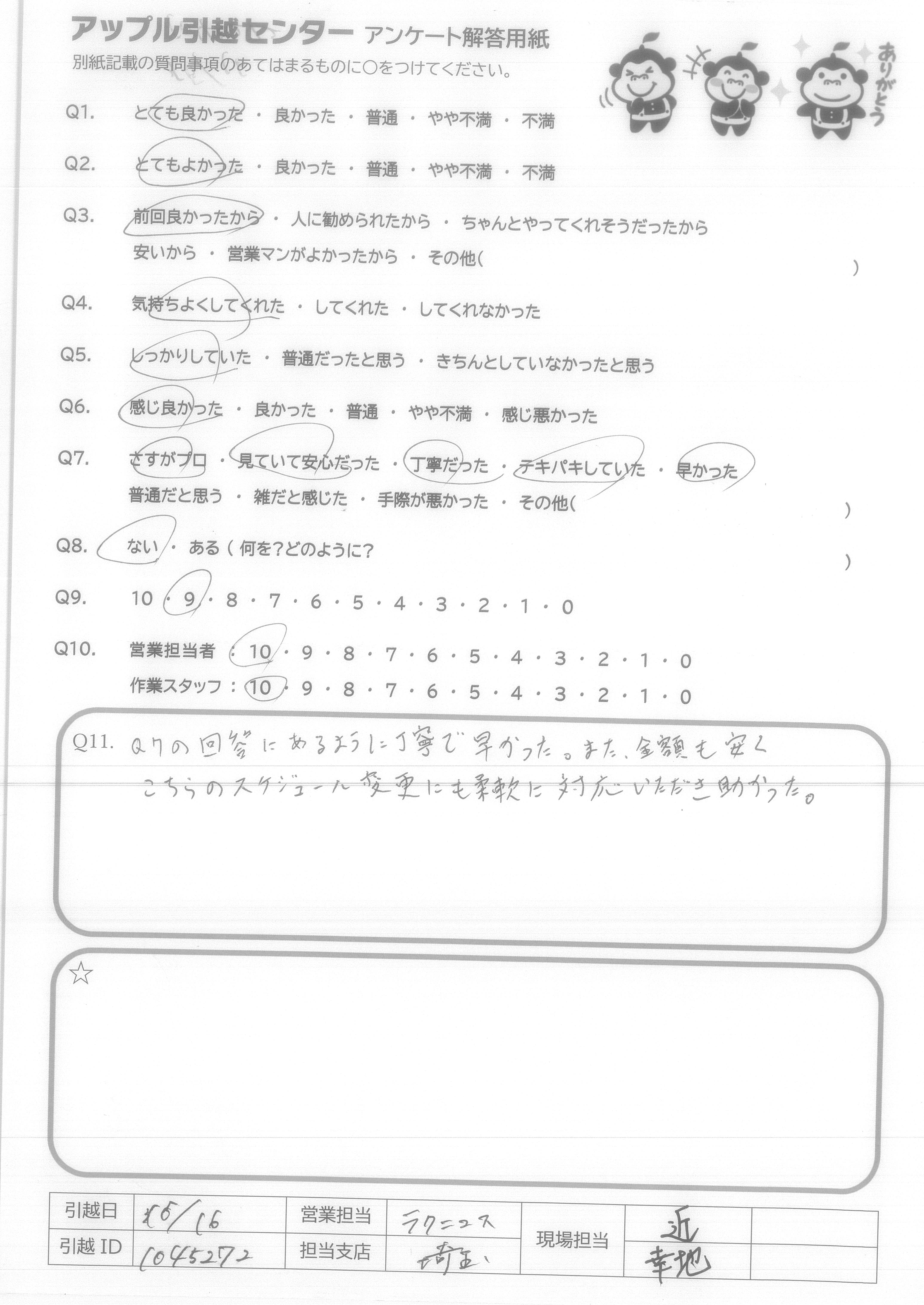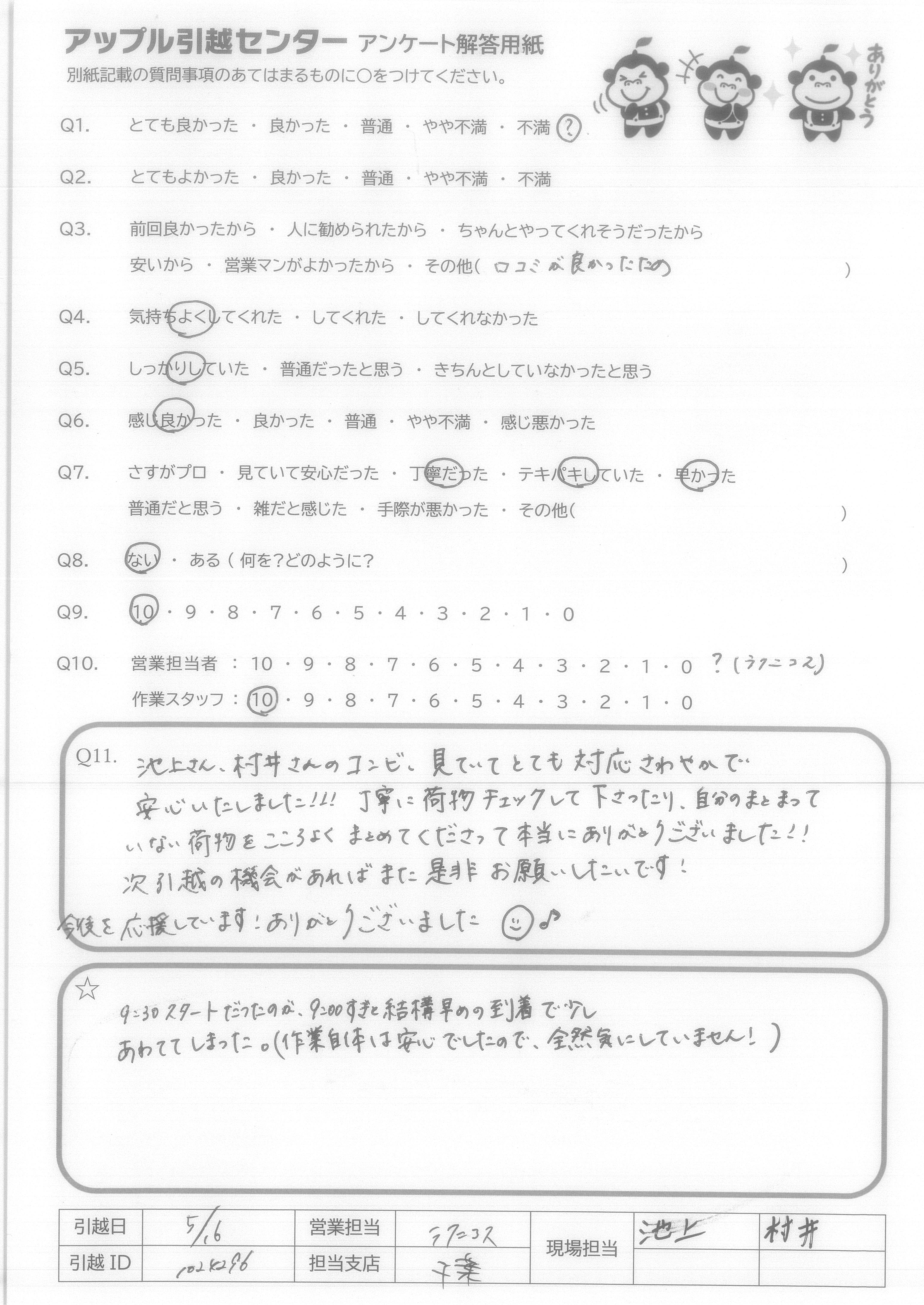 A.池上さん、村井さんのコンビ、見ていてとても対応さわやかで安心いたしました!!!丁寧に荷物チェックして下さったり、自分のまとまっていない荷物をこころよくまとめてくださって本当にありがとうございました!! 次引越の機会があればまた是非お願いしたいです! 今後を応援しています!ありがとうございました。
