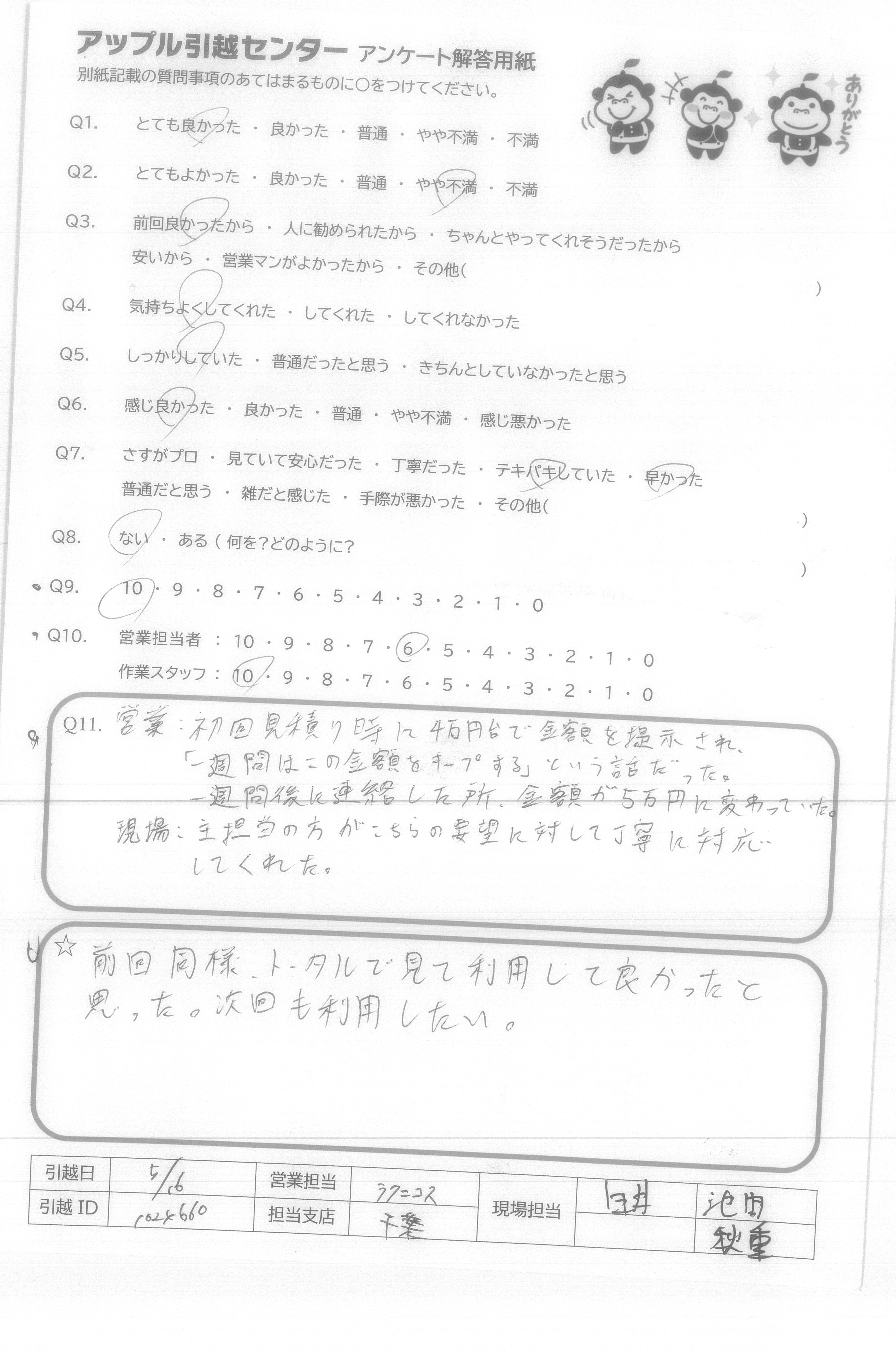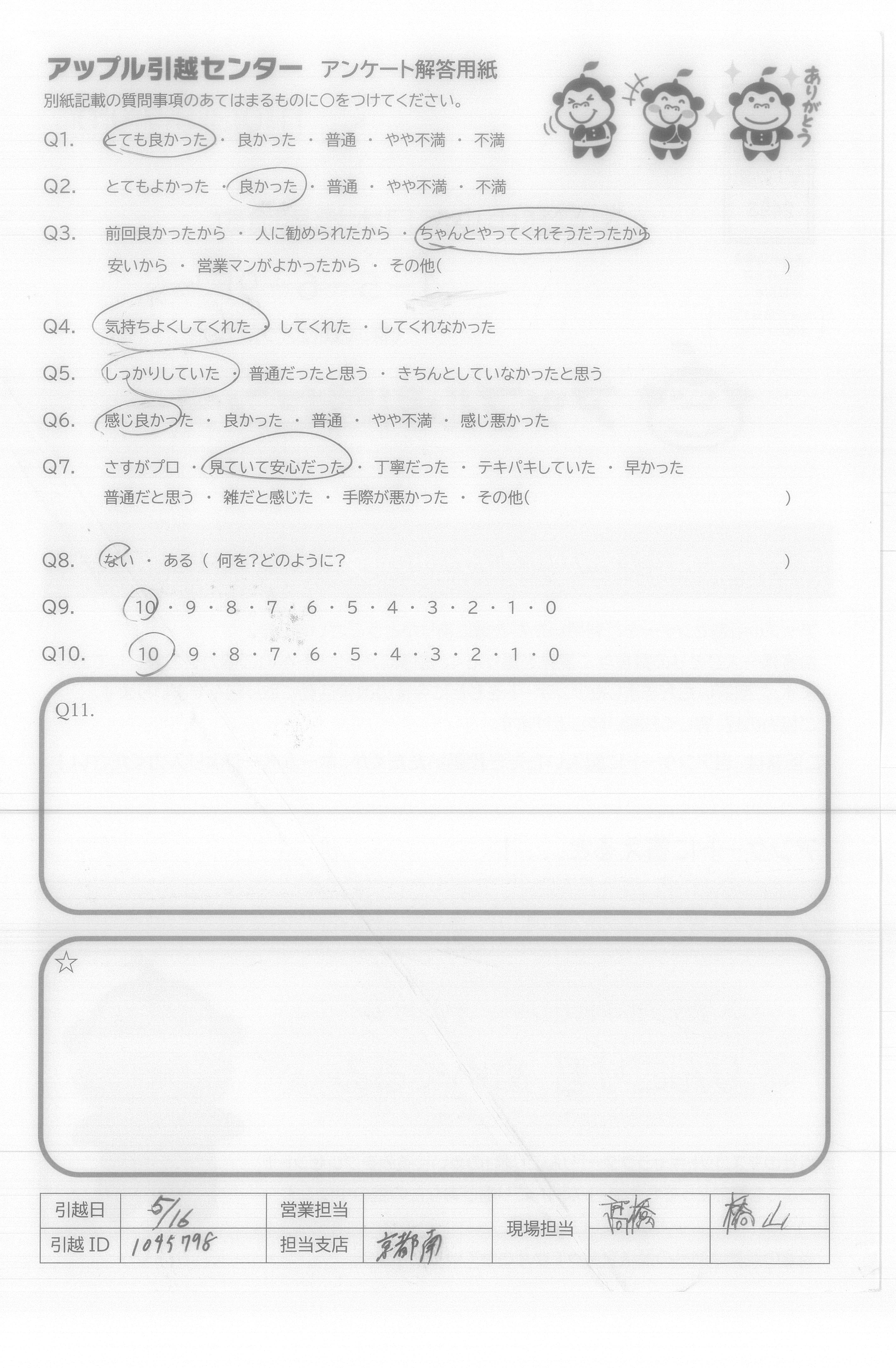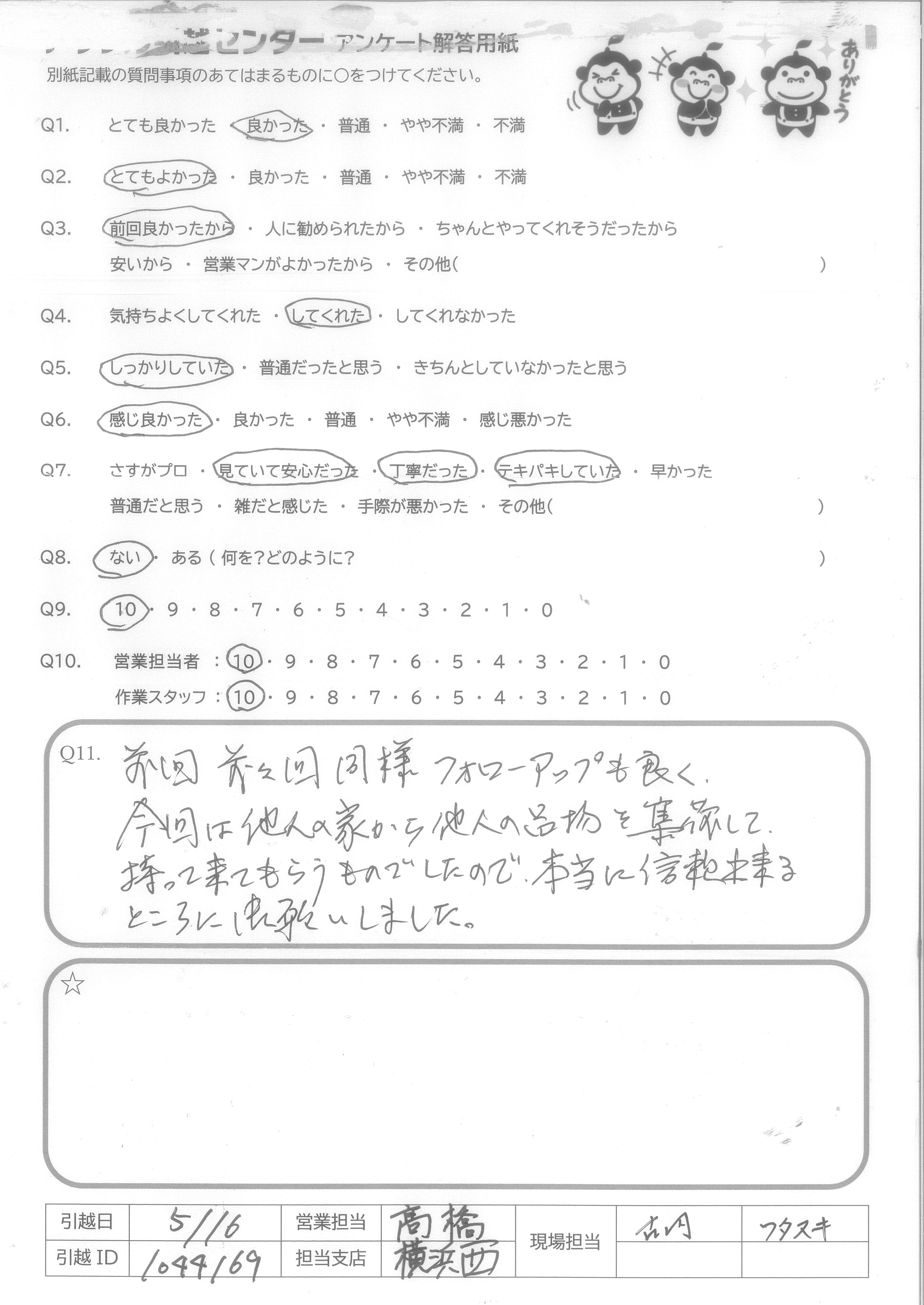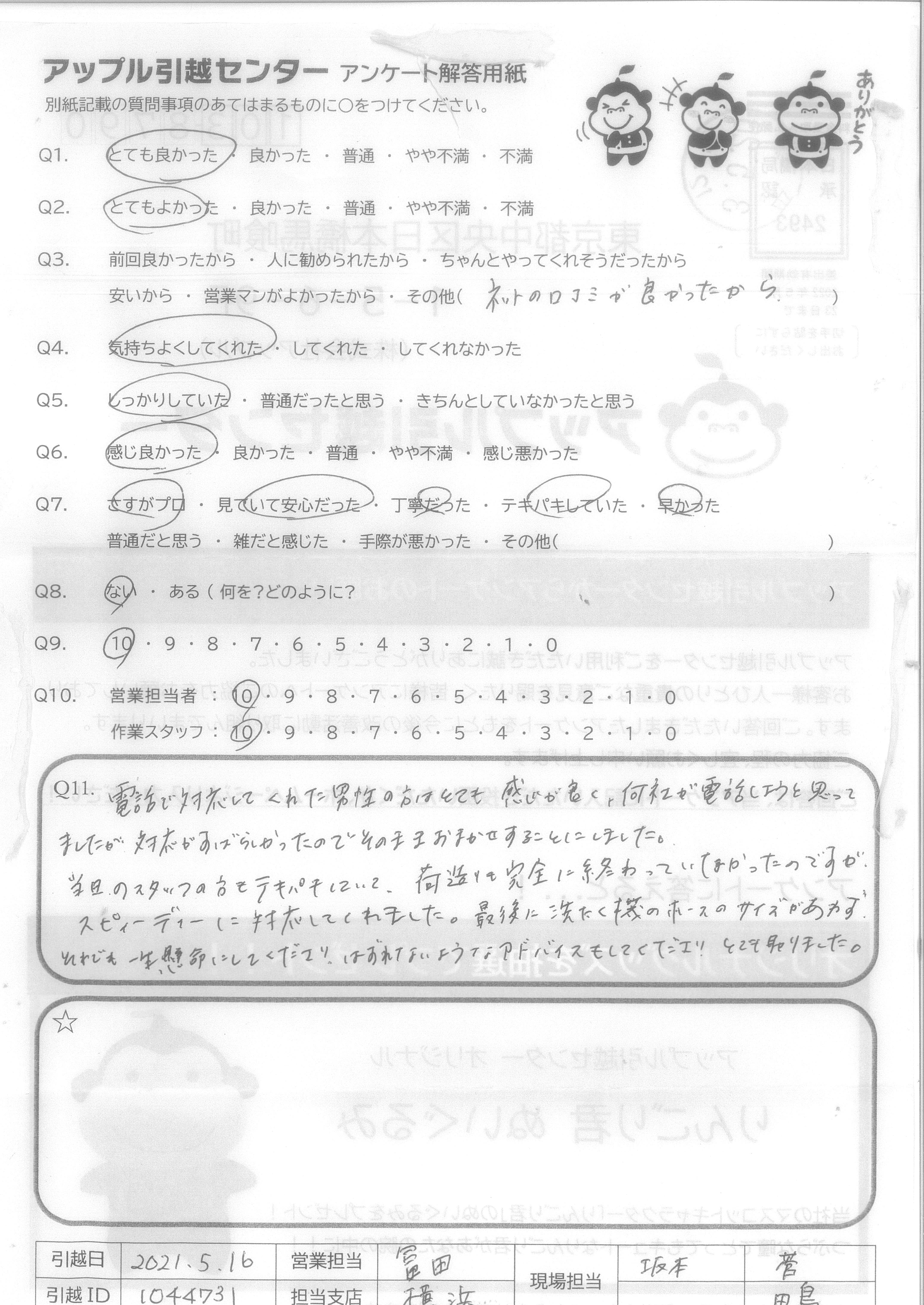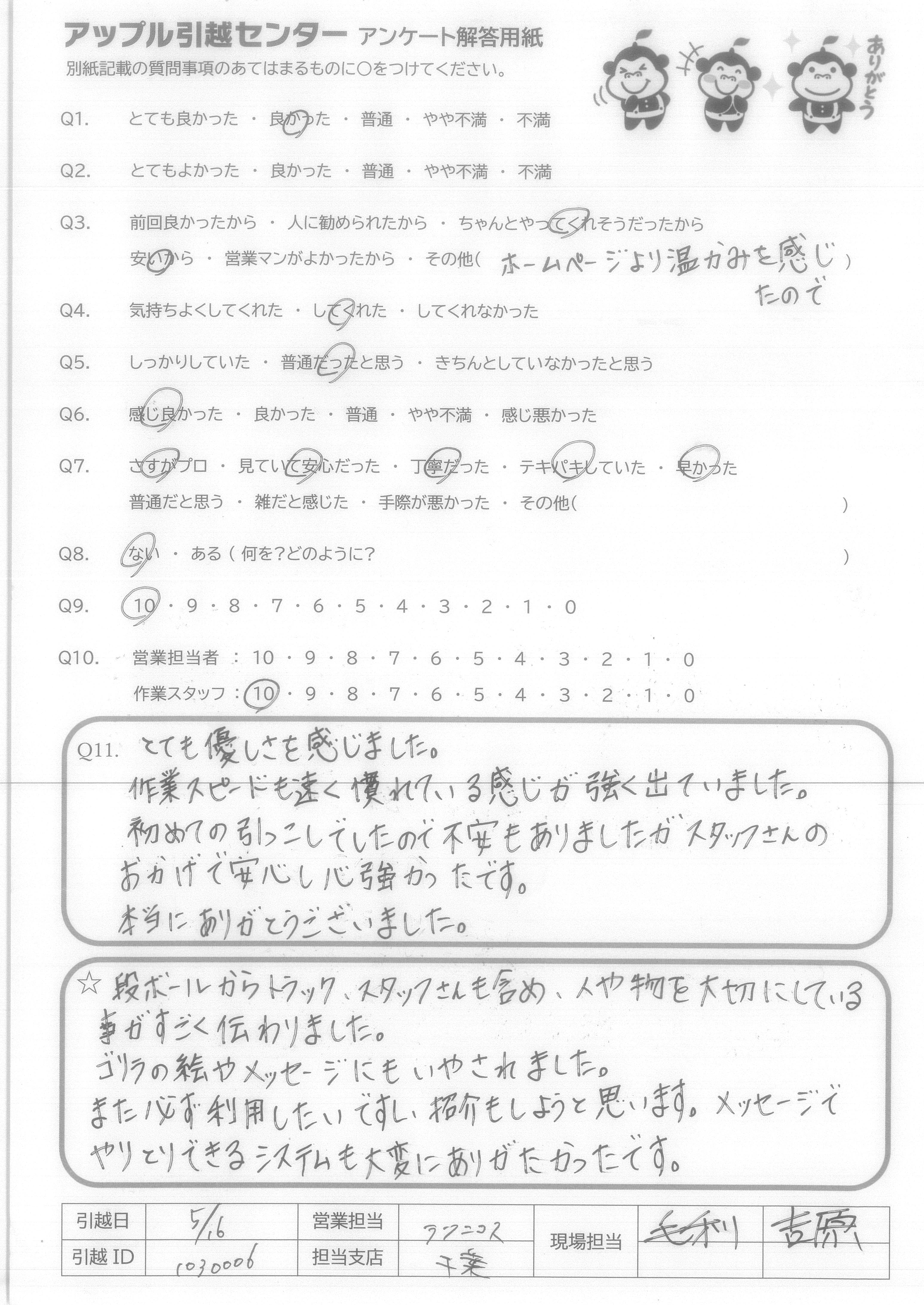 A.池上さん、村井さんのコンビ、見ていてとても対応さわやかで安心いたしました!!!丁寧に荷物チェックして下さったり、自分のまとまっていない荷物をこころよくまとめてくださって本当にありがとうございました!! 次引越の機会があればまた是非お願いしたいです! 今後を応援しています!ありがとうございました。
