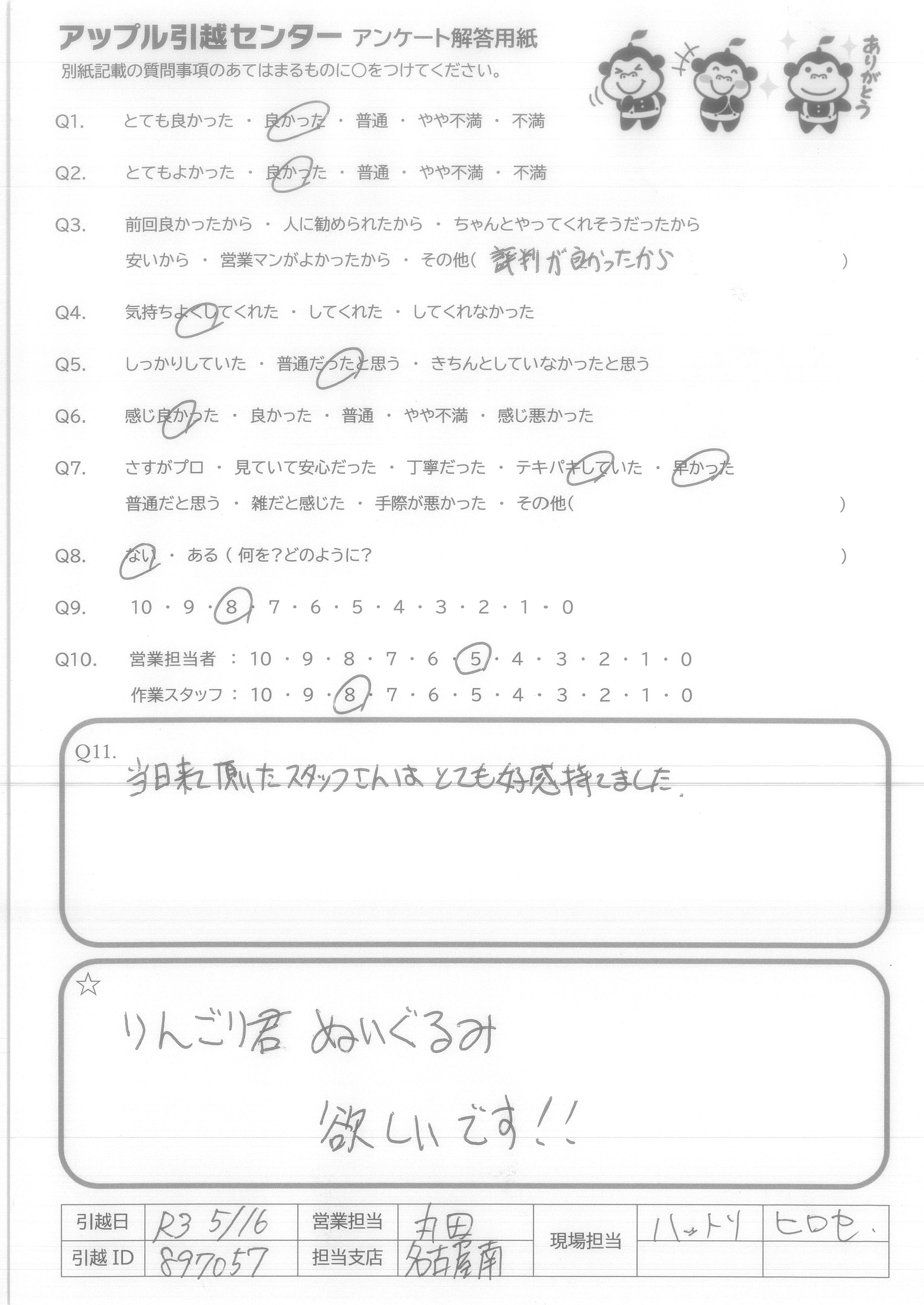 A.以前私や家族が利用させていただいたことがあり、その時の対応とお値段共に良かったため今回また利用させていただきました! いつ頼んでもスタッフの方の対応や雰囲気がよく、なんでこんなに安いんだろう!?と疑問に思うくらいです! 知り合いの引っ越し予定の方にもアップルいいよ!と紹介しました! また機会がありましたらよろしくお願いいたします。