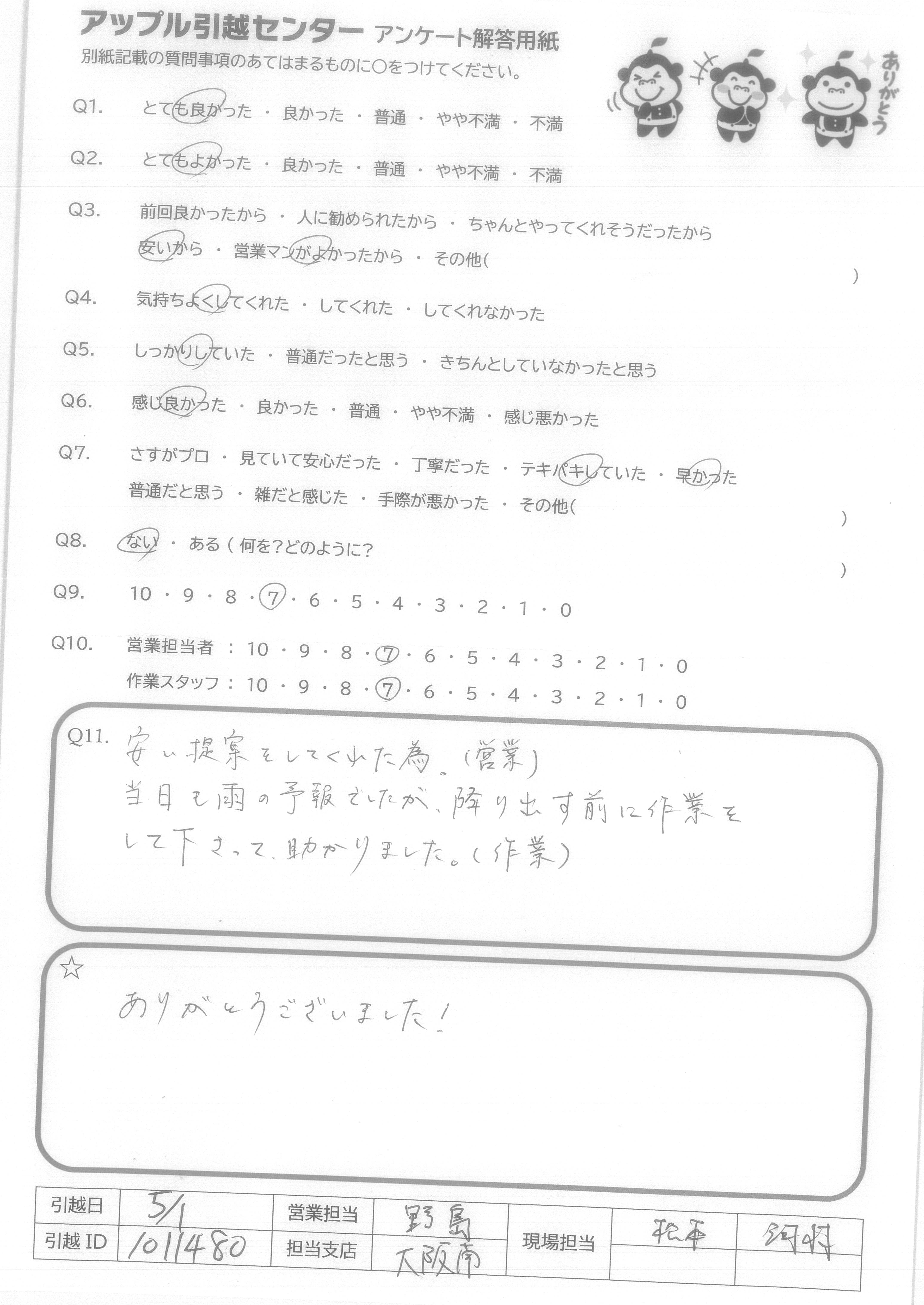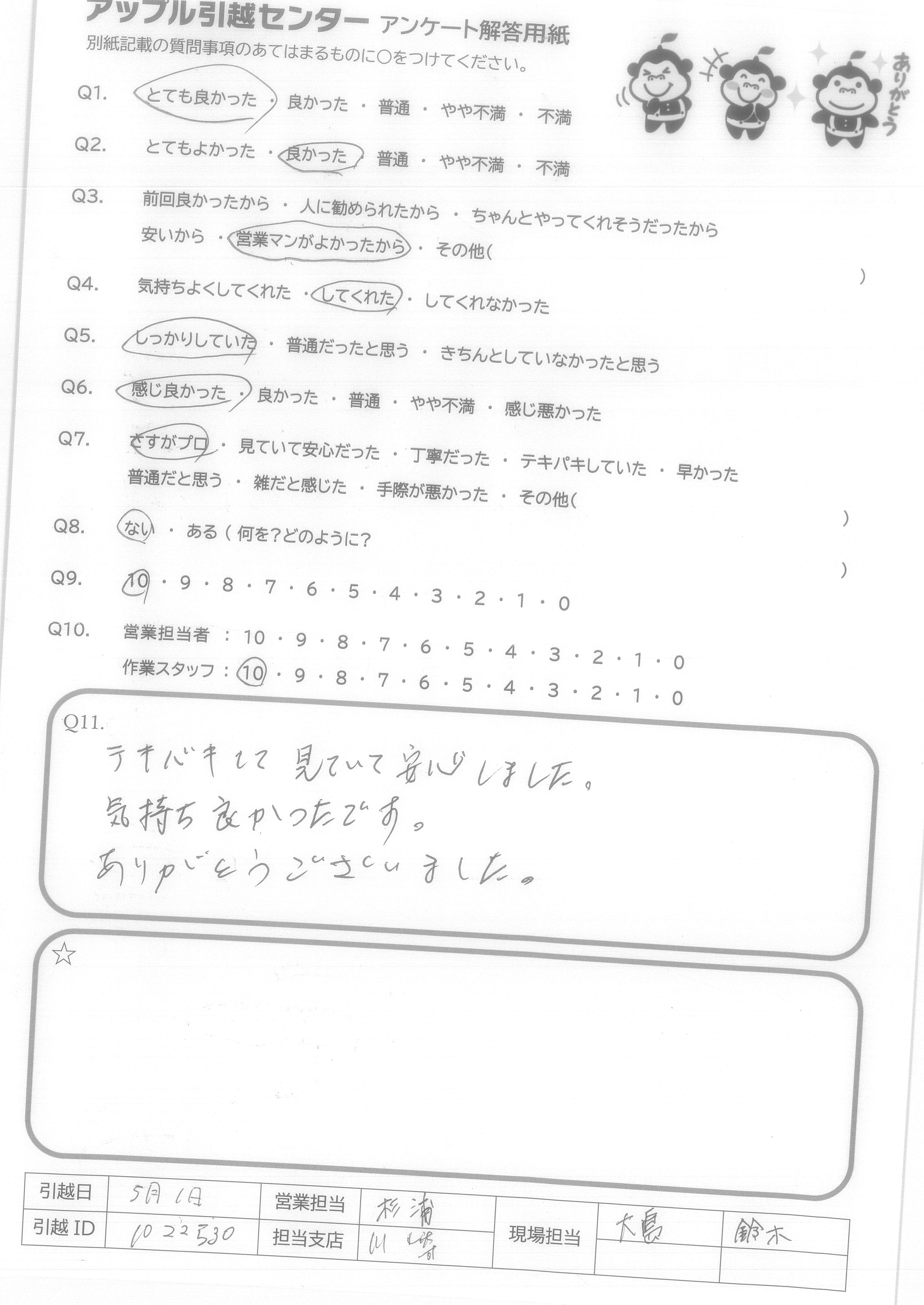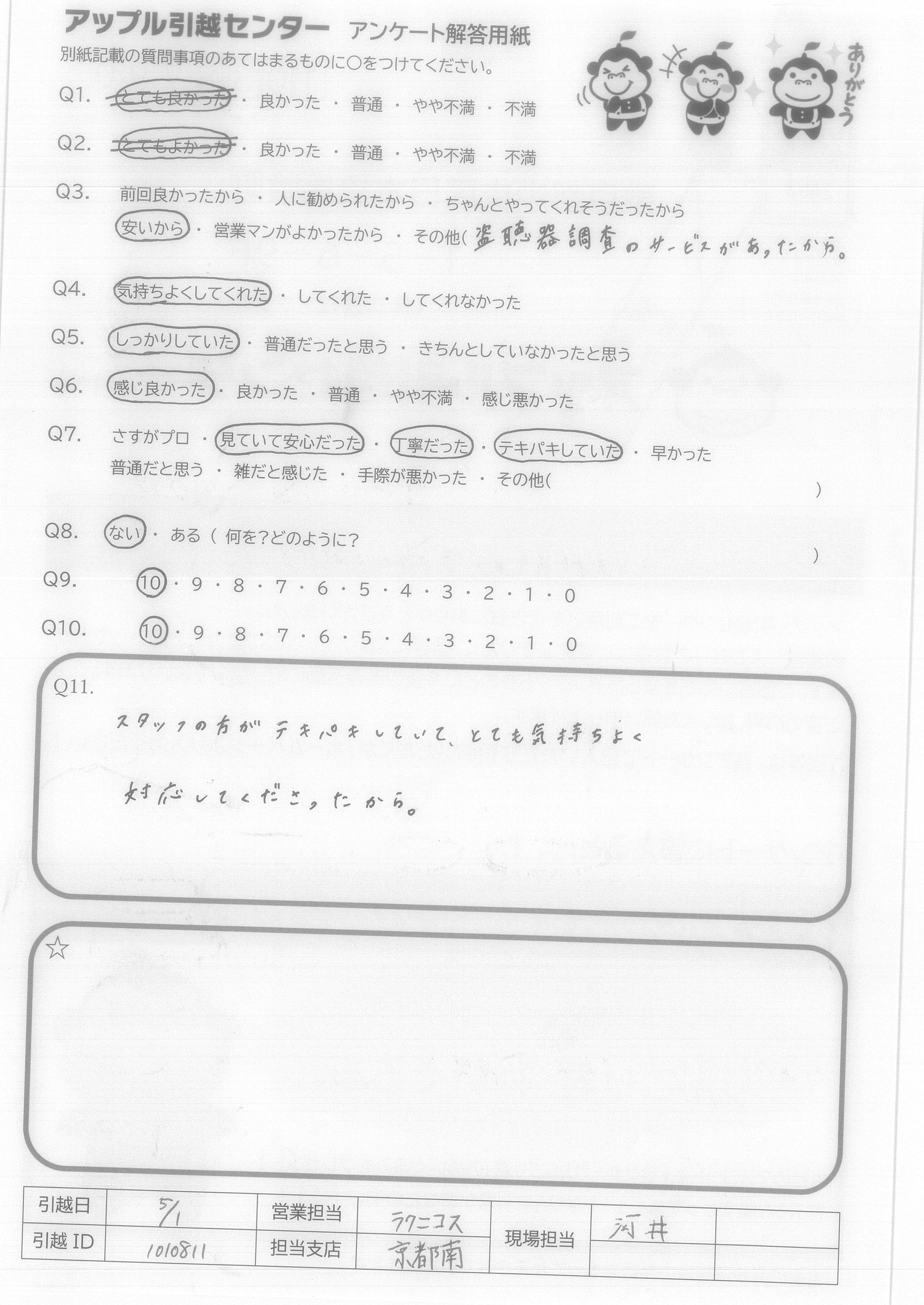 A.前回の引越時、他社でとても不愉快な思いをしていたので引越しはこんなものと思っていたのですが、アップルさんは営業の人も、とても感じよくこちらのわがままも多々聞いてくださいました。その上当日の作業の方たちも3人とも神士的な対応で、要望にも誠意もって最後までやってくれました。
