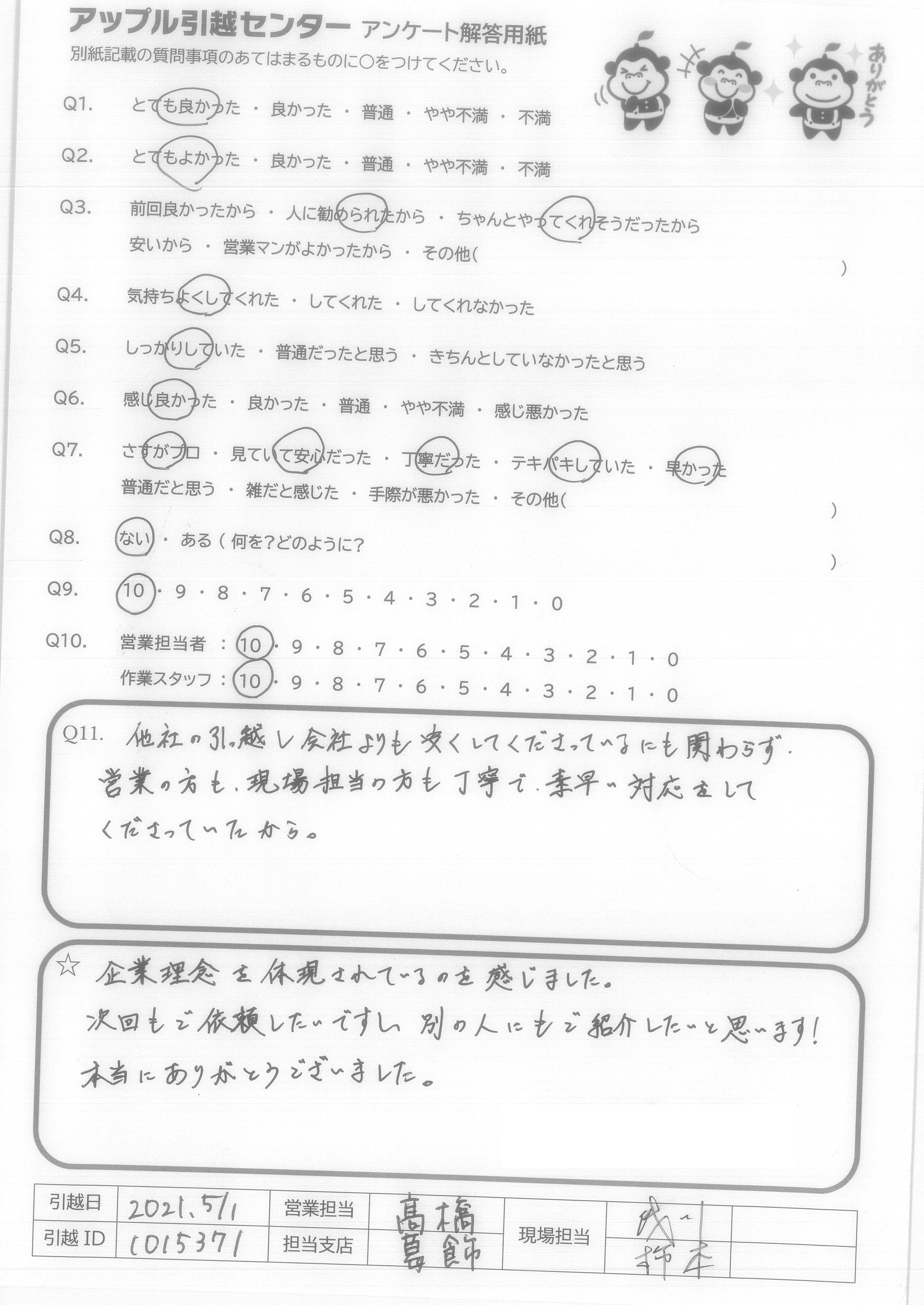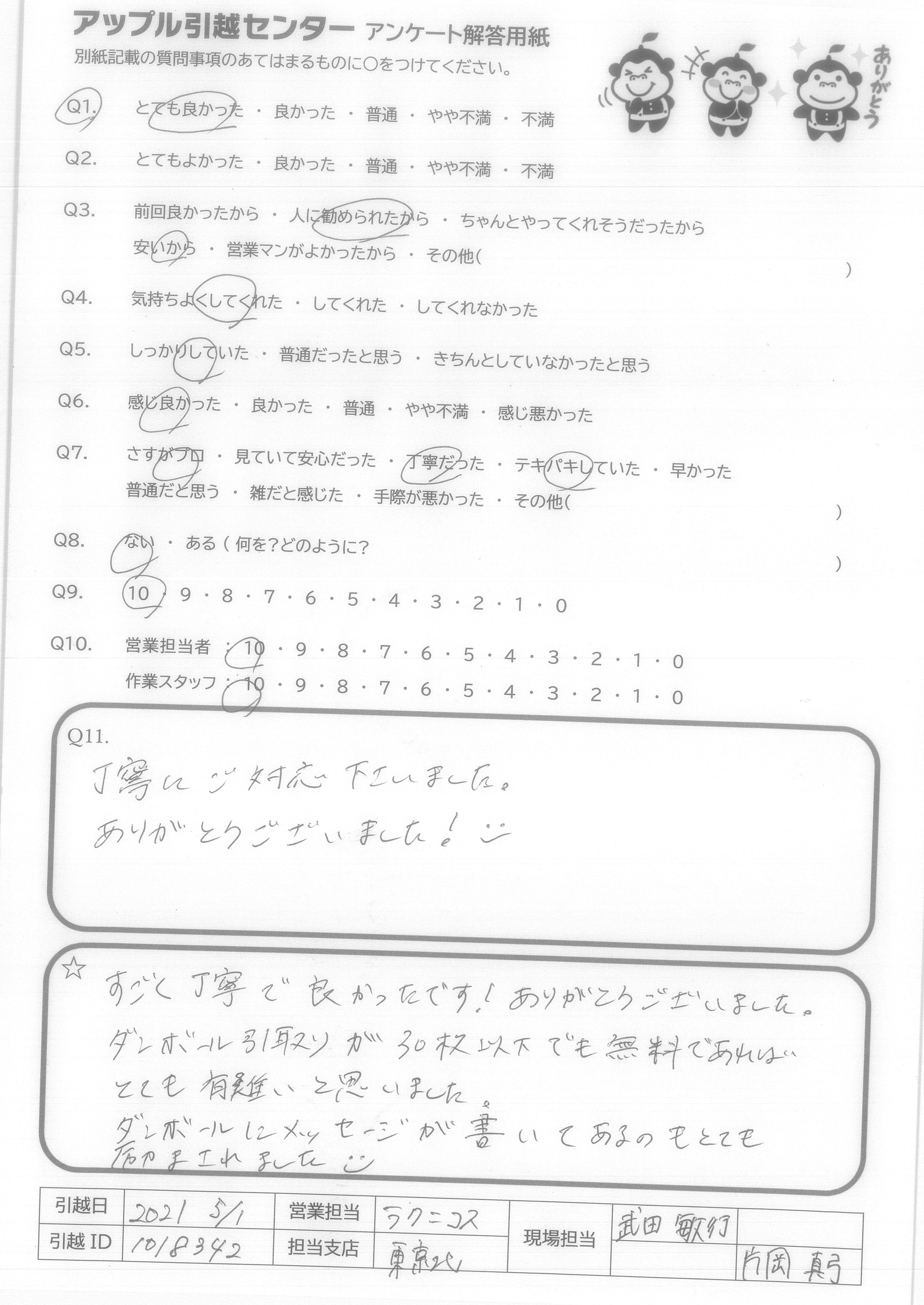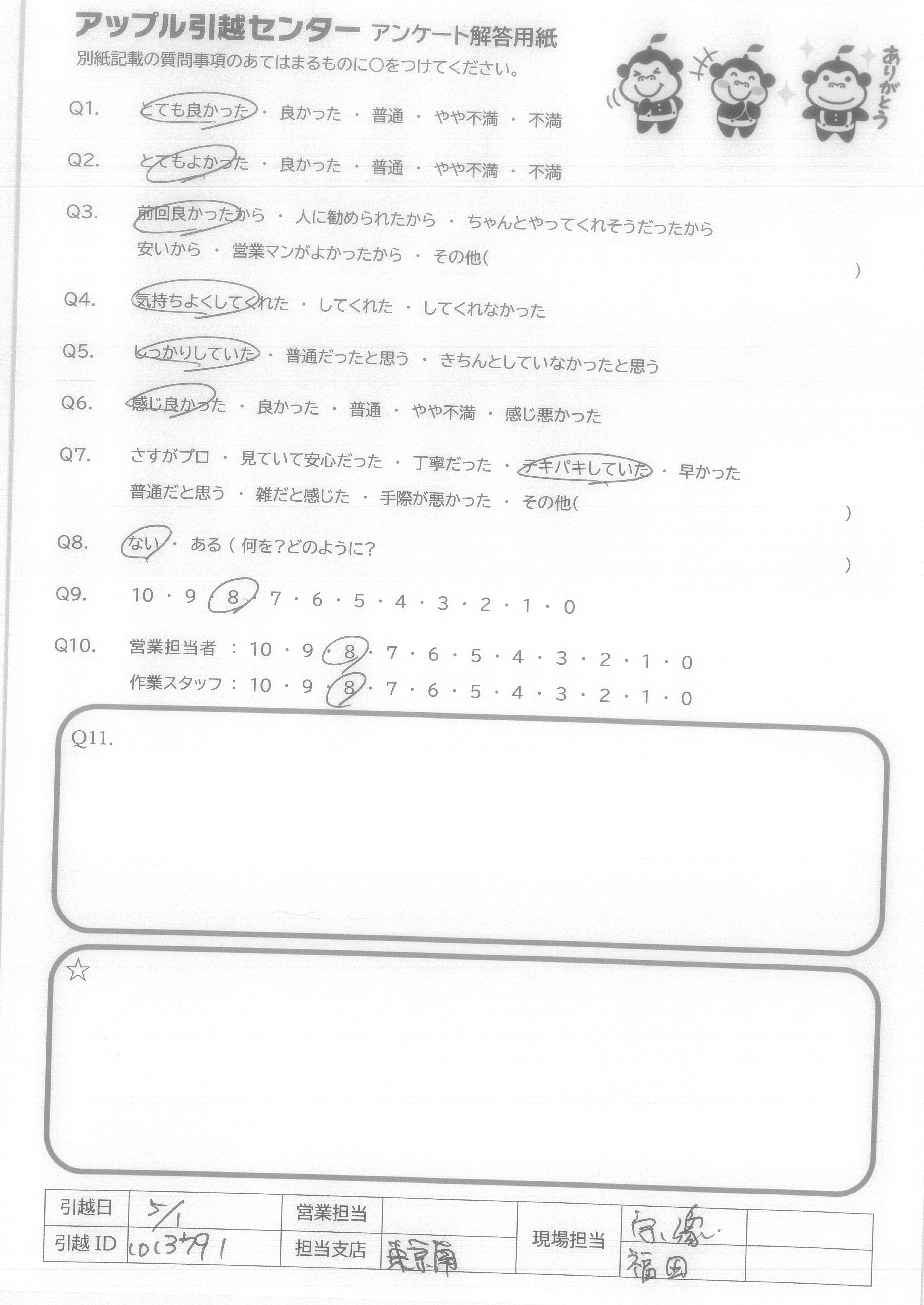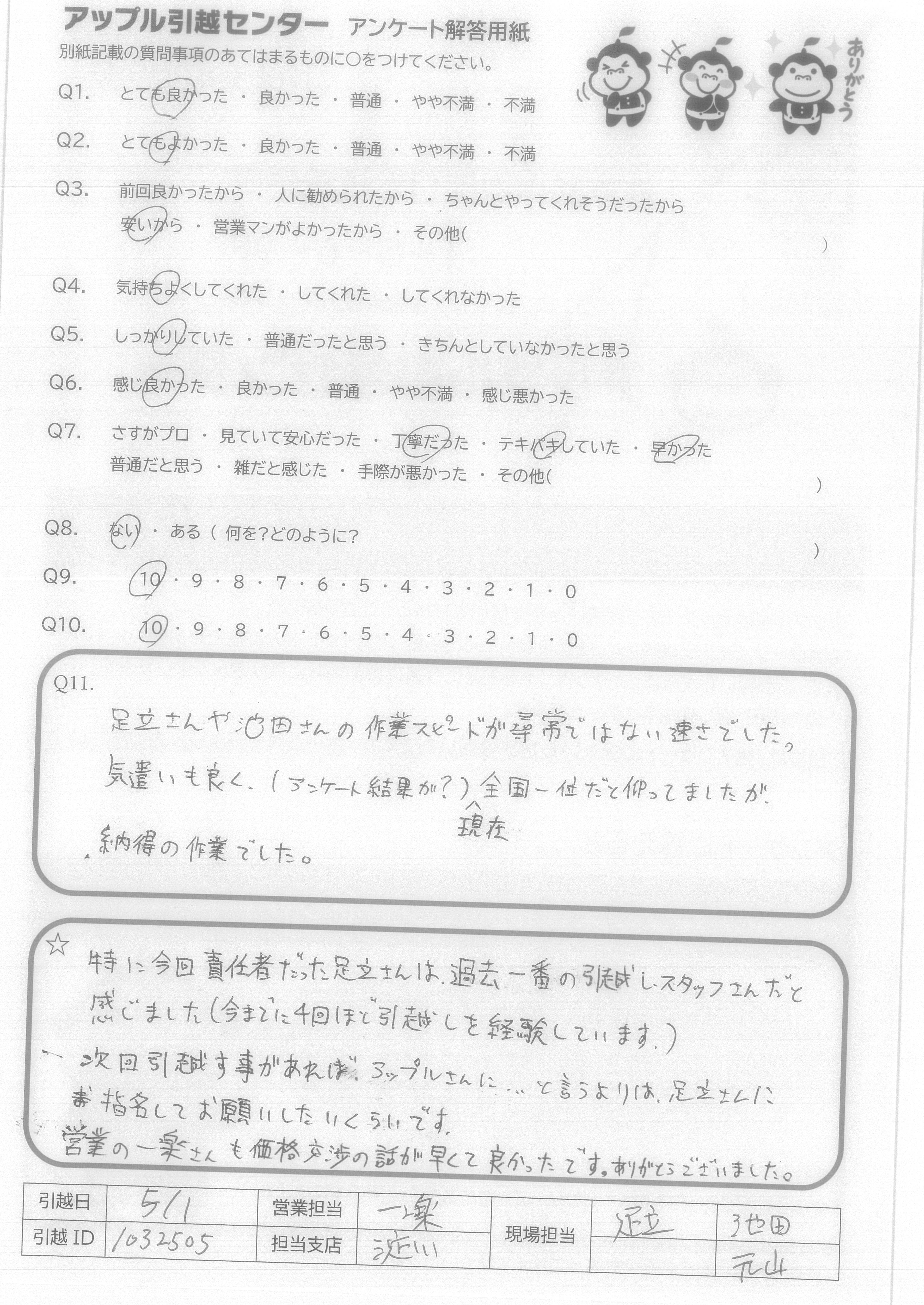A.特に今回責任者だった足立さんは、過去一番の引越しスタッフさんだと感じました。(今までに4回ほど引越しを経験しています) 次回引越す事があれば、アップルさんに…と言うよりは、足立さんに指名してお願いしたいくらいです。 営業の一楽さんも価格交渉の話が早くて良かったです。ありがとうございました。