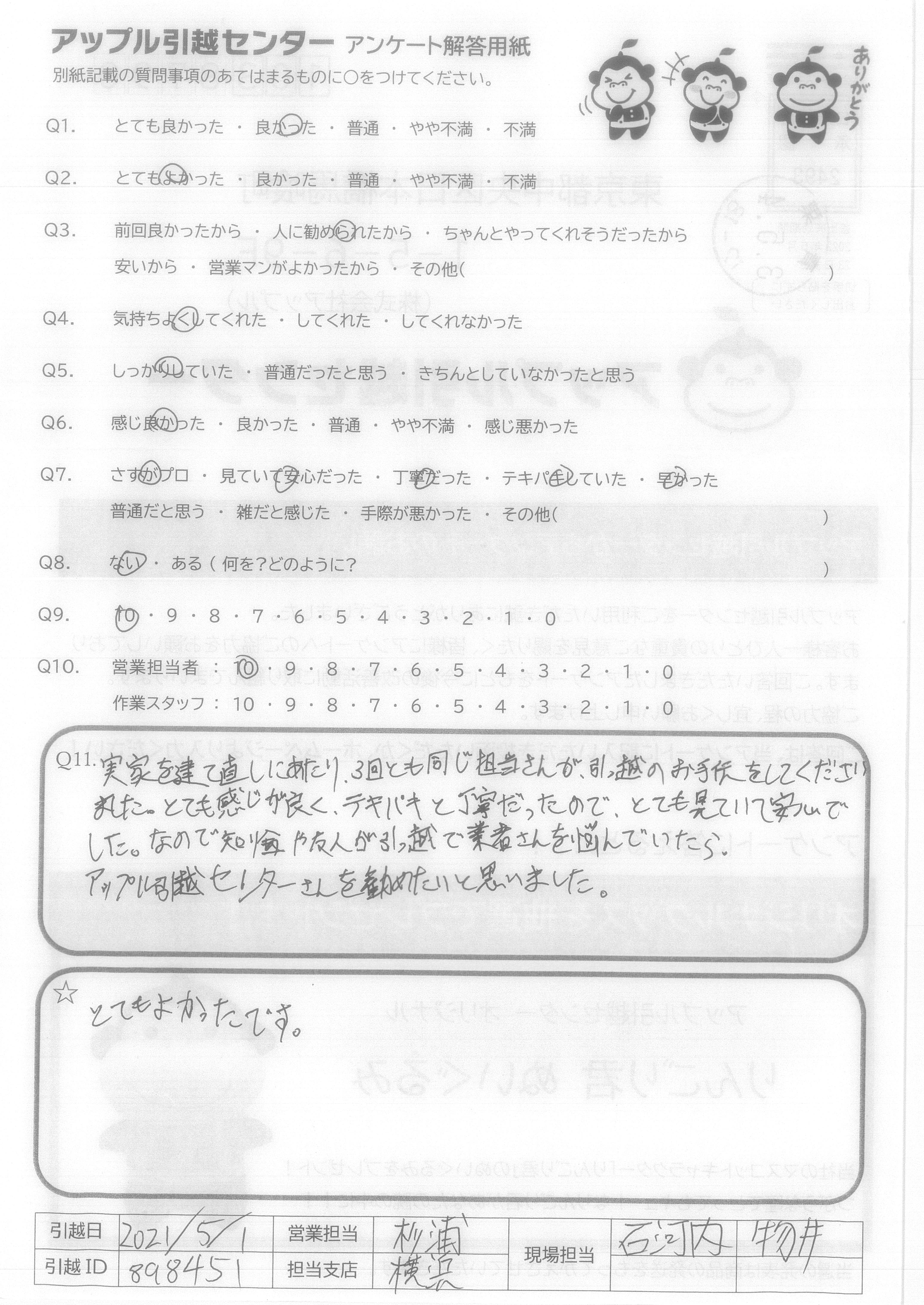A.他社の引っ越し会社よりも安くしてくださっているにも関わらず、営業の方も、現場担当の方も丁寧で素早い対応をしてくださっていたから。