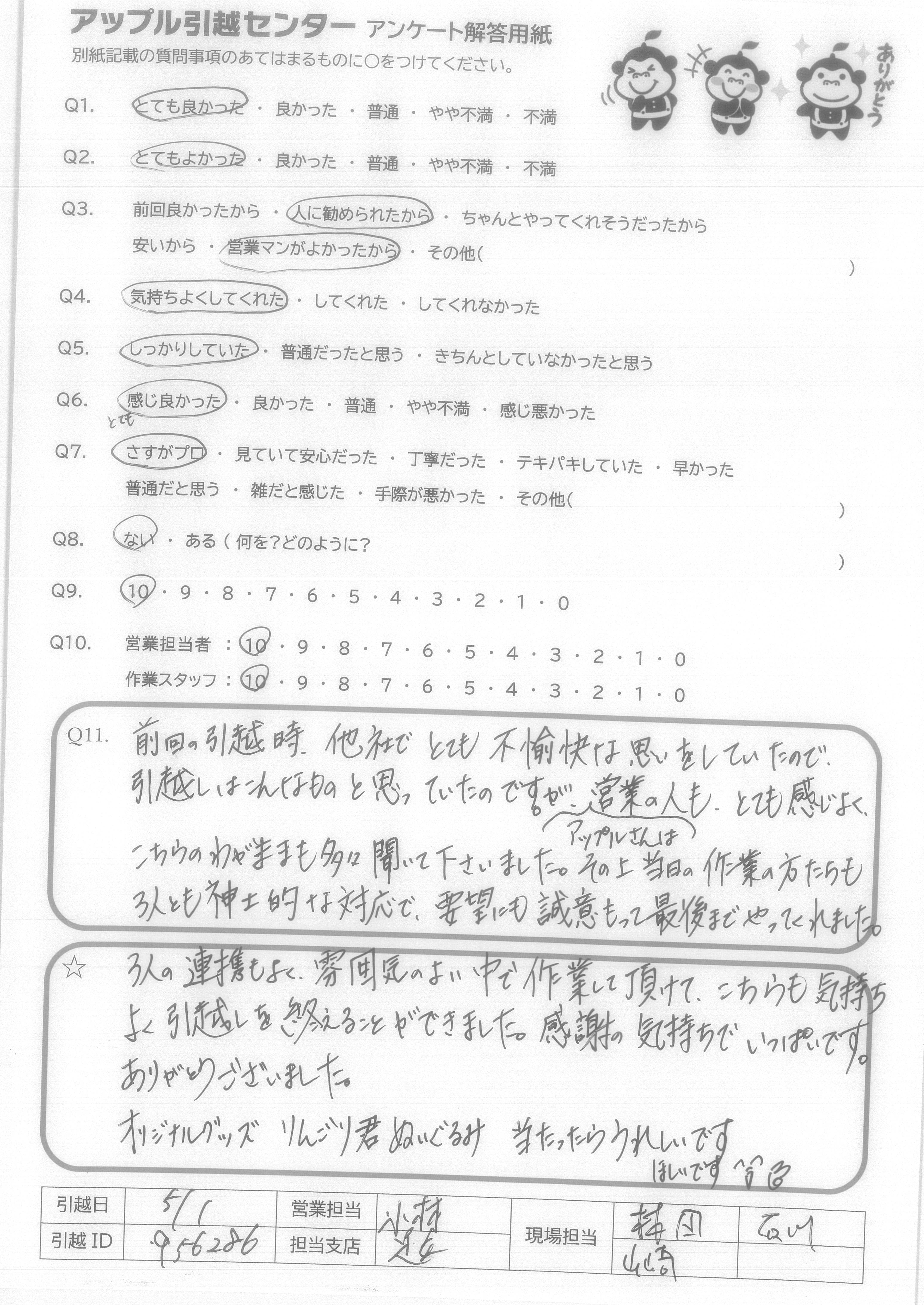 A.「達成感」で終わった感じも受け、とても満足です。 初めて引越業者の方にお願いした記念に「りんごり君」のぬいぐるみが欲しいです。