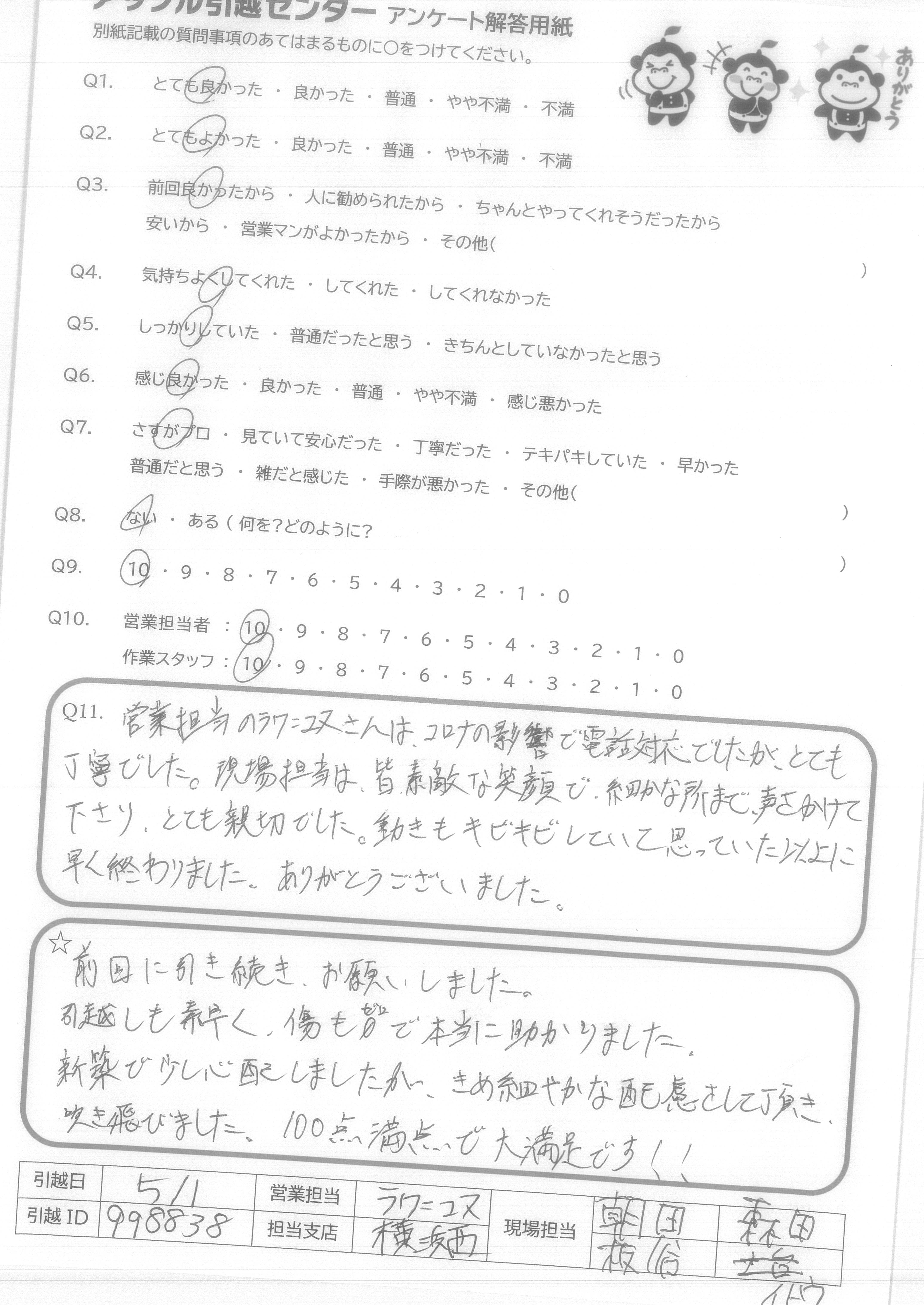 A.営業担当のラクニコスさんはコロナの影響で電話対応でしたが、とても丁寧でした。現場担当は皆素敵な笑顔で、細かな所まで、声をかけて下さり、とても親切でした。動きもキビキビしていて思っていた以上に早く終わりました。ありがとうございました。