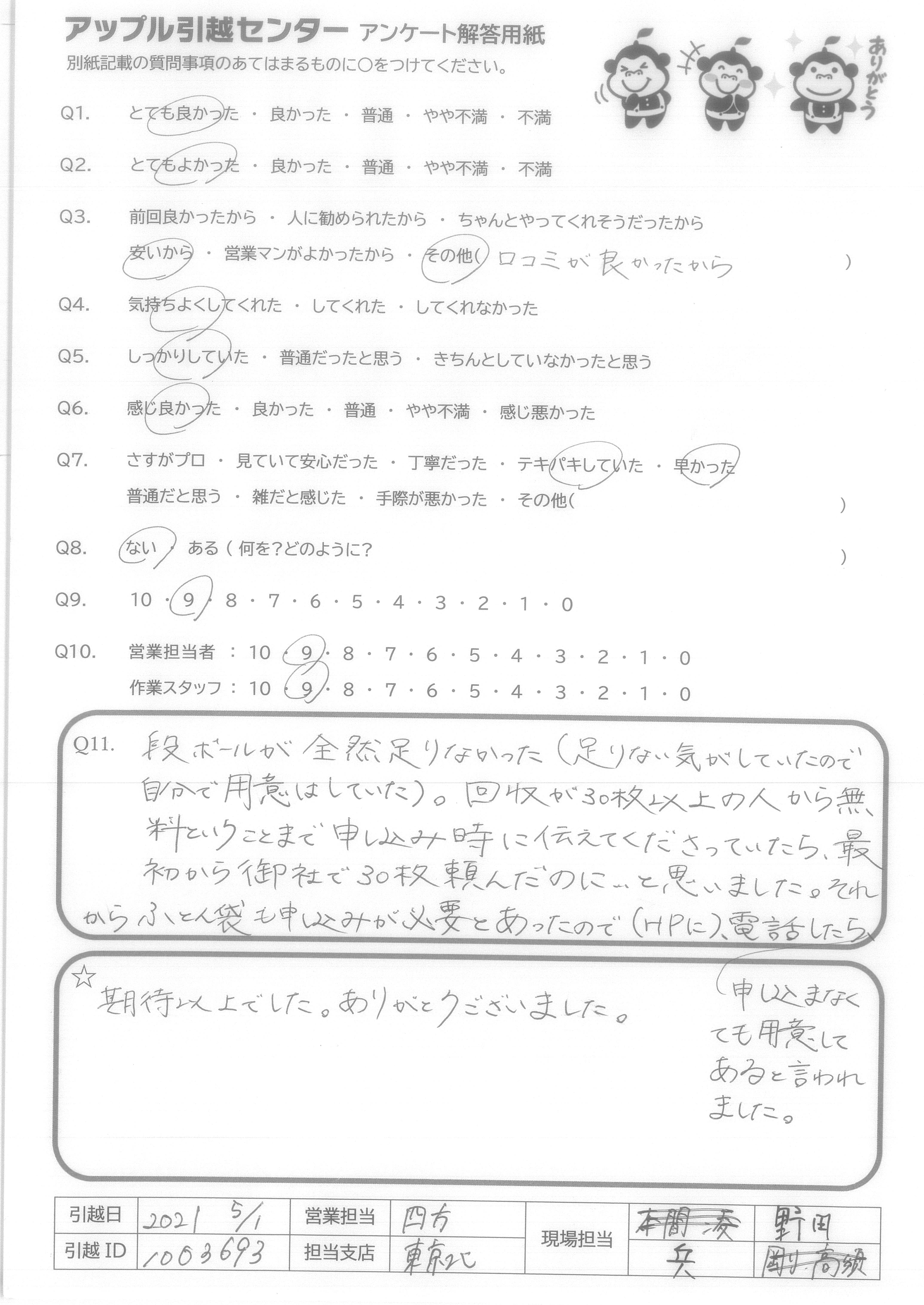 A.前回の引越でふとん袋を持っていたのでよかったが、ダンボールの事前配達の際にふとん袋の要否をきいていただけるとよかった。