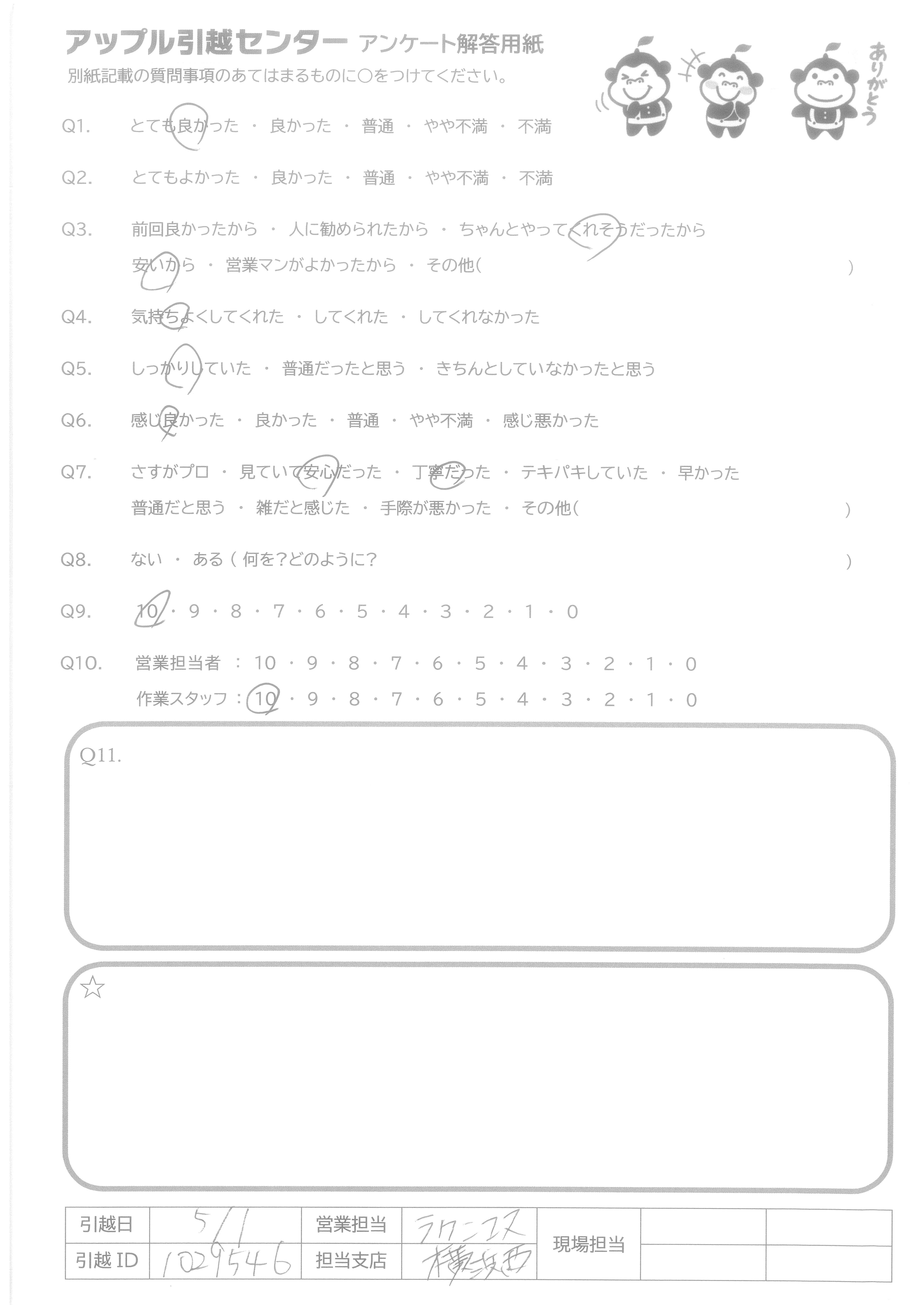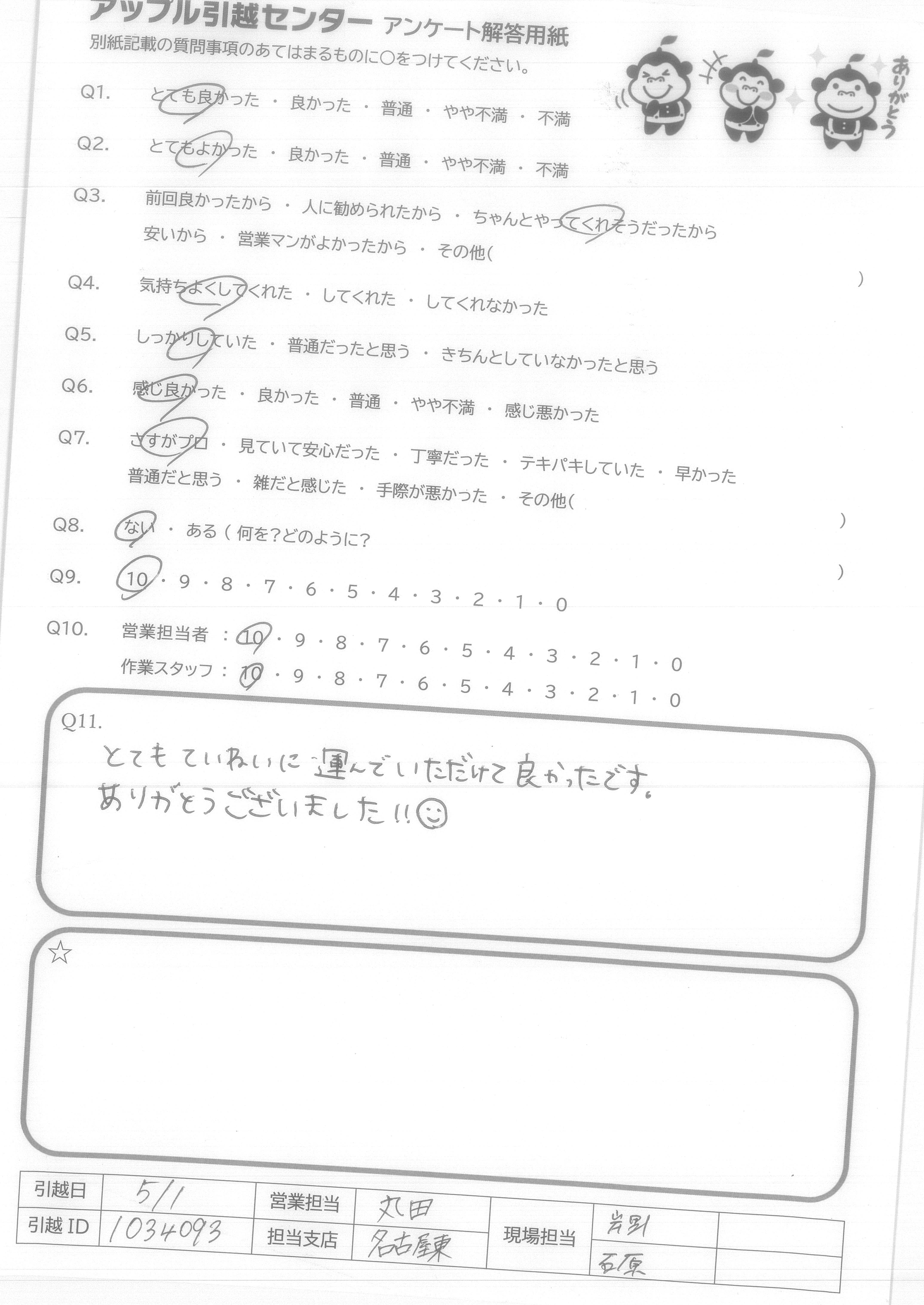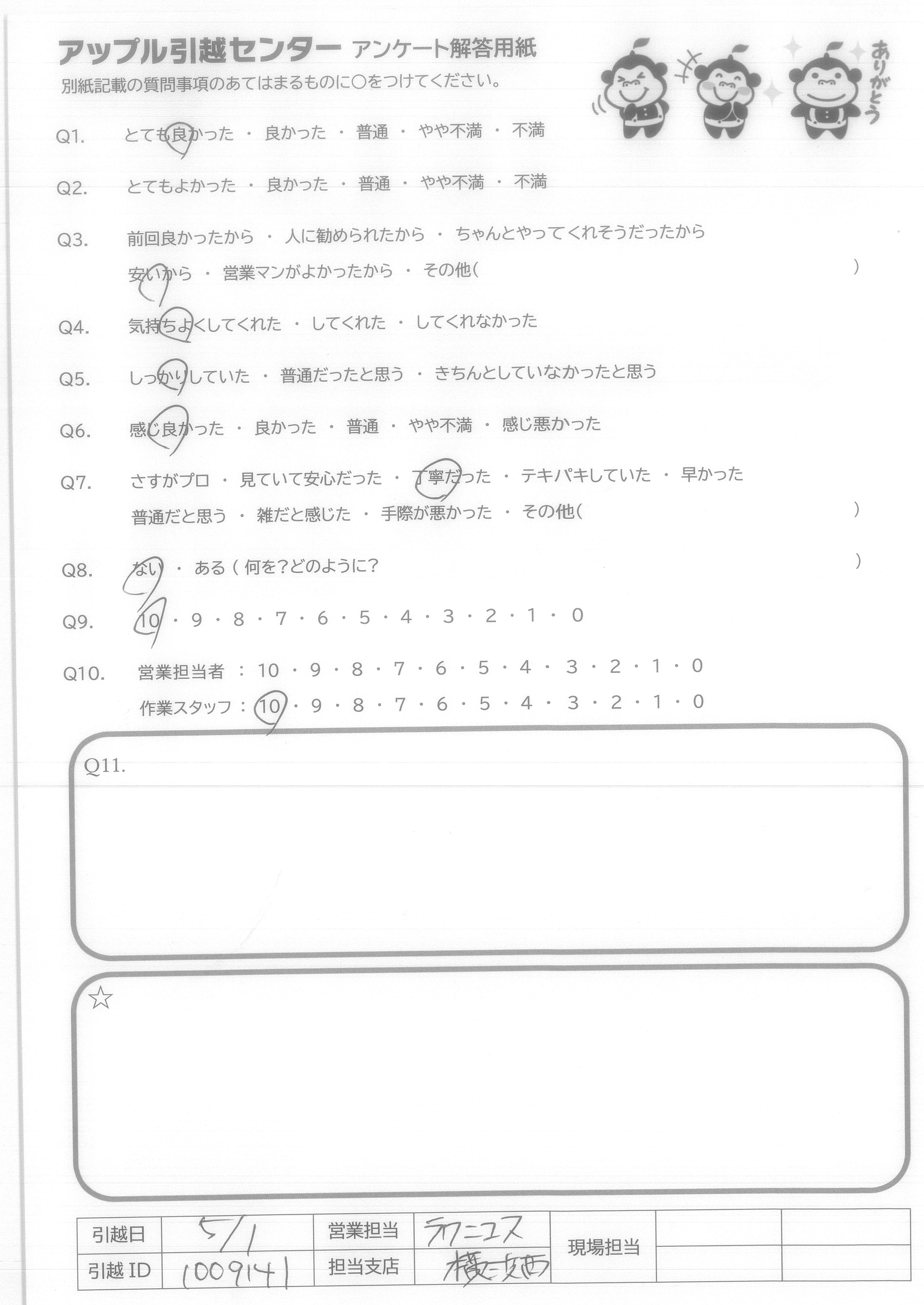 A.積み込みの際、私一人で引越屋さんの対応をすることに不安を感じていましたが、愛想のよい元気なスタッフの方が来てくれたお陰で安心しました。作業も丁寧でスムーズでした。