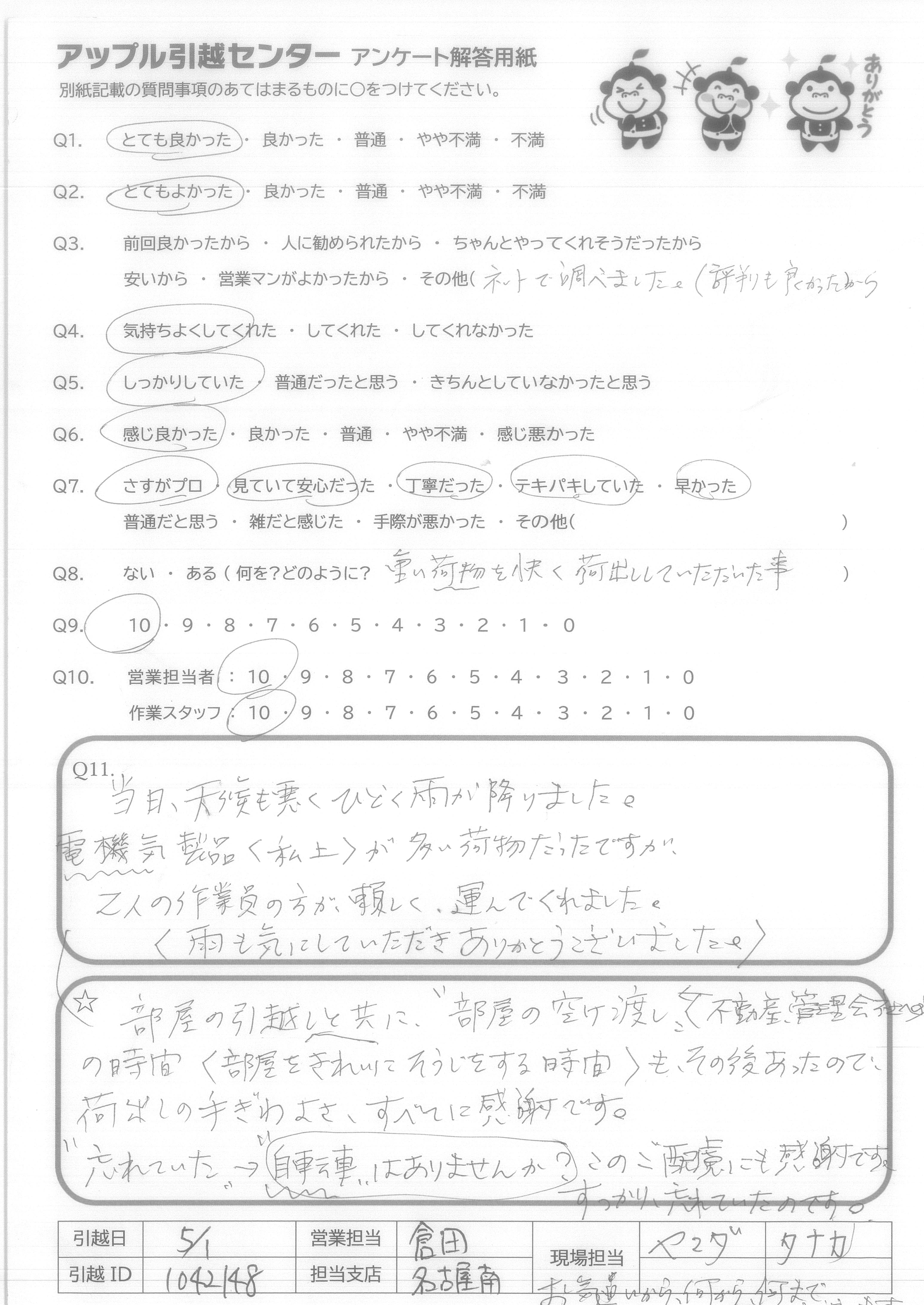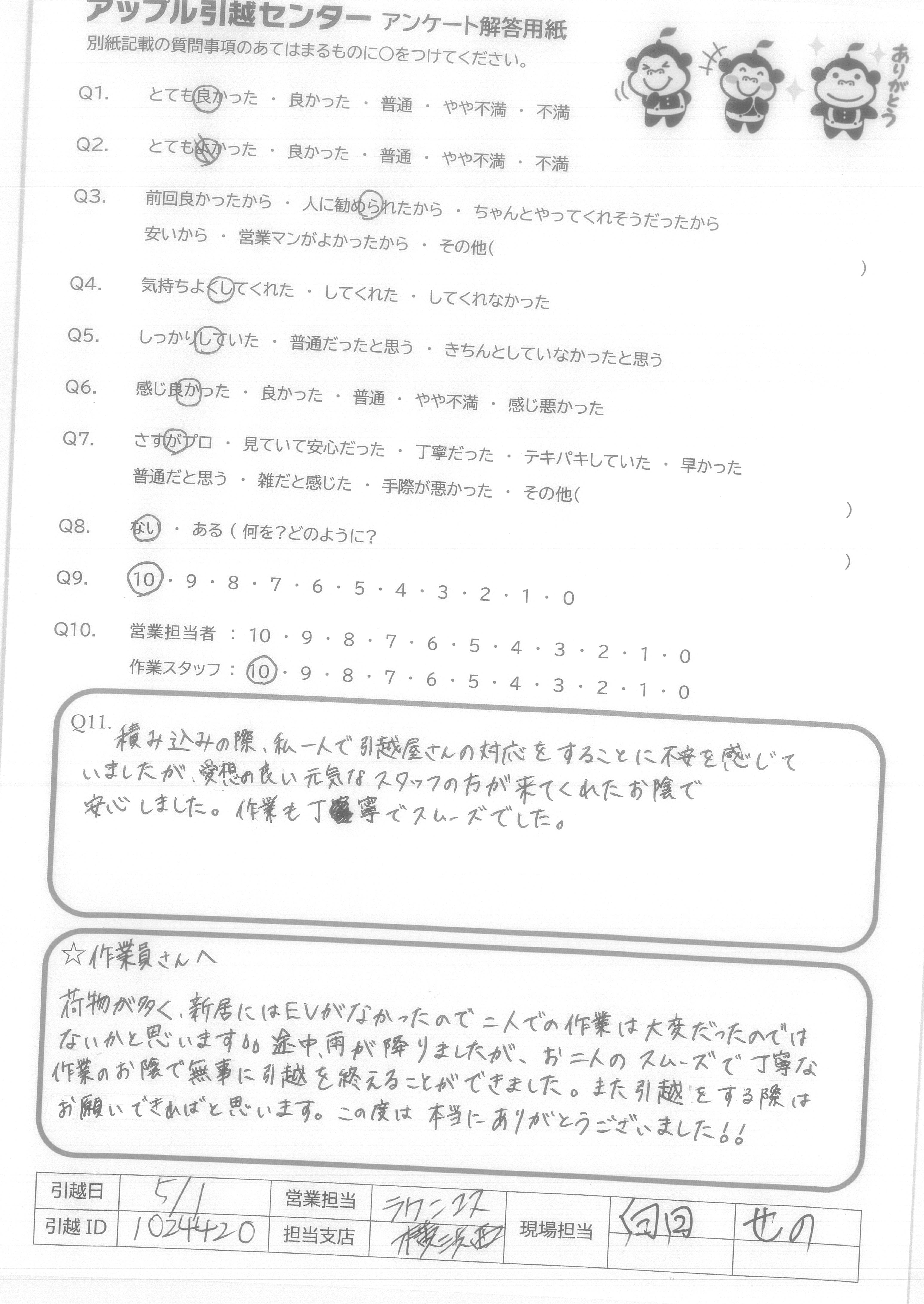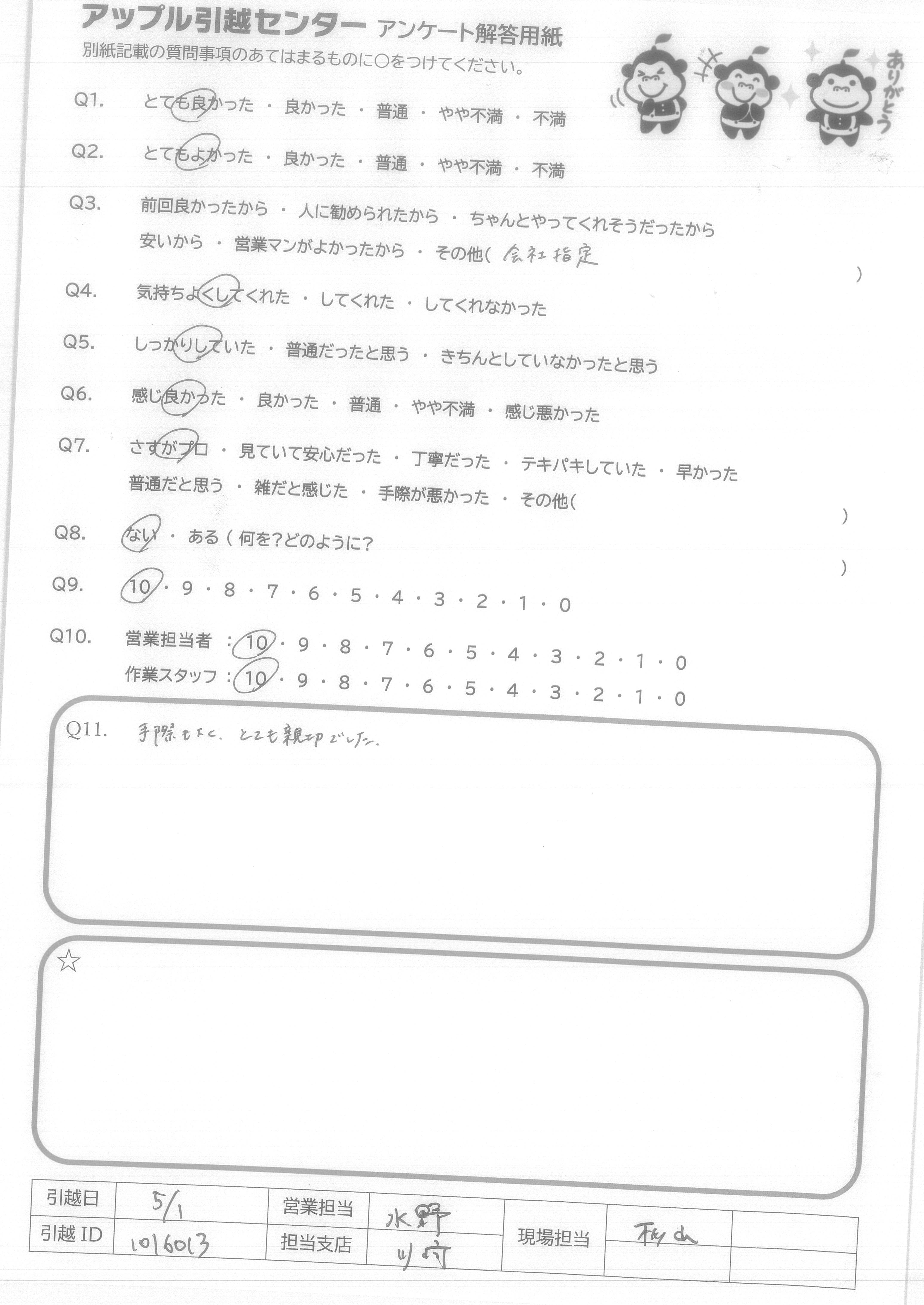 A.積み込みの際、私一人で引越屋さんの対応をすることに不安を感じていましたが、愛想のよい元気なスタッフの方が来てくれたお陰で安心しました。作業も丁寧でスムーズでした。