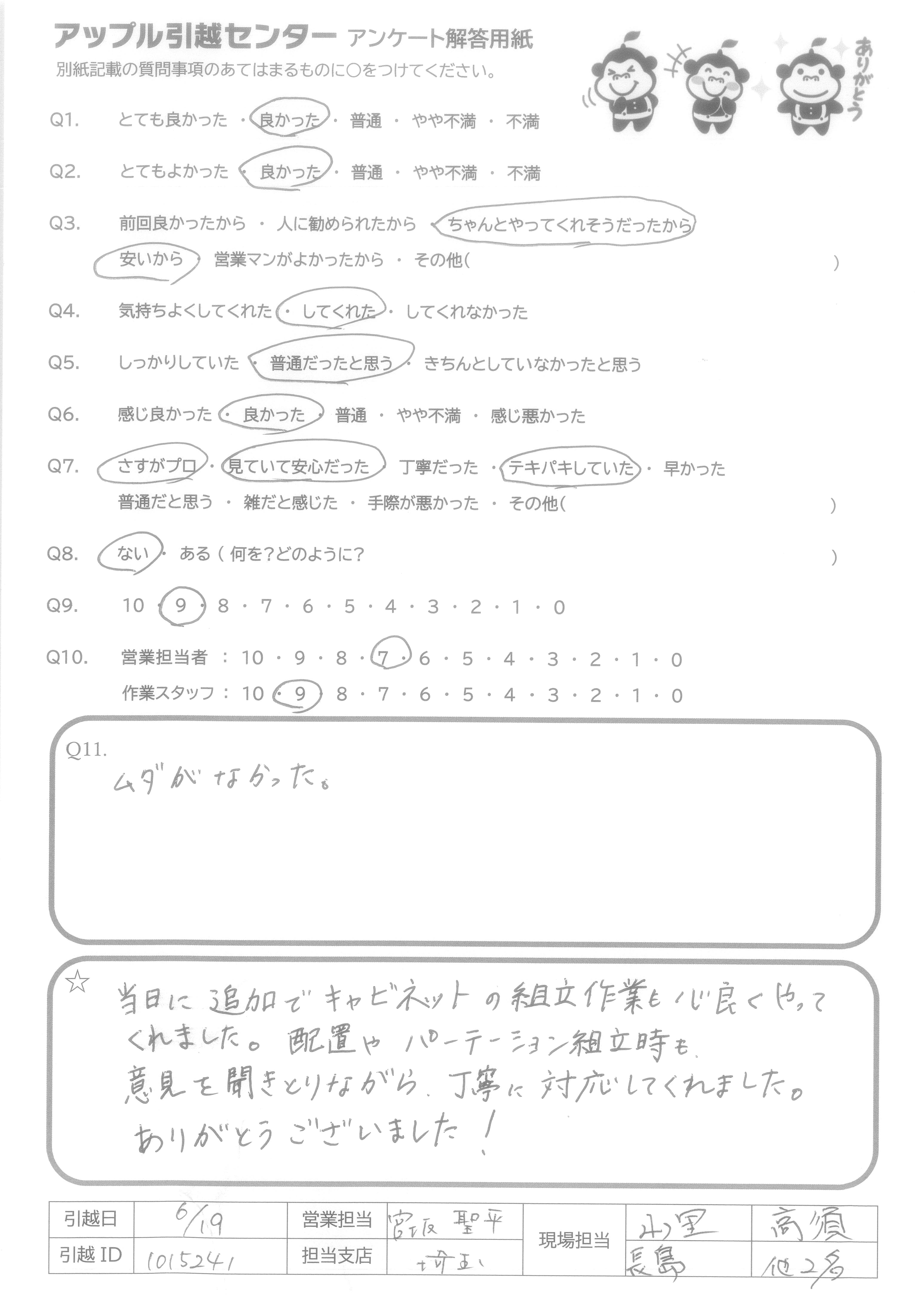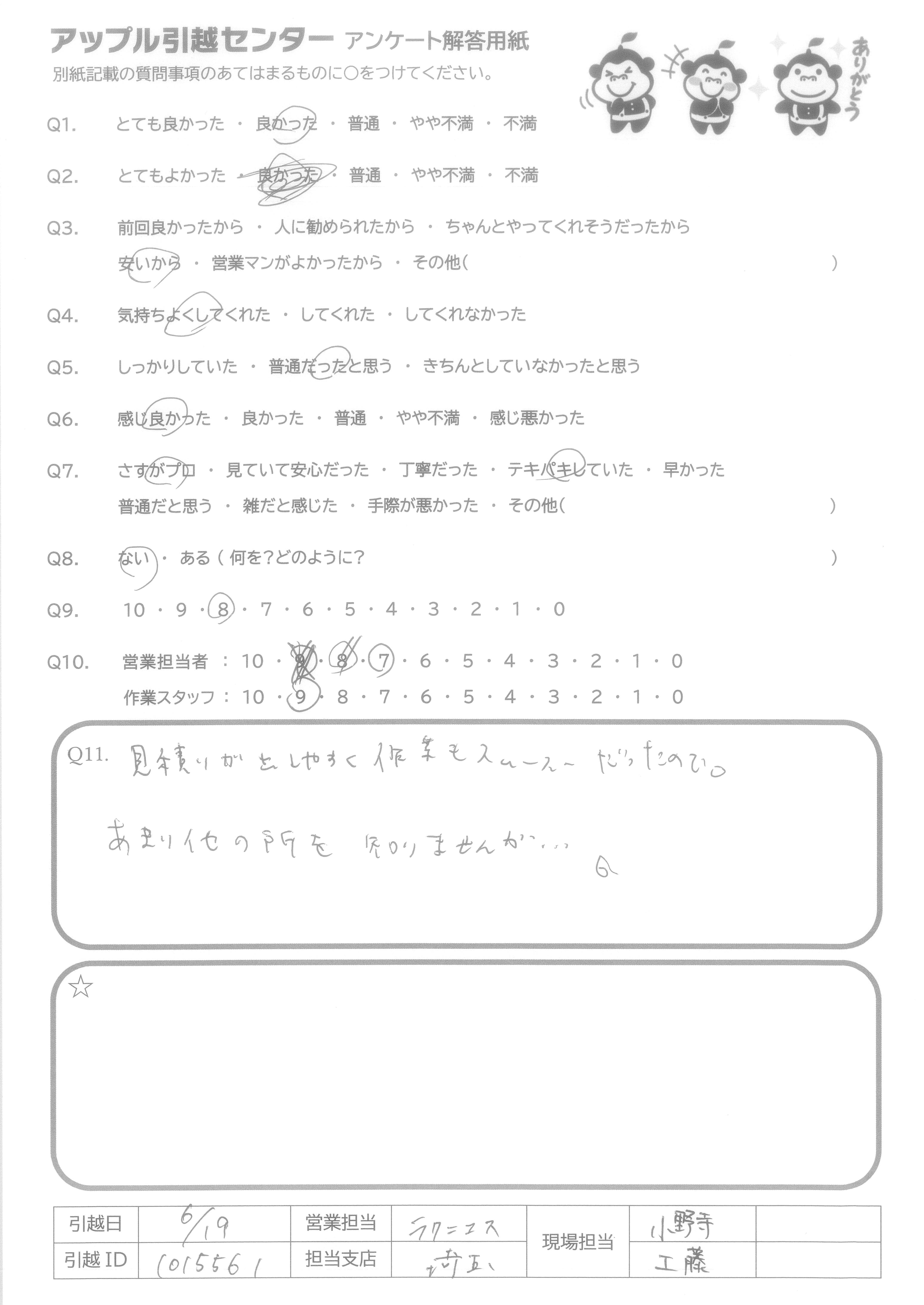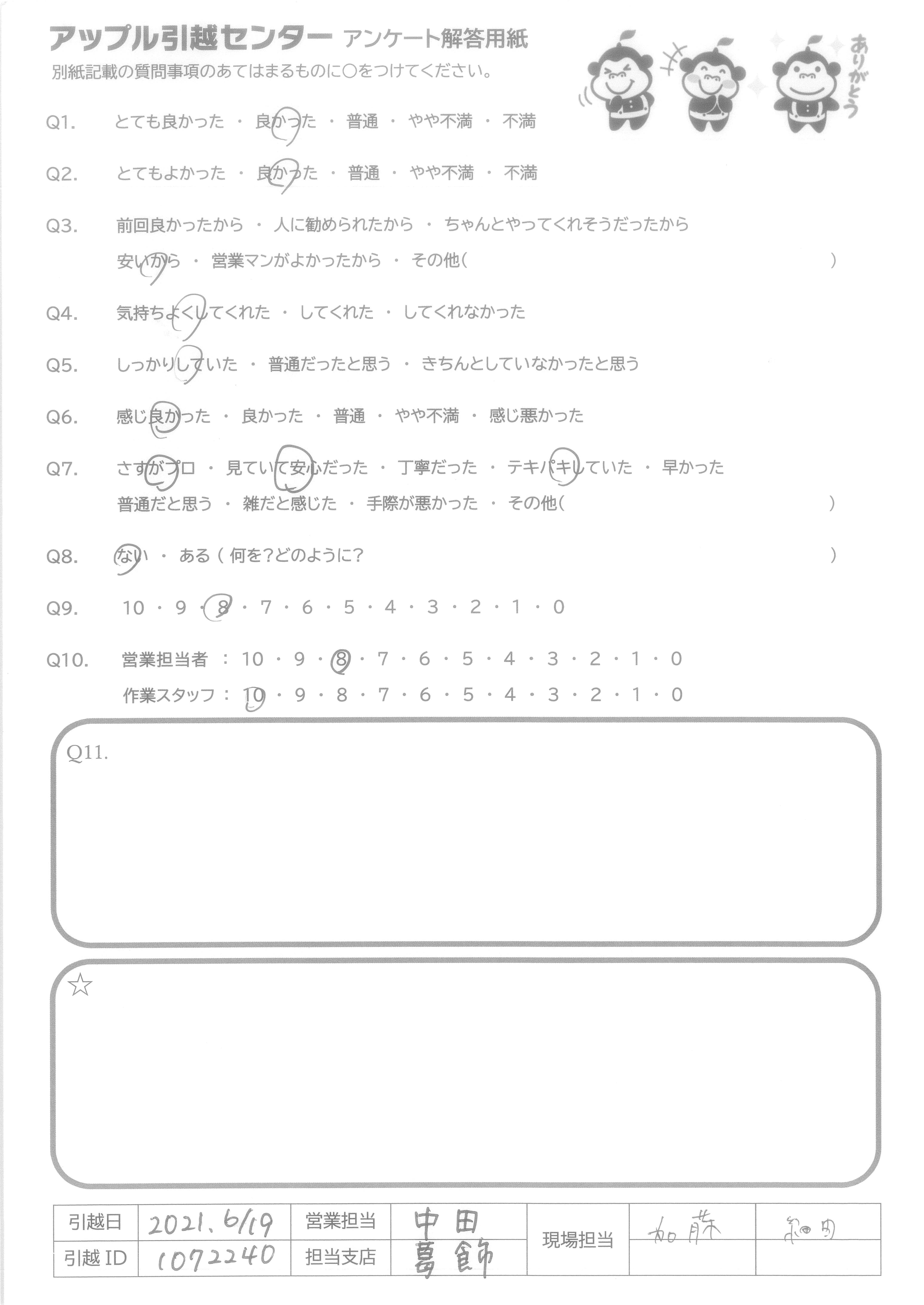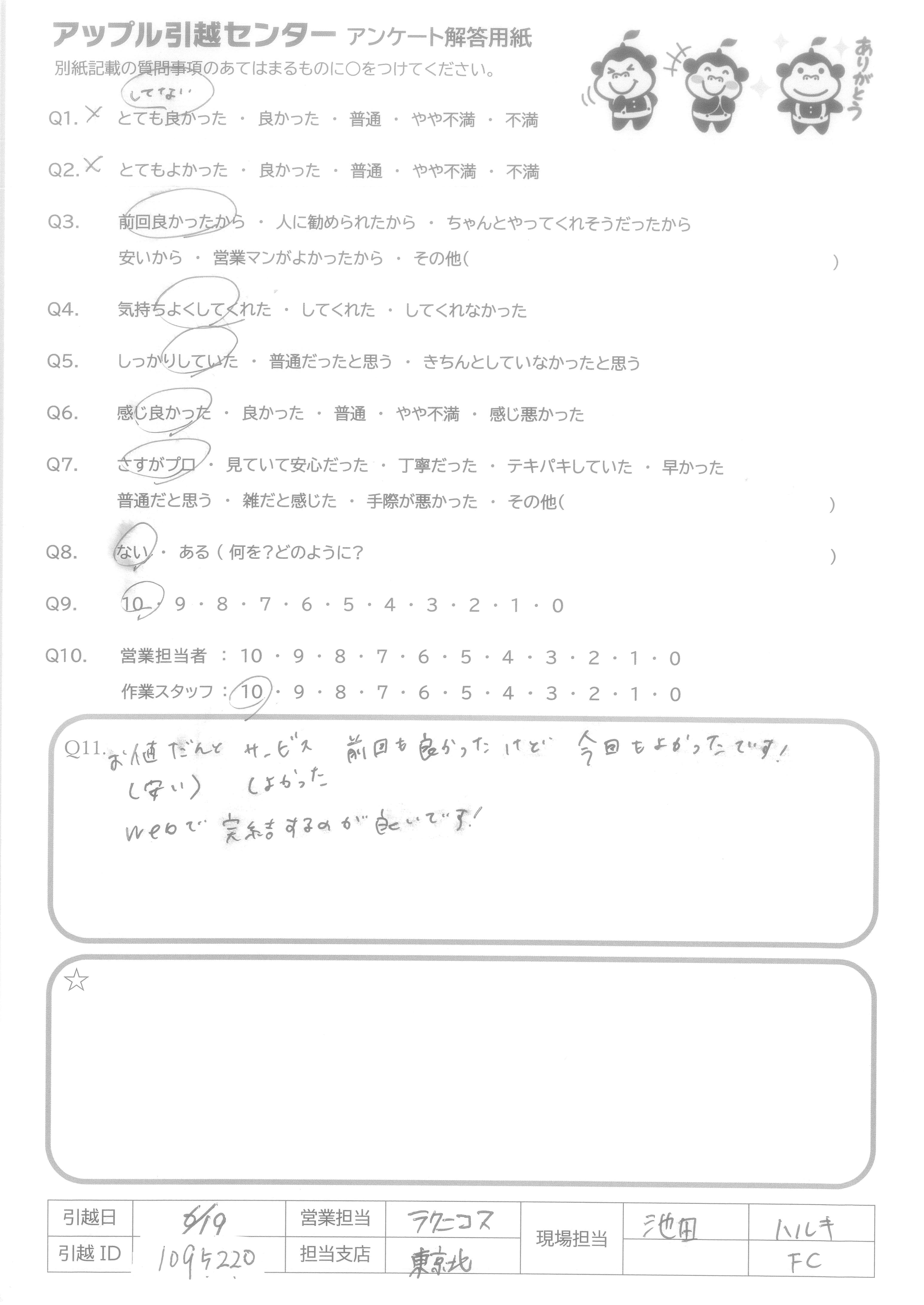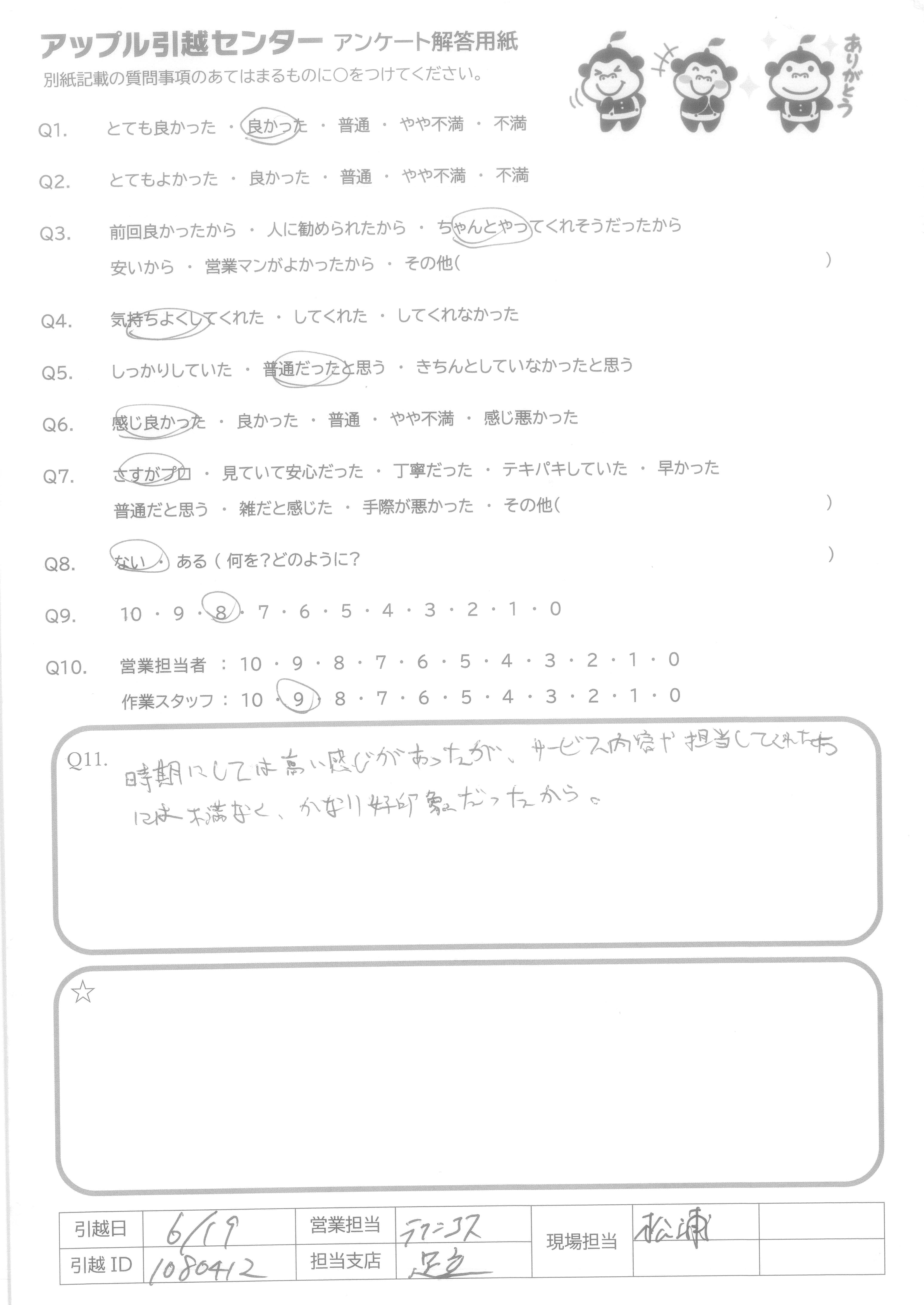 A.Q7の回答のとおり とてもしっかりしており、引越を任せてよかった