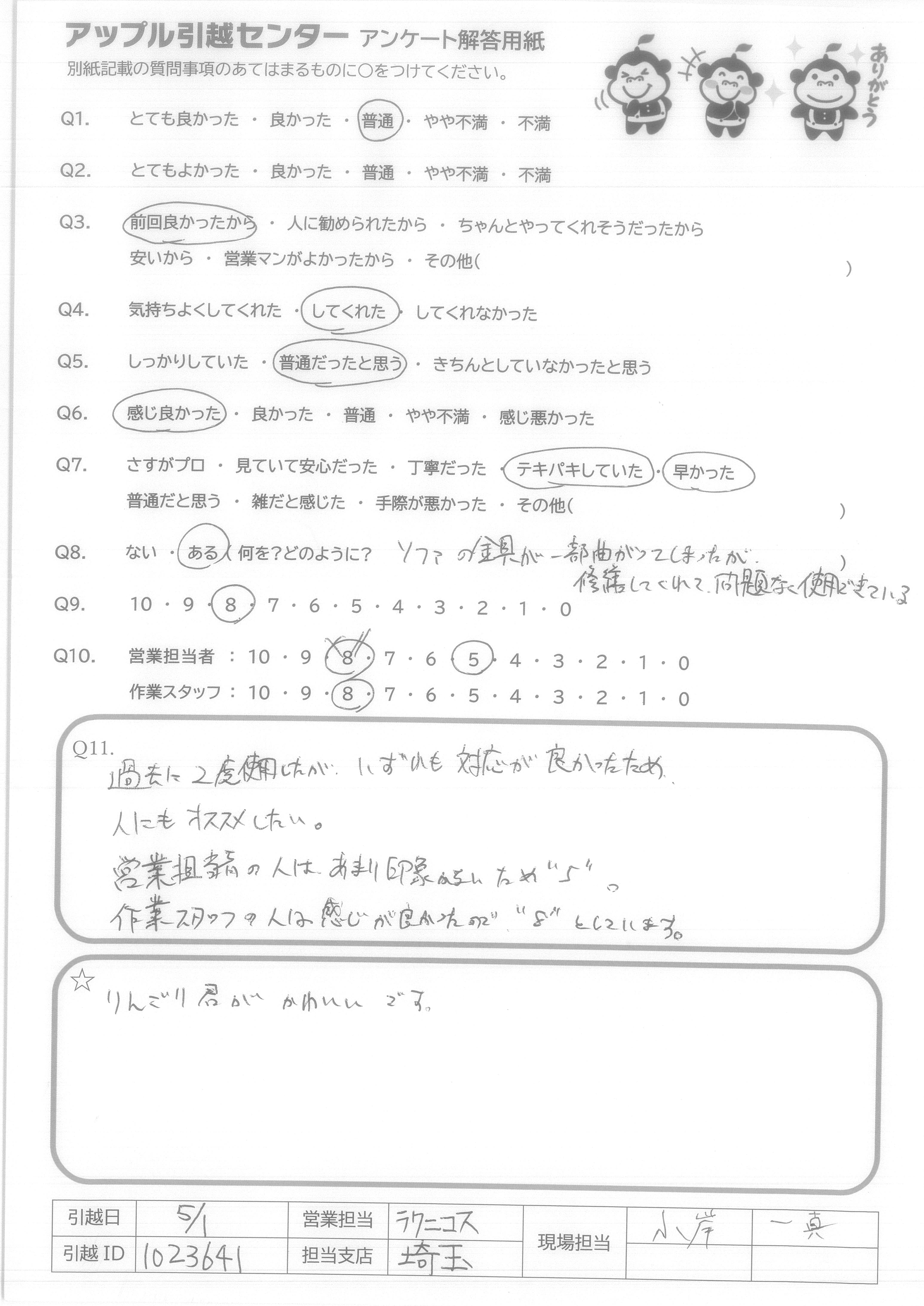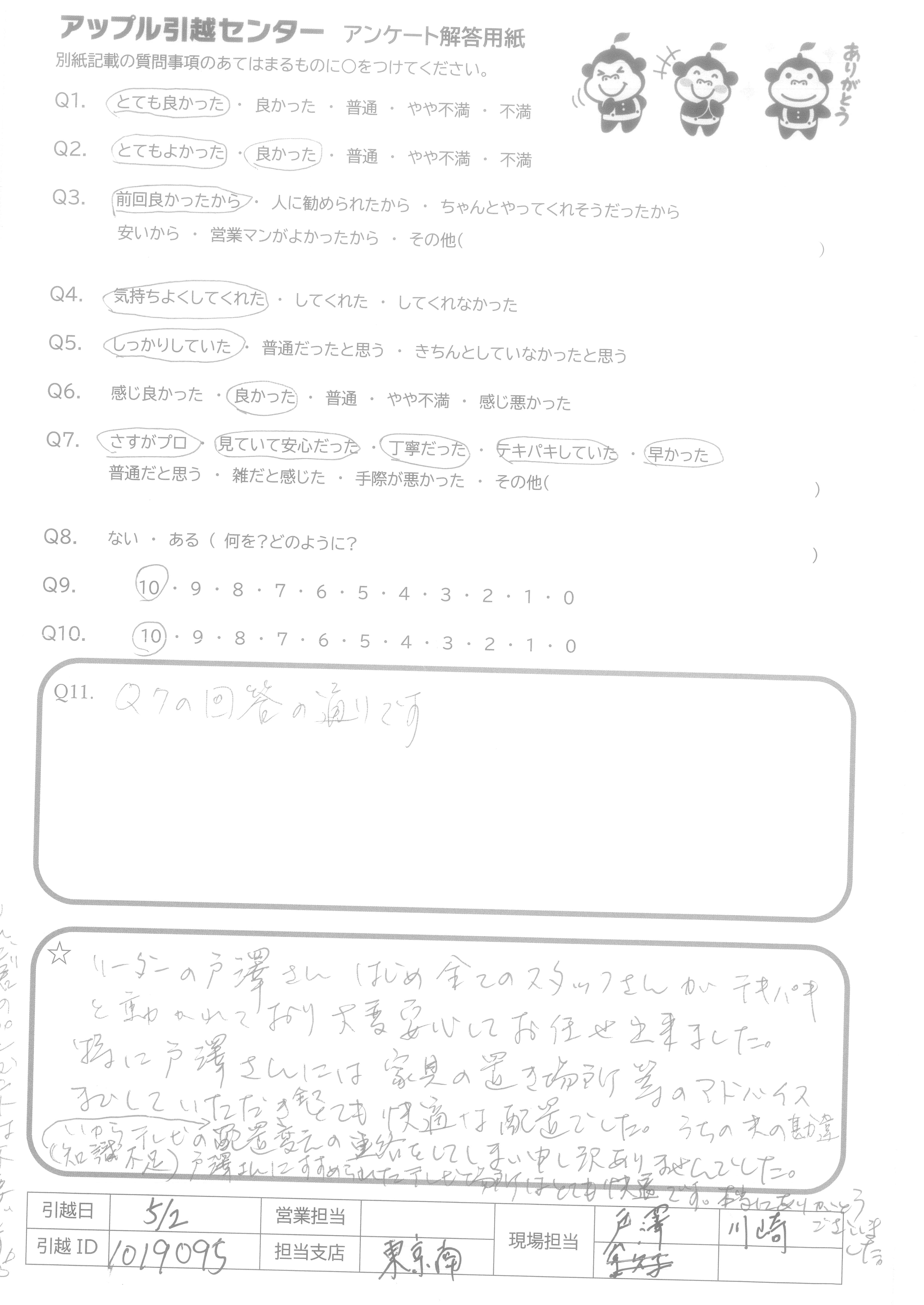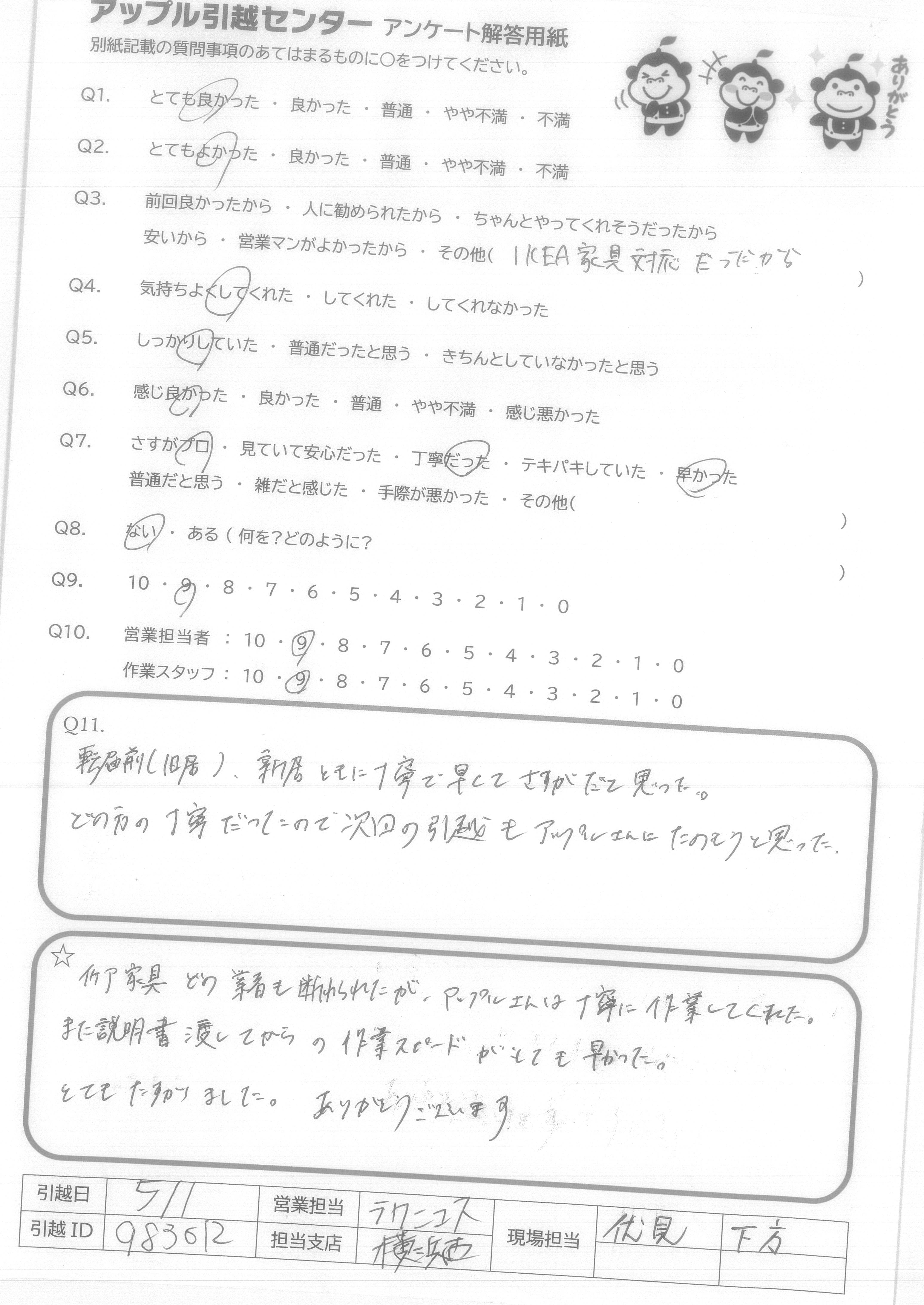 A.転居前(旧居)、新居ともに丁寧で早くてさすがだと思った。 どの方の丁寧だったので次回の引越もアップルさんにたのもうと思った。
