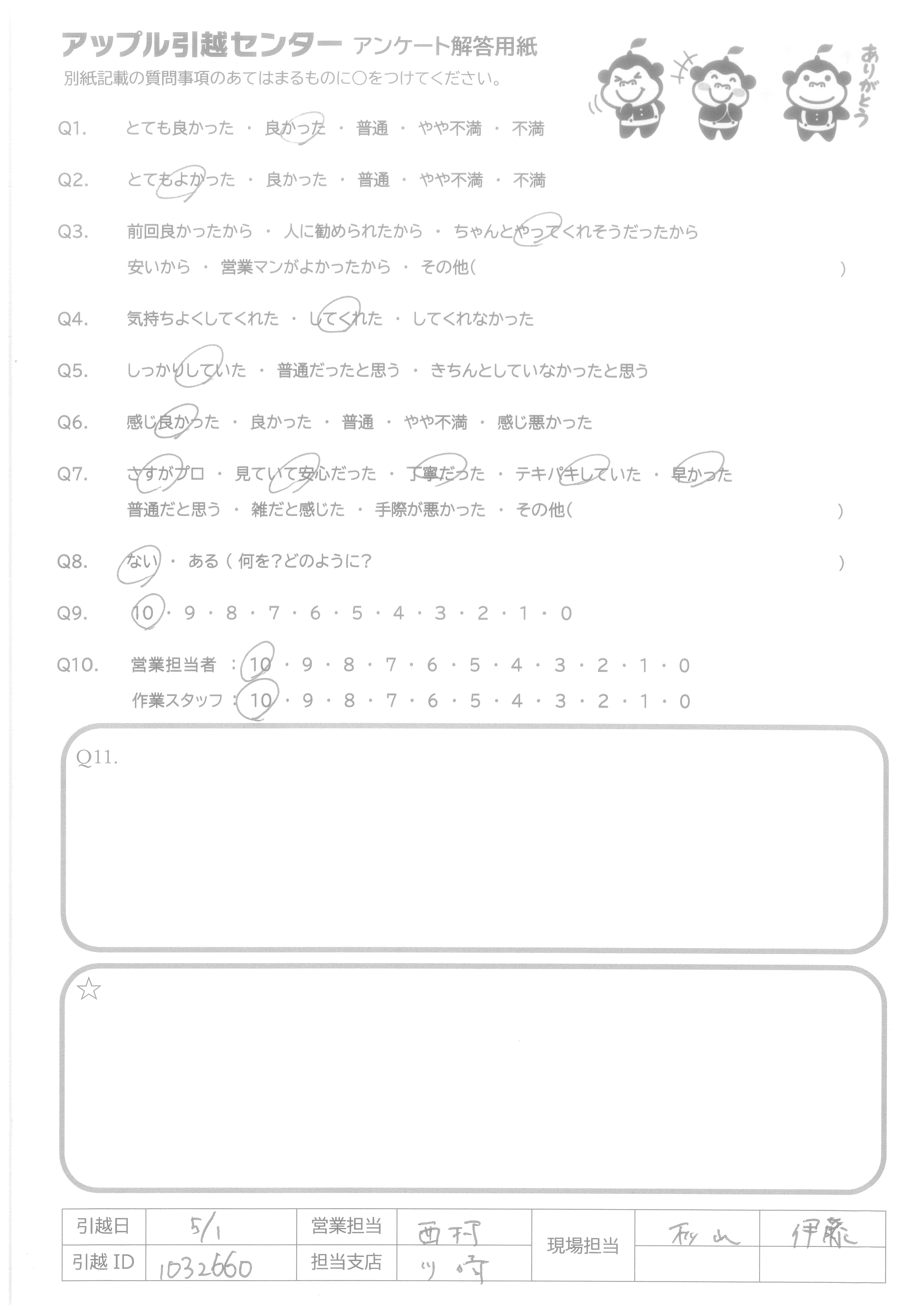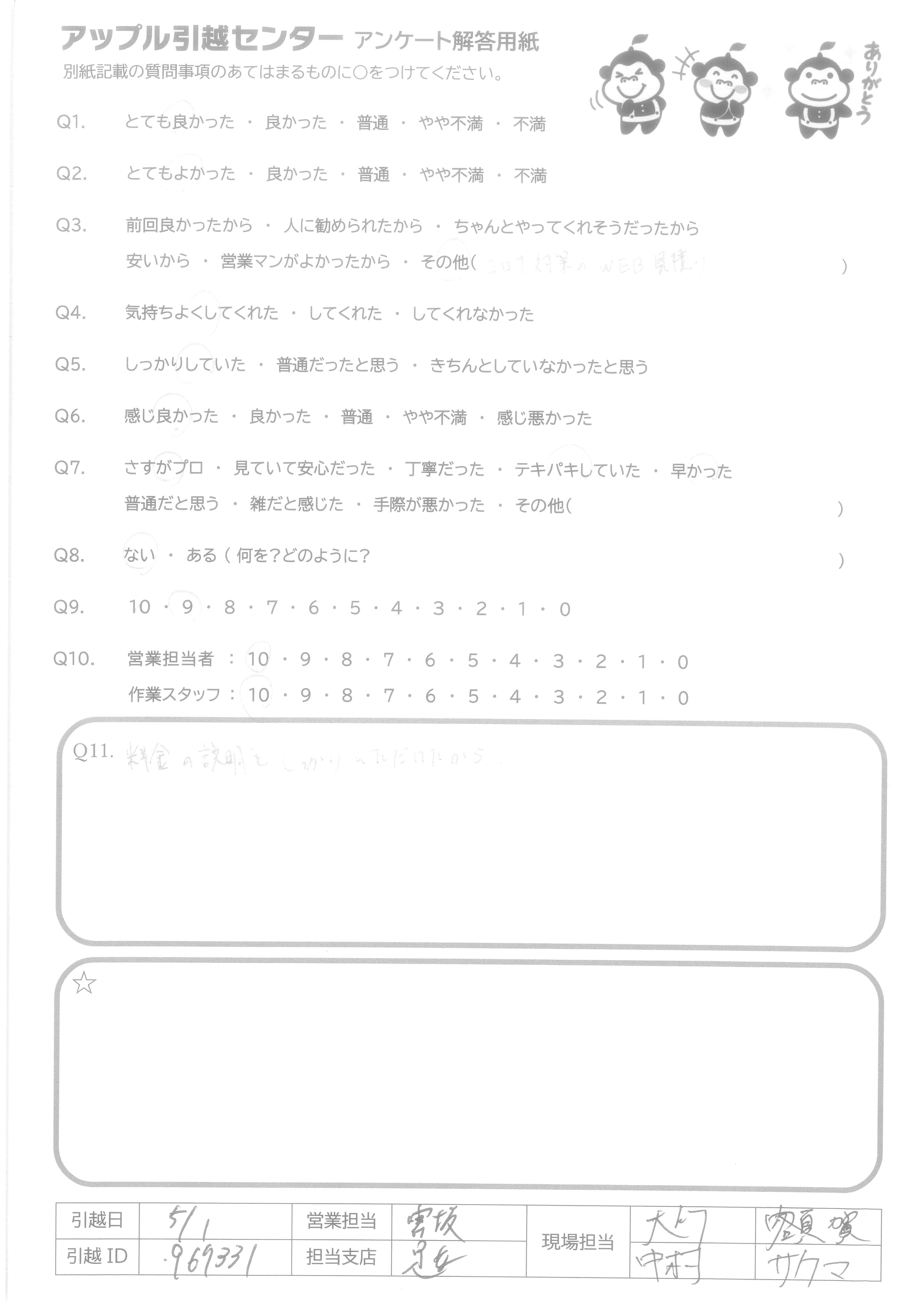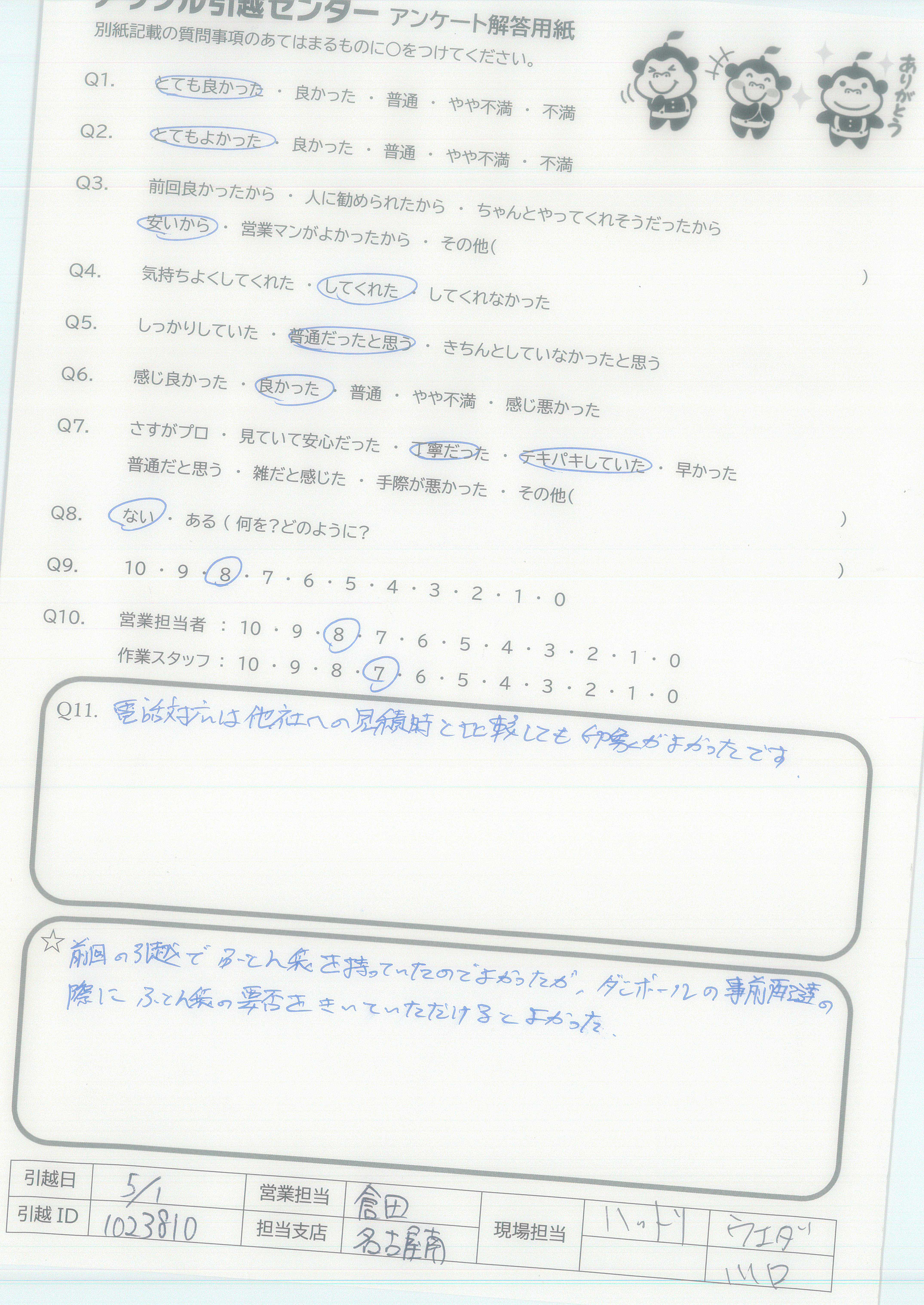 A.作業員さんへ 荷物が多く、新居にはEVがなかったので、二人での作業は大変だったのではないかと思います。途中、雨が降りましたが、お二人のスムーズで丁寧な作業のお陰で無事に引越を終えることができました。また引越をする際はお願いできればと思います。この度は本当にありがとうございました!!