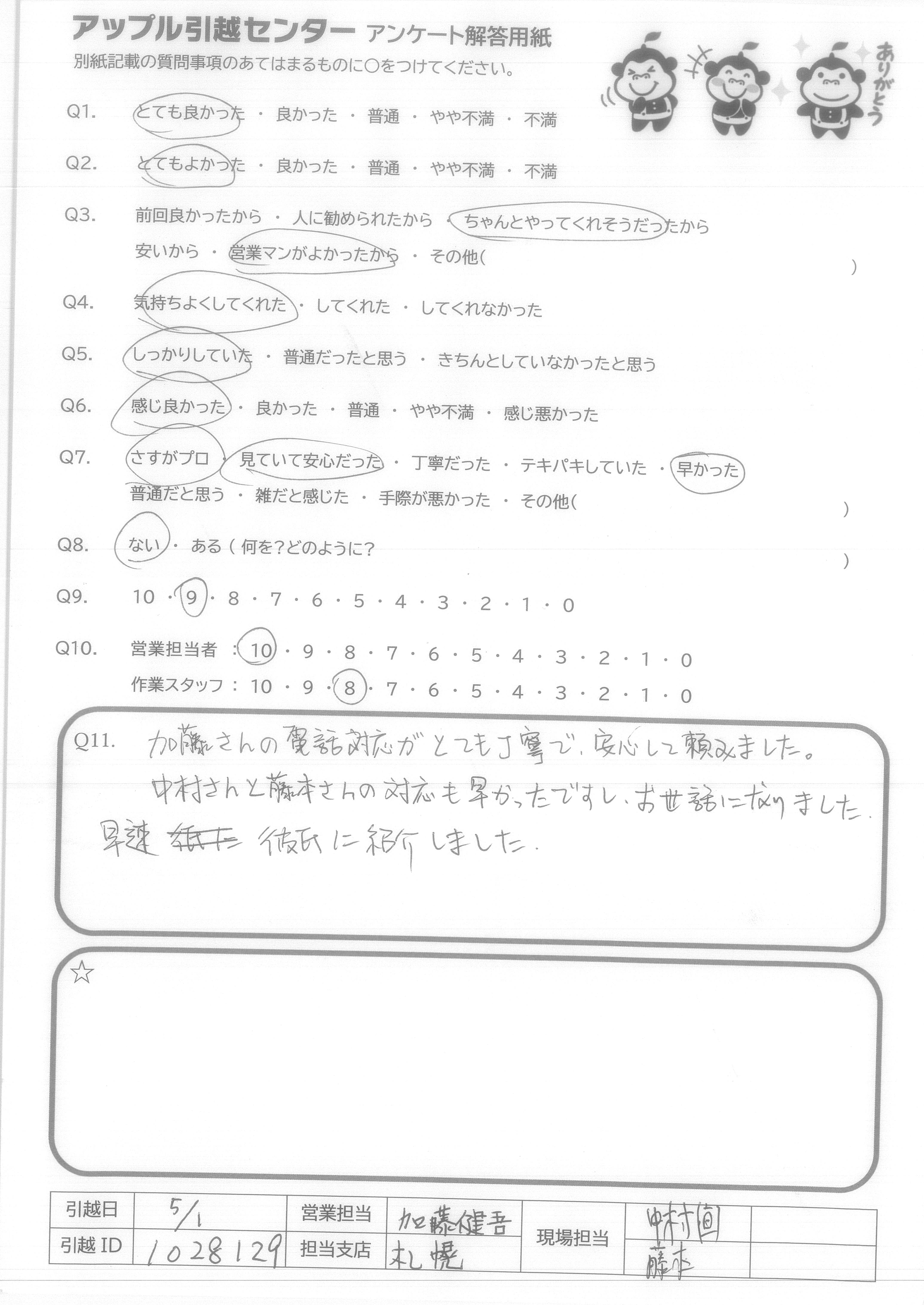 A.加藤さんの電話対応がとても丁寧で、安心して頼みました。中村さんと藤本さんの対応も早かったですし、お世話になりました。 早速彼氏に紹介しました。