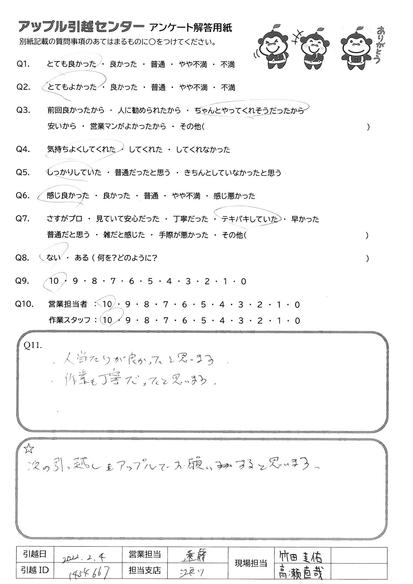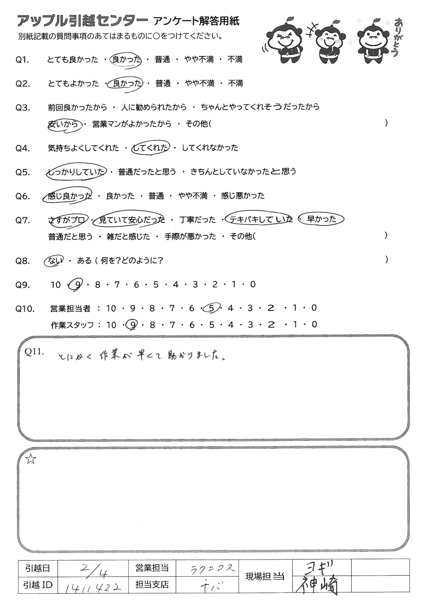 A.作業が非常にはやかった。 いろいろと気づかってくださり、気持ちよく引越しができた。
