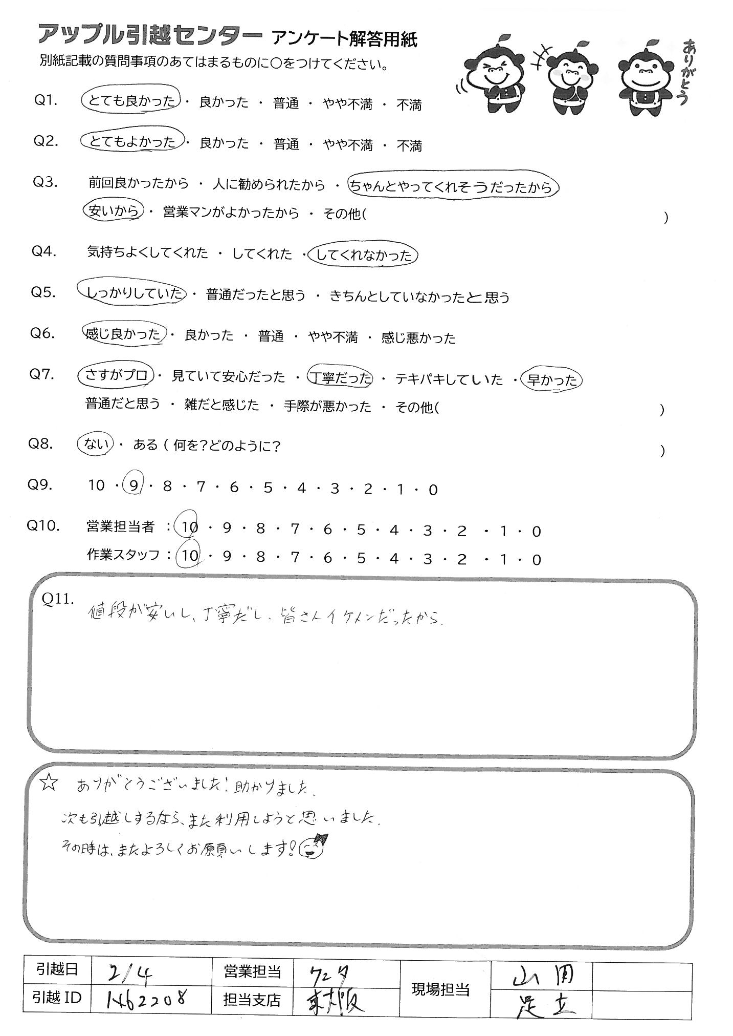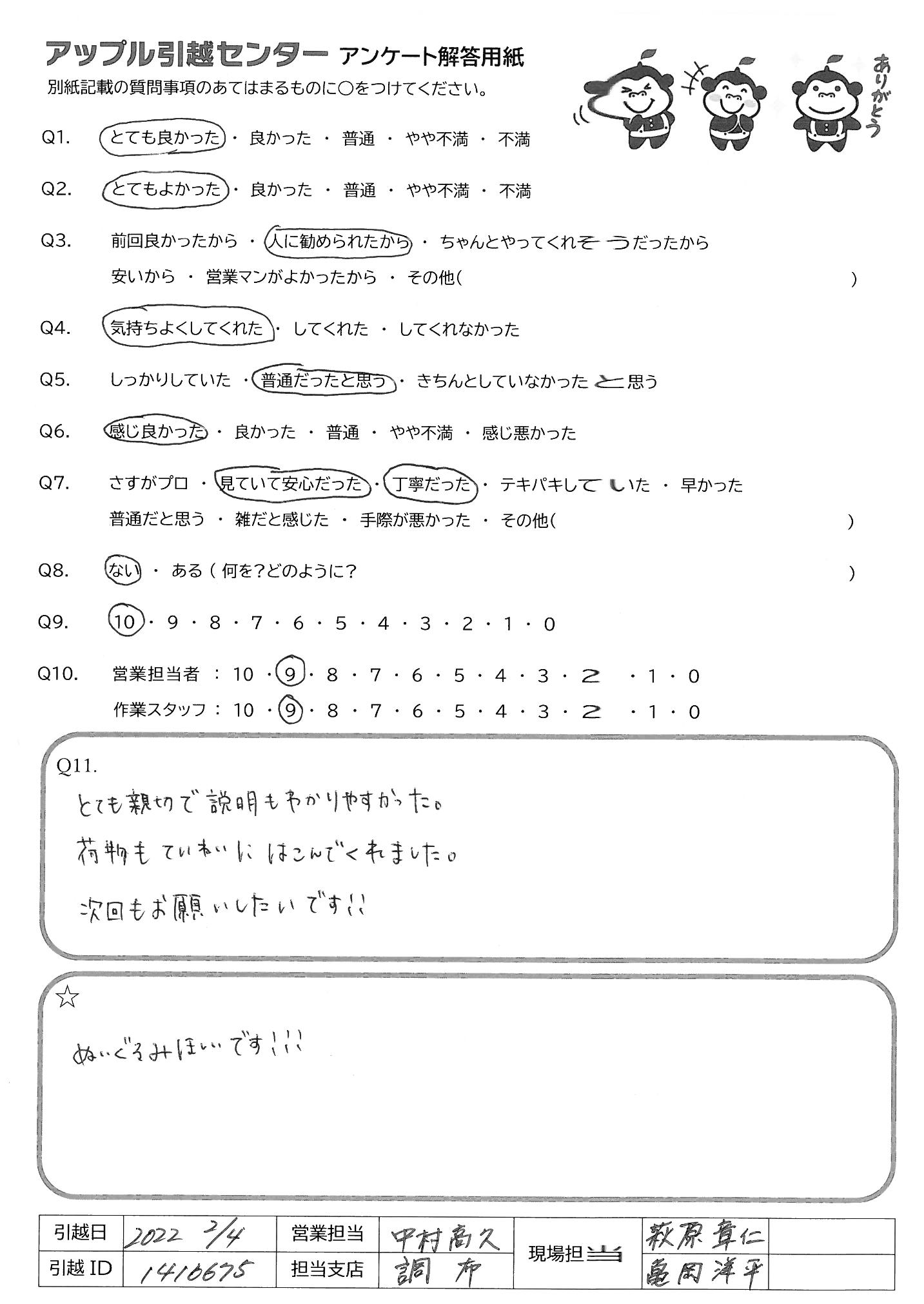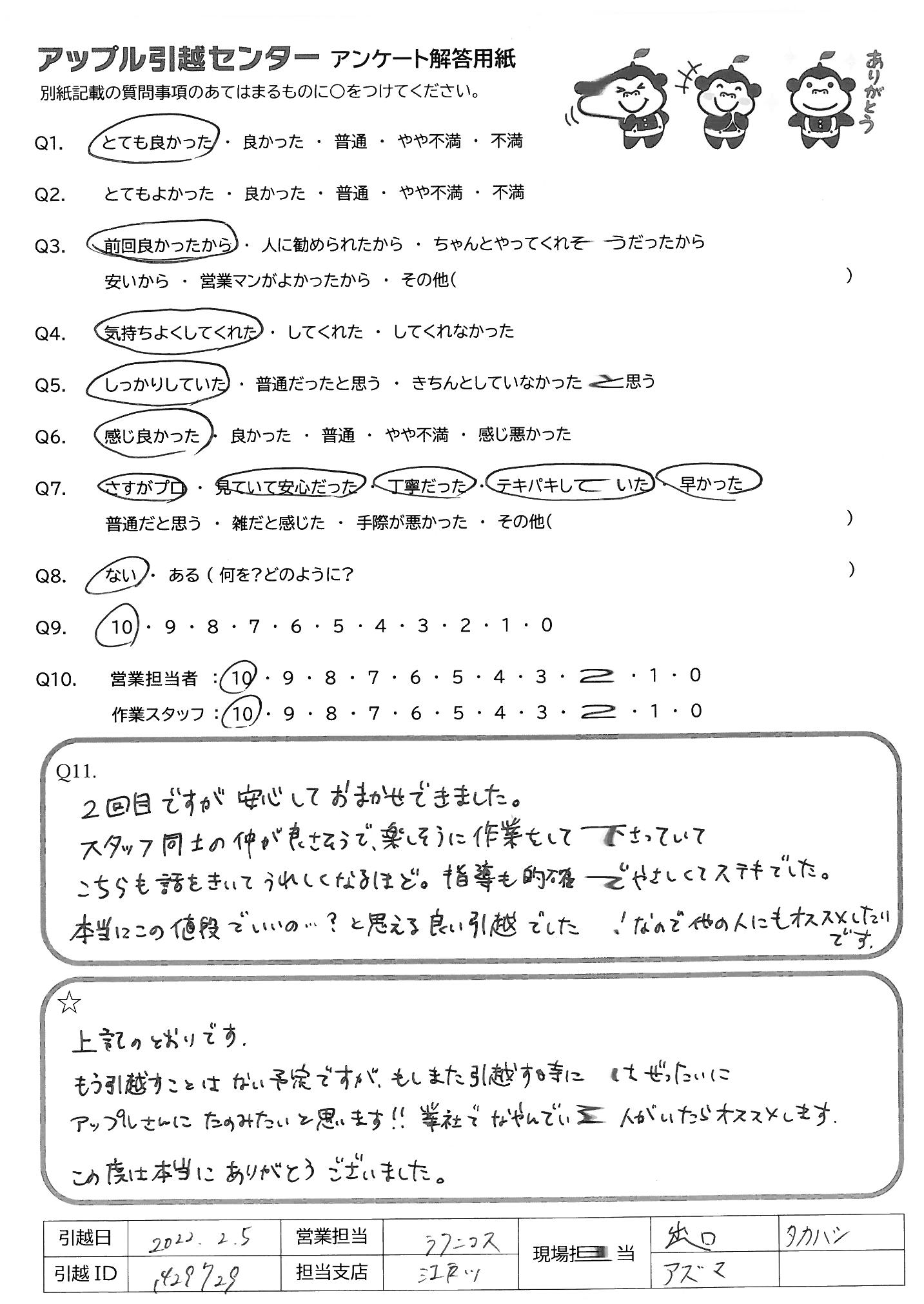 A.上記のとおりです もう引っ越すことはない予定ですが、もしまた引越す時にはぜったいに アップルさんにたのみたいと思います!!業者でなやんでいる人がいたらオススメします この度は本当にありがとうございました。