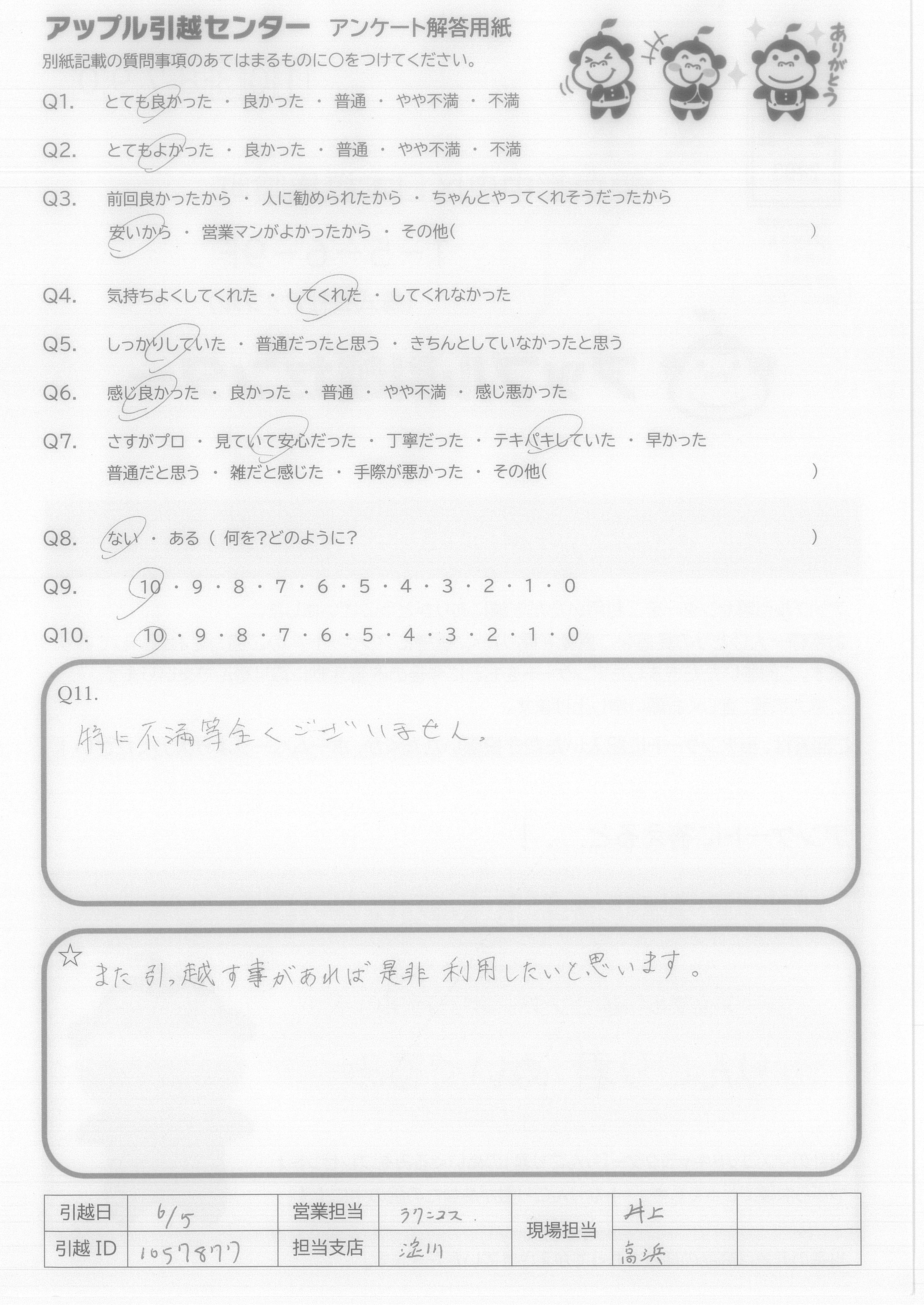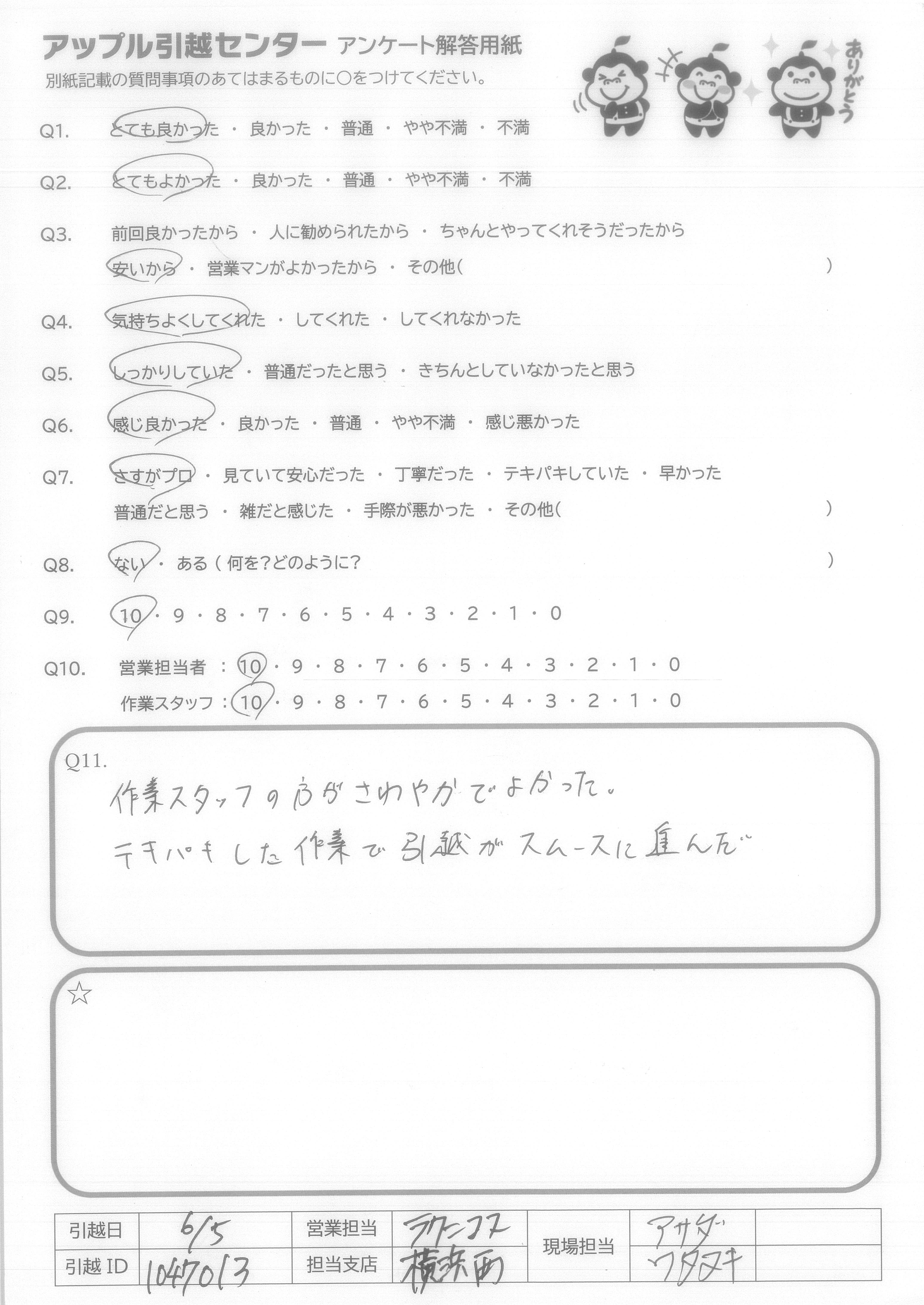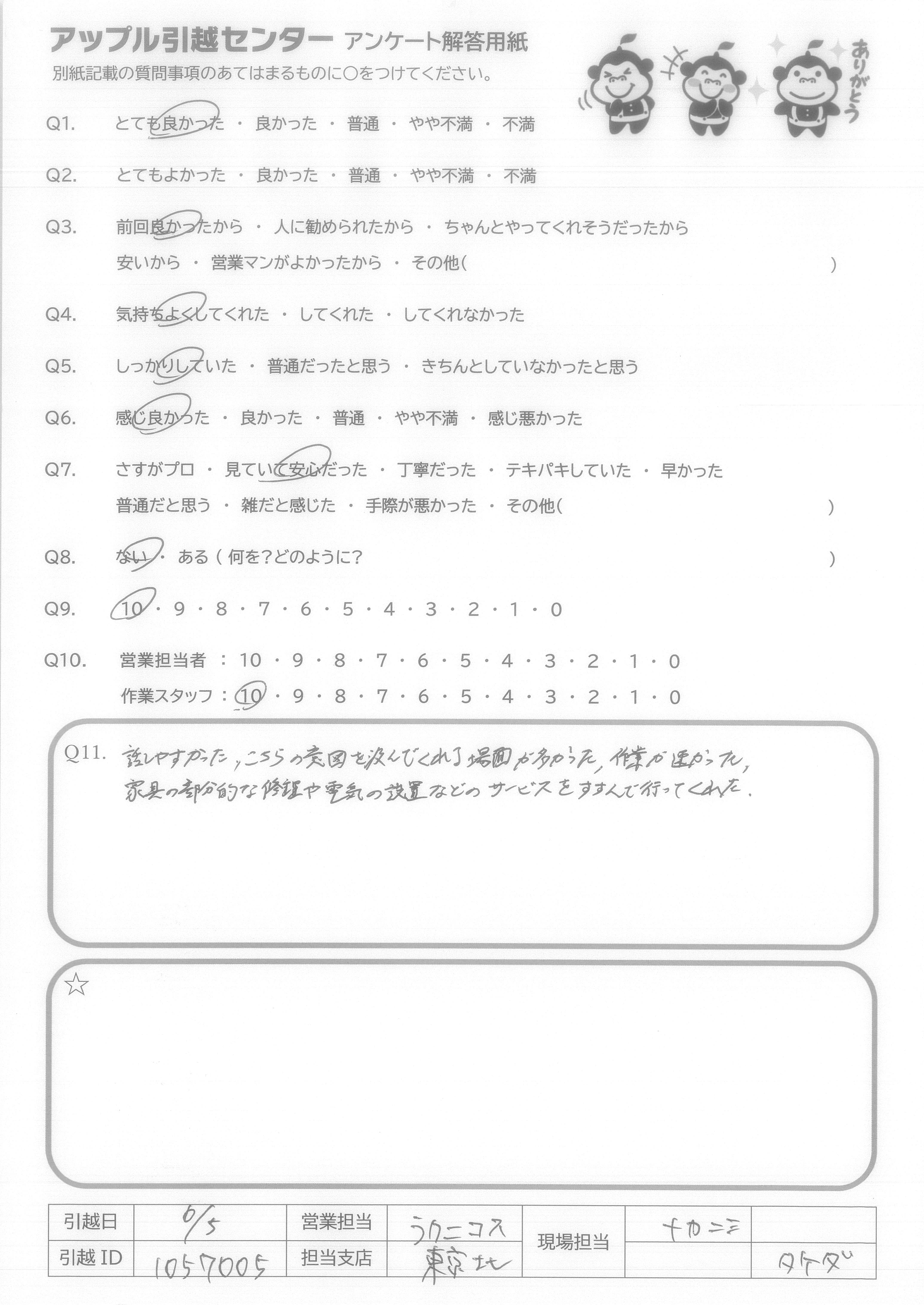 A.高須さんと直江さんに作業していただきました。 当日は連絡をしていないソファを2階まで運んで下さって、とても助かりました! 丁寧にテキパキとやって下さいました。 ふだんアンケートは面倒で書かないのですが、とても良かったので回答させていただきました。 また引っ越しすることがあったらまたアップルさんにお願いしたいです。