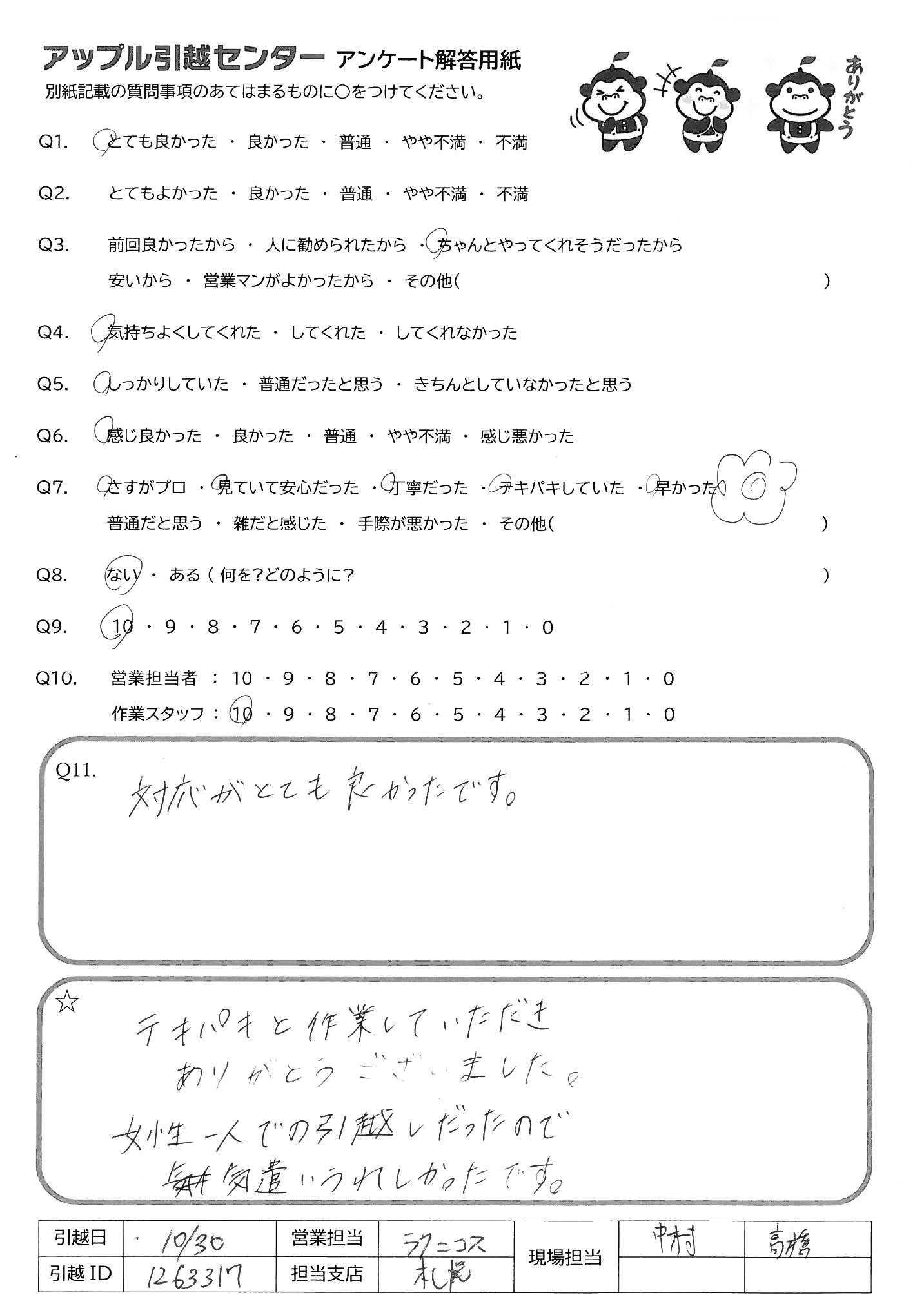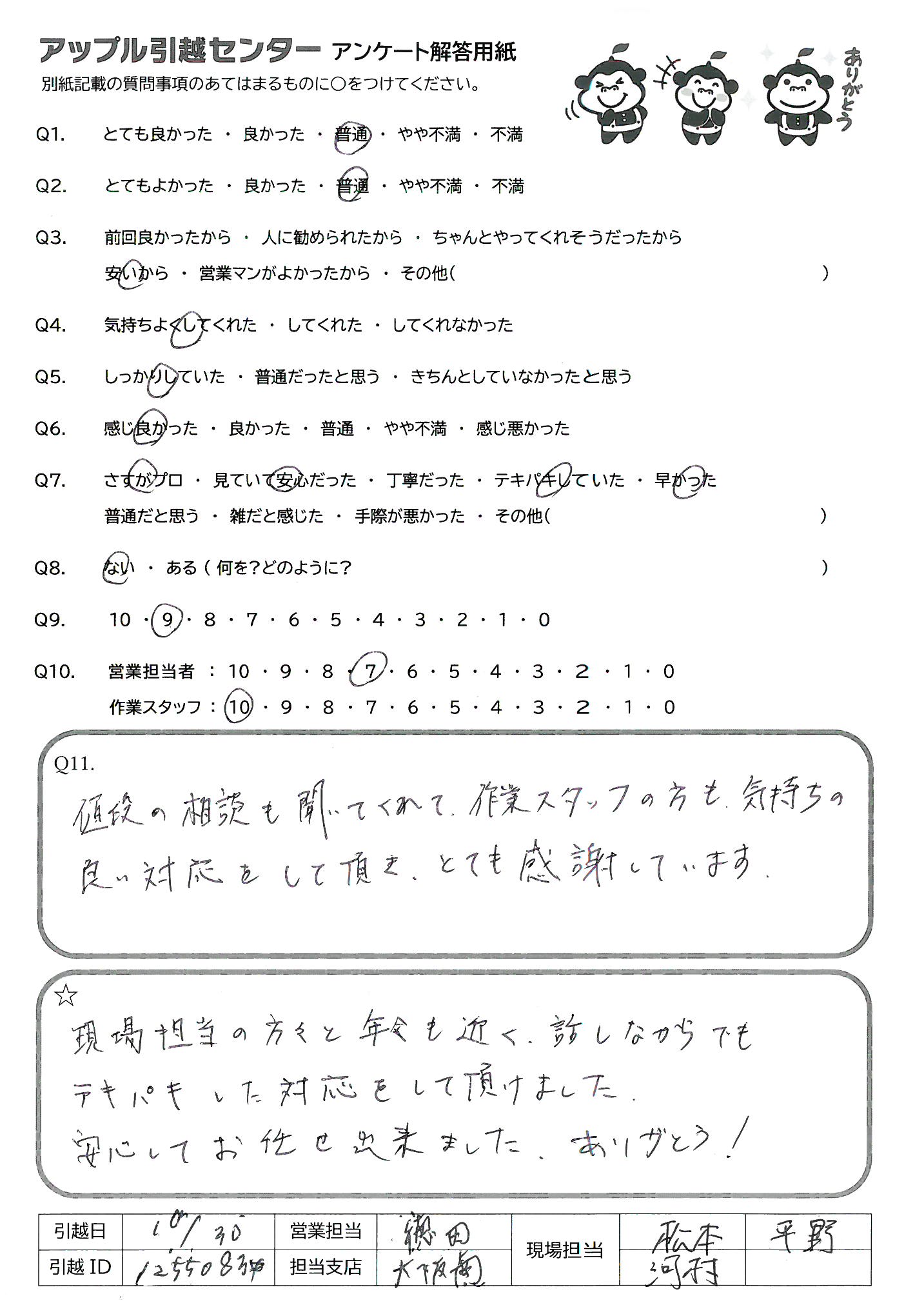 A.テキパキと作業していただき ありがとうございました。 女性一人での引越しだったので気遣いうれしかったです。