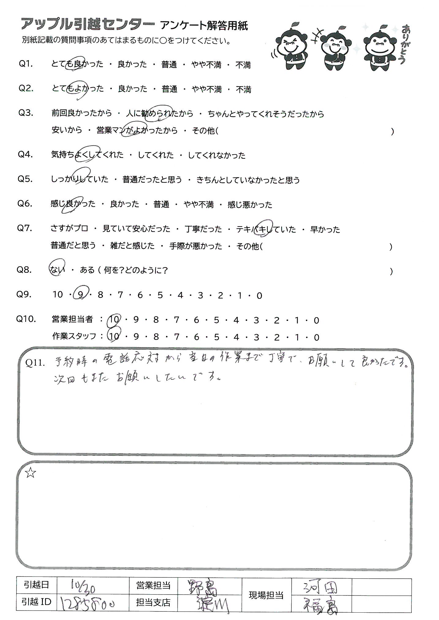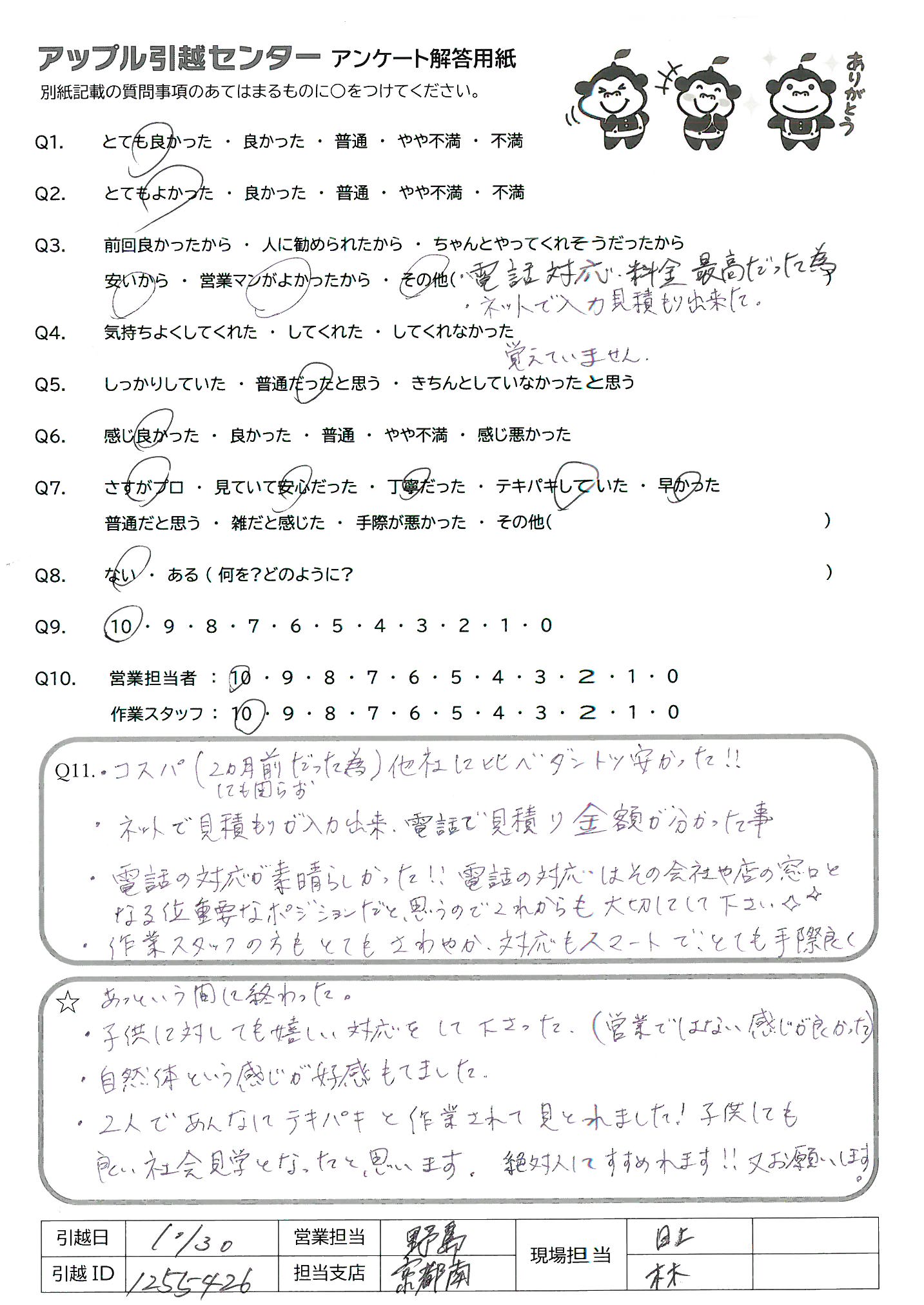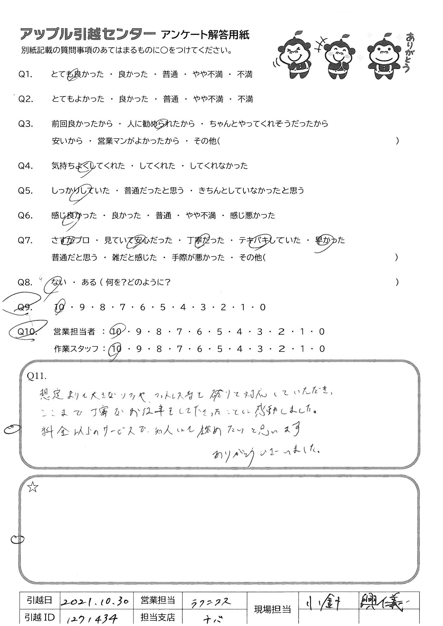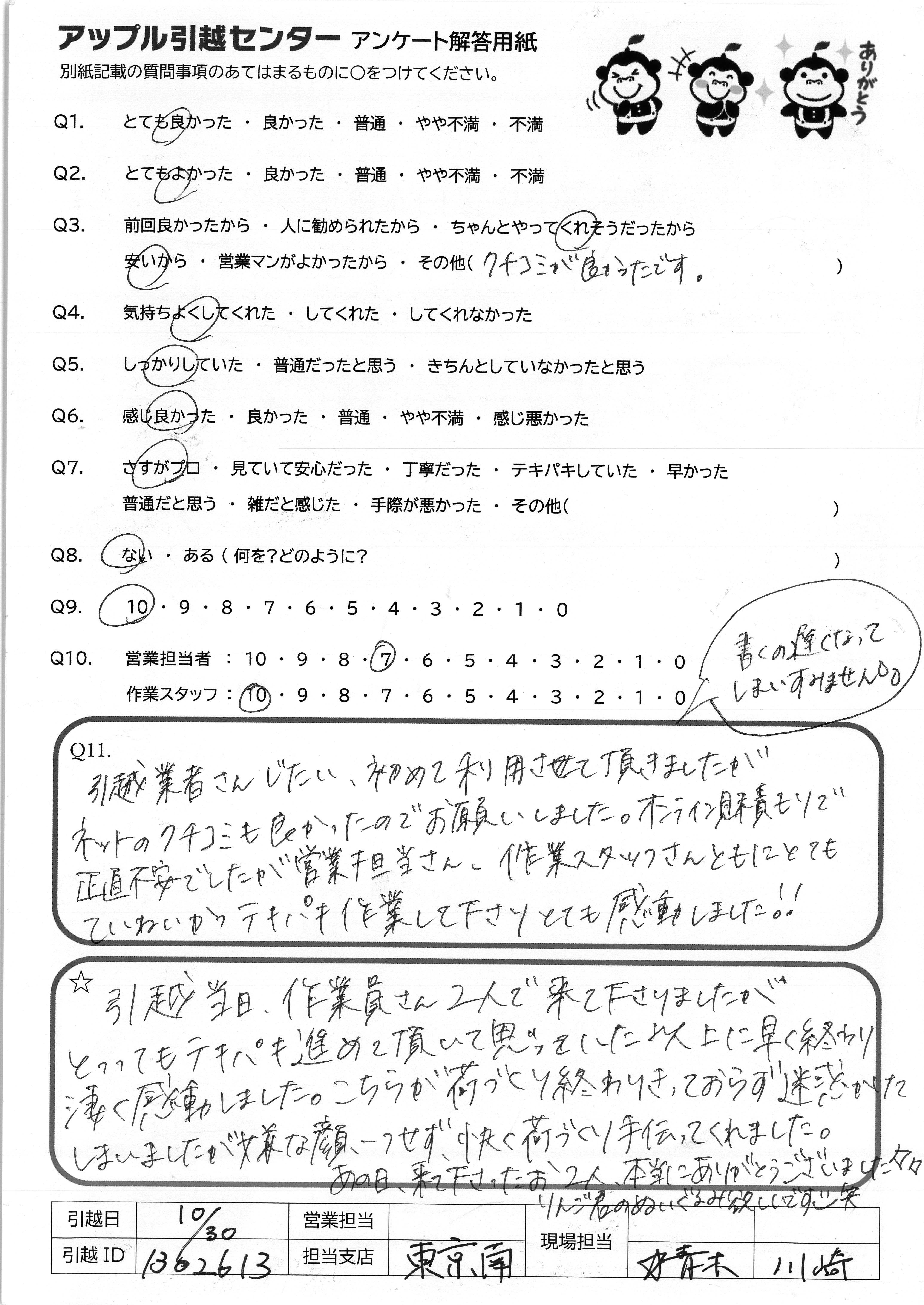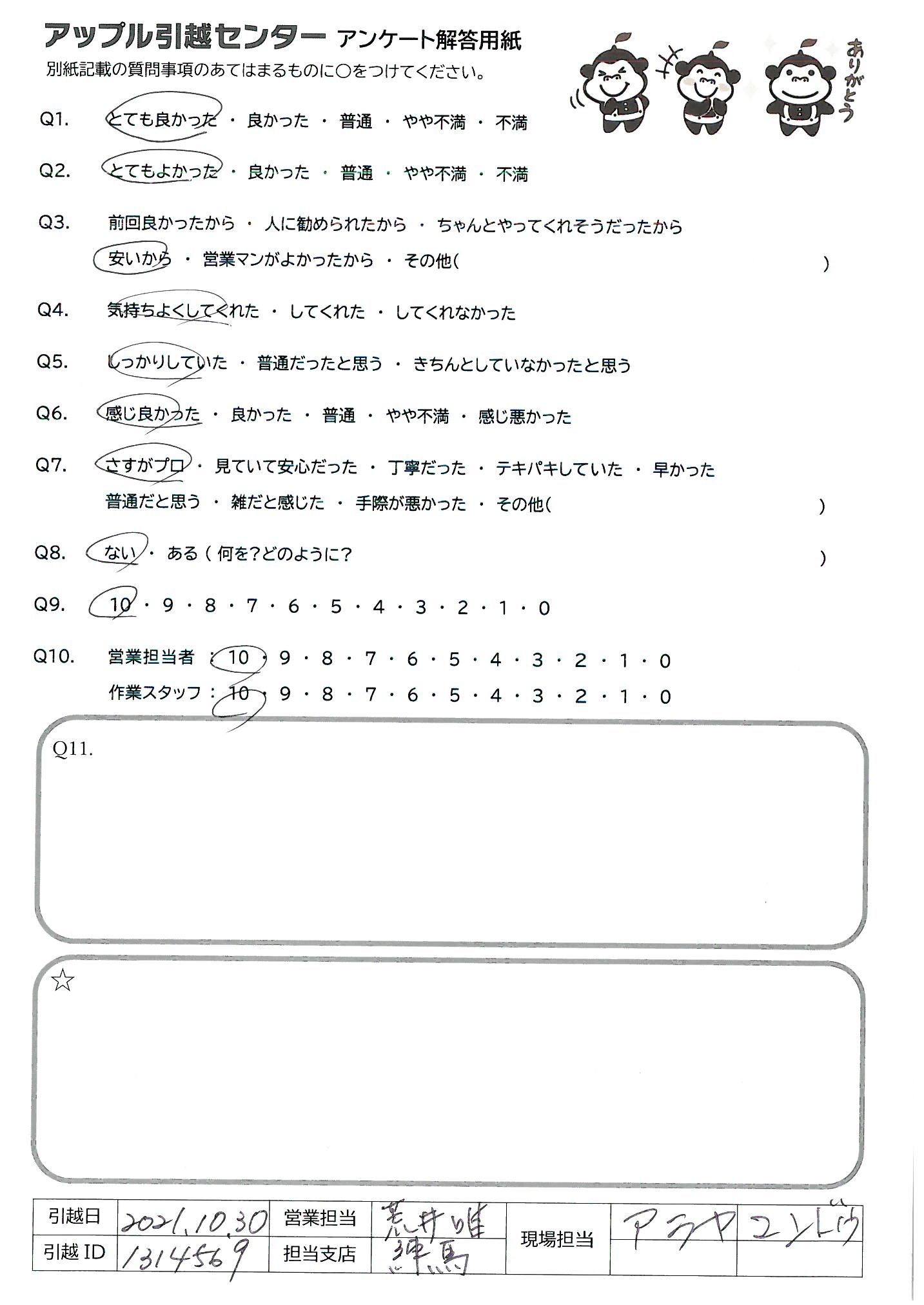 A.今まで何度か引っ越しましたが、荷物の破損や到着時刻になっても業者が来ない(連絡が来ない)、オペレーターの対応が悪い等、良いことは一切ありませんでした。 しかしアップルさんは、引っ越し当日から何度か連絡をくれて、到着時刻も分かり安心しました。また作業の際も運んでいいかの確認を逐一してくれた上、「新居に着いたらこのタイルカーペットを一番はじめに敷きますよね?そしたら新居で一番最初にお渡ししますね!」とまで気を遣ってくれました。そして迅速かつ丁寧に対応してくれました。 お見積りの際も分かりやすくかつ丁寧に説明してくださった営業さんにも大変感謝です。 上記のことから引っ越しには若干トラウマがあり不安ばかりでしたか、破損もなく、こんなに気持ちよく引っ越しができて本当に嬉しかったです。 また機会がありましたら是非ともお願いします。この度は本当にありがとうございました。
