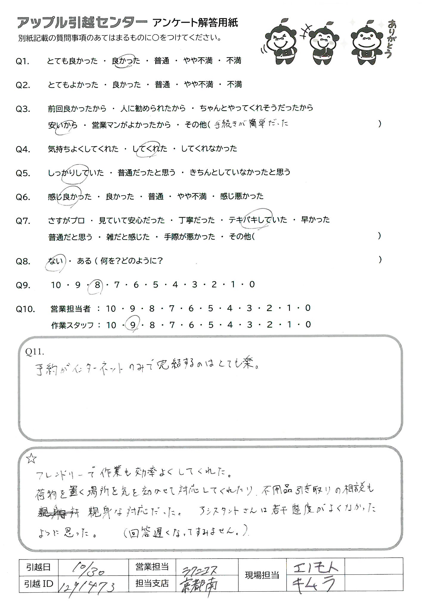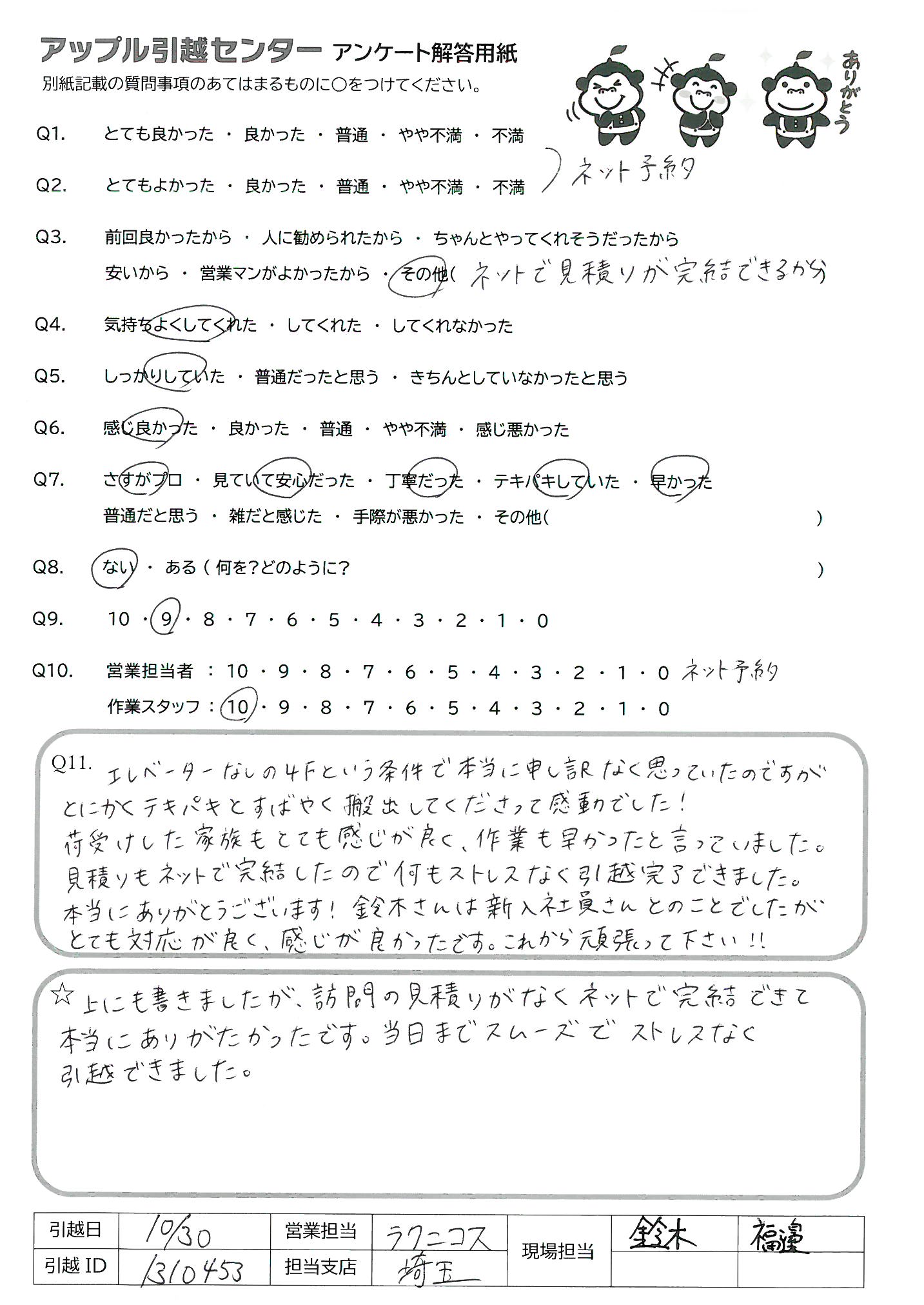 A.エレベータなしの4Fという条件で本当に申し訳なく思っていたのですがとにかくテキパキとすばやく搬出してくださって感動でした! 荷受けした家族もとても感じが良く、作業も早かったと言っていました。見積りもネットで完結したので、何もストレスなく引越完了できました。 本当にありがとうございます!鈴木さんは新入社員さんとのことでしたがとても対応が良く、感じが良かったです。これから頑張って下さい!!