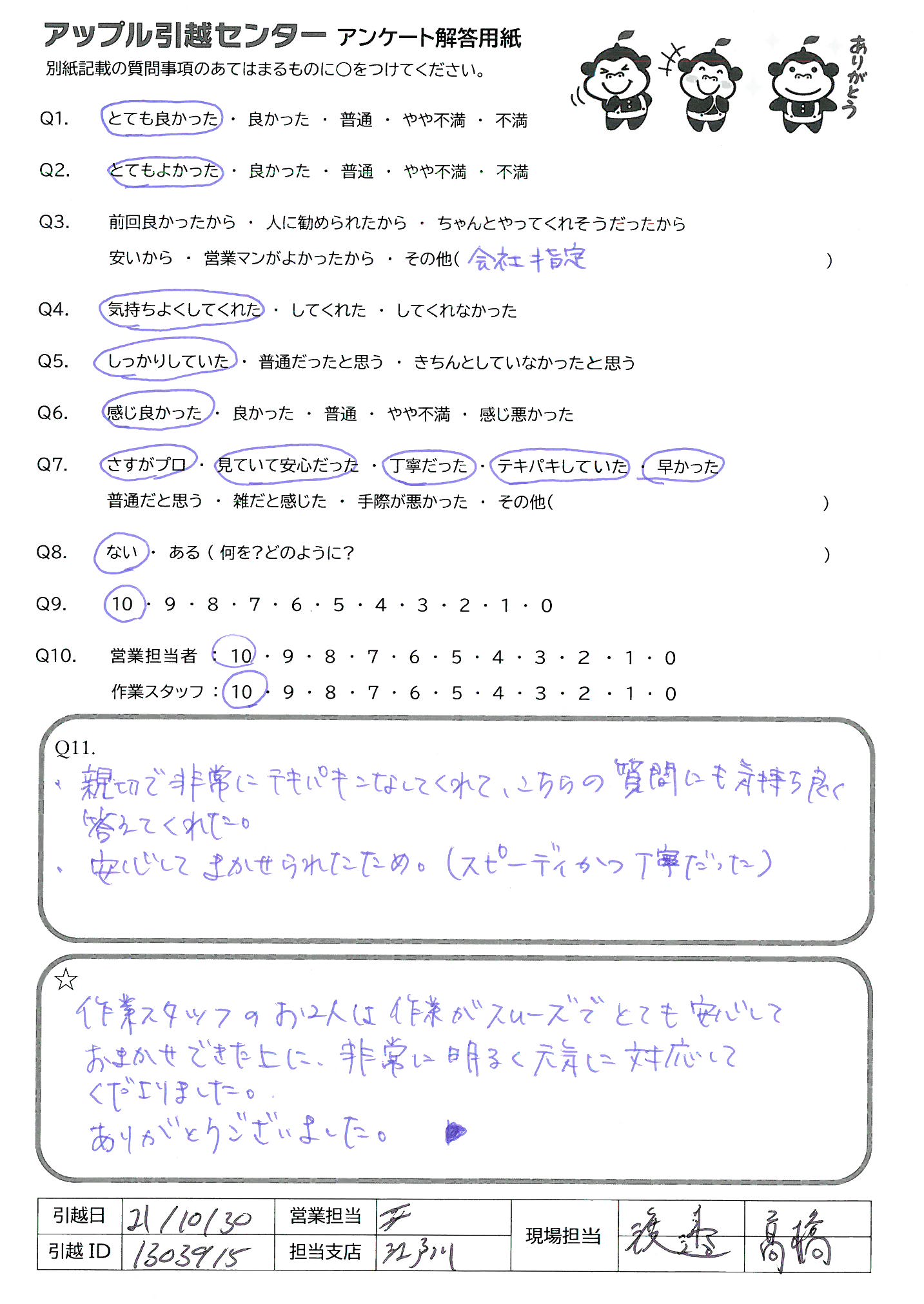 A.・親切で非常にテキパキこなしてくれて、こちらの質問にも気持ち良く答えてくれた ・安心してまかせられたため。(スピーディかつ丁寧だった)