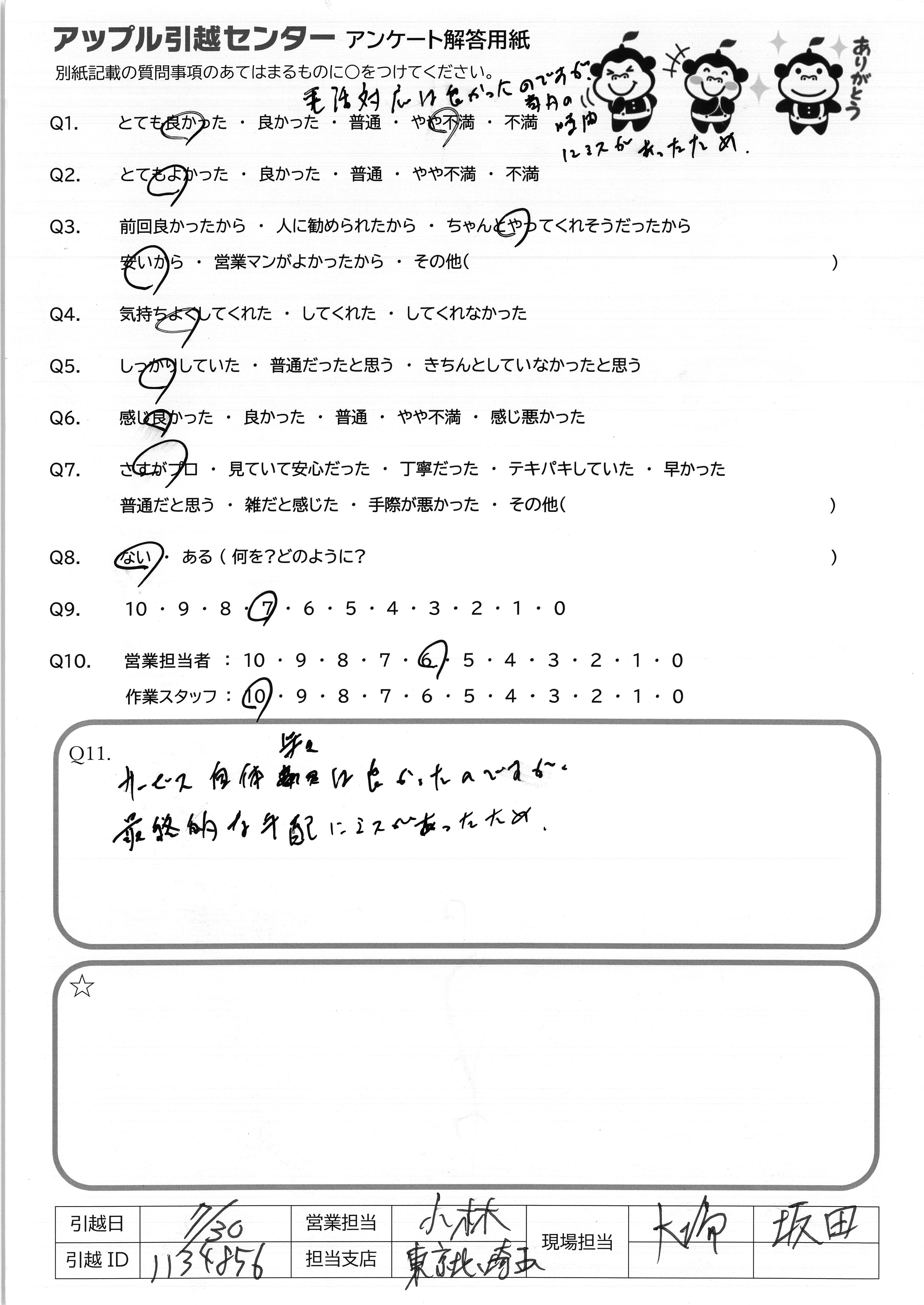 A.今回でお世話になったのがトータル4回目です。また引っ越すときはアップルさんにお願いしたいと思っています。スタッフさんの教育素晴らしいと思います。