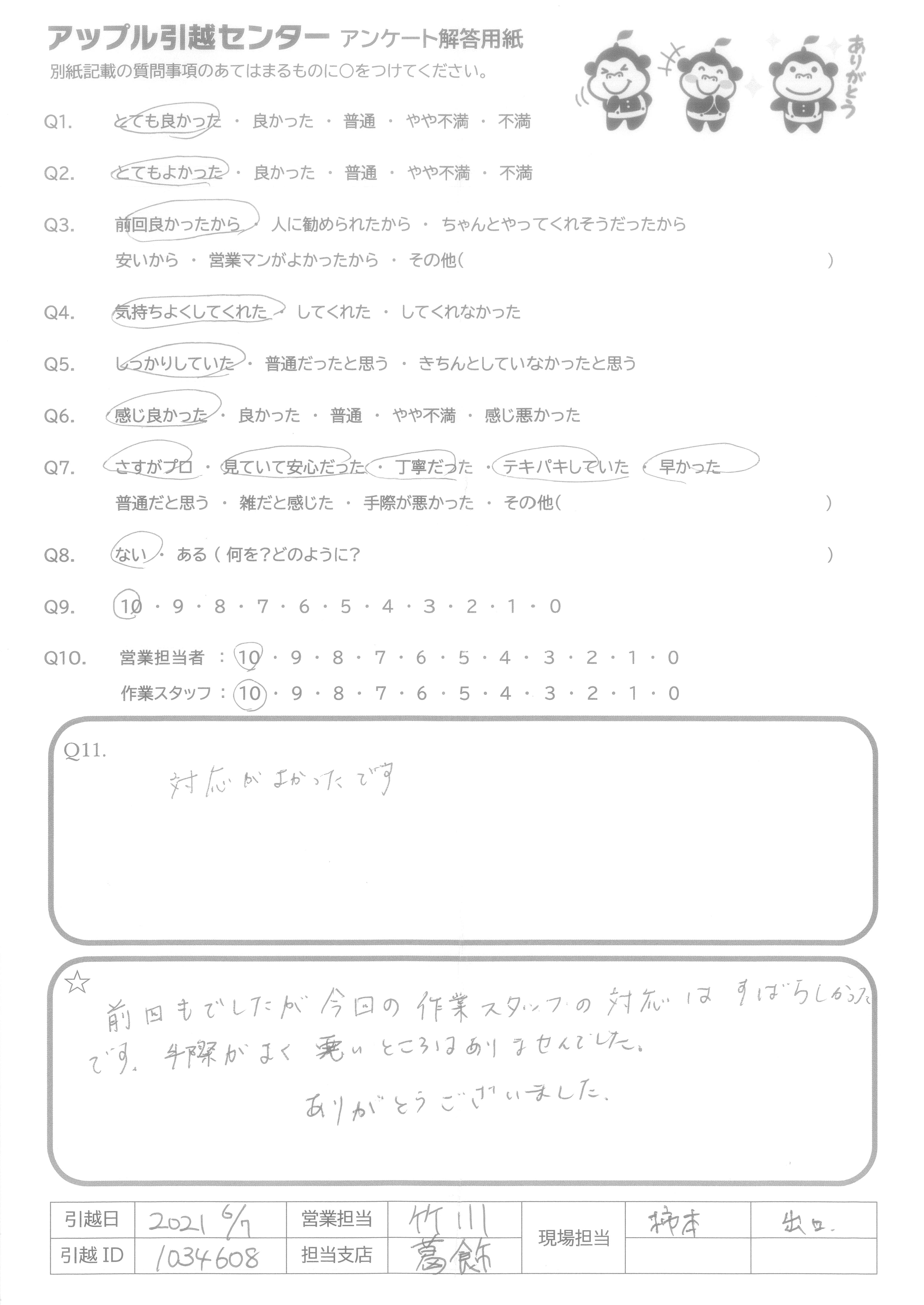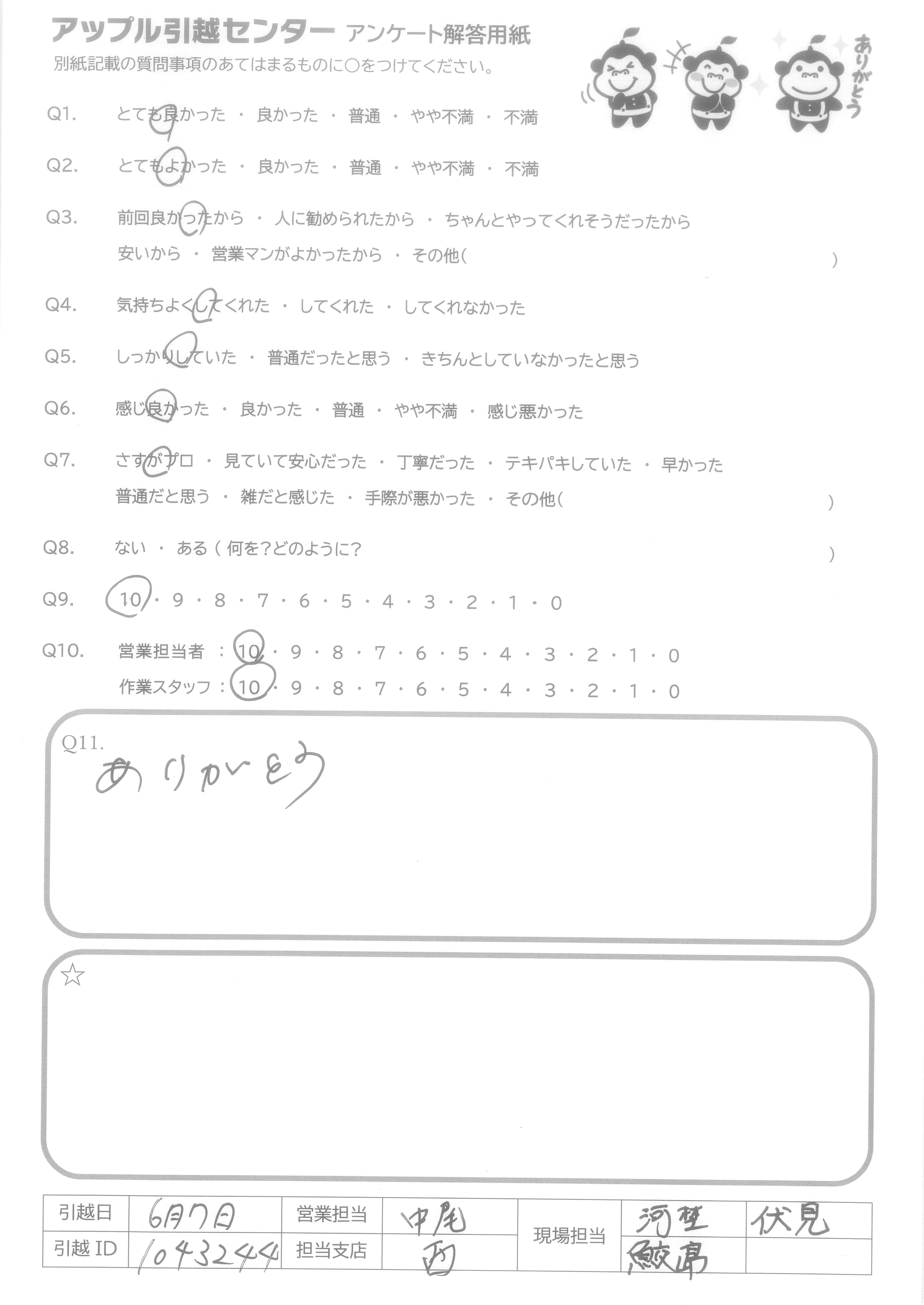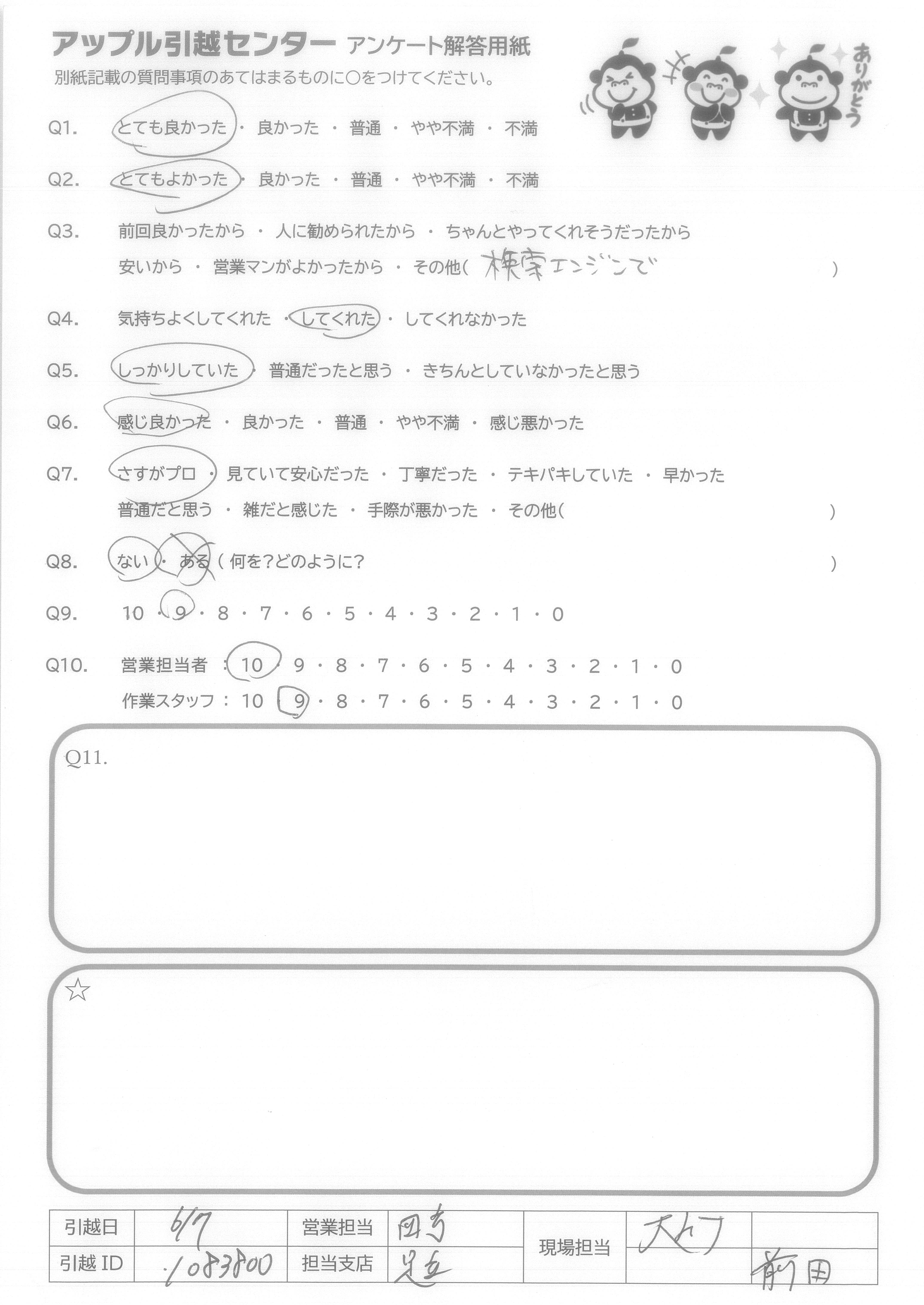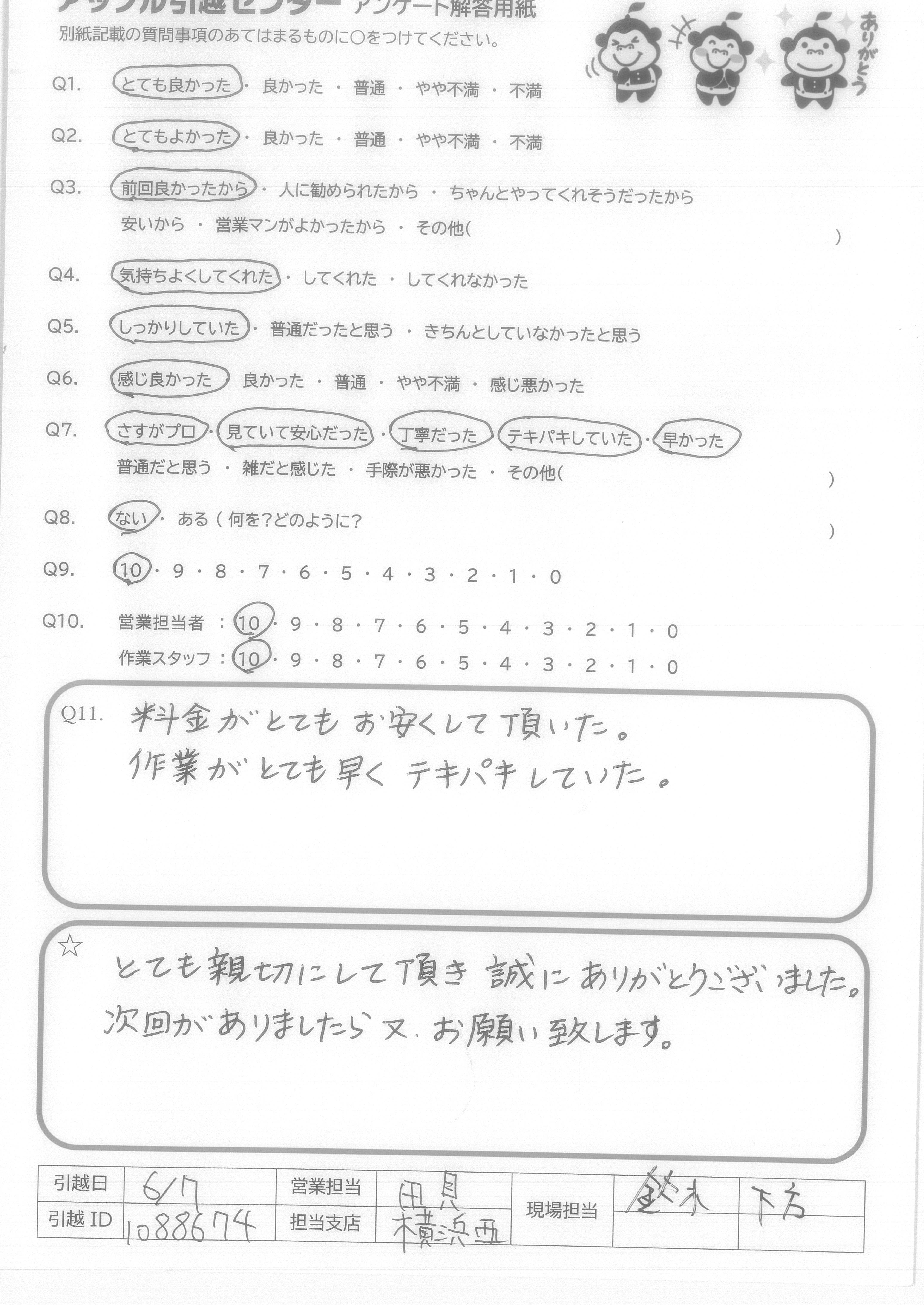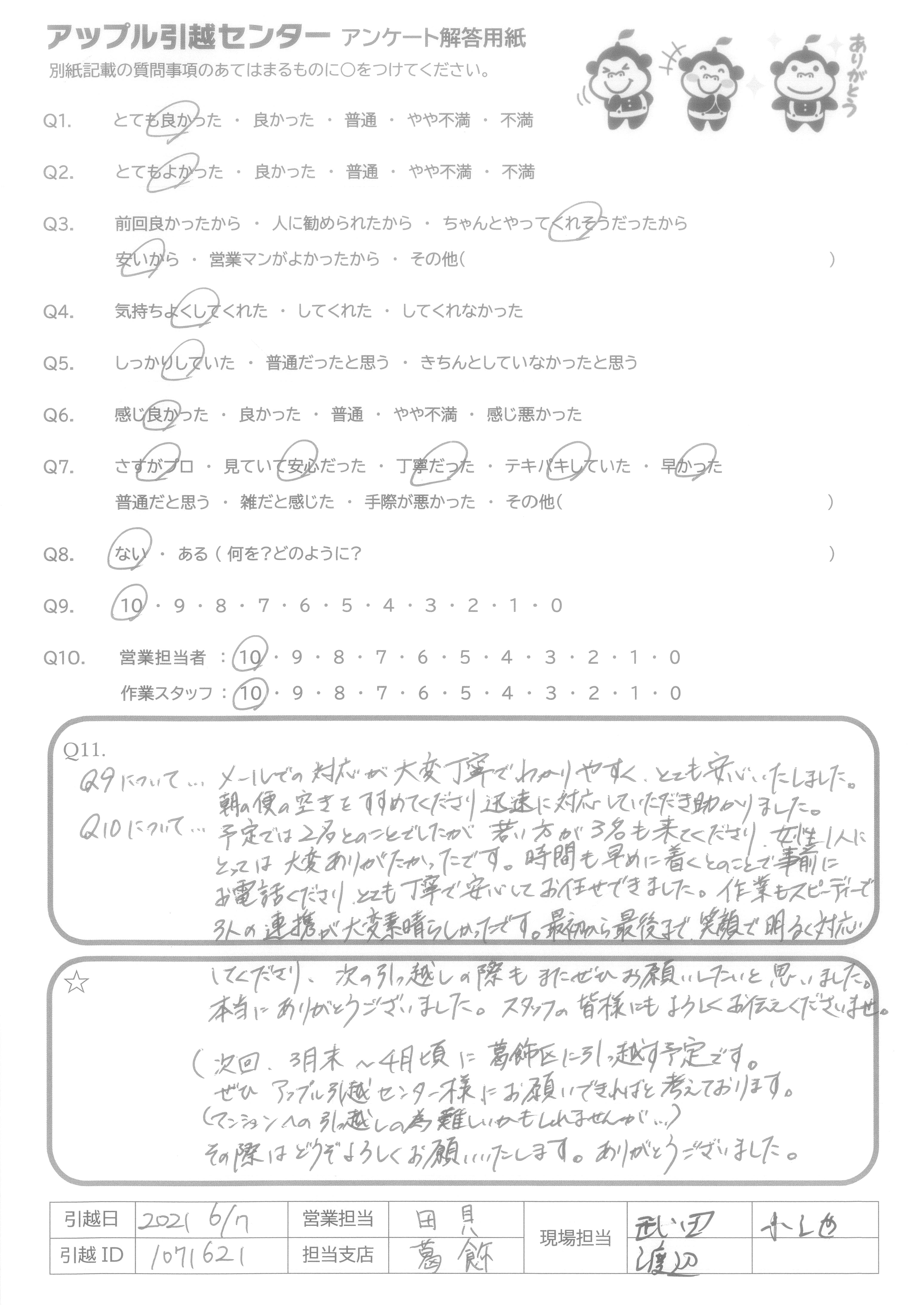 A.Q9について…メールでの対応が大変丁寧でわかりやすく、とても安心いたしました。朝の便の空きをすすめてくださり迅速に対応していただき助かりました。 Q10について…予定では2名とのことでしたが若い方が3名も来てくださり、女性1人にとっては大変ありがたかったです。時間も早めに着くとのことで事前にお電話くださりとても丁寧で安心してお任せできました。作業もスピーディーで3人の連携が大変素晴らしかったです。最初から最後まで、笑顔で明るく対応