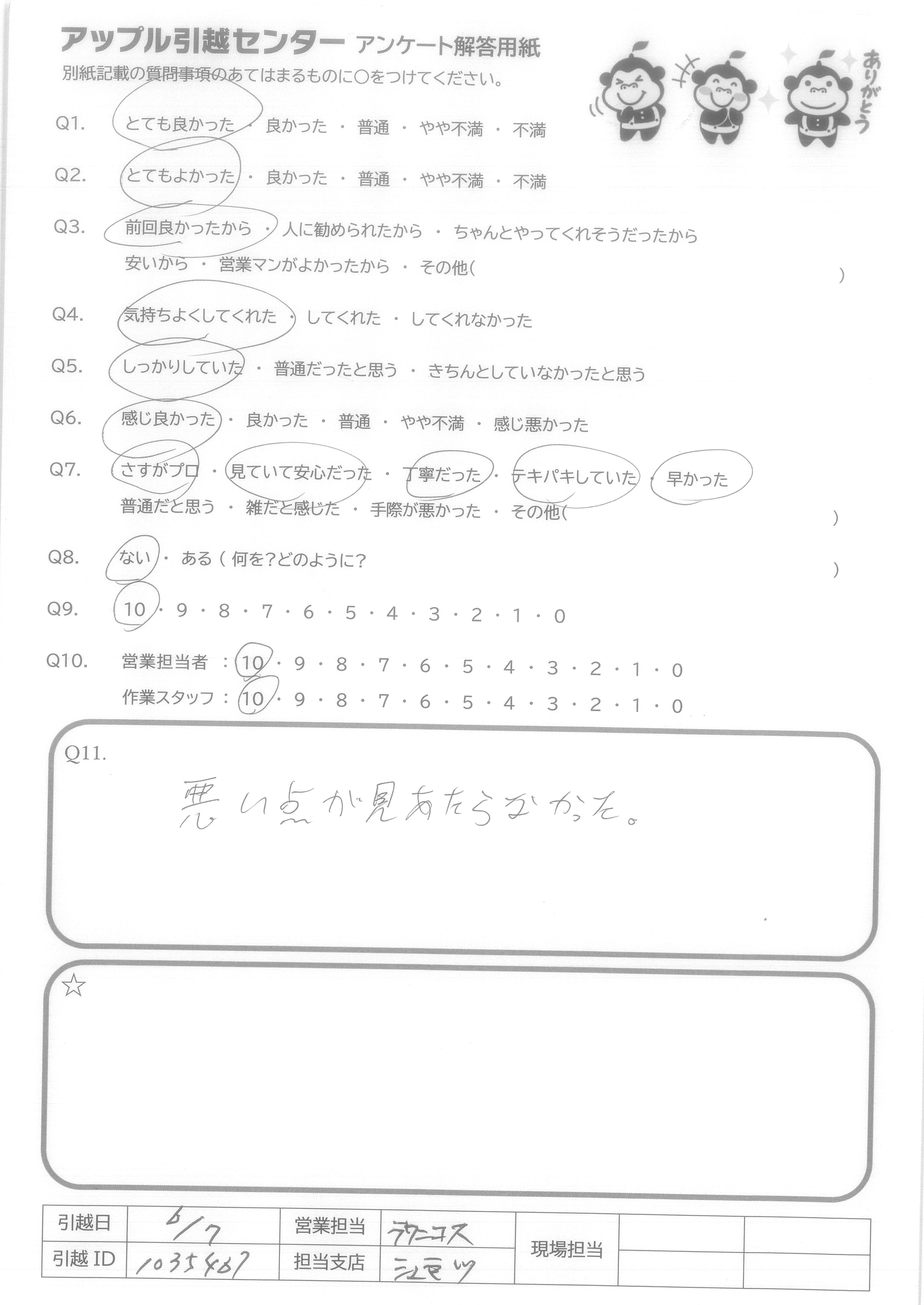 A.迅速丁寧に作業をしていただけたため。 また家具等を記憶していた場合、次回の引越し時作業が捗るのではないかと考えたため。