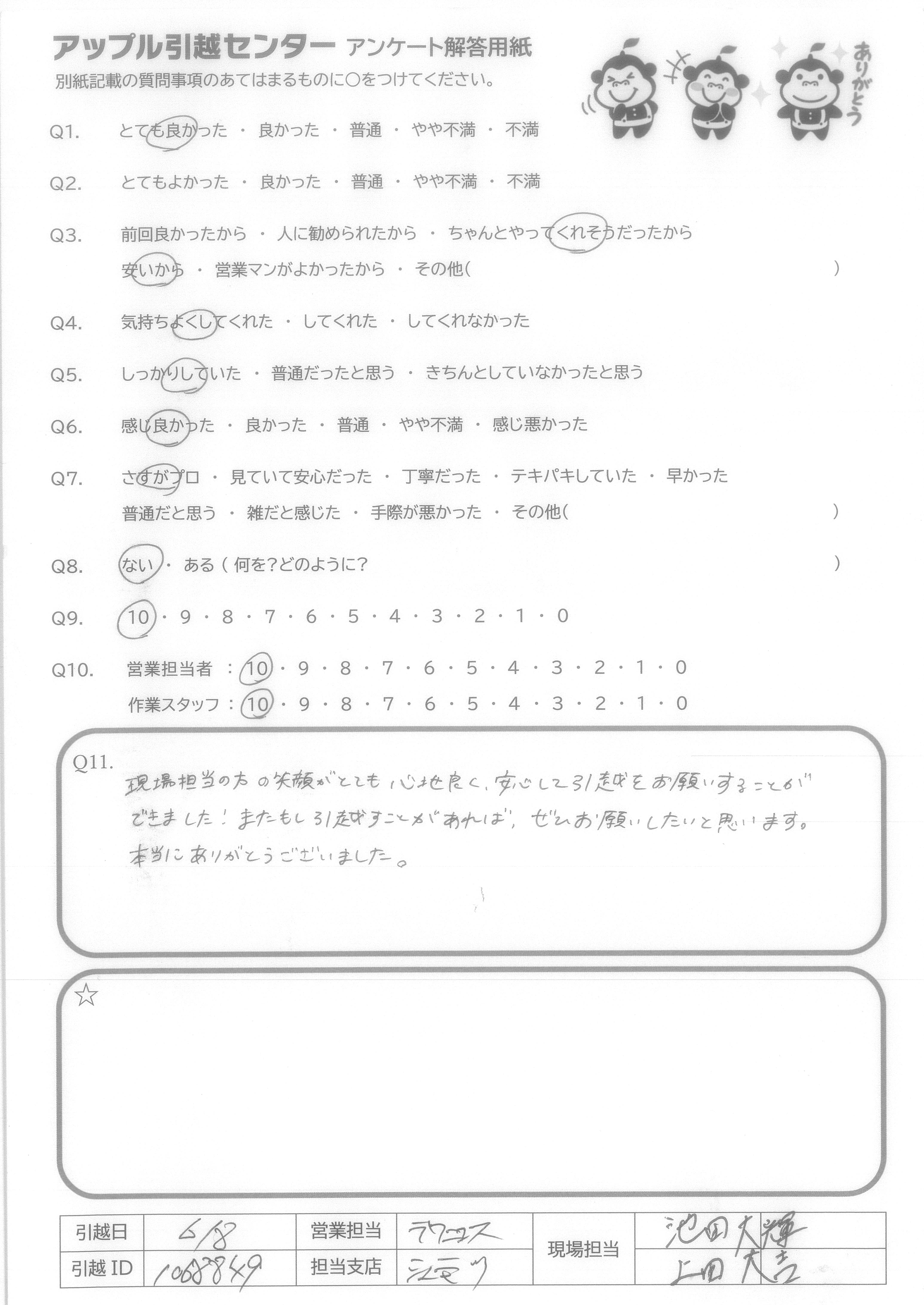 A.現場担当の方の笑顔がとても心地よく、安心して引越をお願いすることができました!またもし引越すことがあれば、ぜひお願いしたいと思います。 本当にありがとうございました。