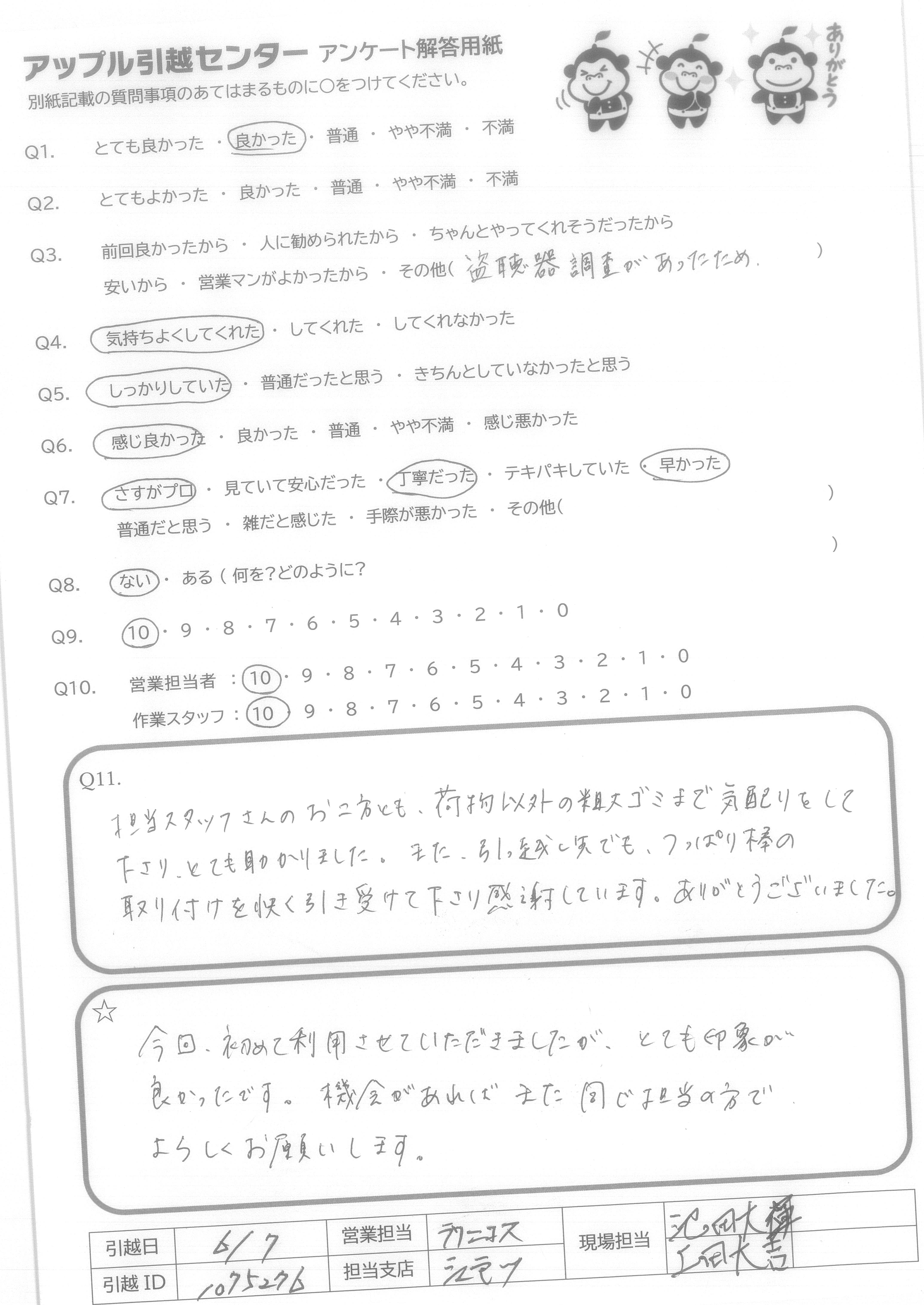 A.担当スタッフさんのお二方とも、荷物以外の粗大ゴミまで気配りをして下さり、とても助かりました。また、引っ越し先でも、つっぱり棒の取り付けを快く引き受けて下さり感謝しています。ありがとうございました。