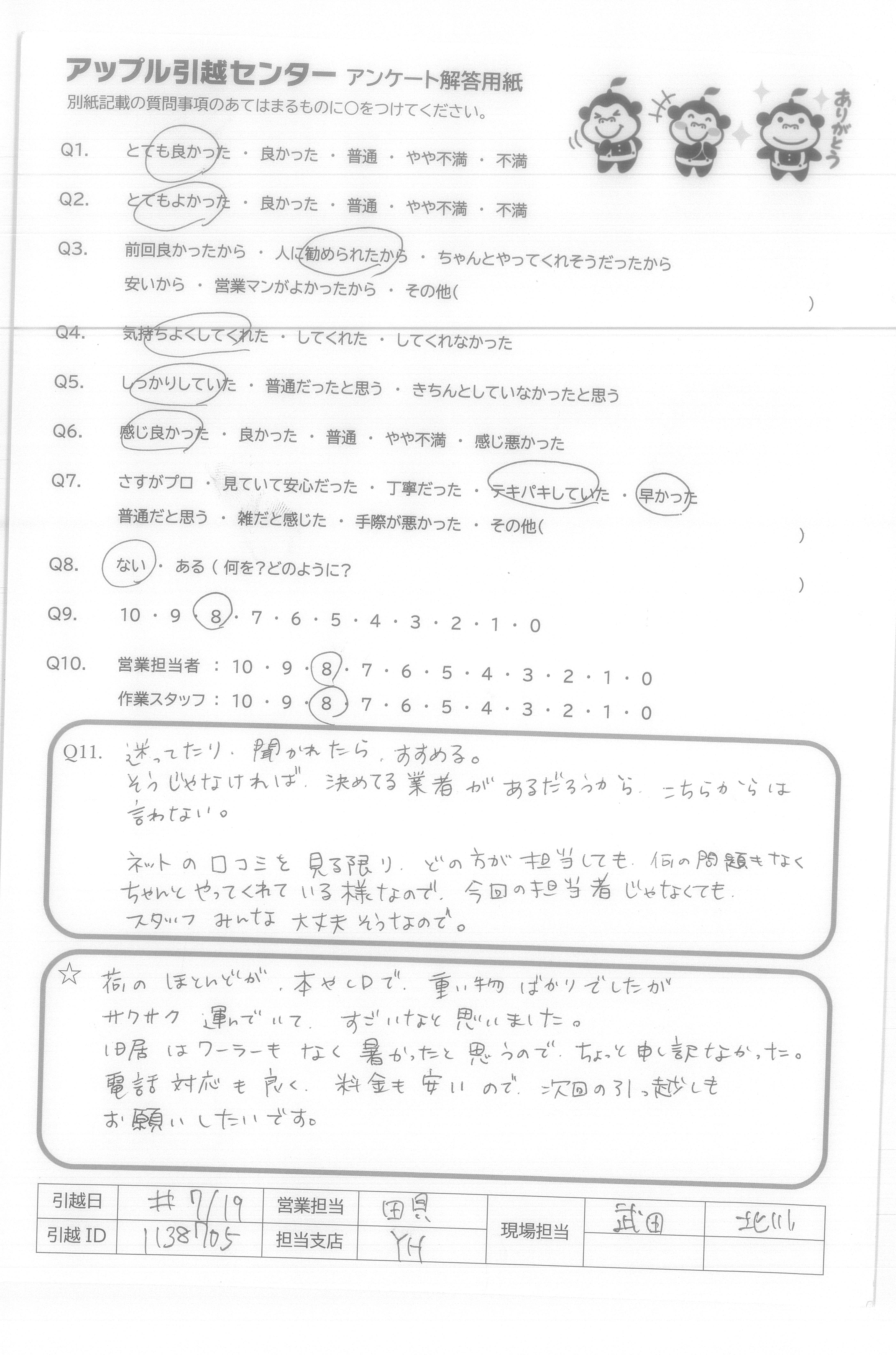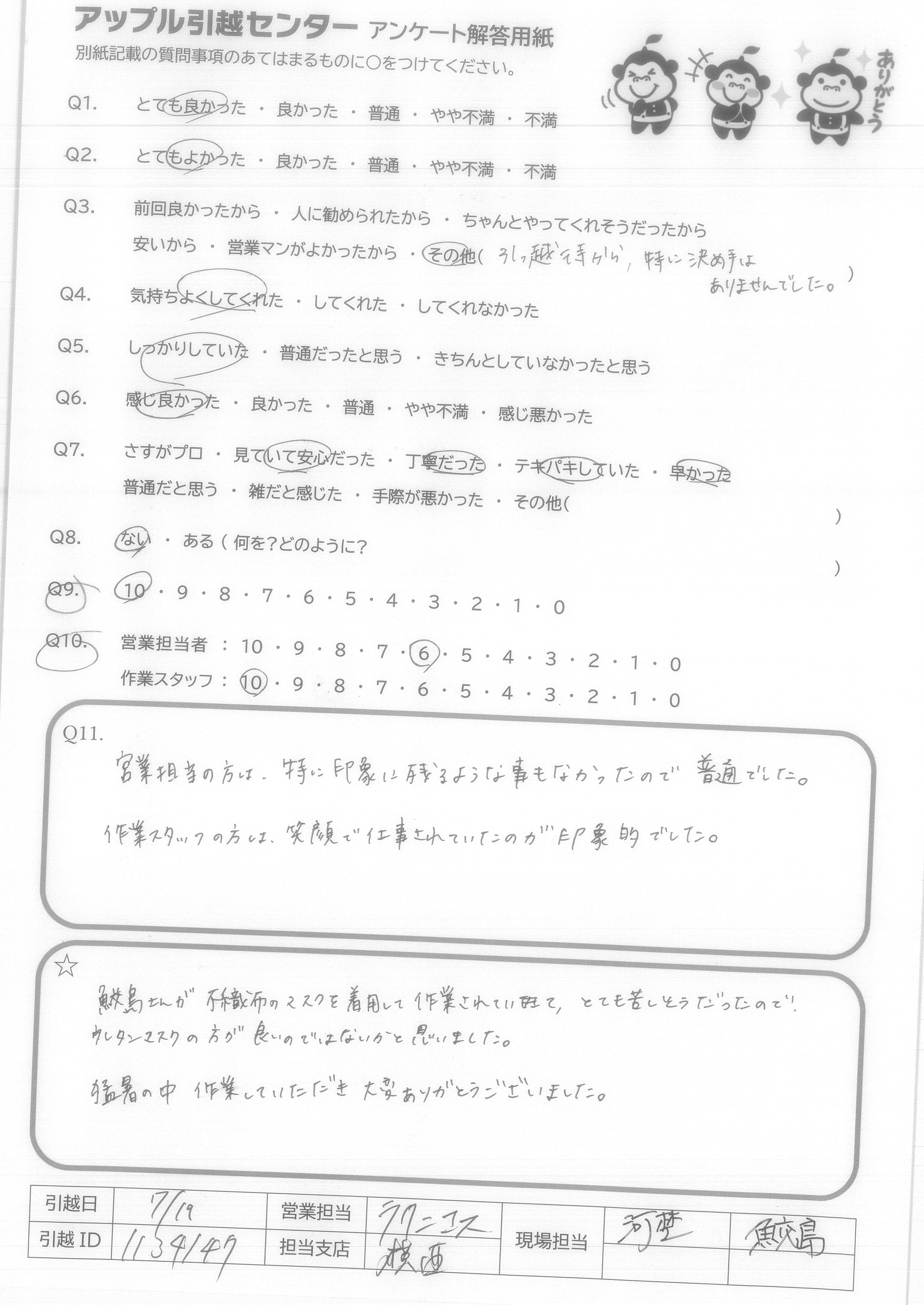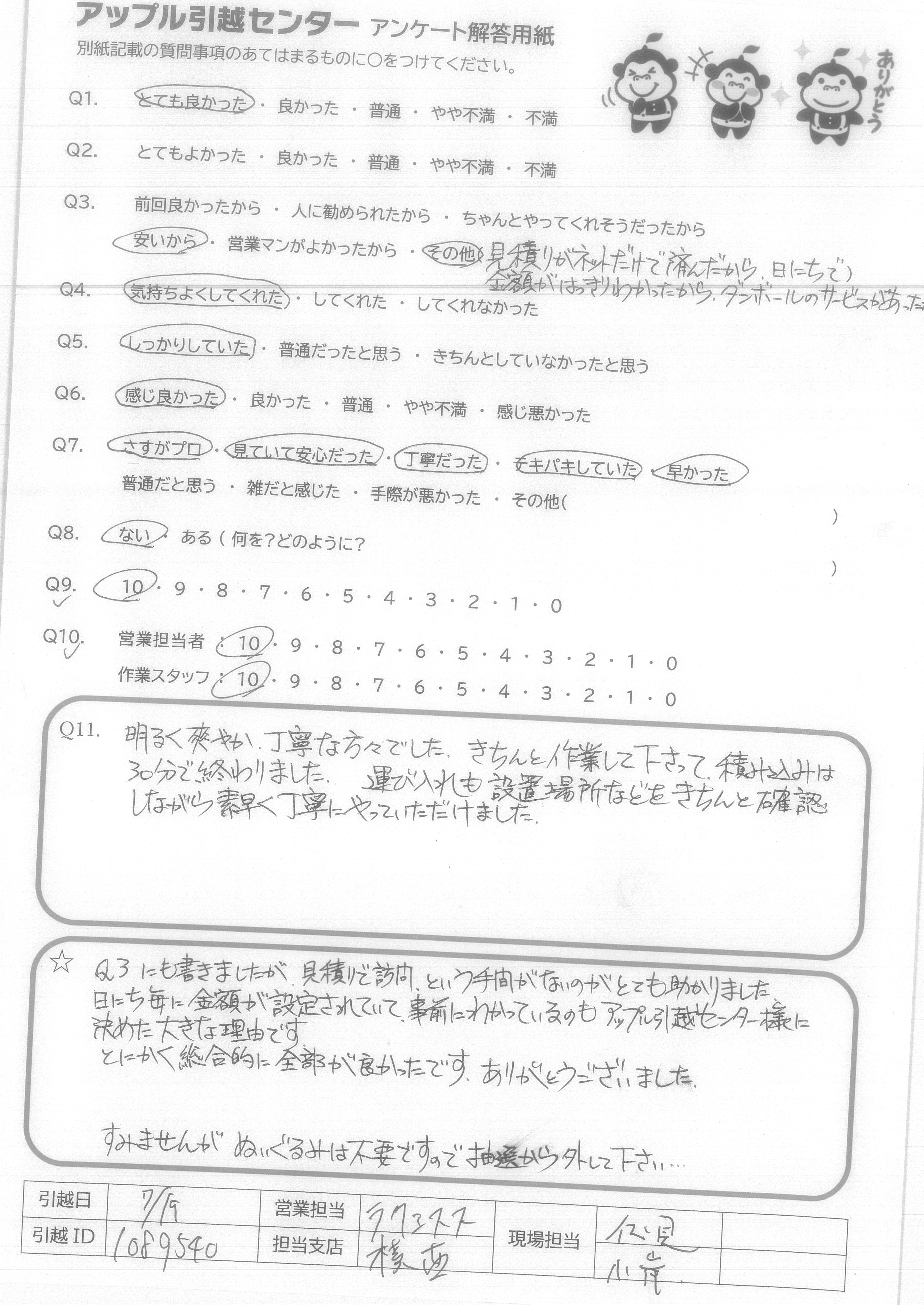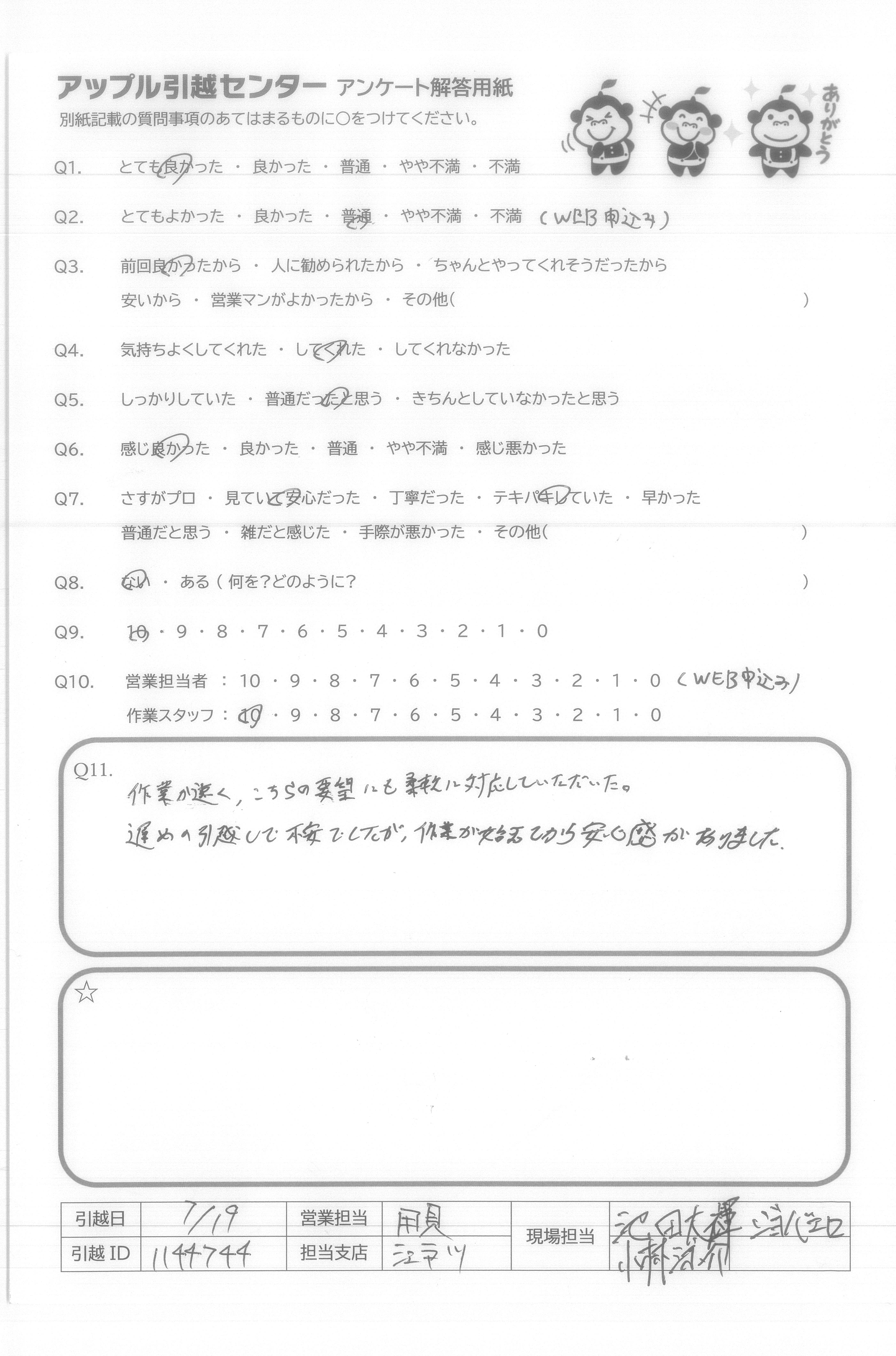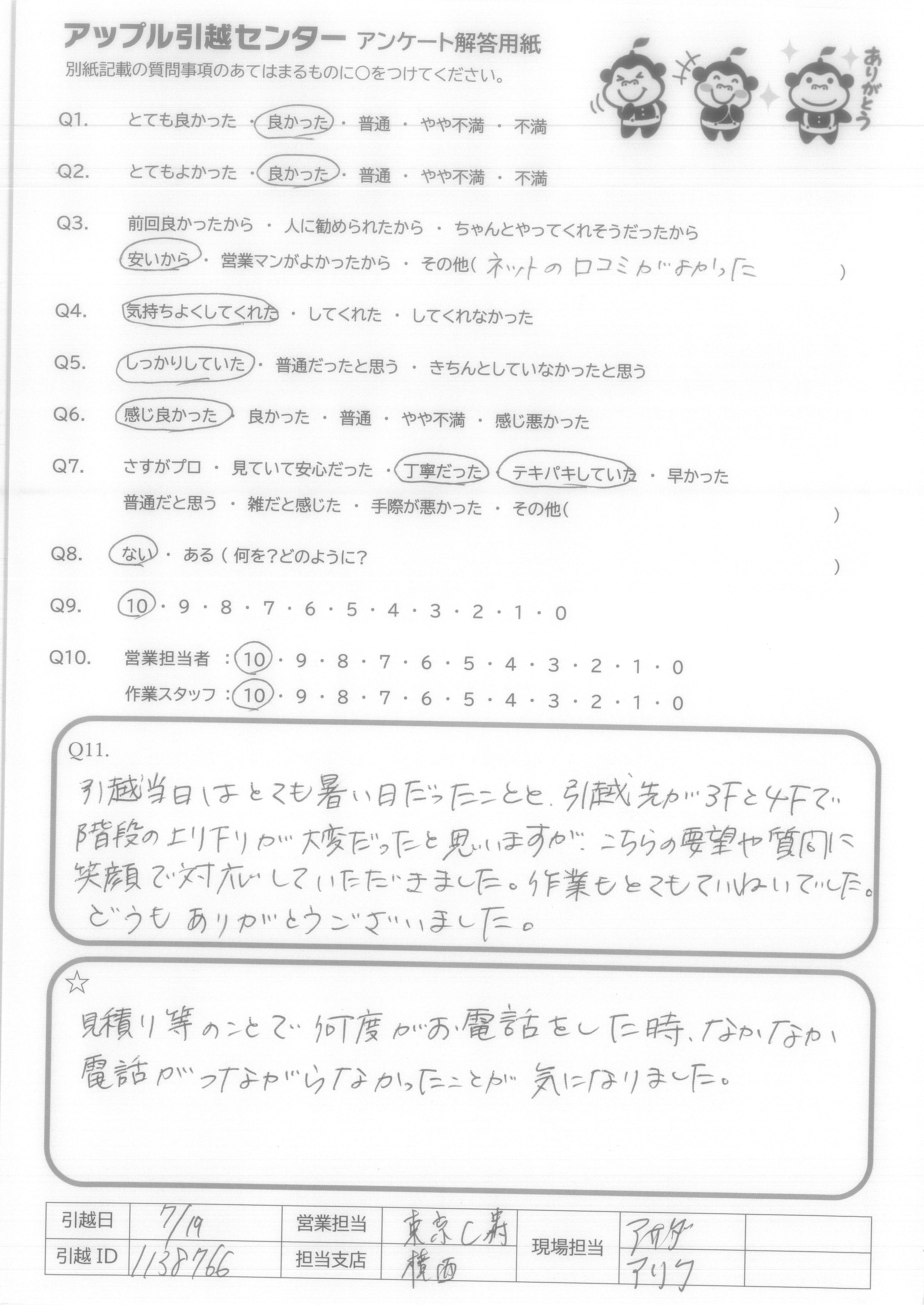 A.とても気持ちの良いスタッフの方にしていただき、本当に頼んでよかったと思いました。こちらから当日色々と質問をしてしまいましたが、的確にお応えいただき、信頼することができました。引っ越し時間も大変丁寧かつスピードをもって行っていただき、感謝の気持ちで一杯です!本当に暑い中ありがとうございました! アップルさんに頼んでよかったです!