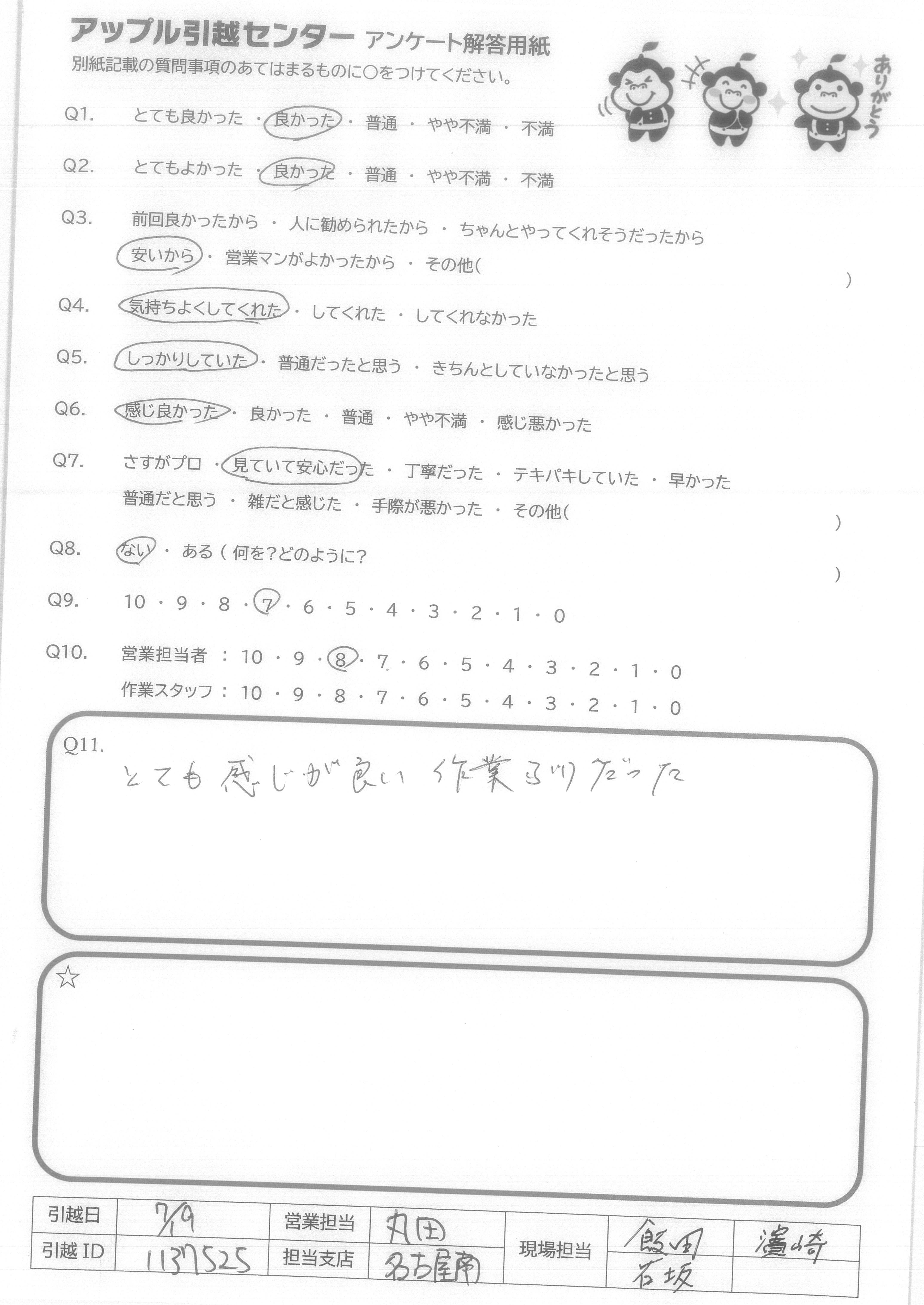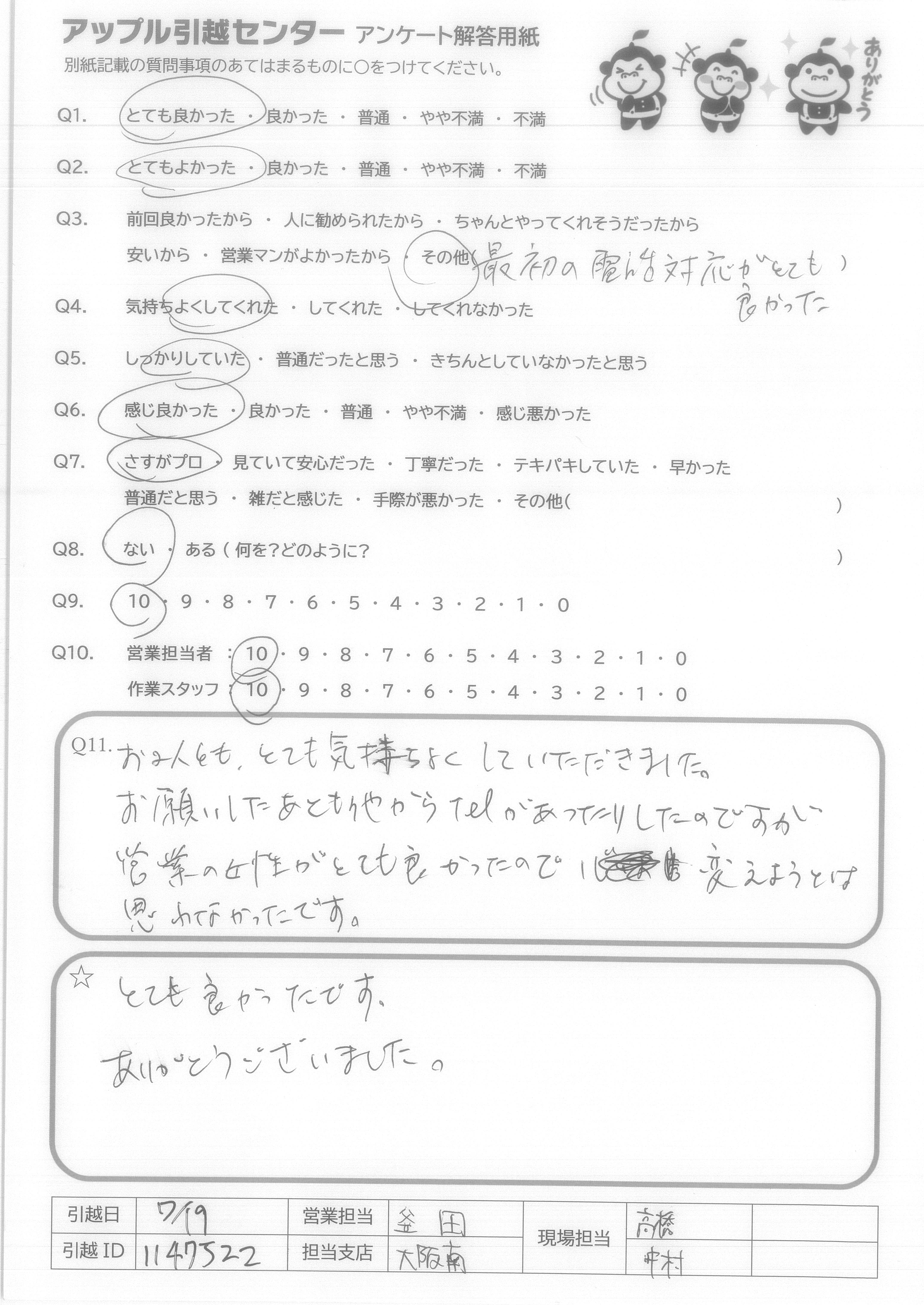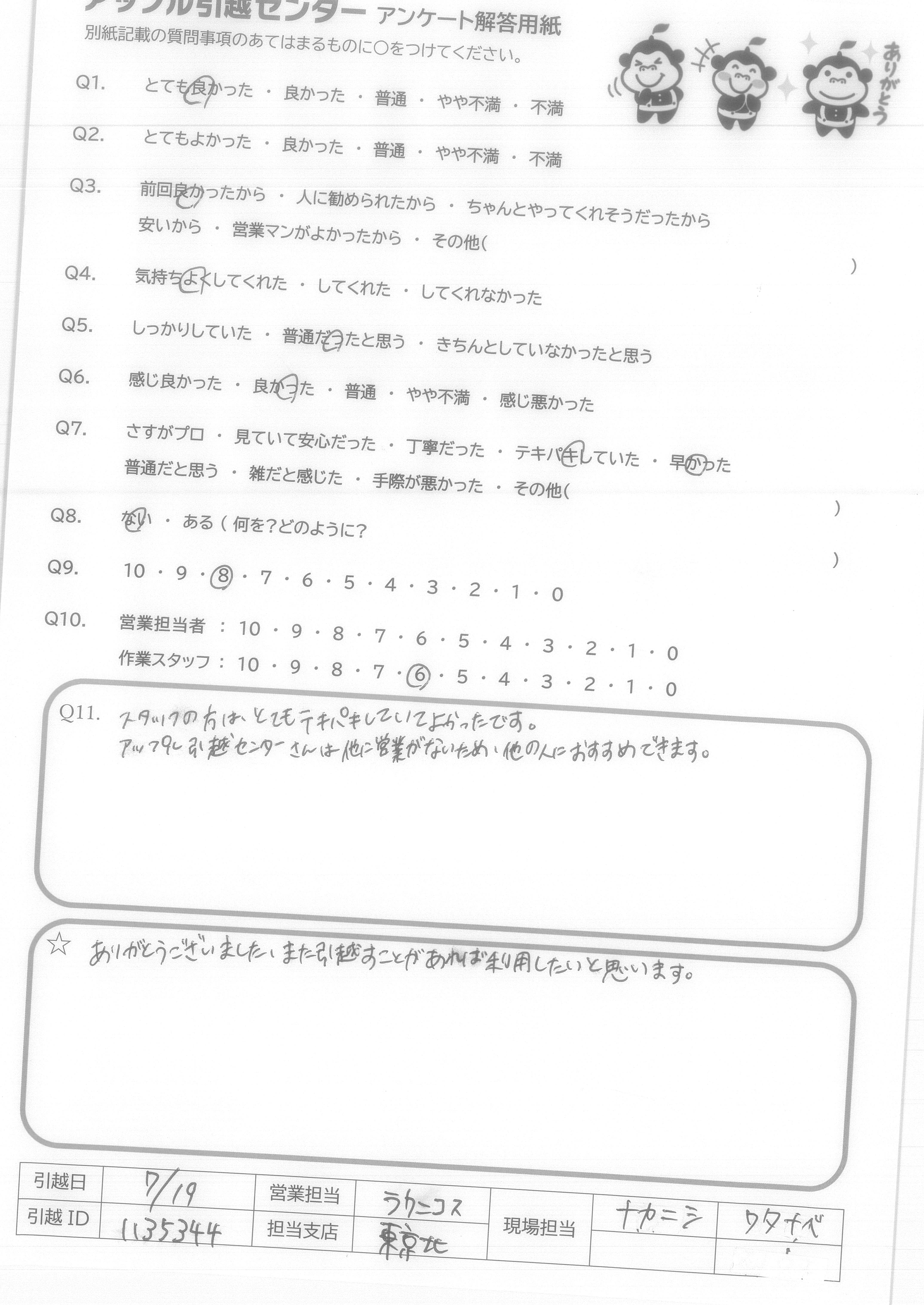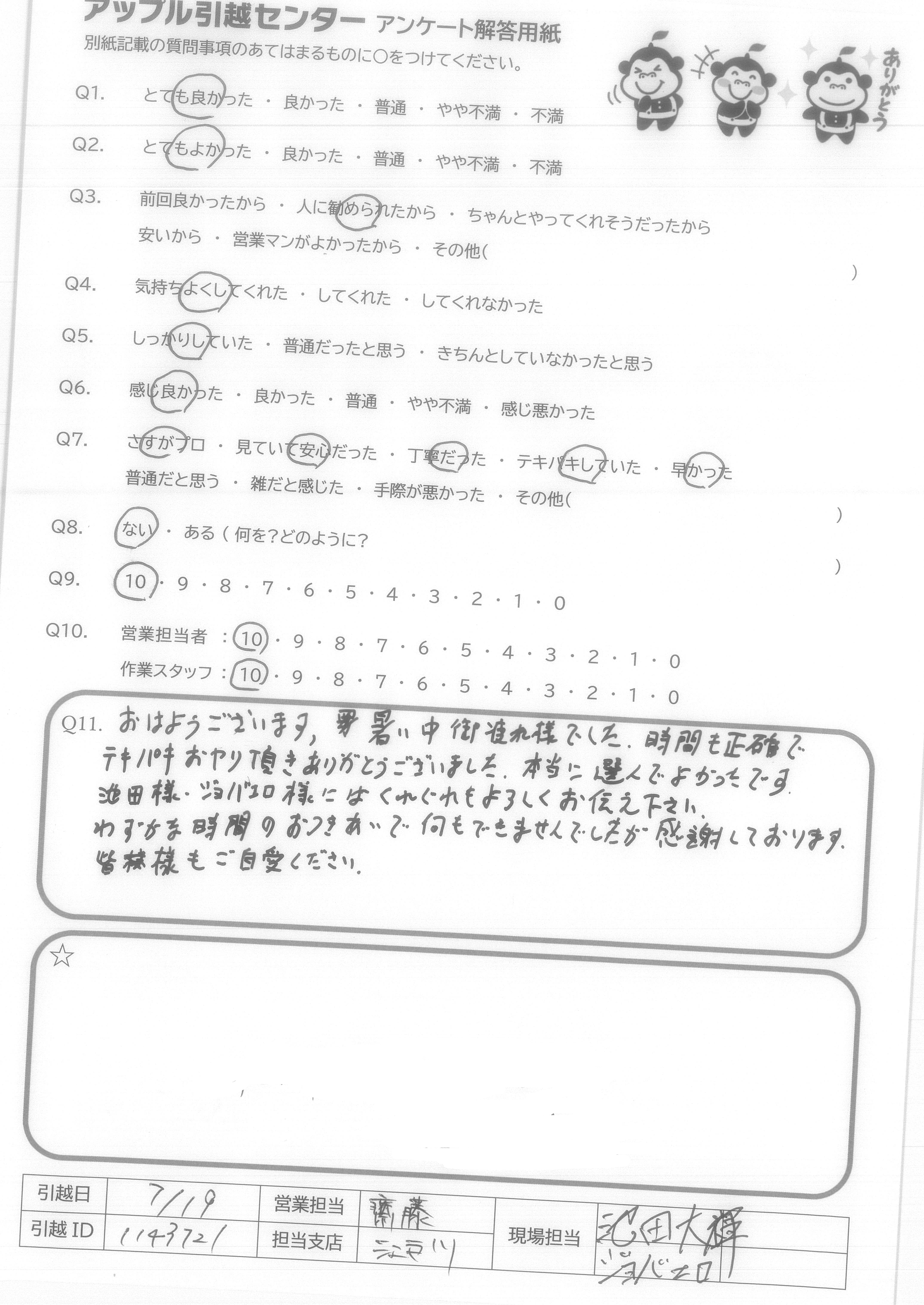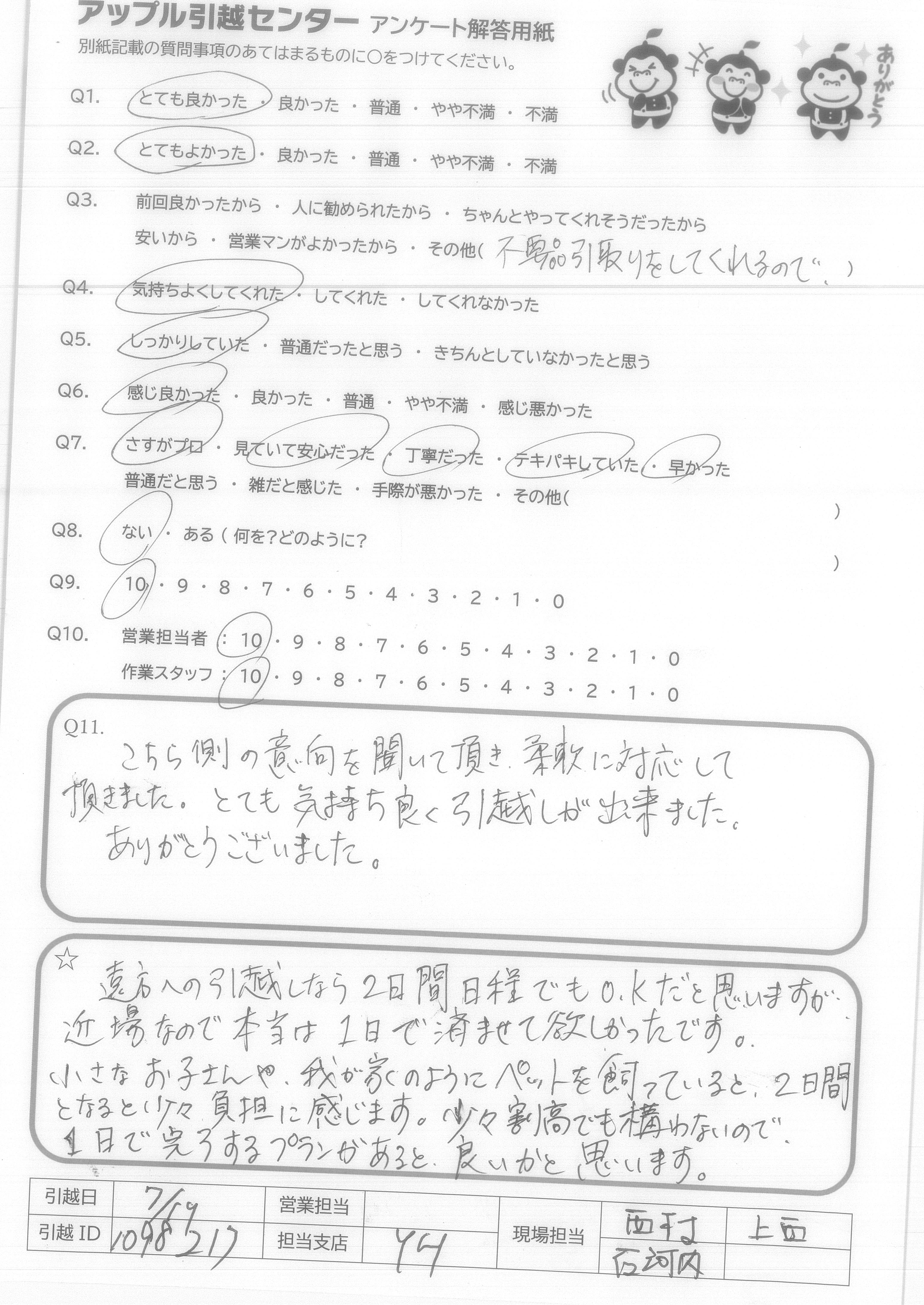 A.とても気持ちの良いスタッフの方にしていただき、本当に頼んでよかったと思いました。こちらから当日色々と質問をしてしまいましたが、的確にお応えいただき、信頼することができました。引っ越し時間も大変丁寧かつスピードをもって行っていただき、感謝の気持ちで一杯です!本当に暑い中ありがとうございました! アップルさんに頼んでよかったです!
