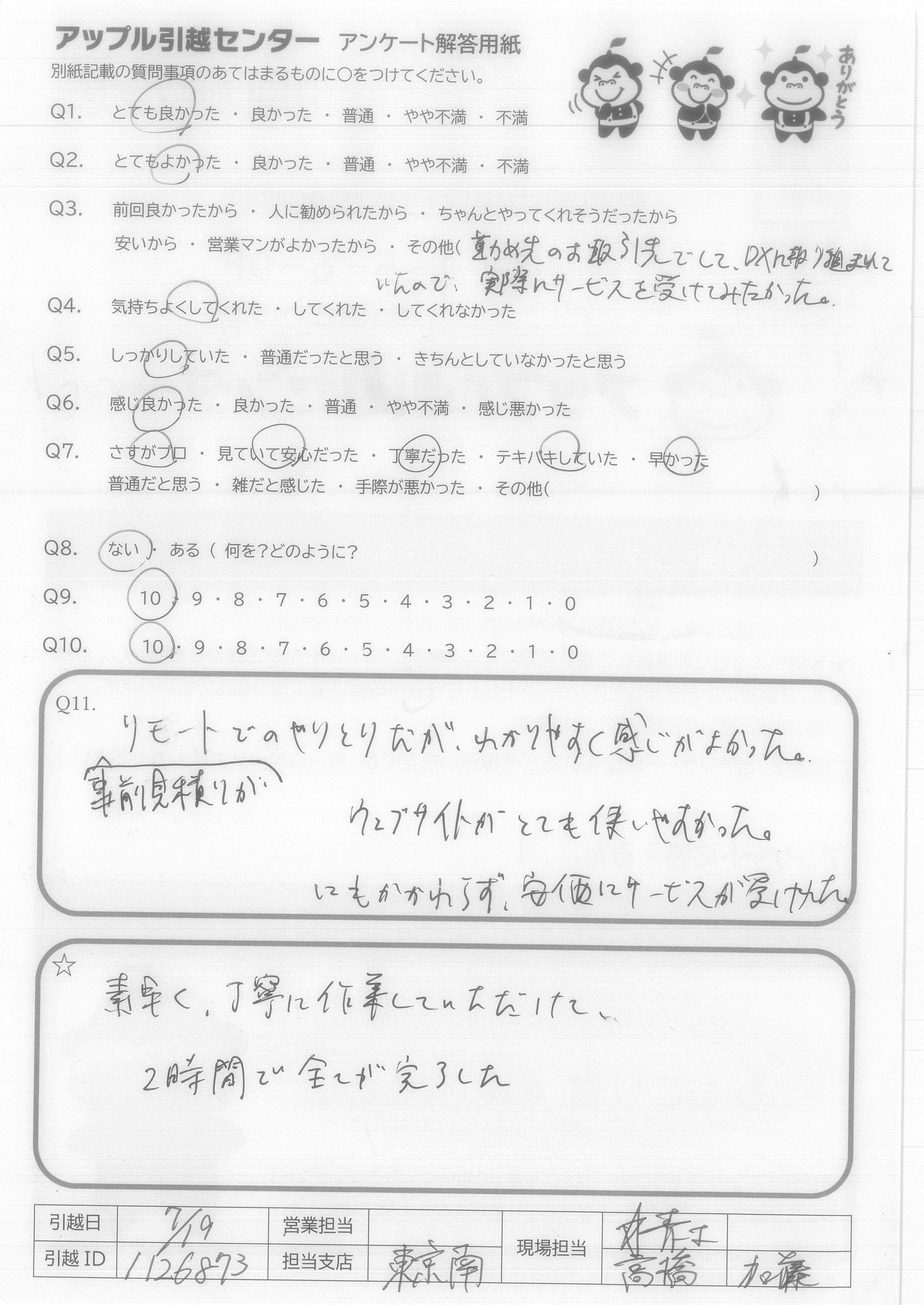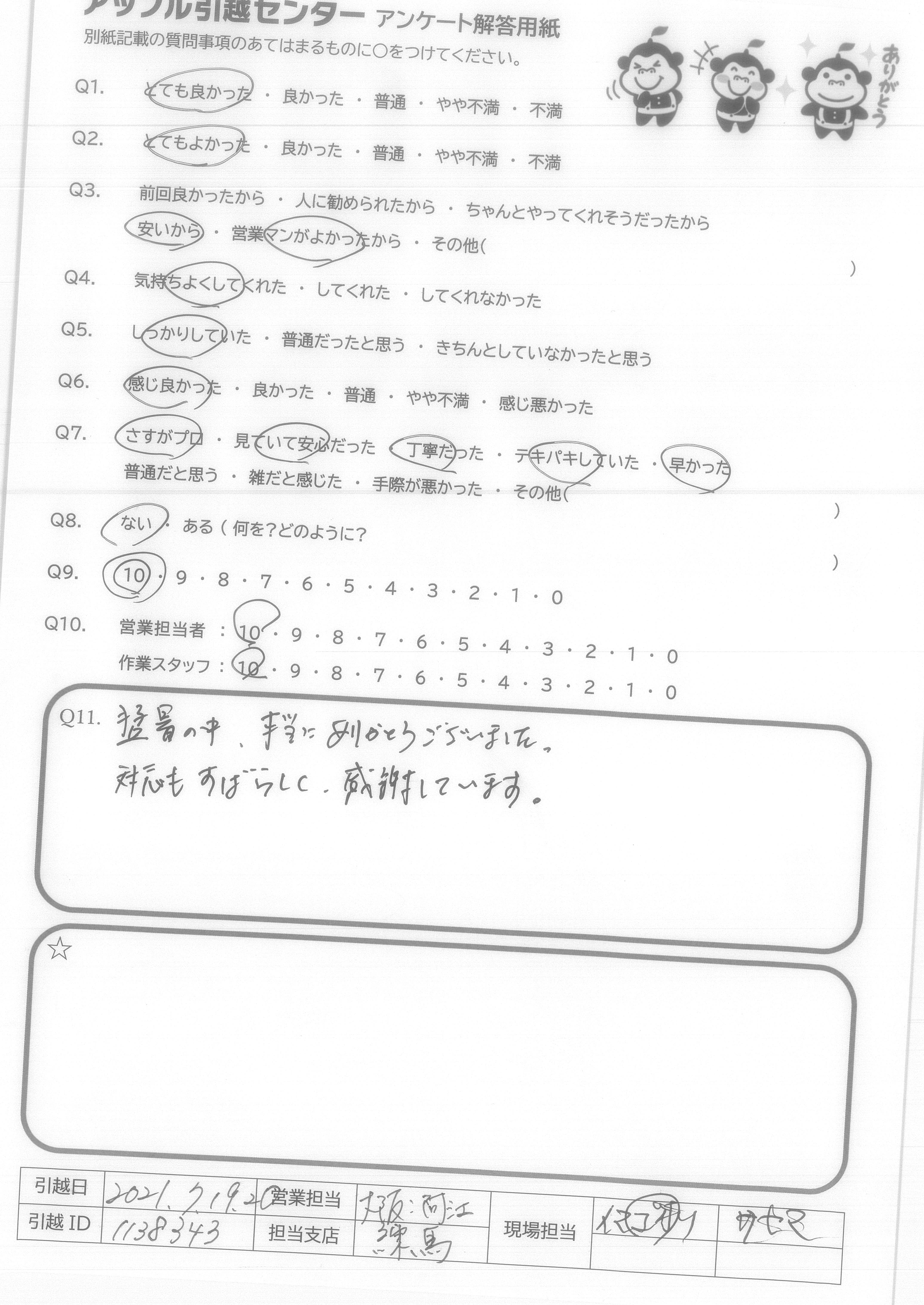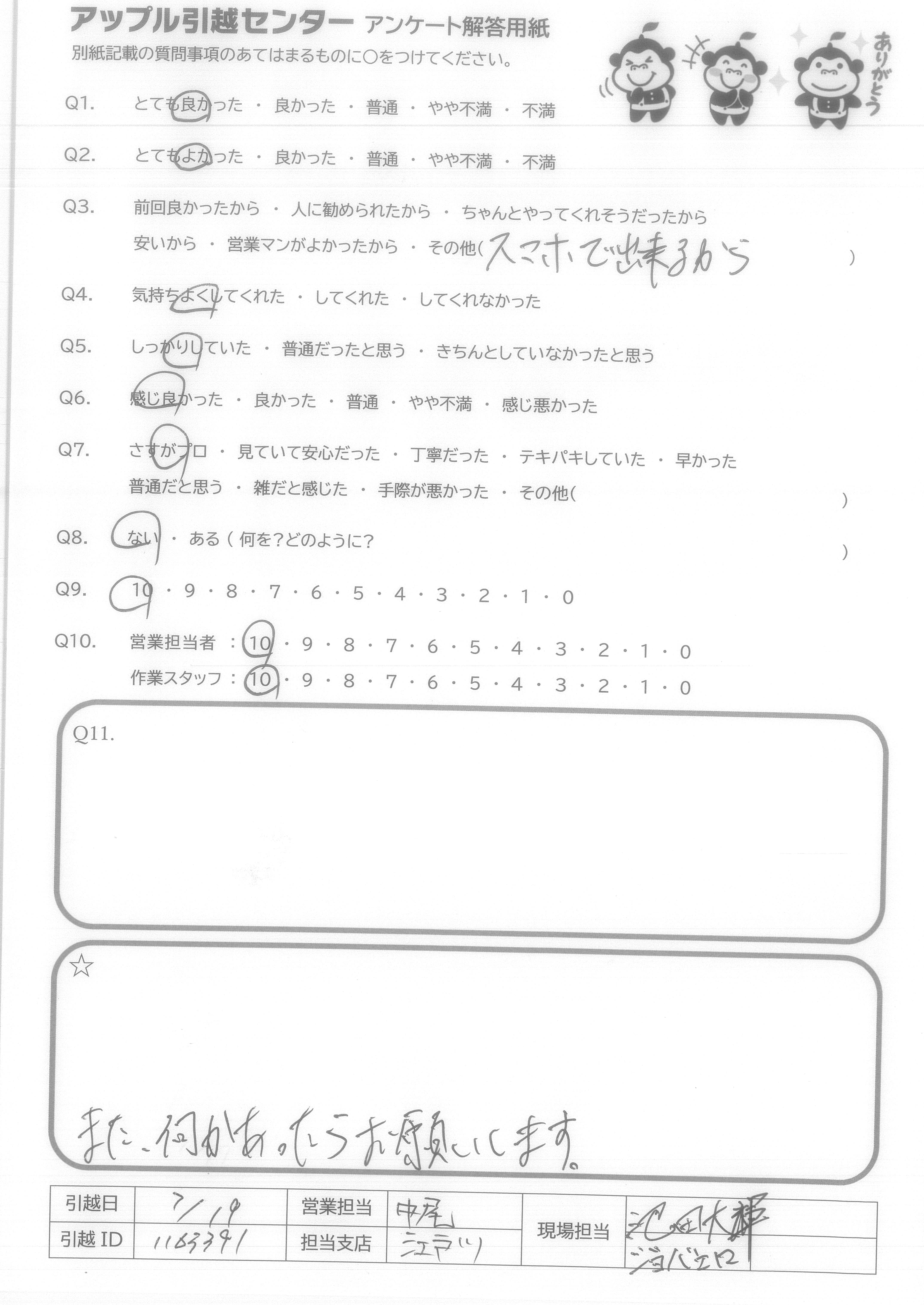 A.ありがとうございました。また引越すことがあれば利用したいと思います。