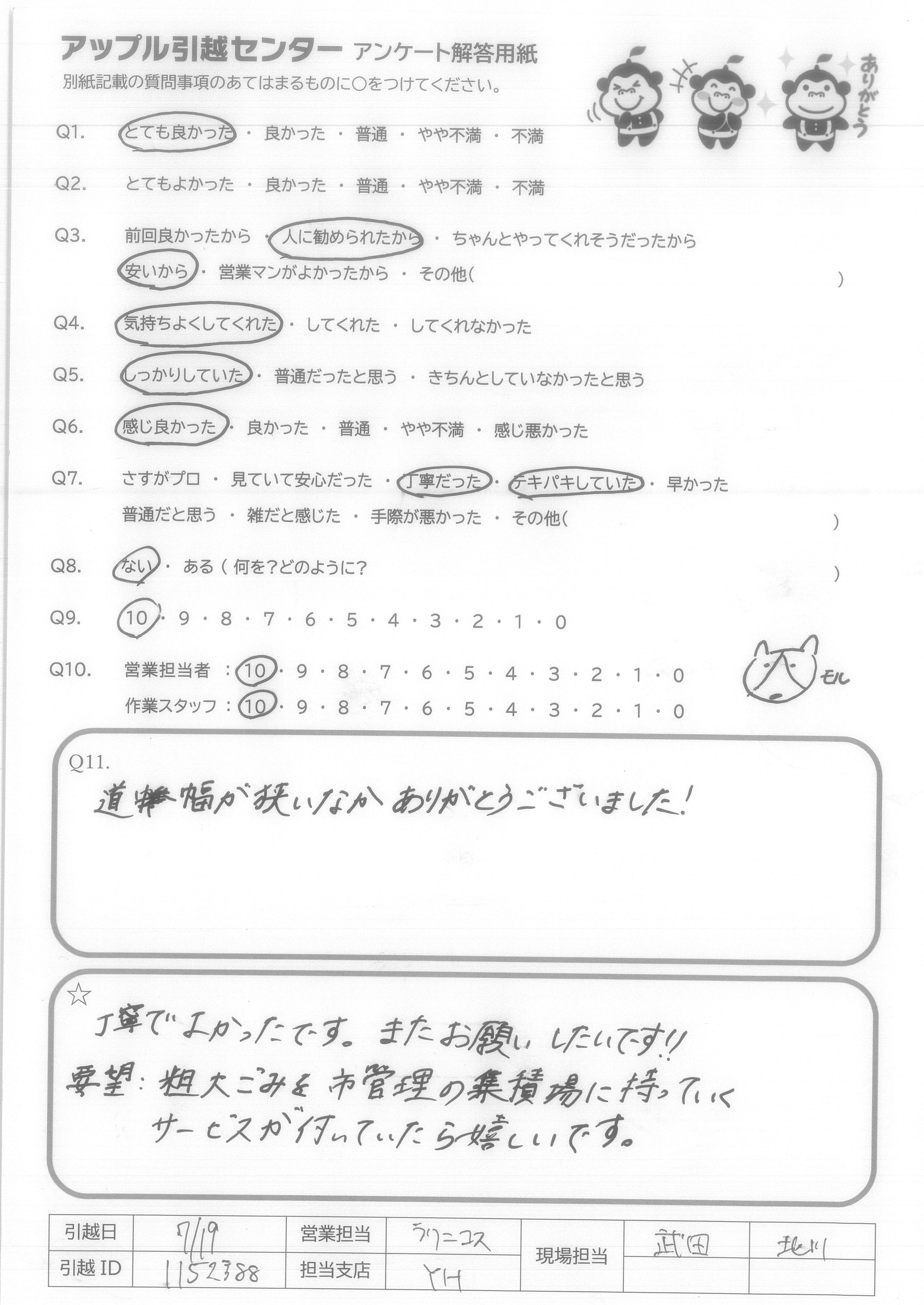 A.丁寧でよかったです。またお願いしたいです!! 要望:粗大ごみを市管理の集積場に持っていくサービスが付いていたら嬉しいです。
