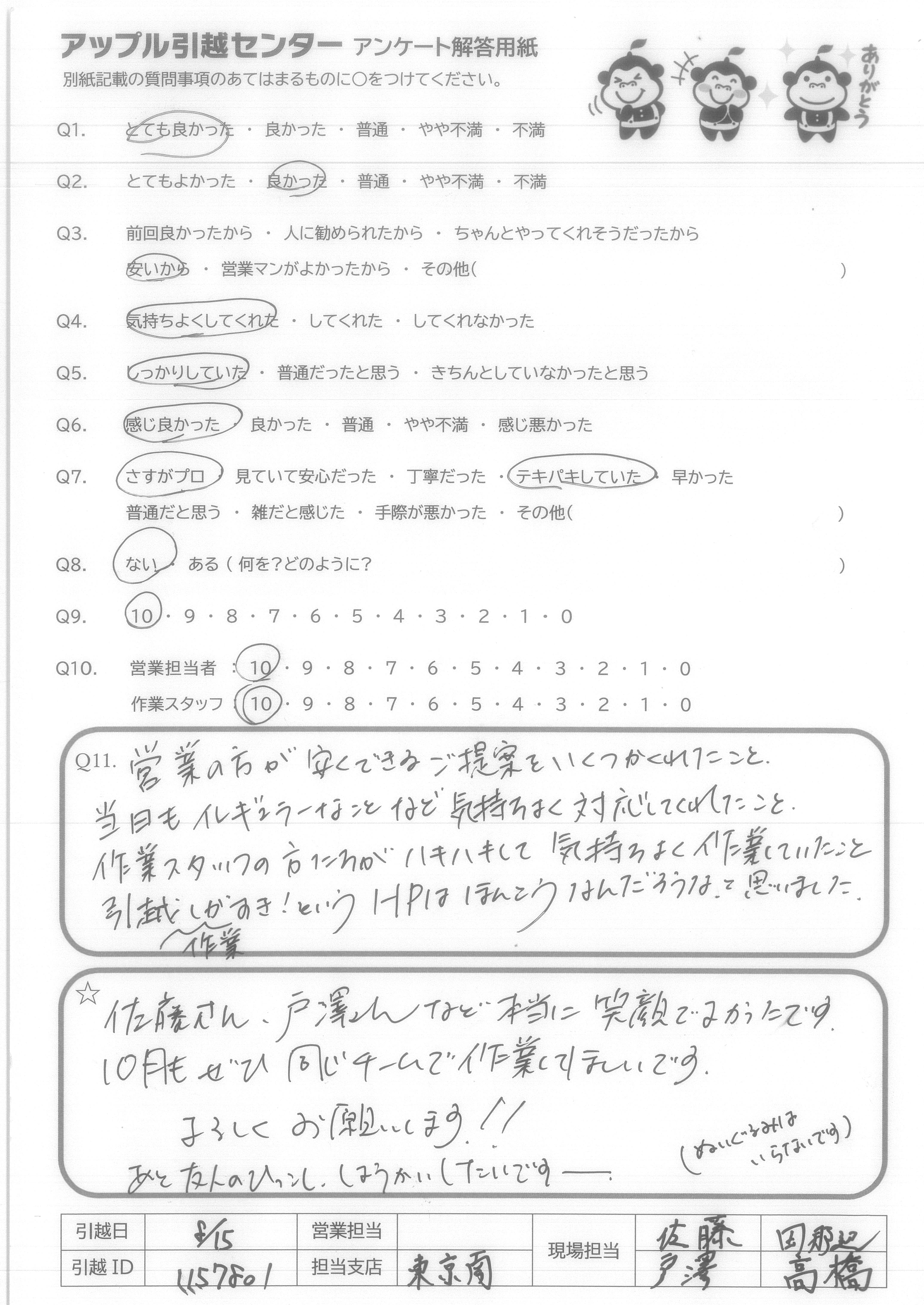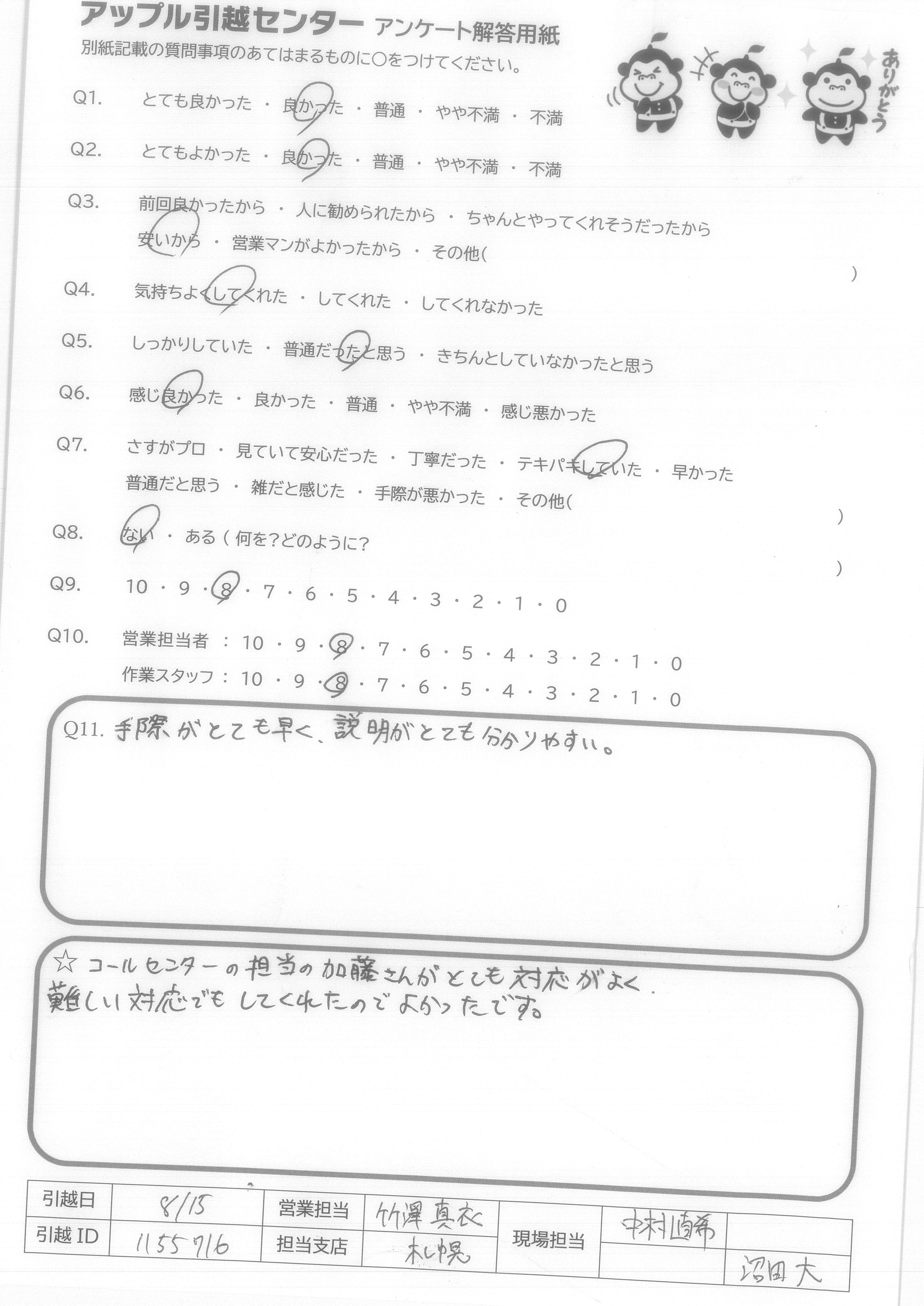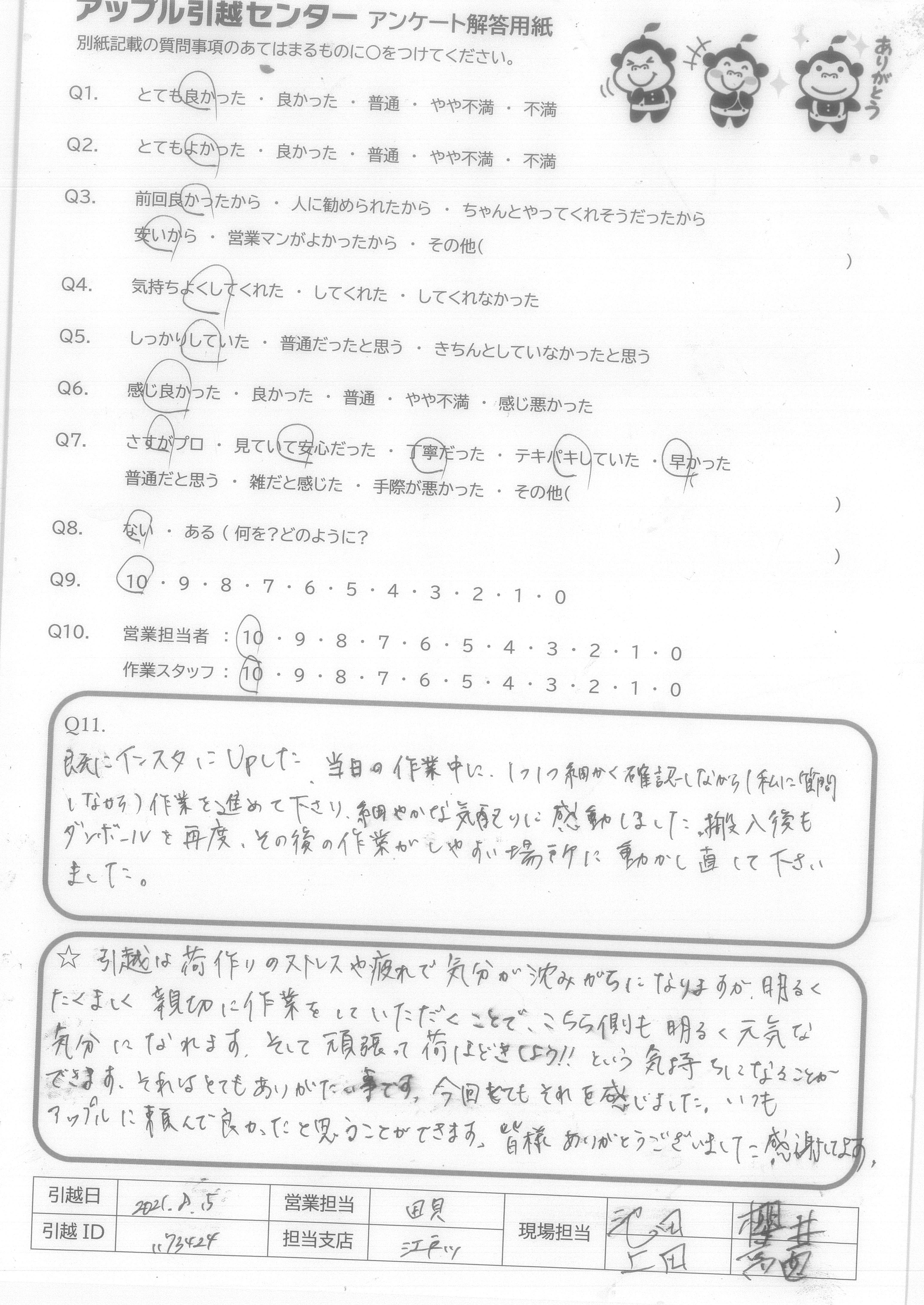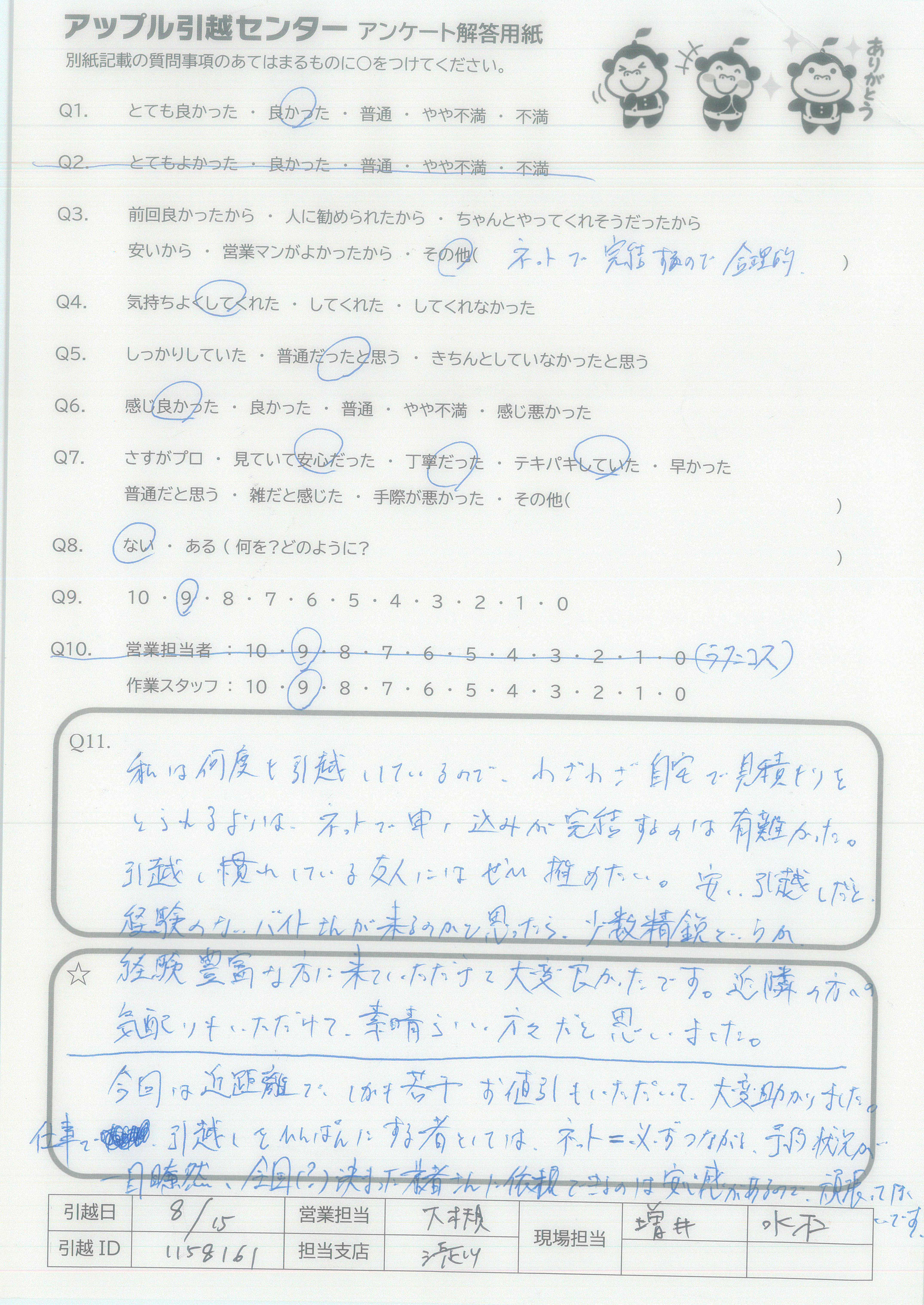 A.引越は荷作りのストレスや疲れで気分が沈みがちになりますが、明るくたくましく親切に作業をしていただくことで、こちら側も明るく元気な気分になれます。そして頑張って荷ほどきしよう!!という気持ちになることができます。それはとてもありがたい事です。今回とてもそれを感じました。いつもアップルに頼んで良かったと思うことができます。皆様ありがとうございました。感謝しています。
