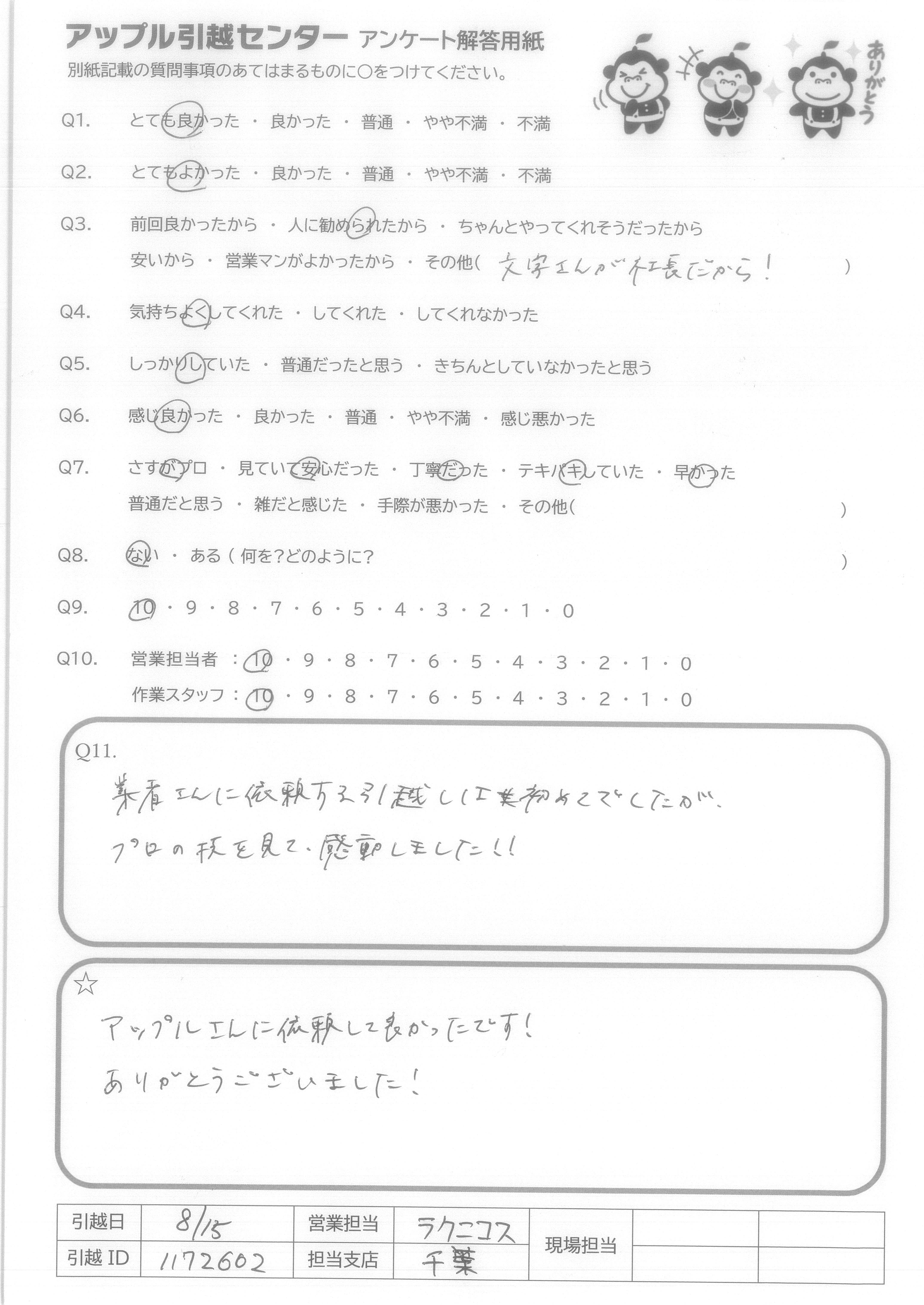 引越し日:2021年08月15日 エリア:千葉県習志野市