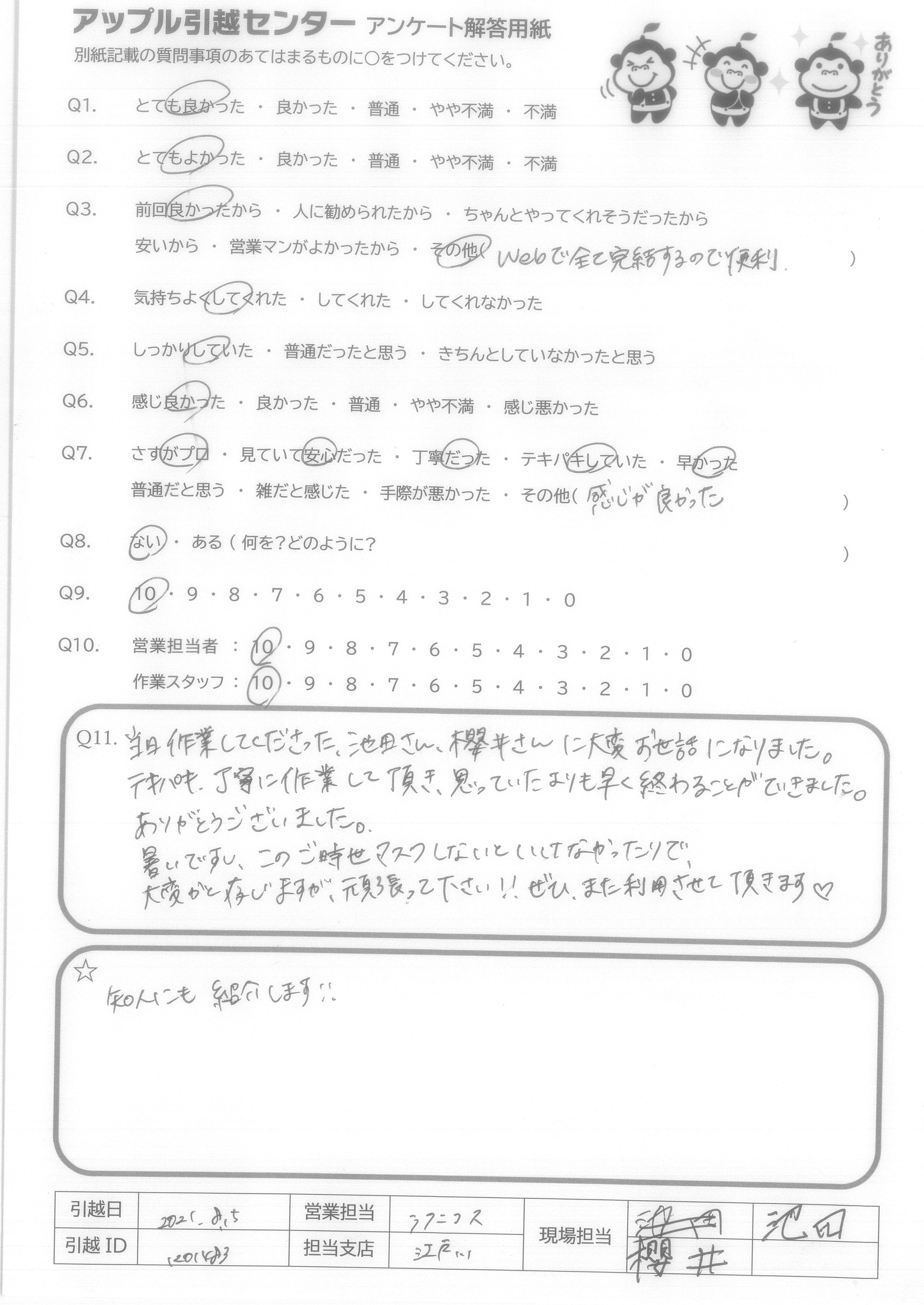 A.当日作業してくださった池田さん、櫻井さんに大変お世話になりました。 テキパキ、丁寧に作業して頂き、思っていたよりも早く終わることができました。 ありがとうございました。 暑いですし、このご時世マスクしないといけなかったりで、大変かと存じますが、頑張って下さい!!ぜひ、また利用させて頂きます